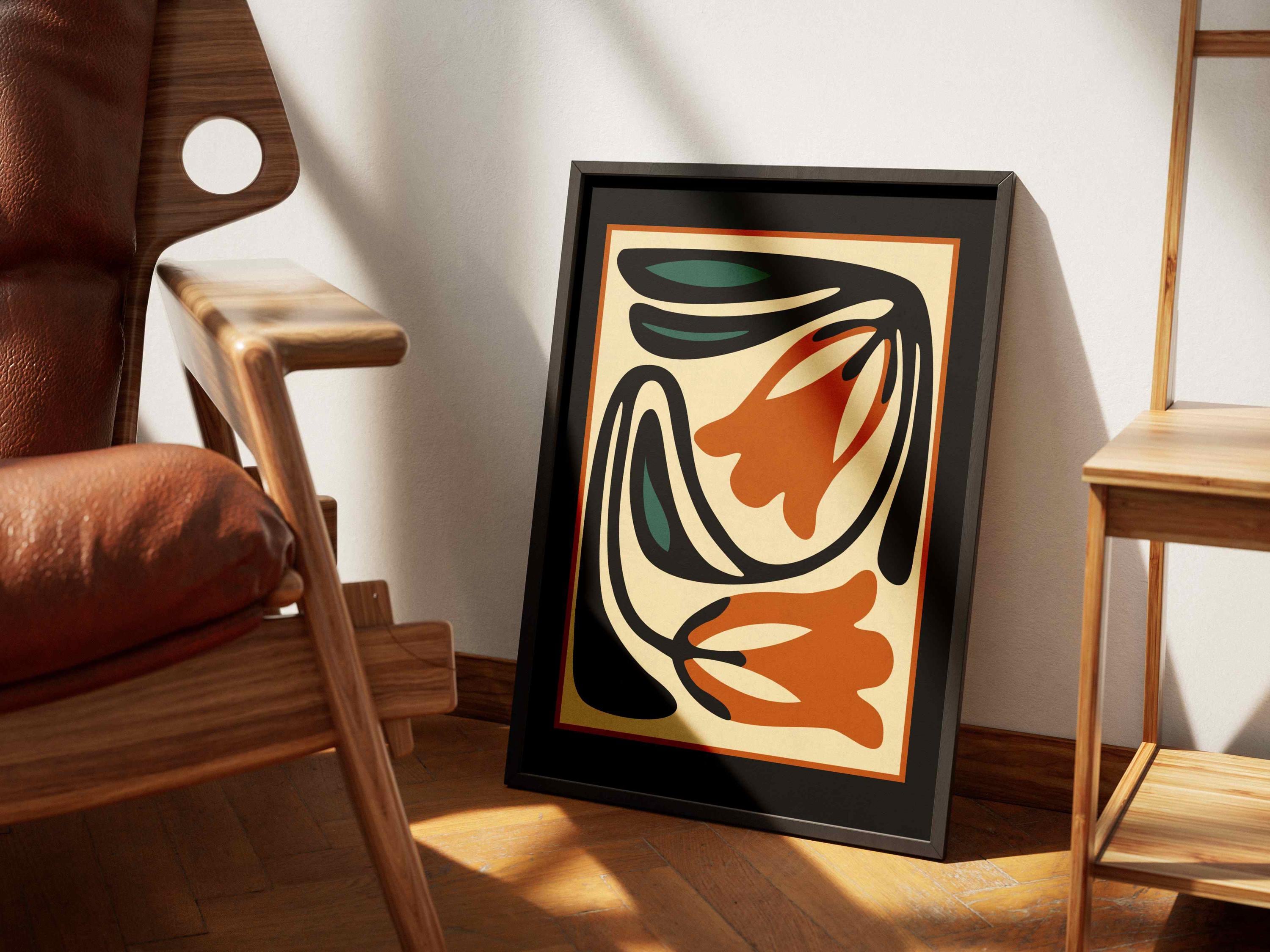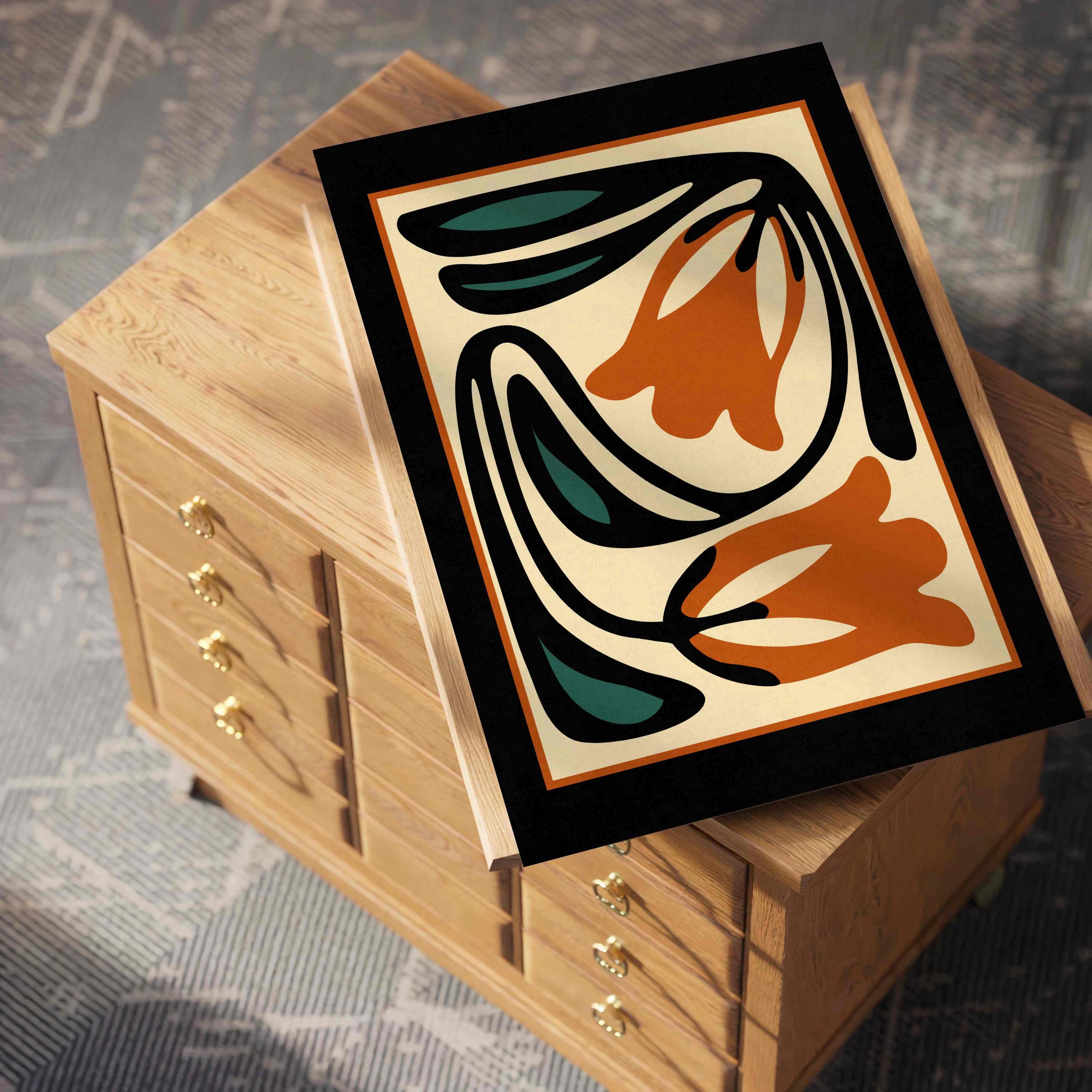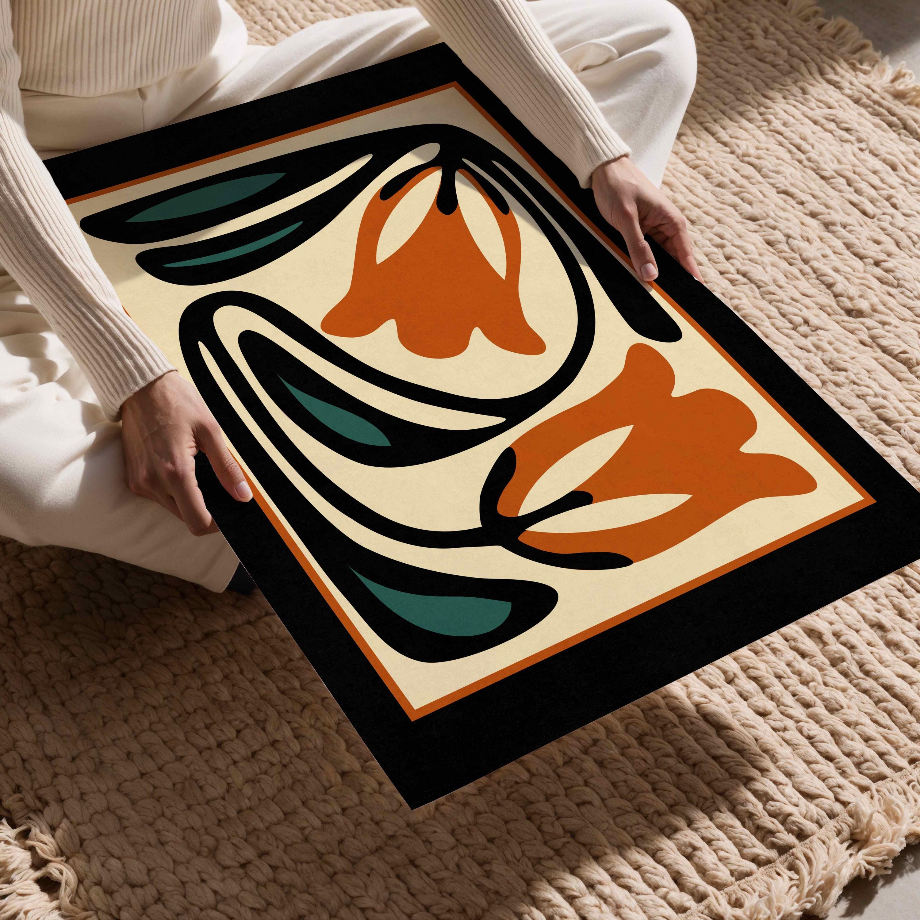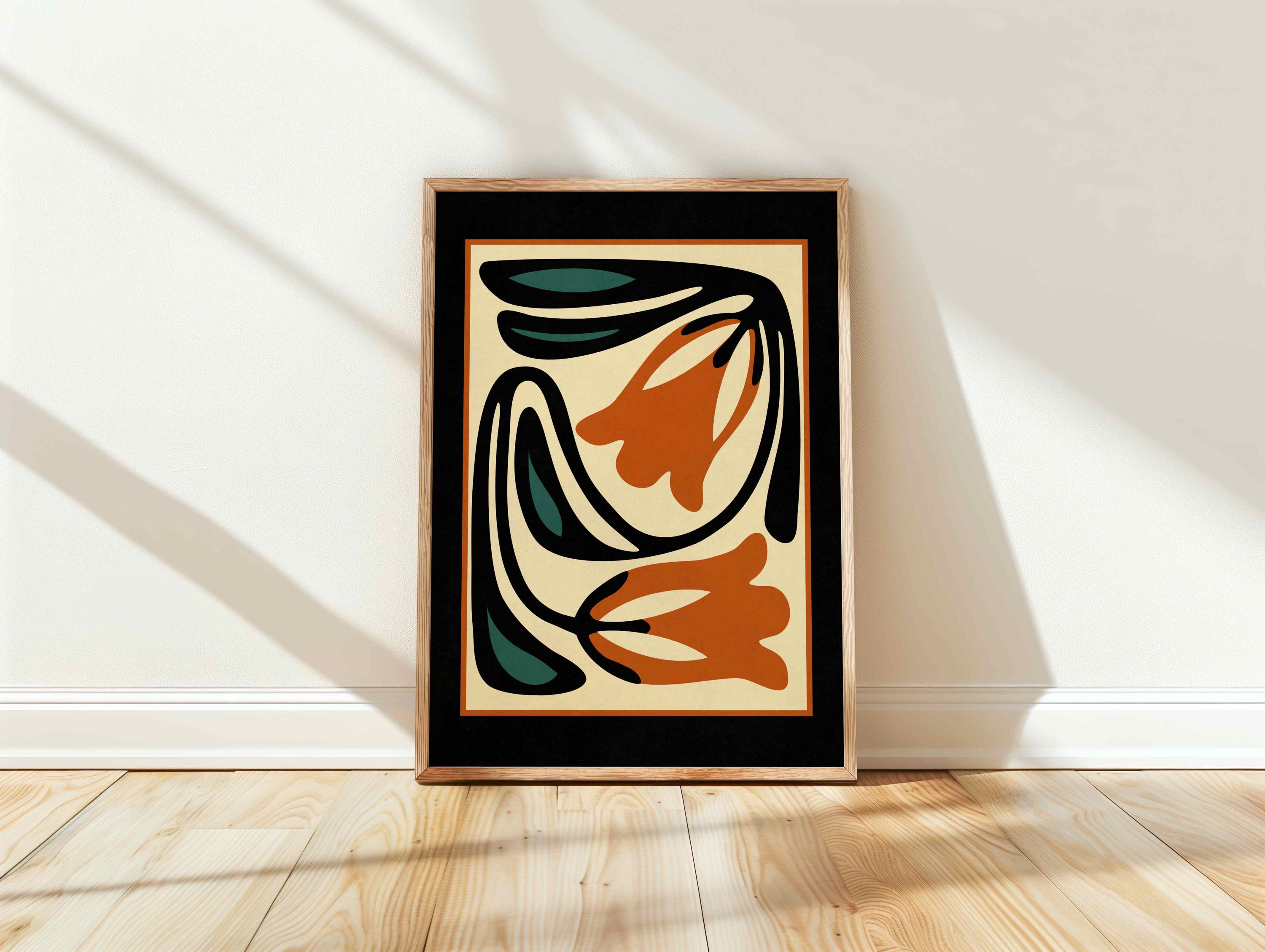 Unframed abstract retro floral print featuring stylized flowers and leaves in a black, burnt orange, teal and cream color palette. This piece blends retro botanical style with mid century modern design, creating a look that’s both earthy and bold.