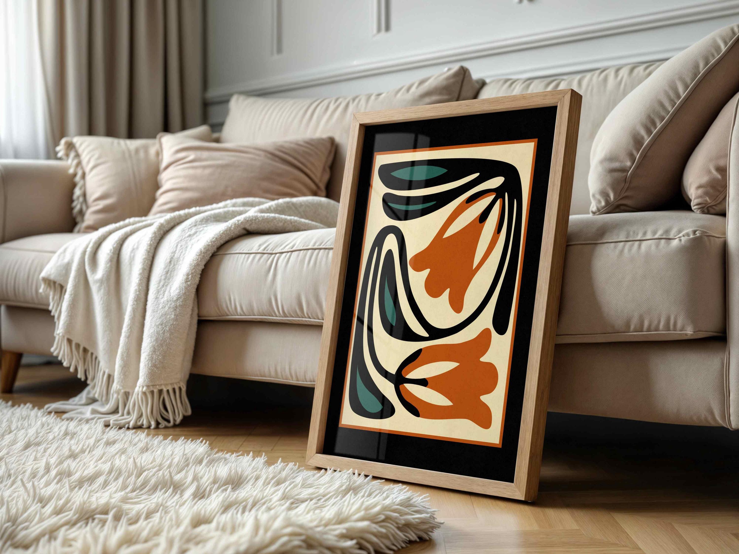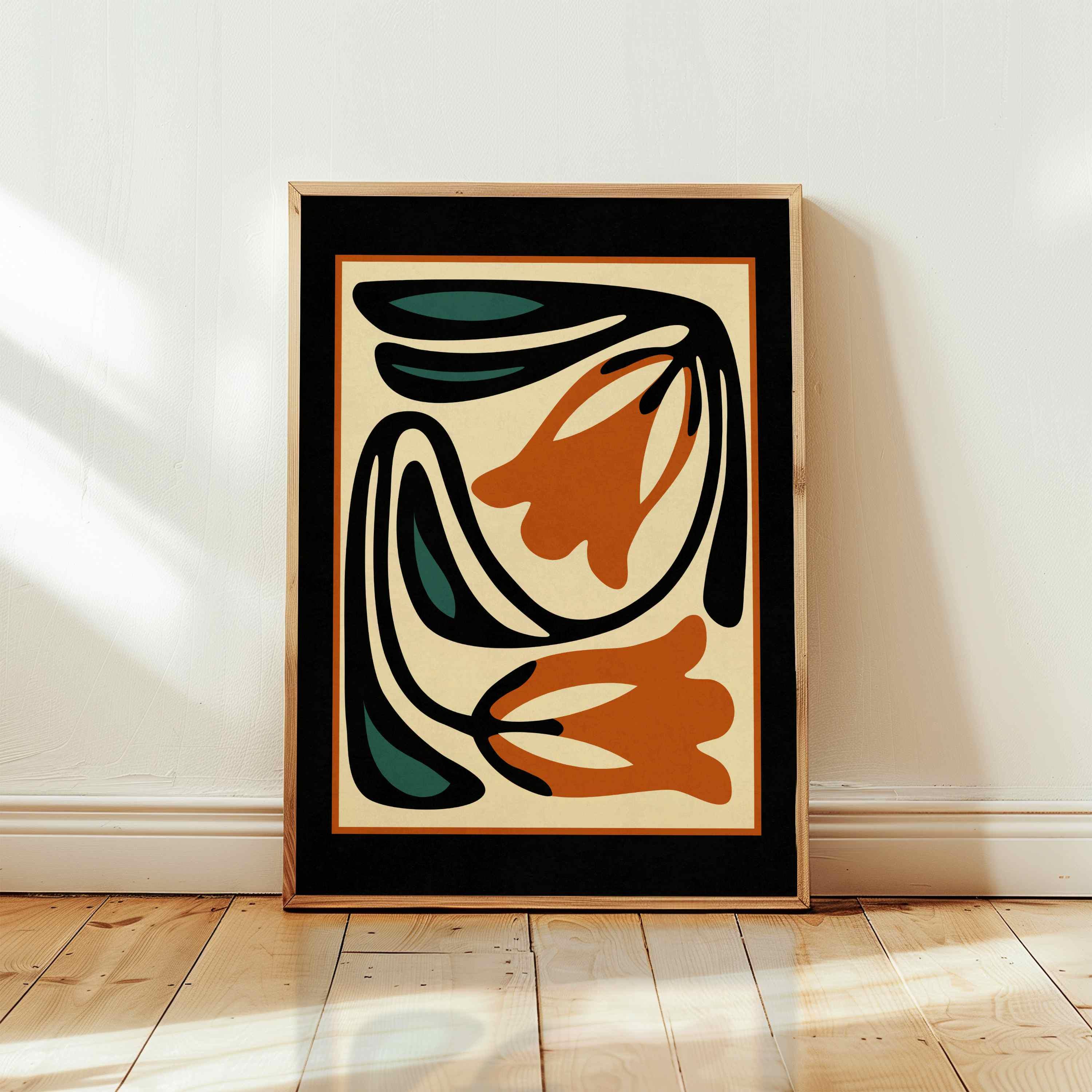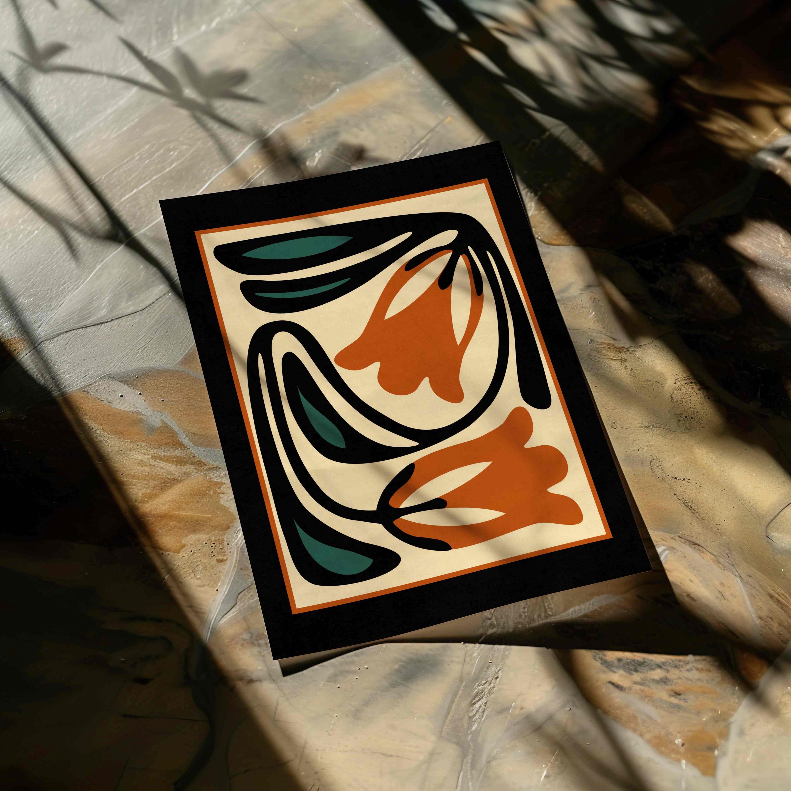 Unframed abstract retro floral print featuring stylized flowers and leaves in a black, burnt orange, teal and cream color palette. This piece blends retro botanical style with mid century modern design, creating a look that’s both earthy and bold.
