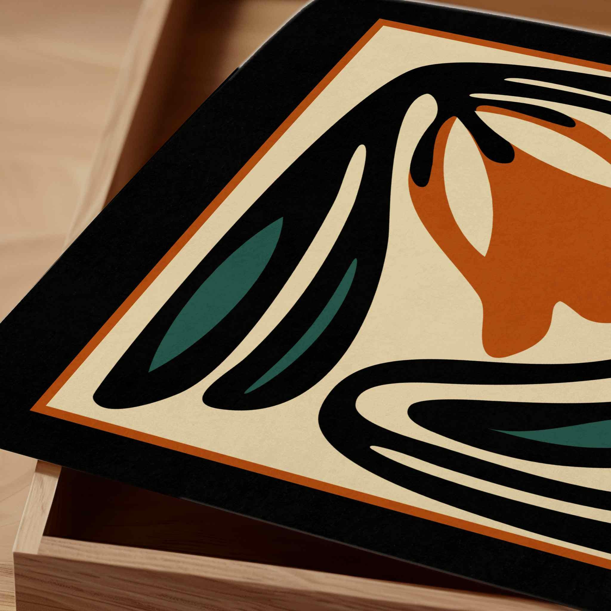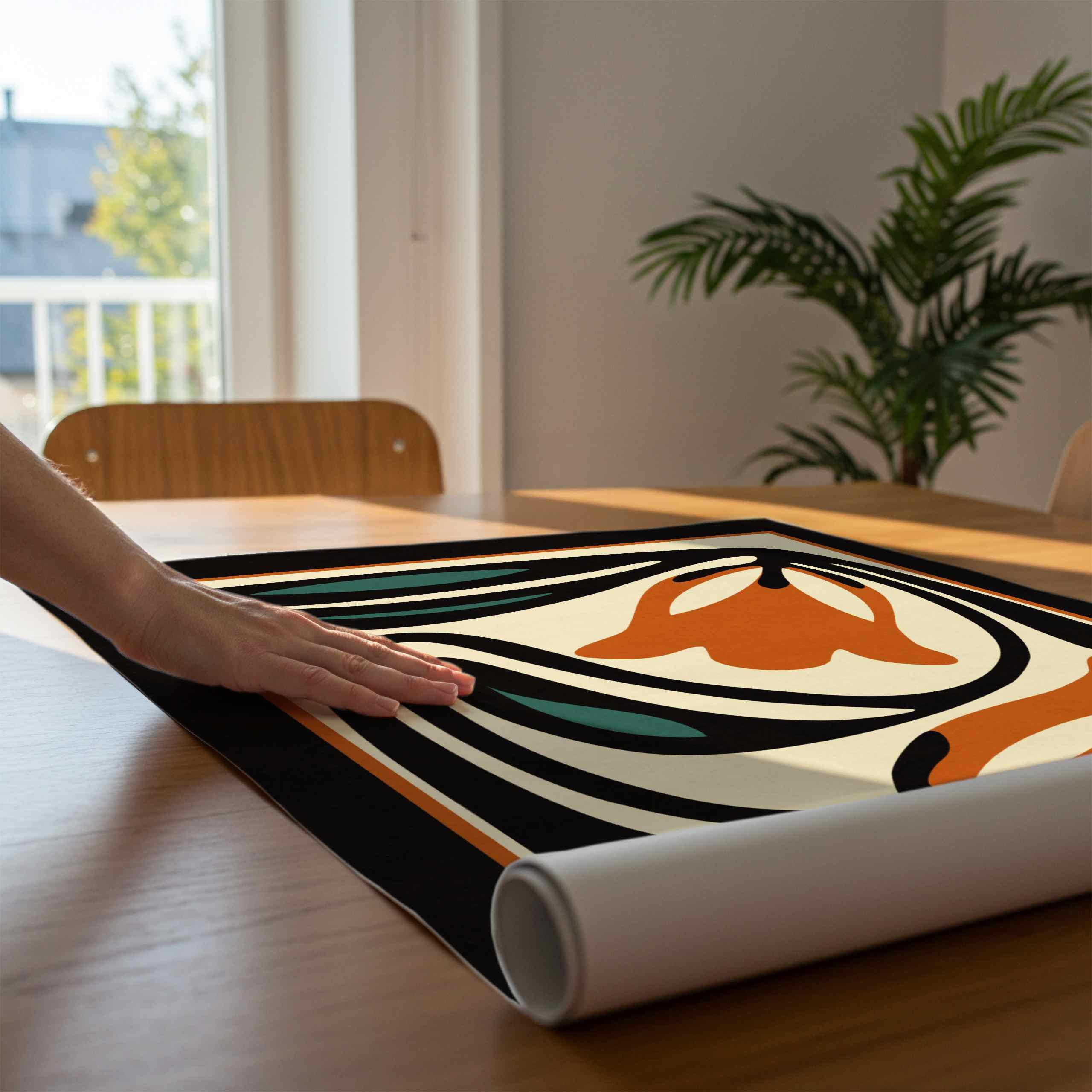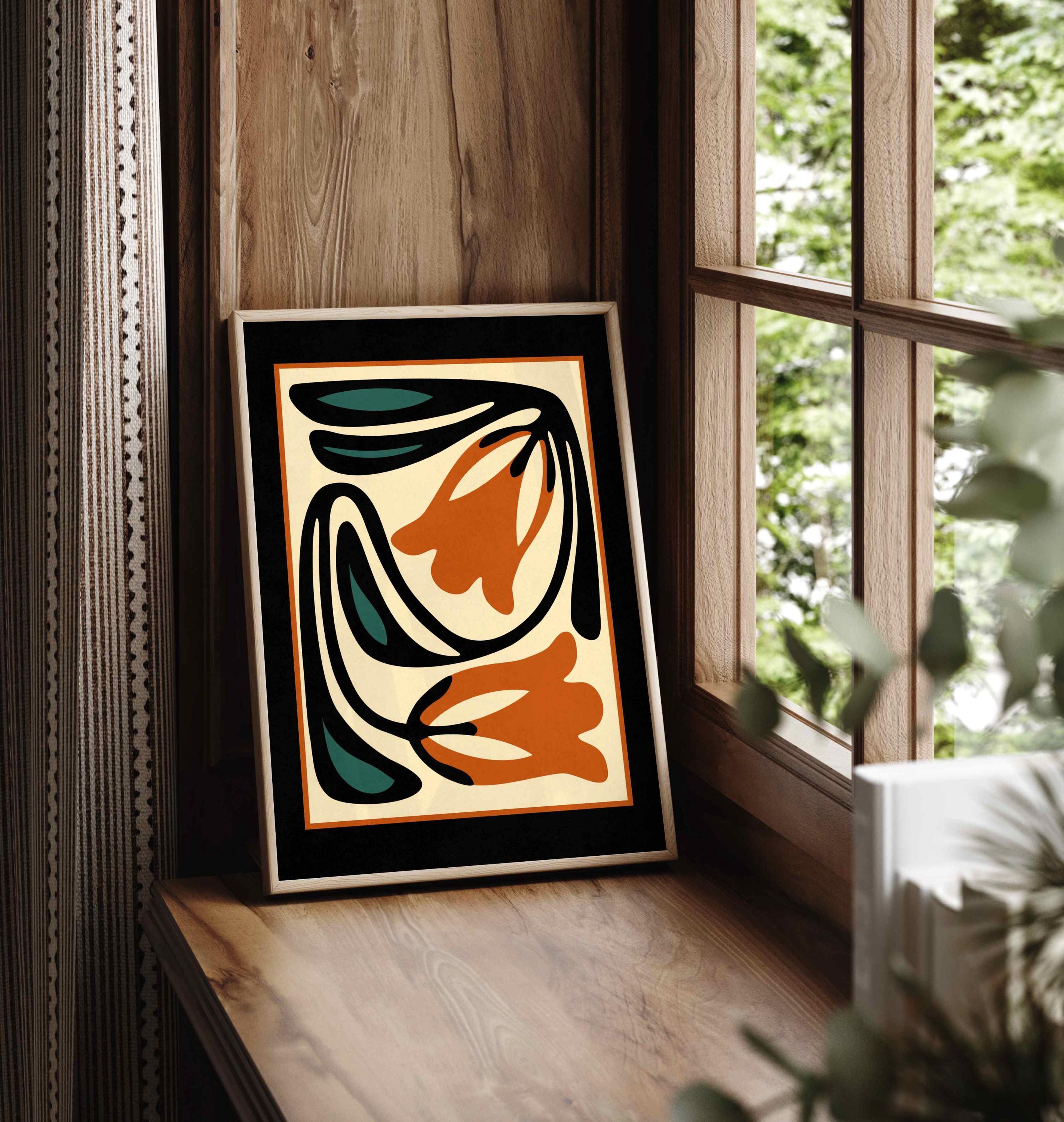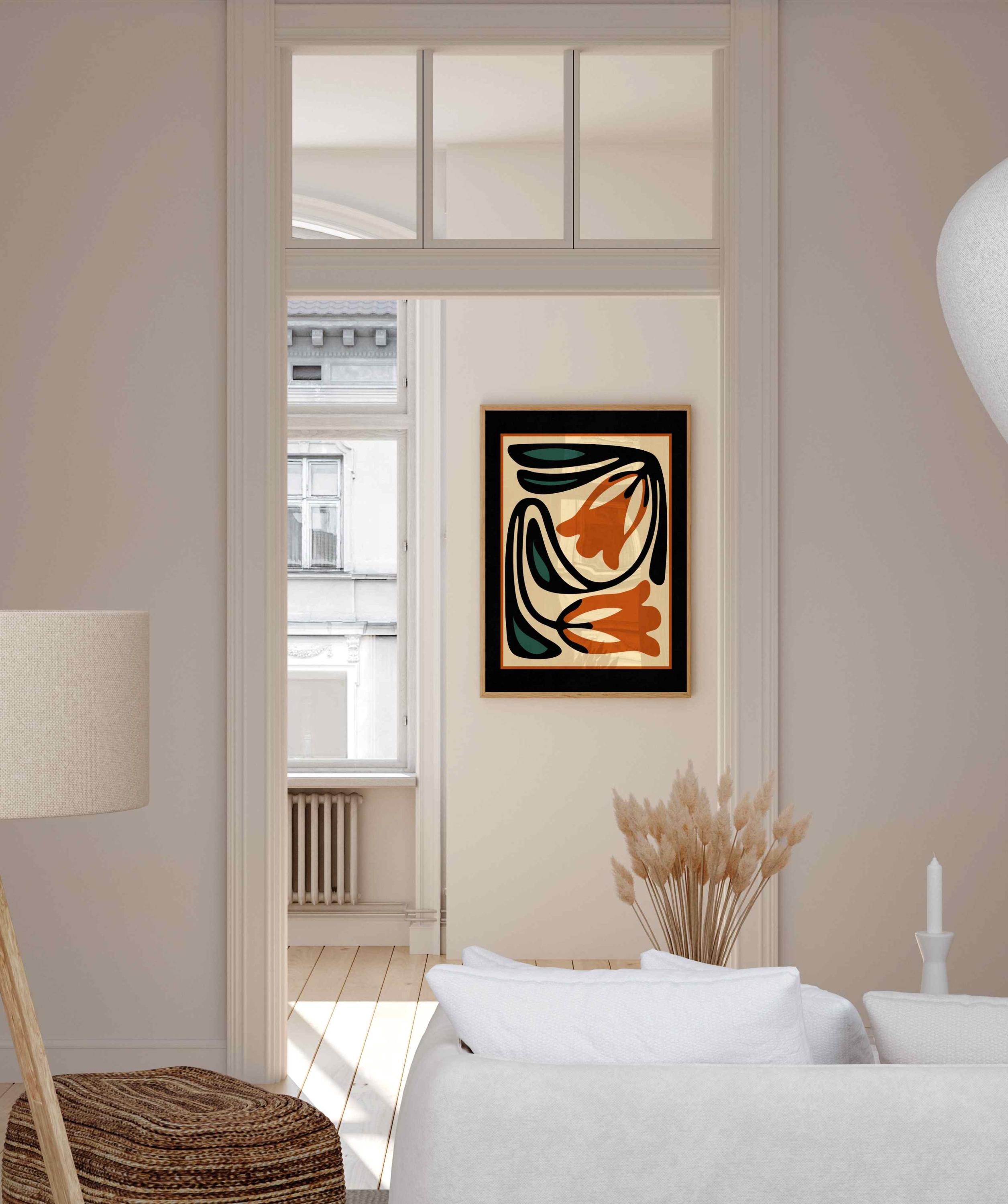 Unframed abstract retro floral print featuring stylized flowers and leaves in a black, burnt orange, teal and cream color palette. This piece blends retro botanical style with mid century modern design, creating a look that’s both earthy and bold.
