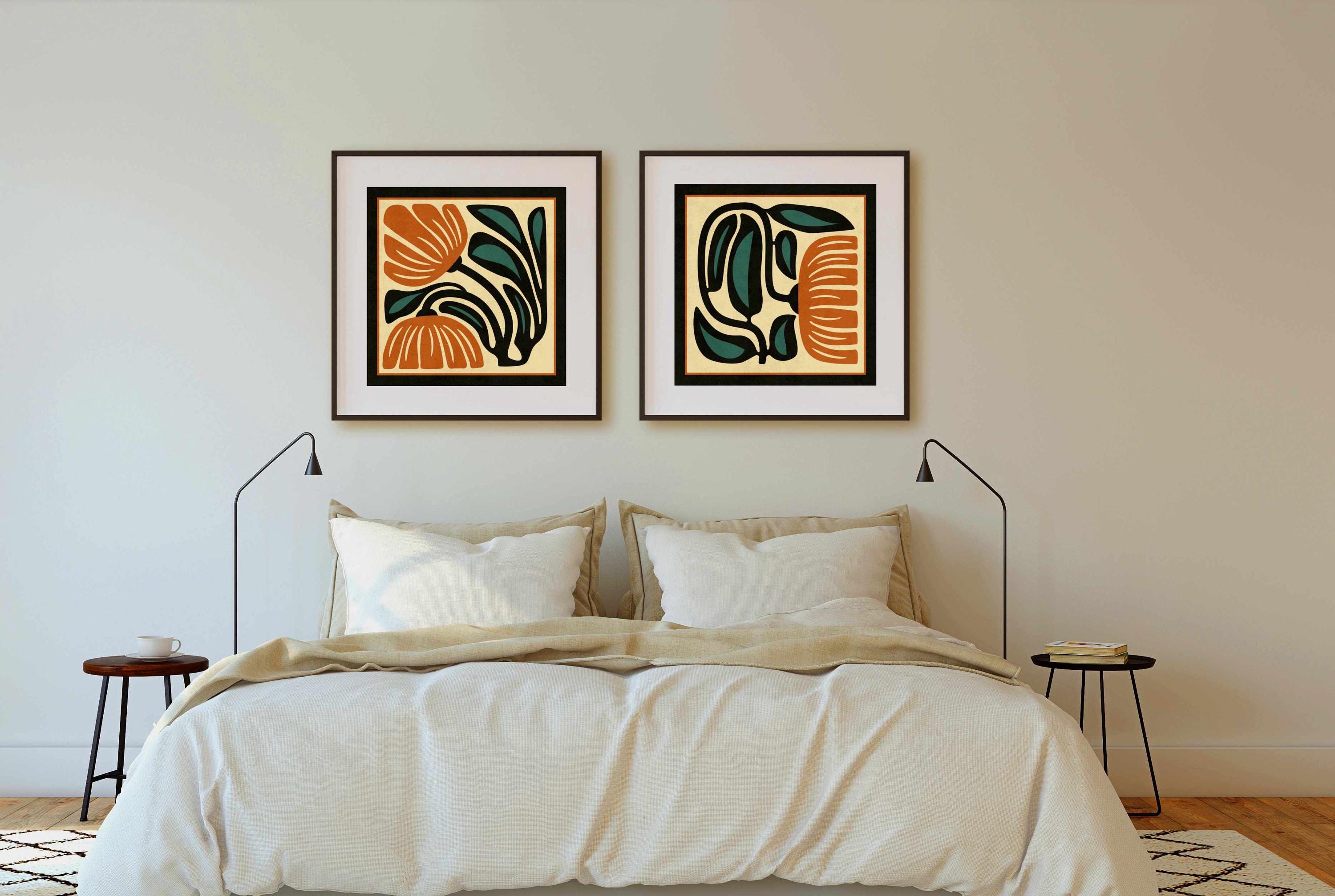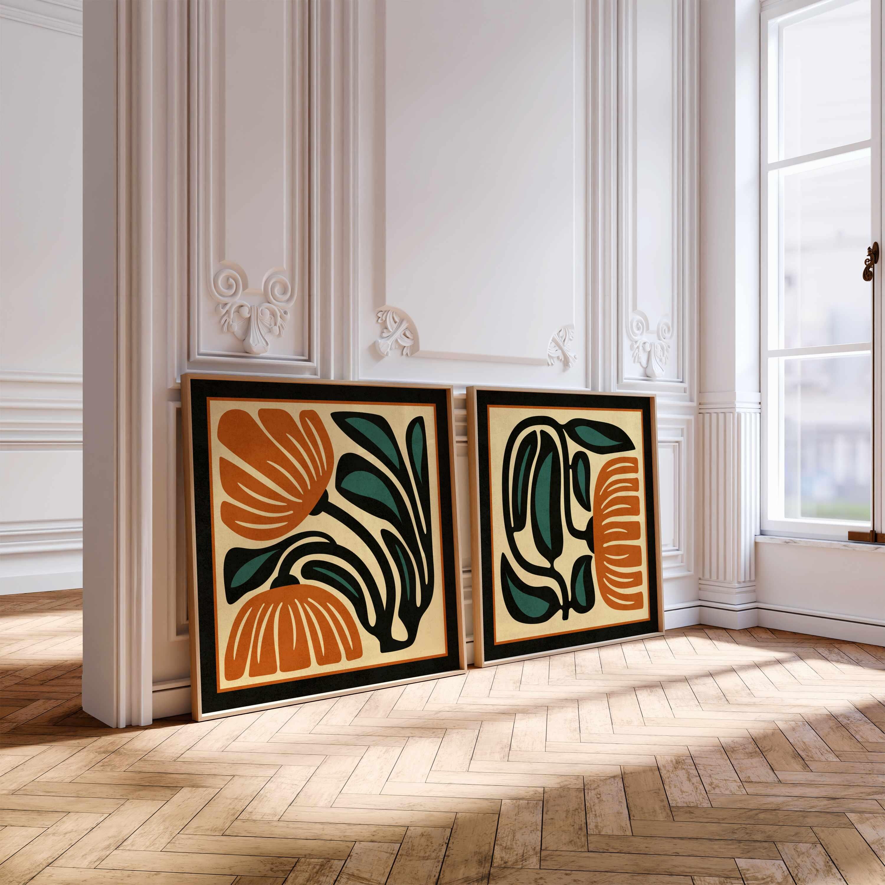 Abstract retro floral print set inspired by Matisse botanical shapes and groovy 70s design. This flower duo features burnt orange blooms, black leaves and teal details layered over a warm cream background, and finished off with a black border.