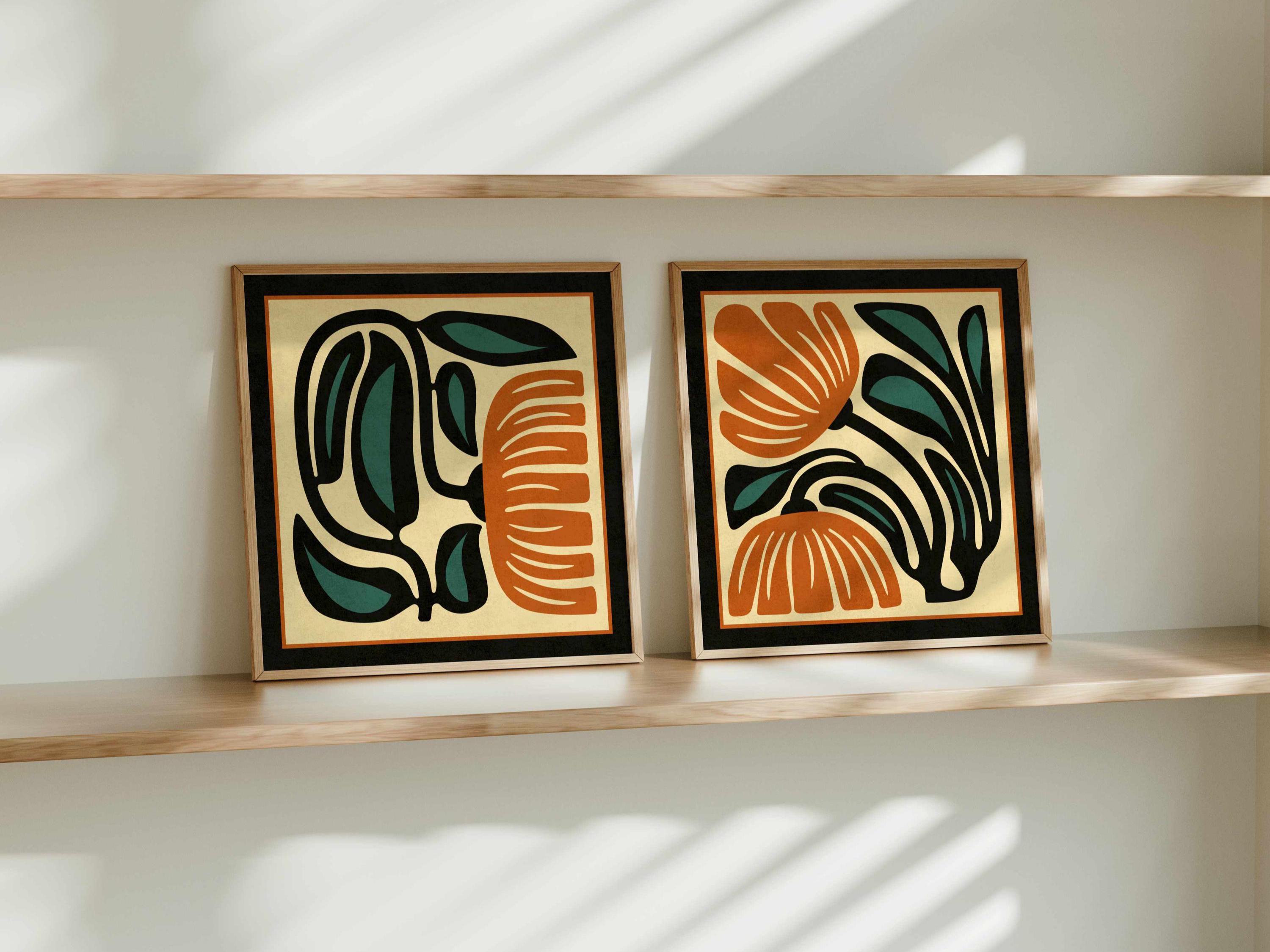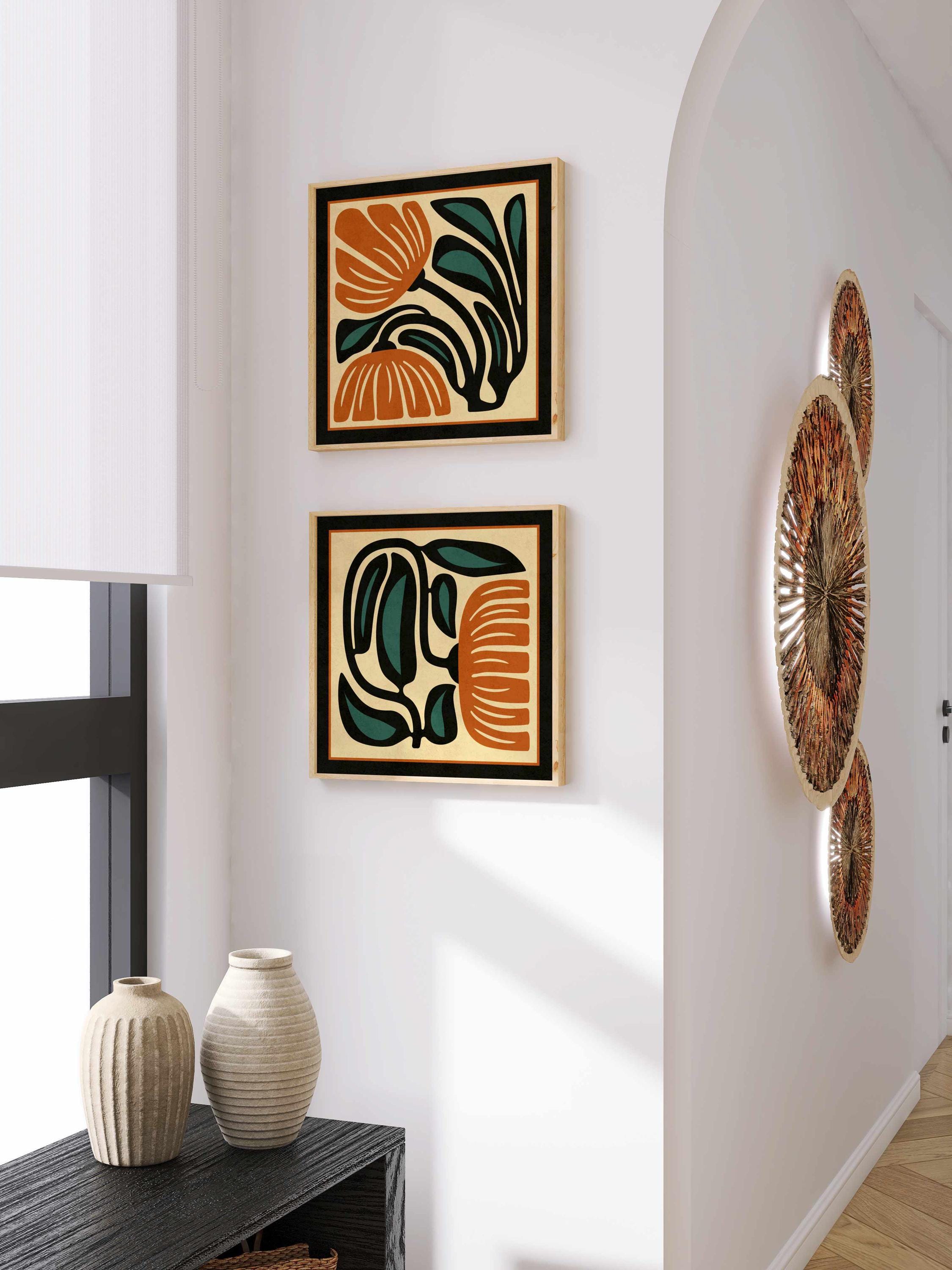 Framed abstract retro floral print set inspired by Matisse botanical shapes and groovy 70s design. This flower duo features burnt orange blooms, black leaves and teal details layered over a warm cream background, and finished off with a black border.