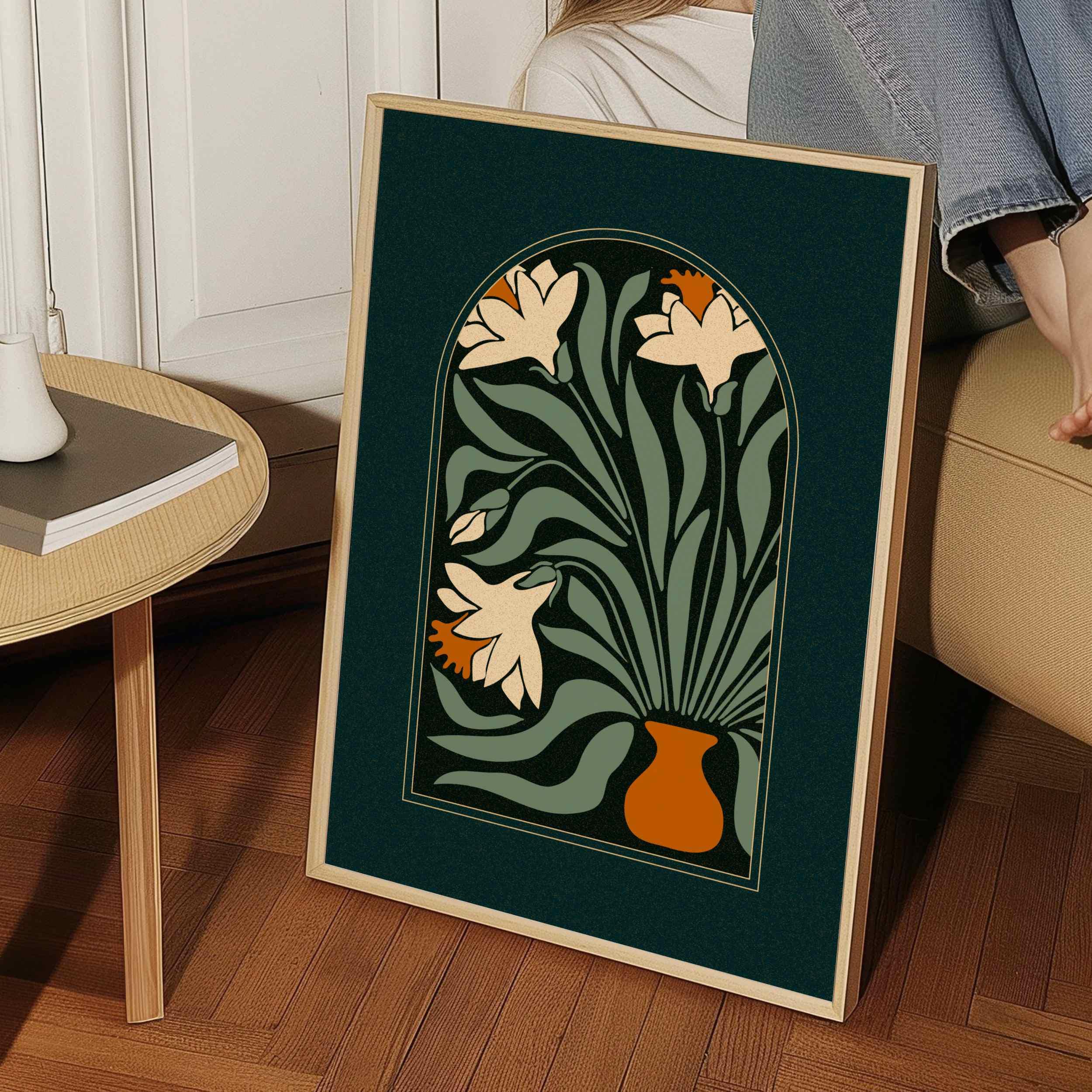 Framed daffodil print inspired by mid-century modern design. The simplified flowers and bold botanical shapes create a retro look that works well in Scandinavian, mid-century, and vintage style interiors.
