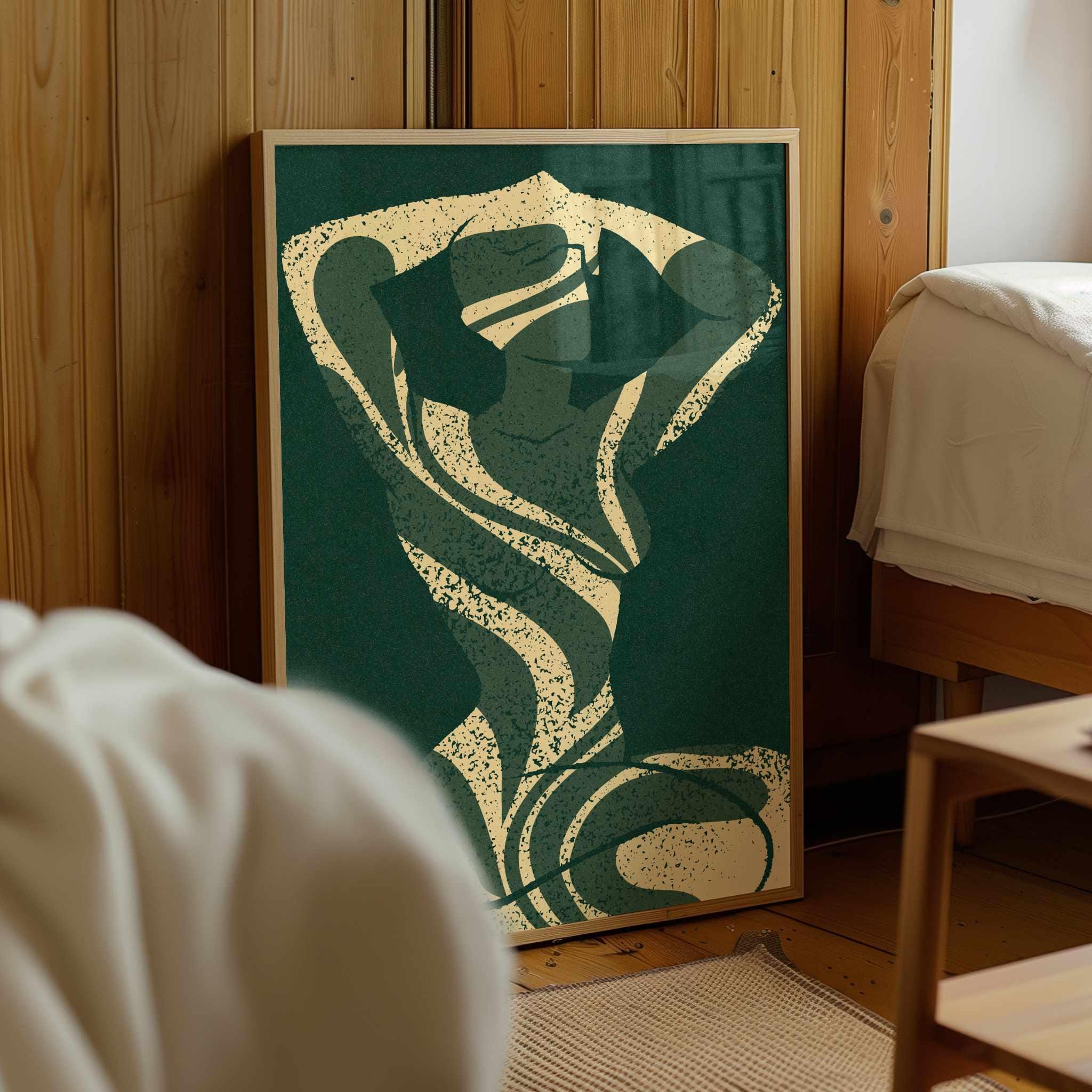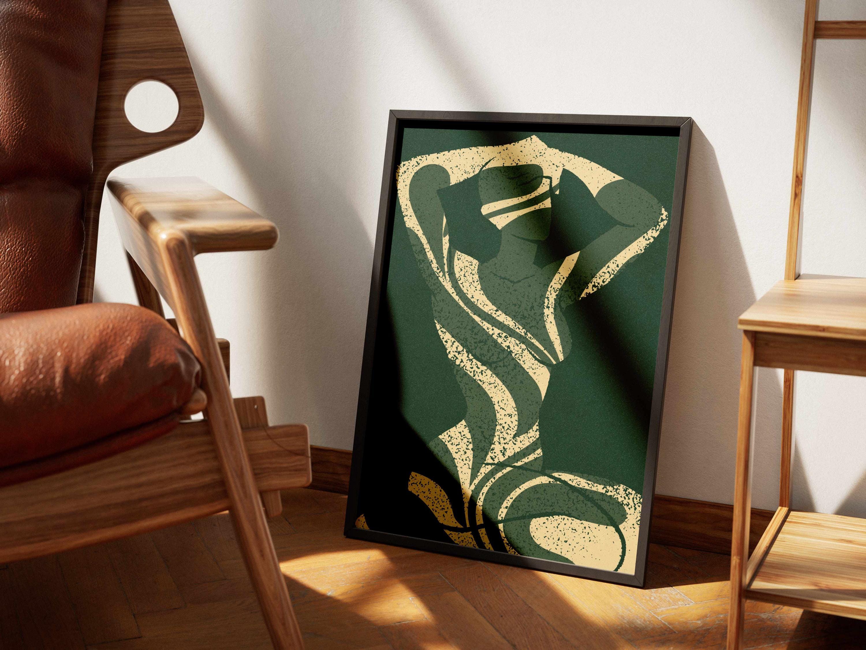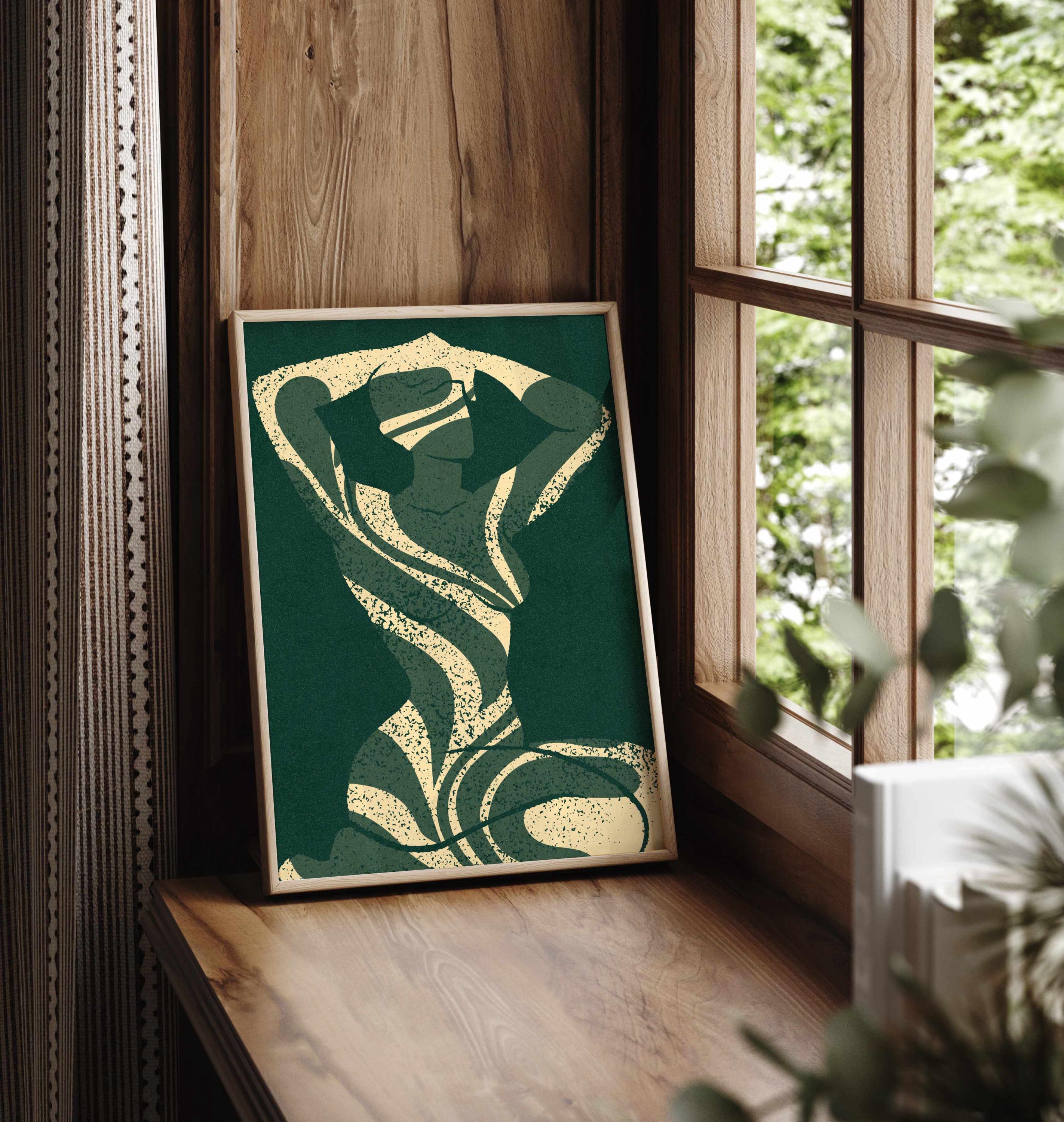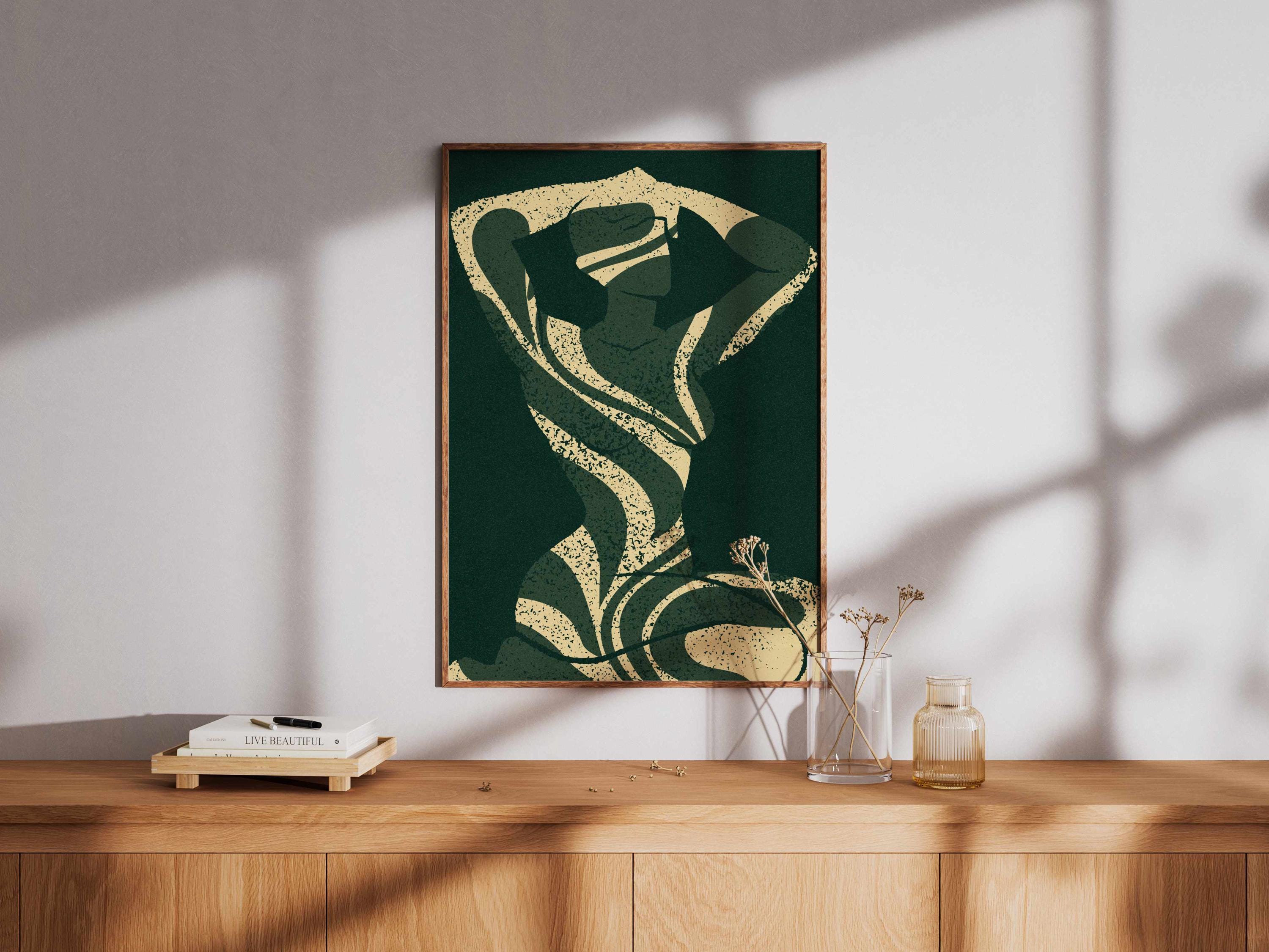 Abstract silhouette art print in deep emerald green and cream. Featuring a feminine figure formed by flowing leaf cutouts, this artwork balances softness and strength.