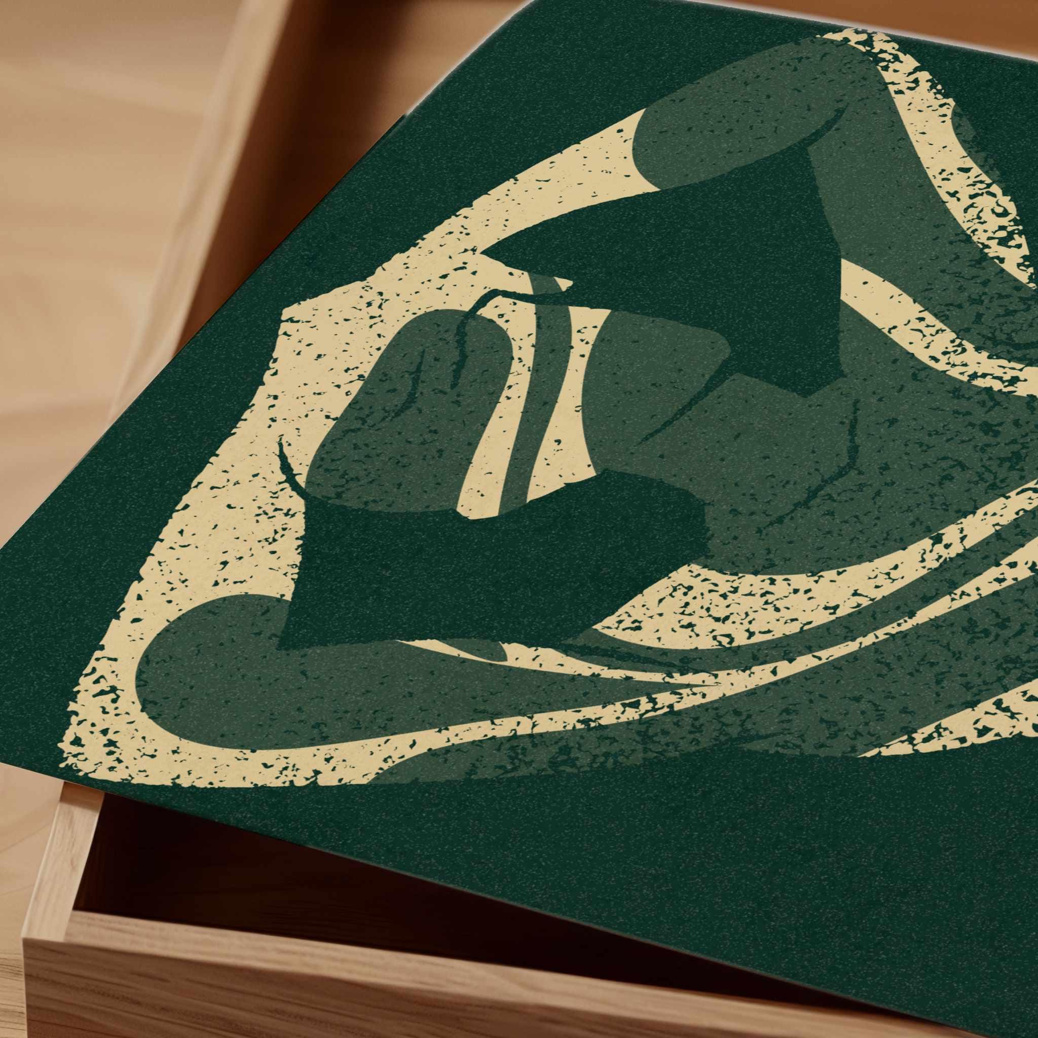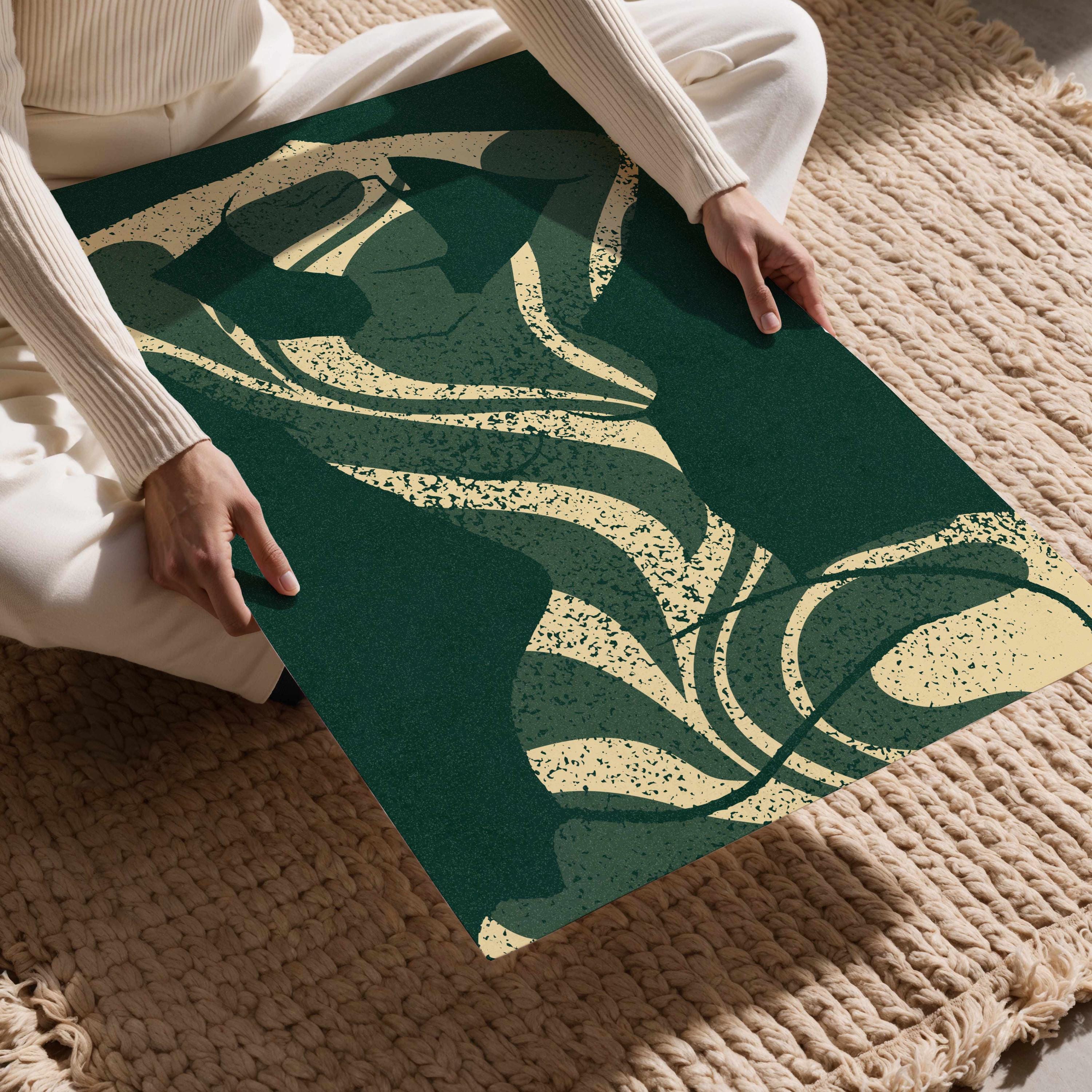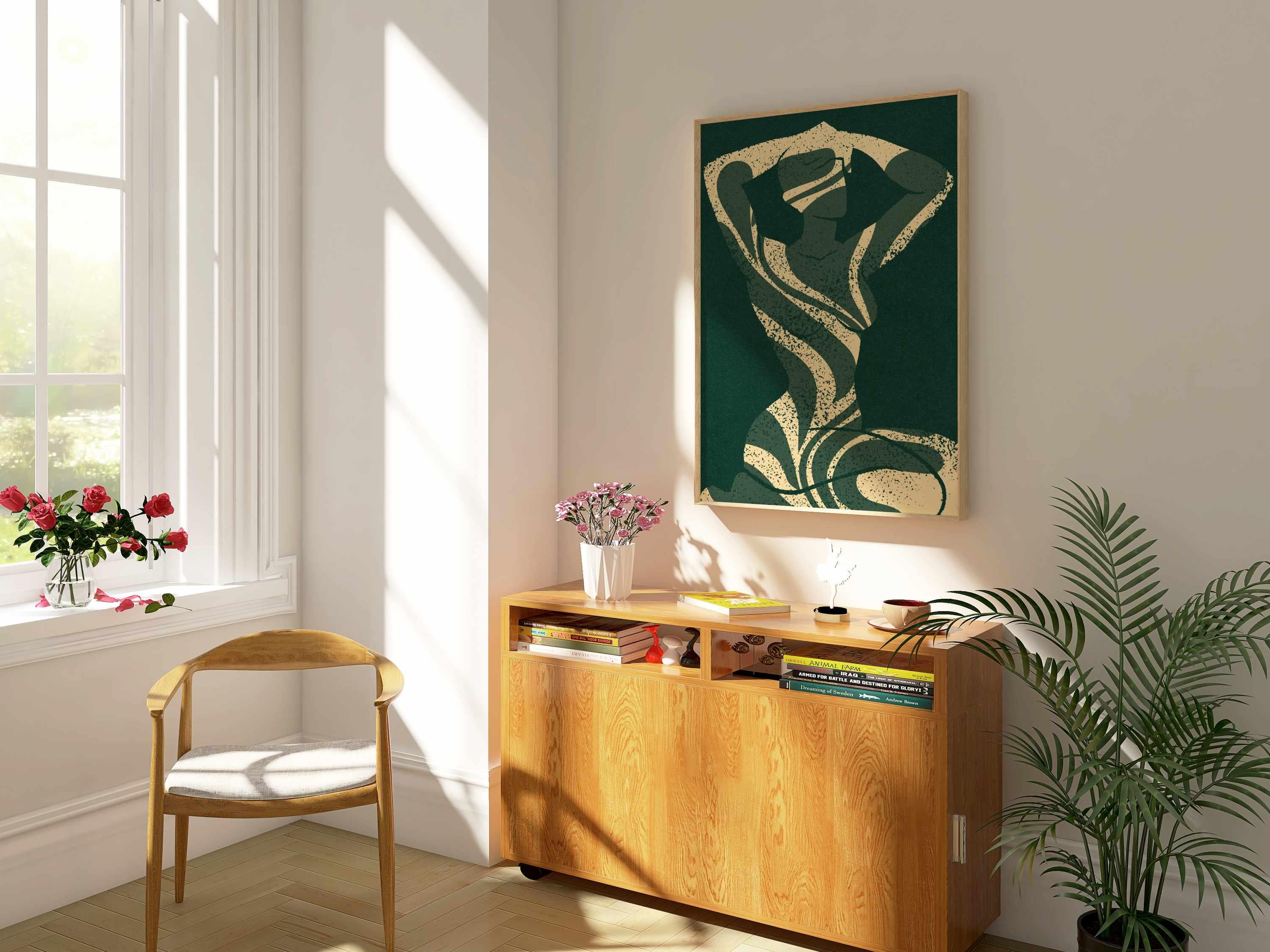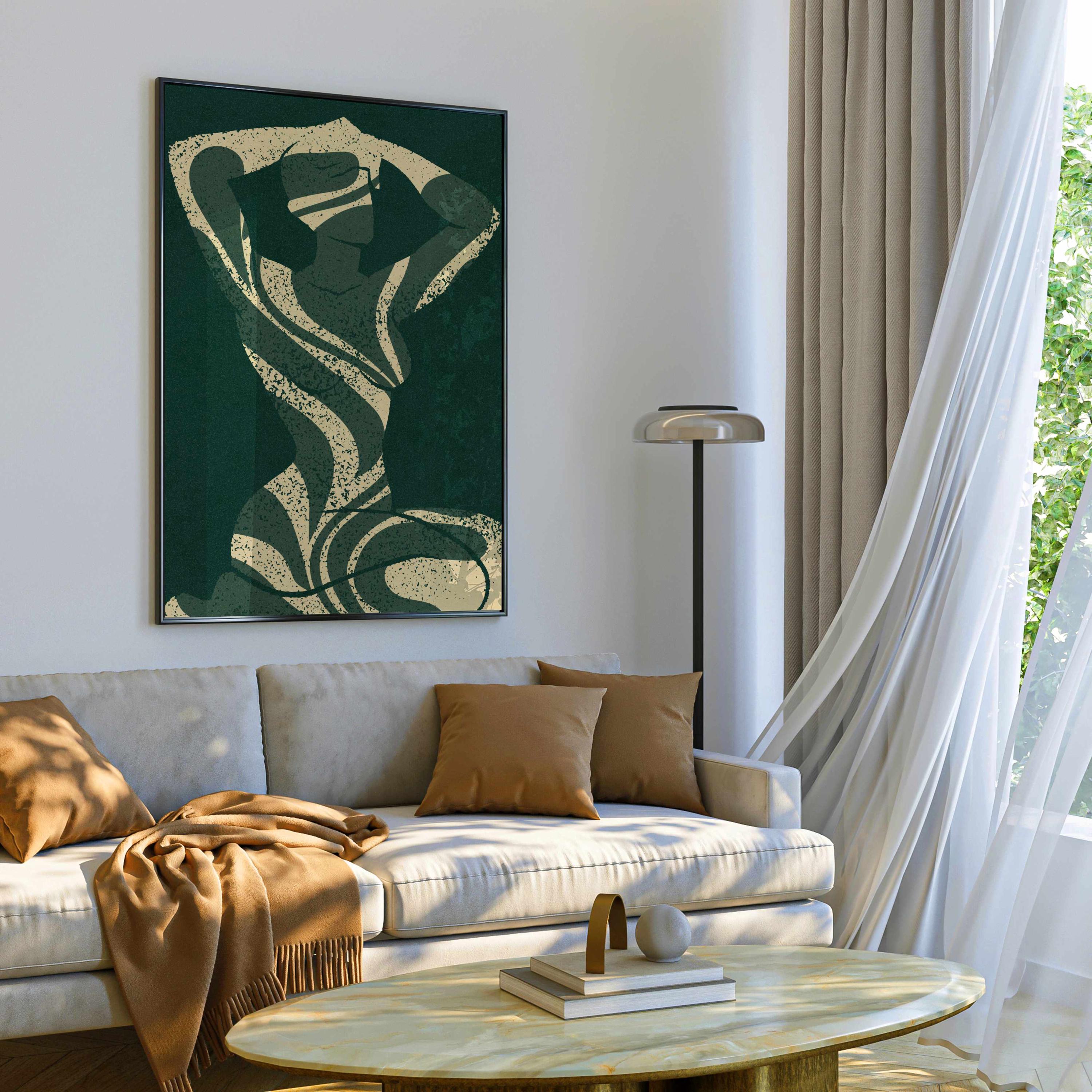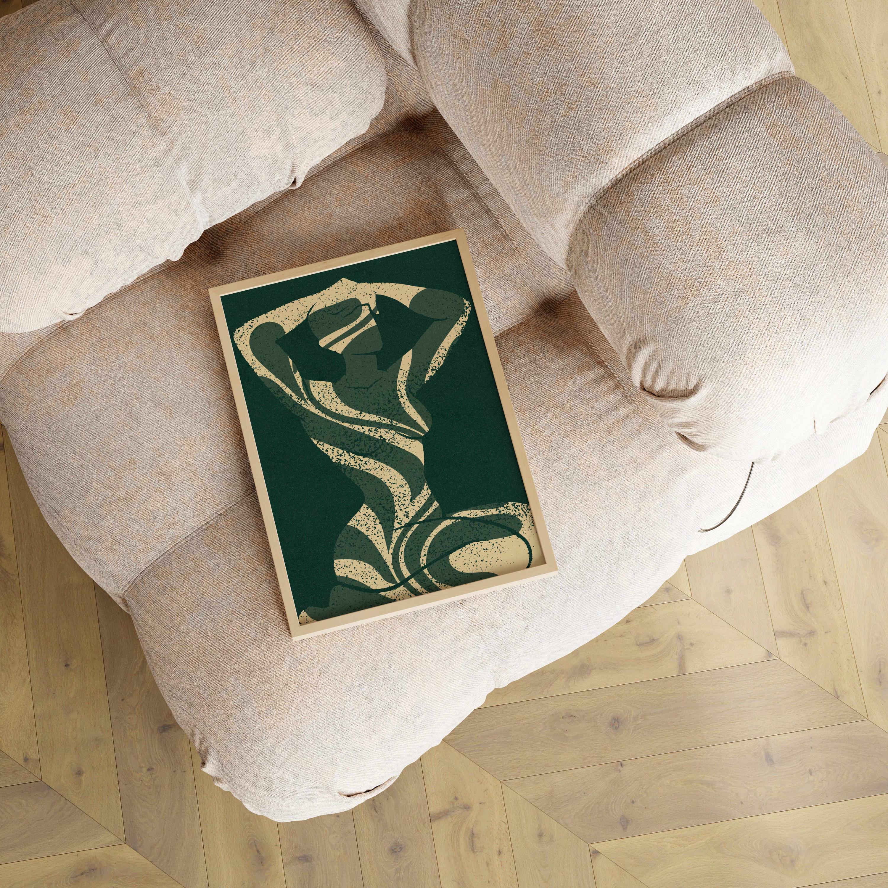 Abstract silhouette art print in deep emerald green and cream. Featuring a feminine figure formed by flowing leaf cutouts, this artwork balances softness and strength.