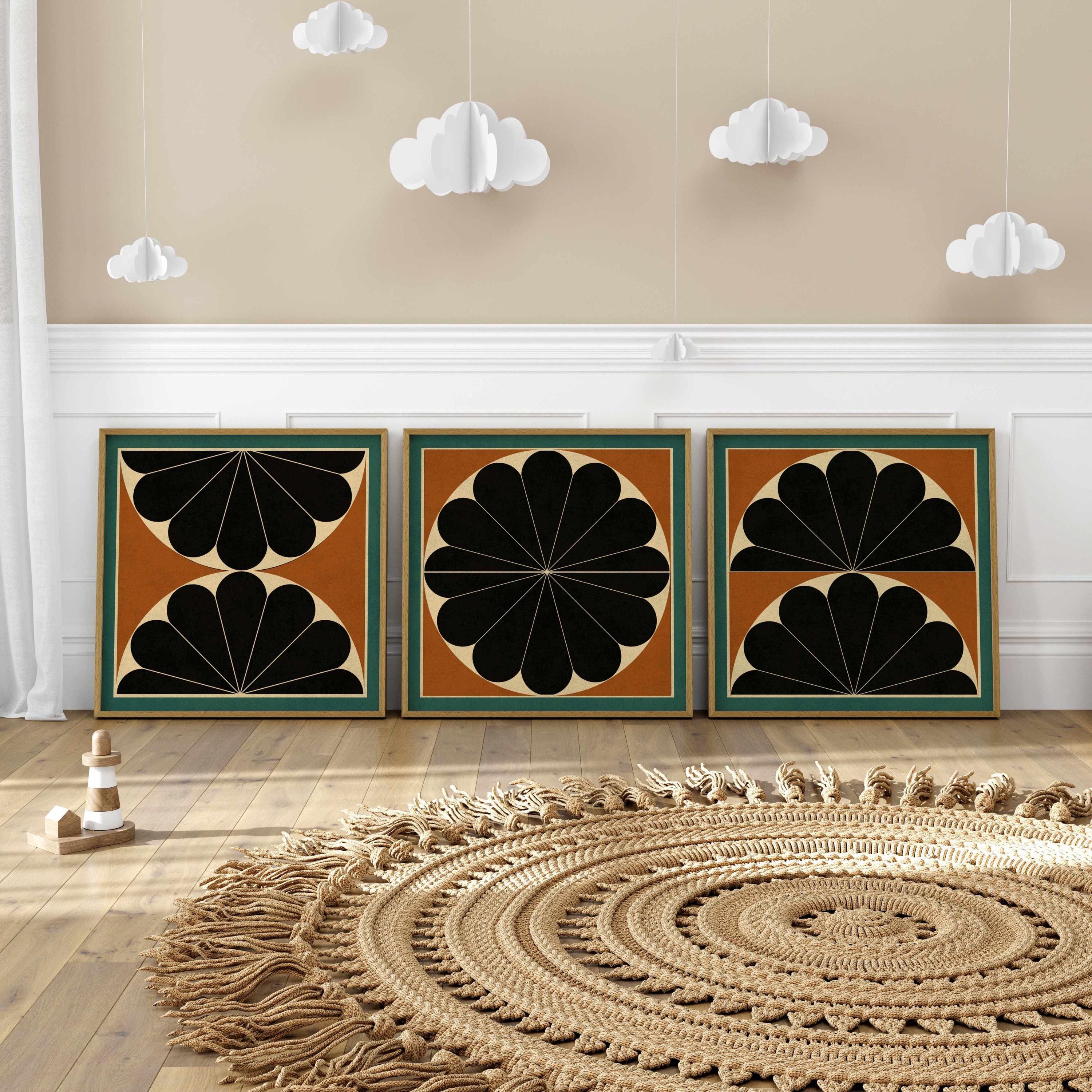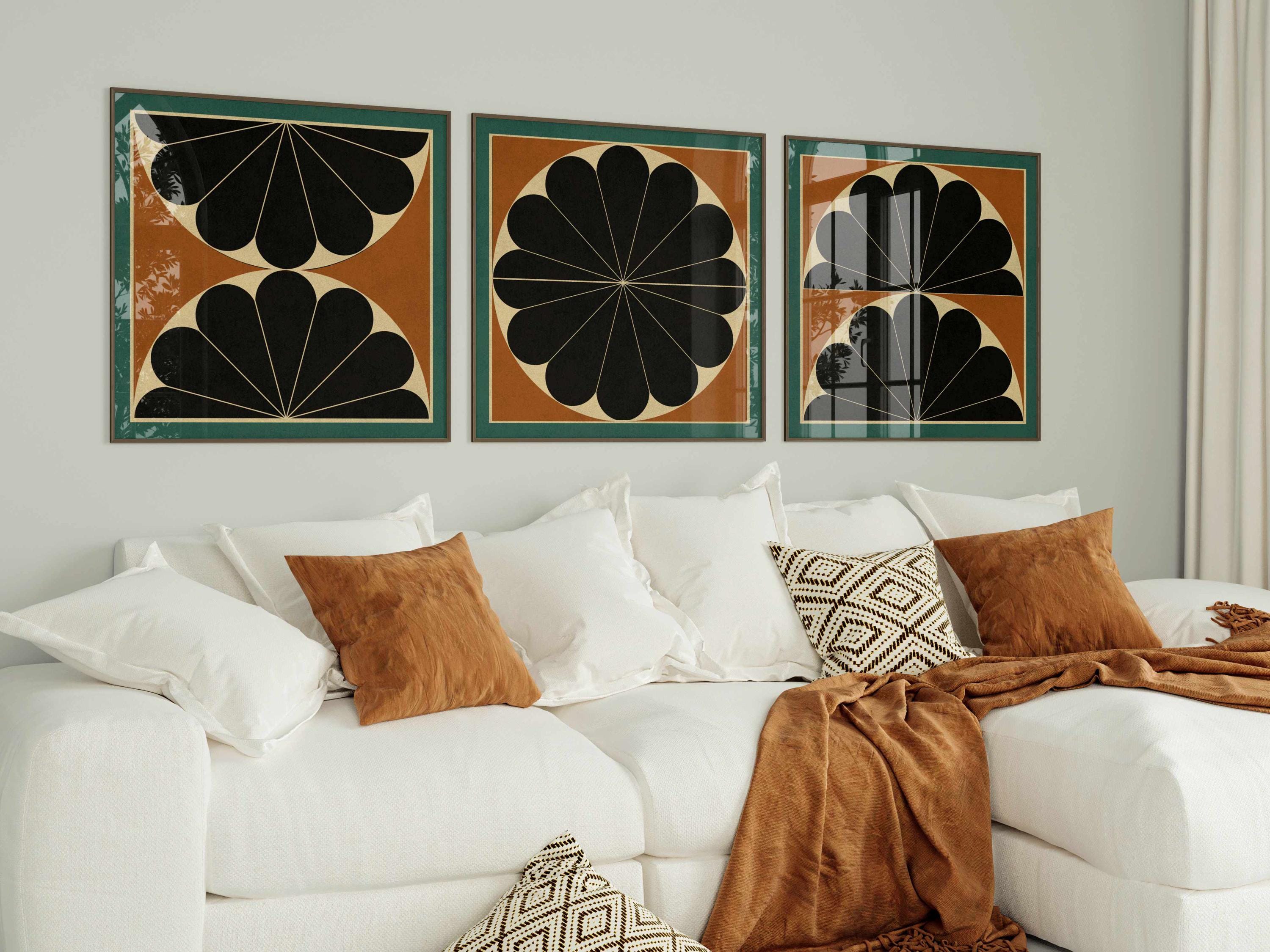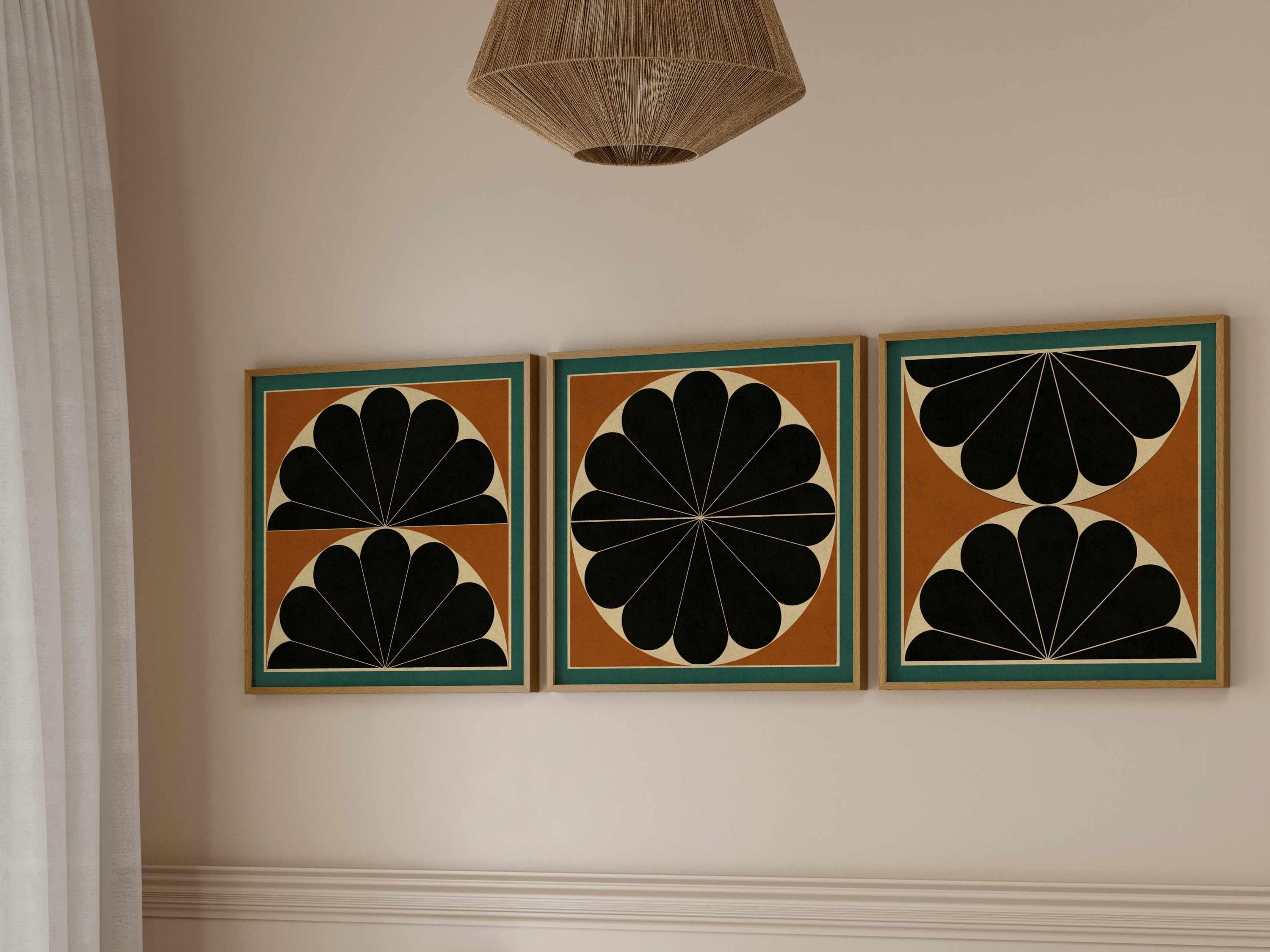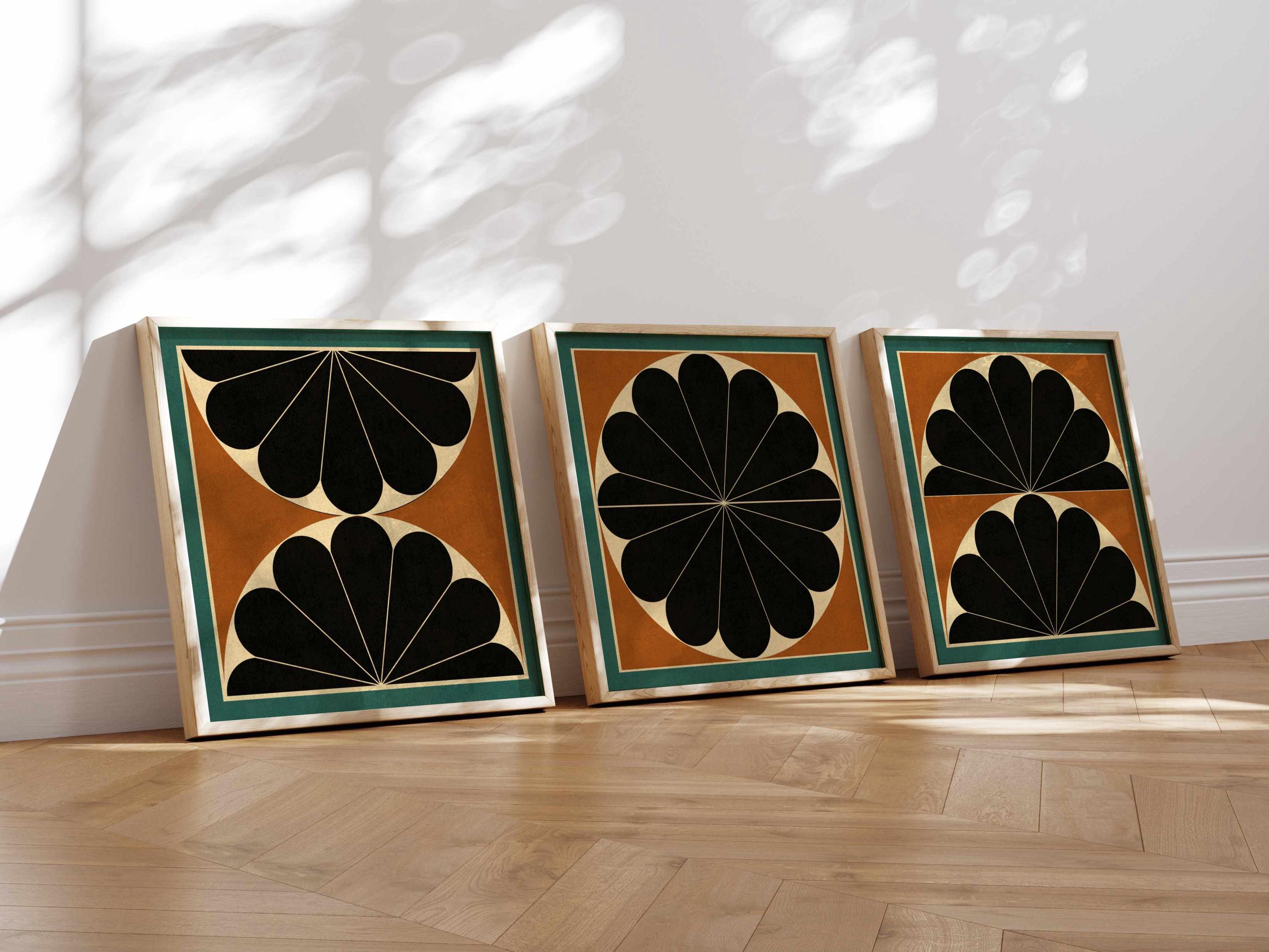 Abstract mid-century print set featuring geometric floral elements in a bold color palette of burnt orange, teal, cream and black. This gallery wall set is perfect for enhancing up any modern boho, mid century, or contemporary space, be it your living room, bedroom, office, dining room, or anywhere else.