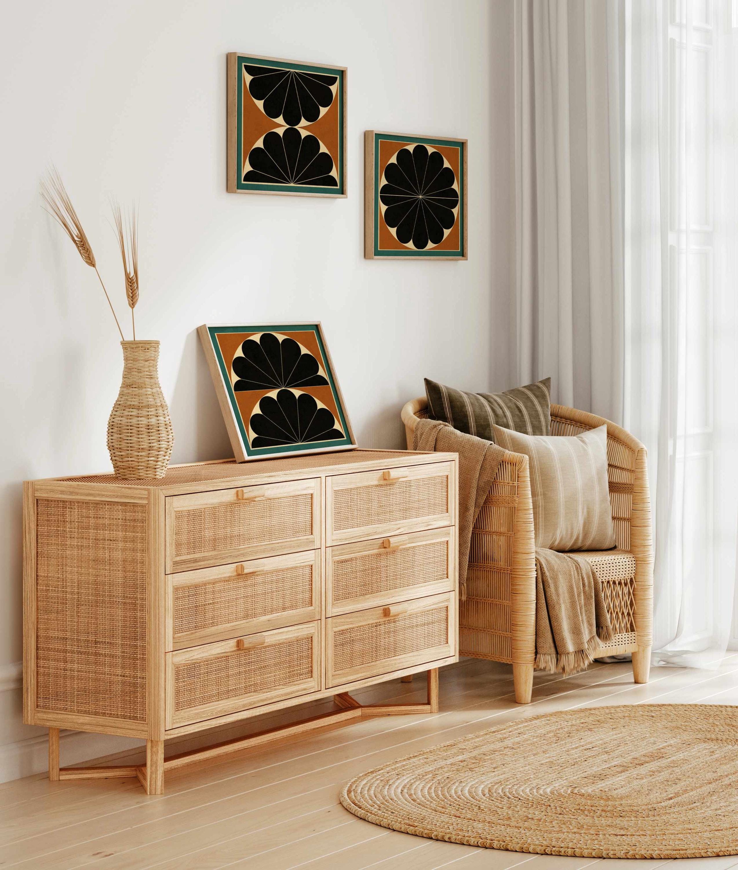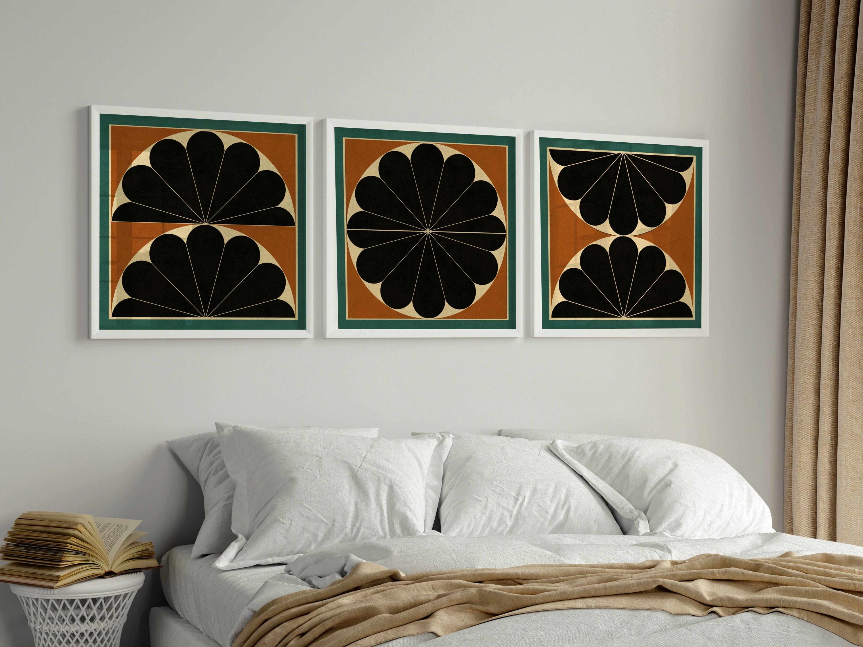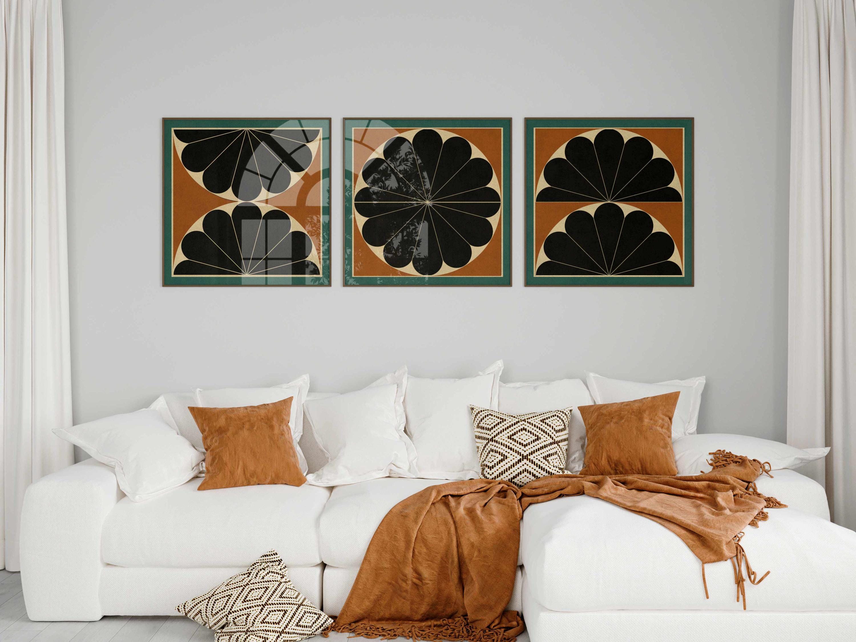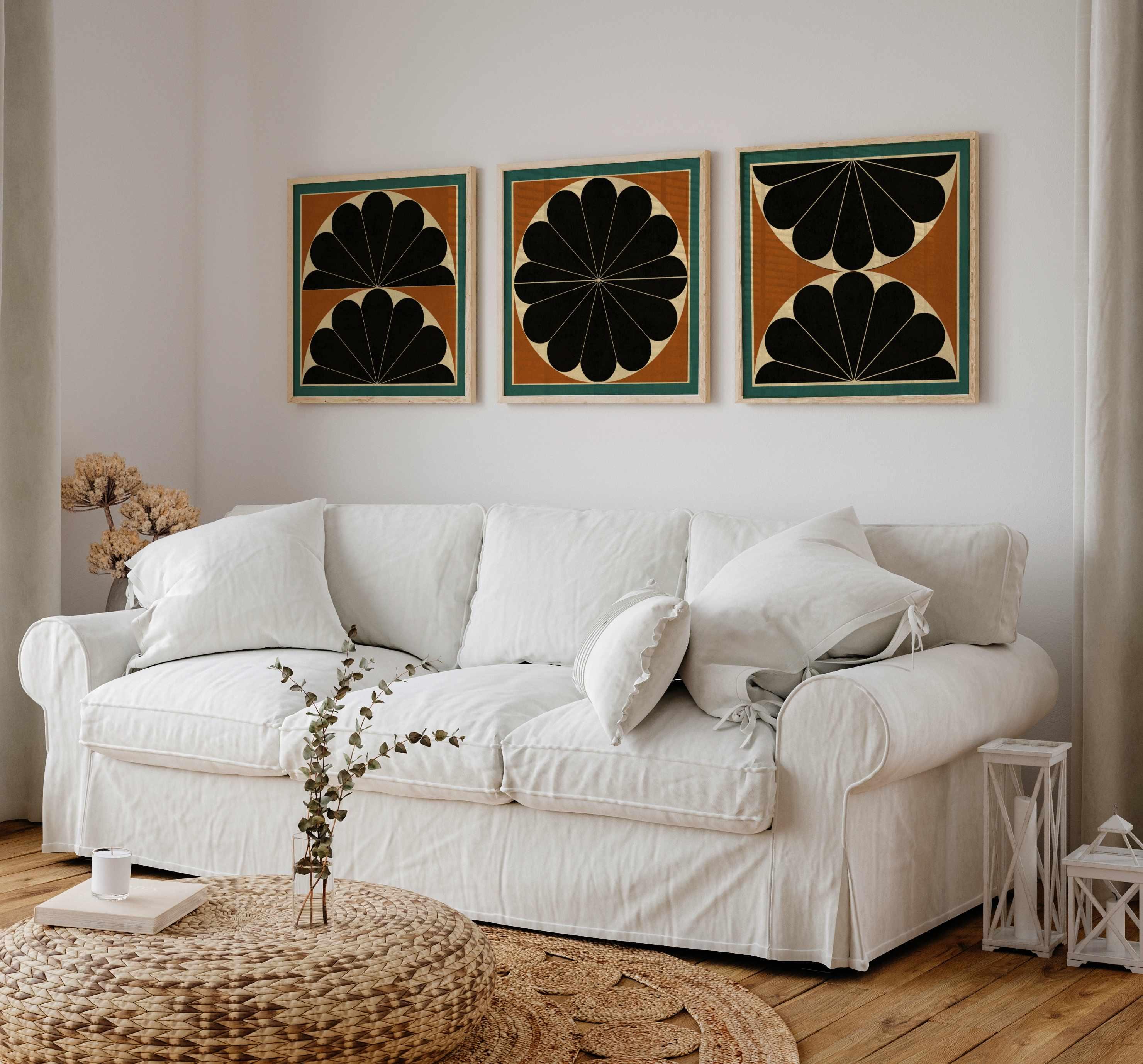 Abstract mid-century print set featuring geometric floral elements in a bold color palette of burnt orange, teal, cream and black. This gallery wall set is perfect for enhancing up any modern boho, mid century, or contemporary space, be it your living room, bedroom, office, dining room, or anywhere else.