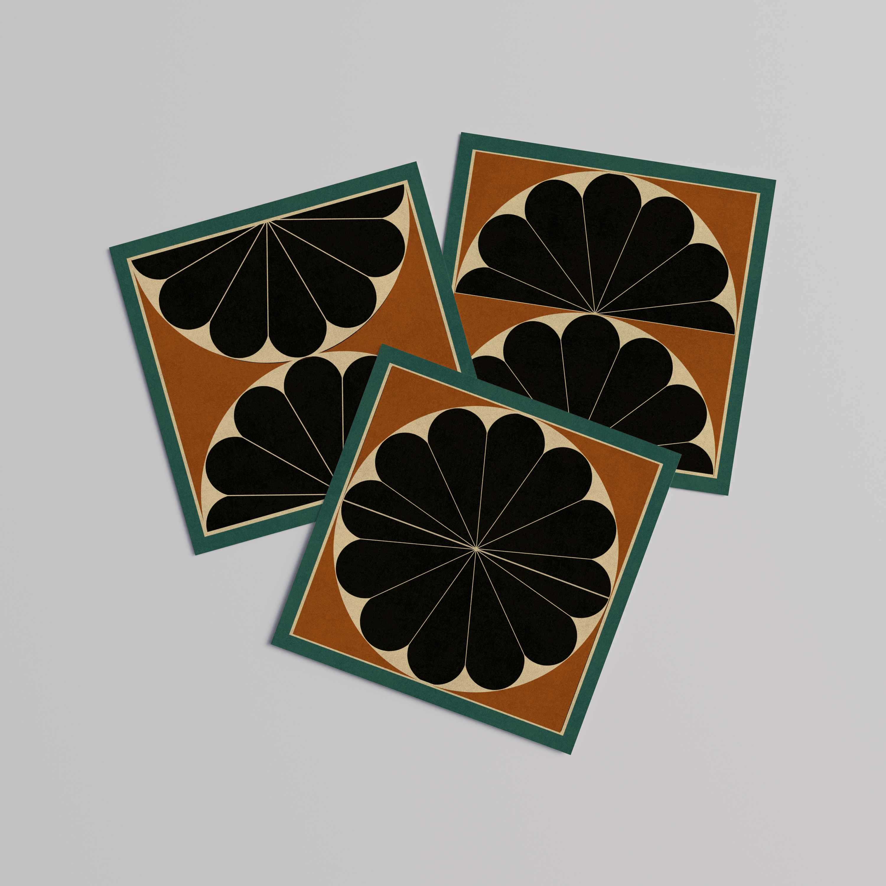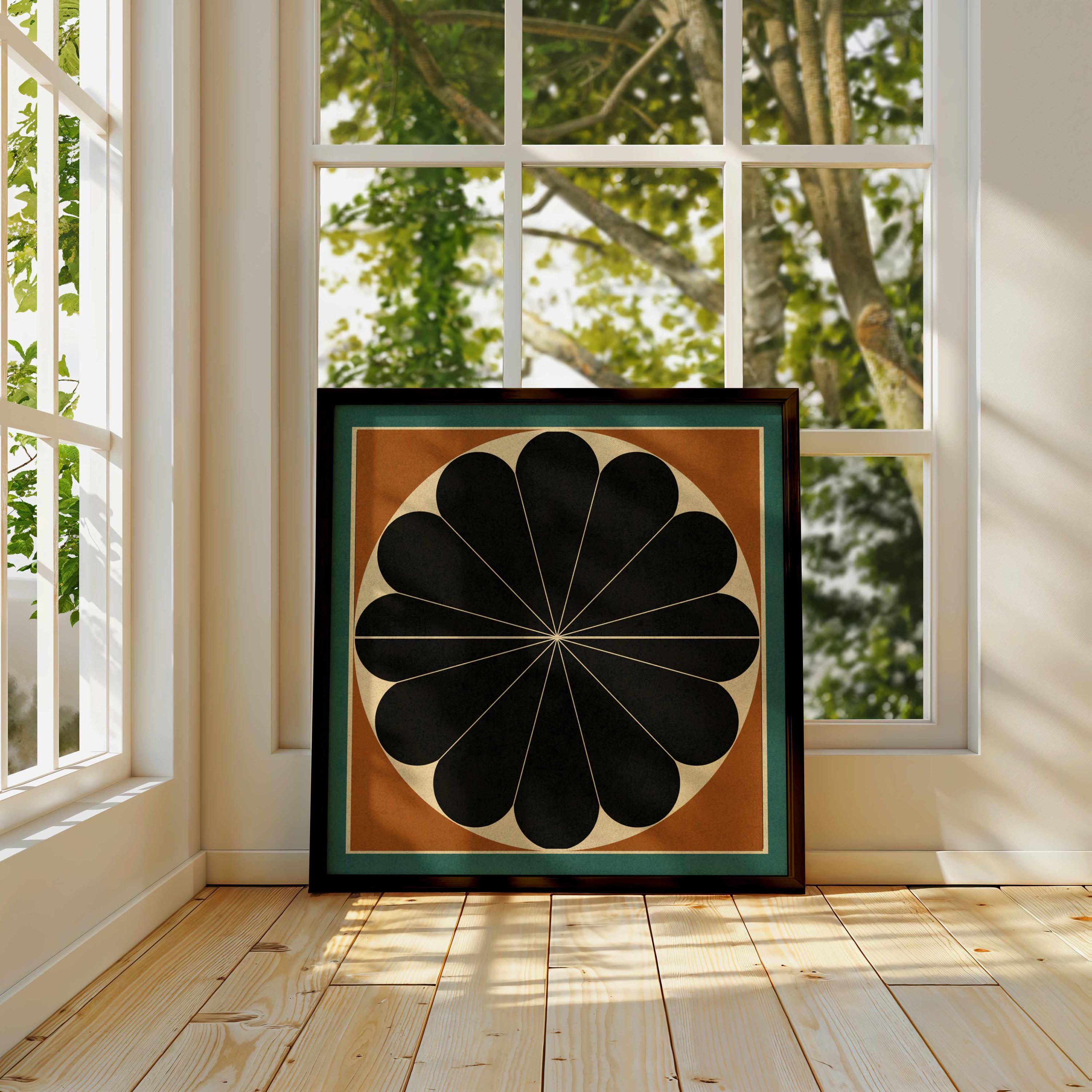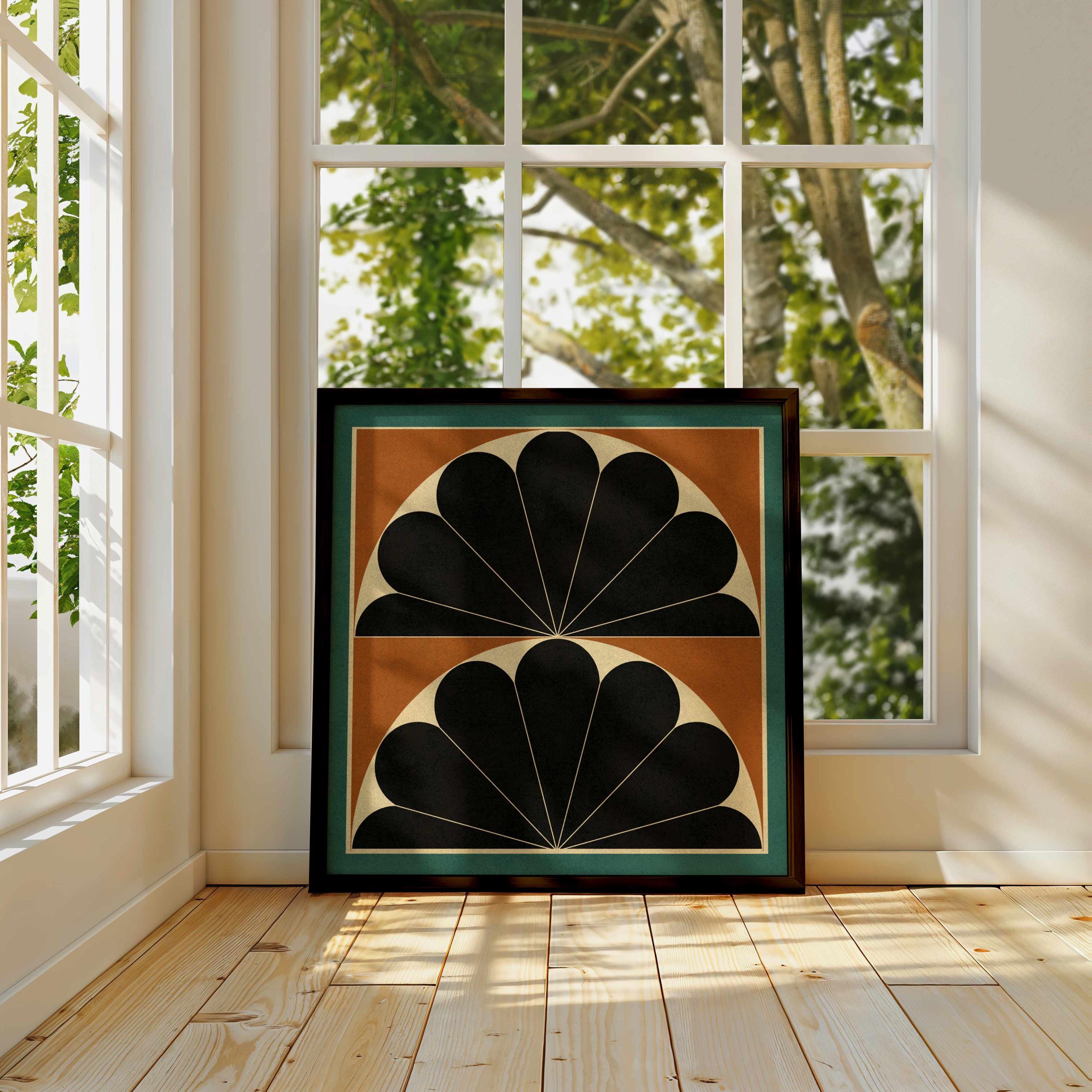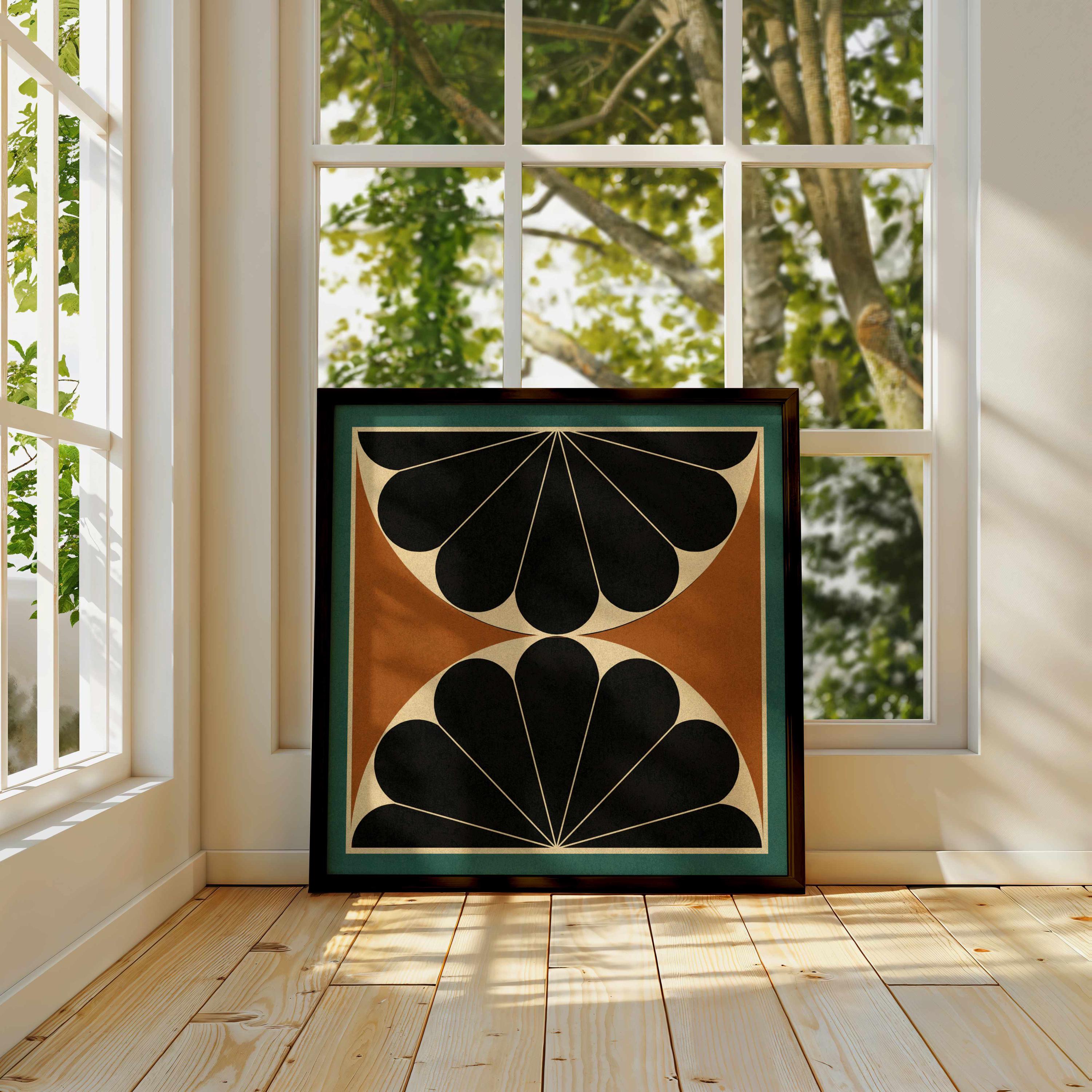 Abstract mid-century print set featuring geometric floral elements in a bold color palette of burnt orange, teal, cream and black. This gallery wall set is perfect for enhancing up any modern boho, mid century, or contemporary space, be it your living room, bedroom, office, dining room, or anywhere else.