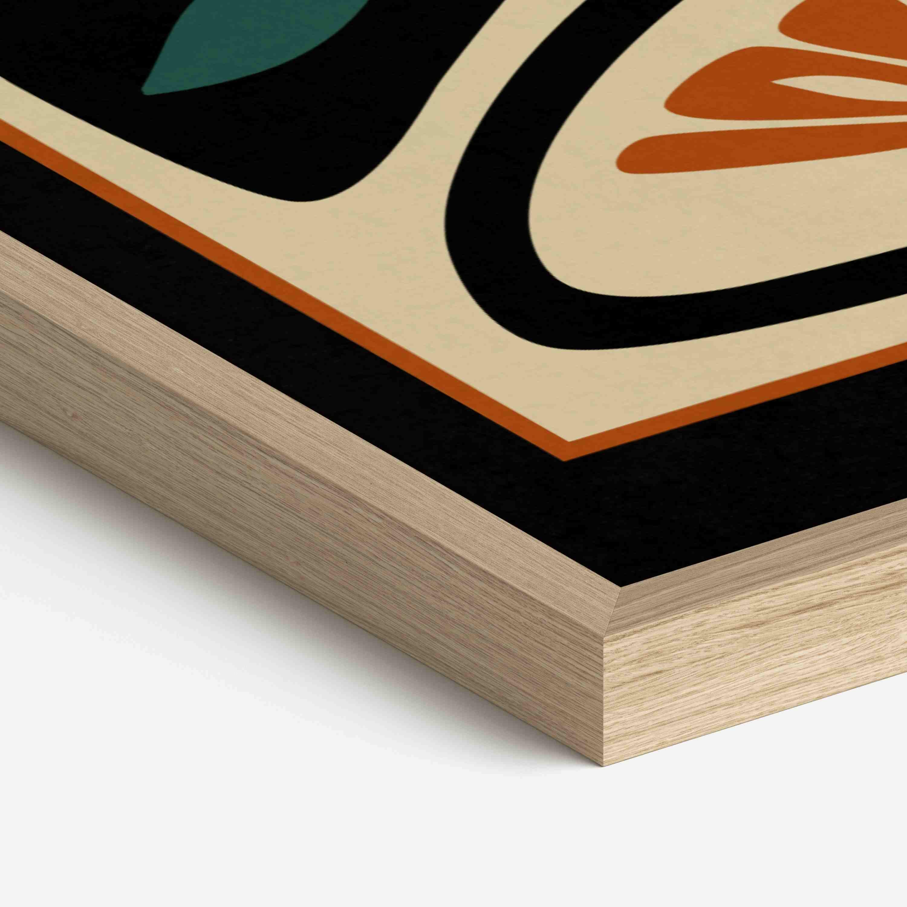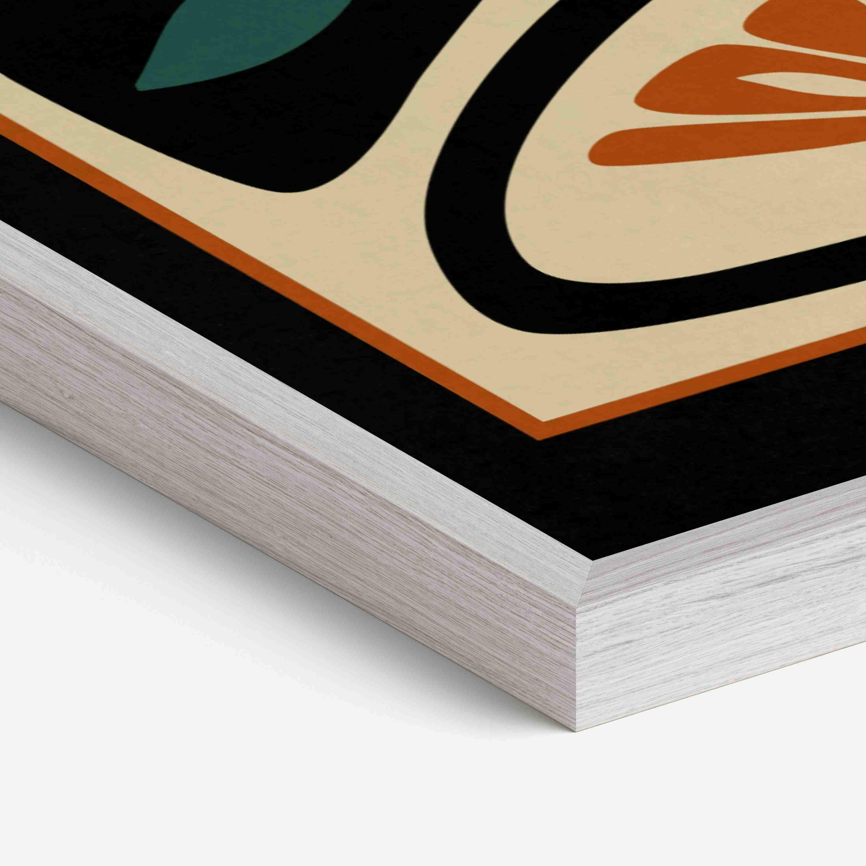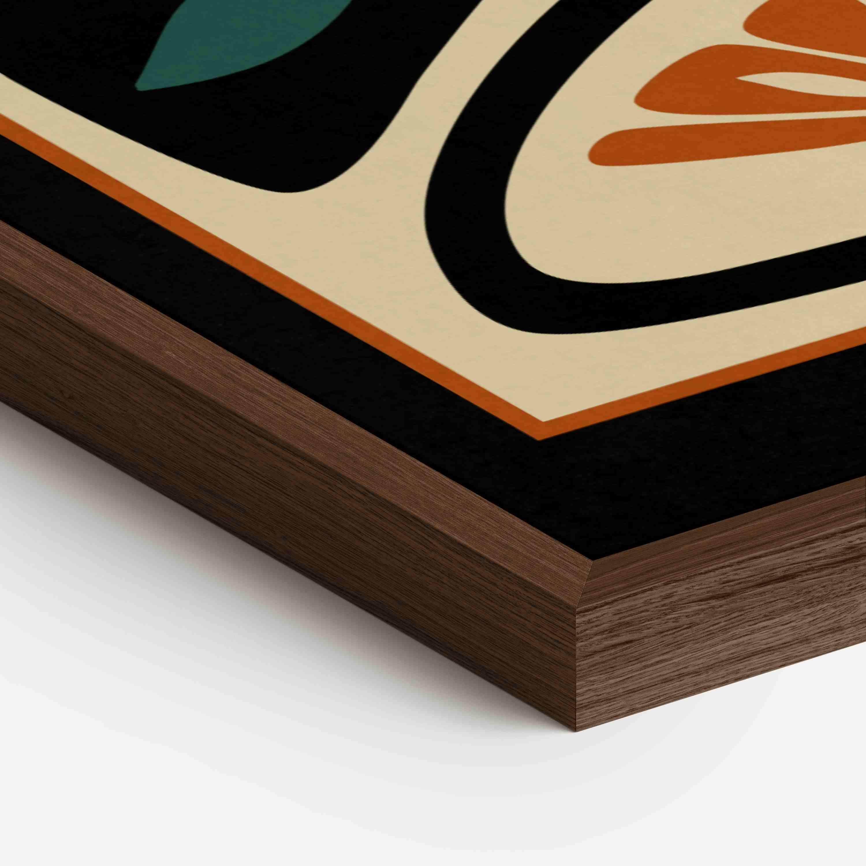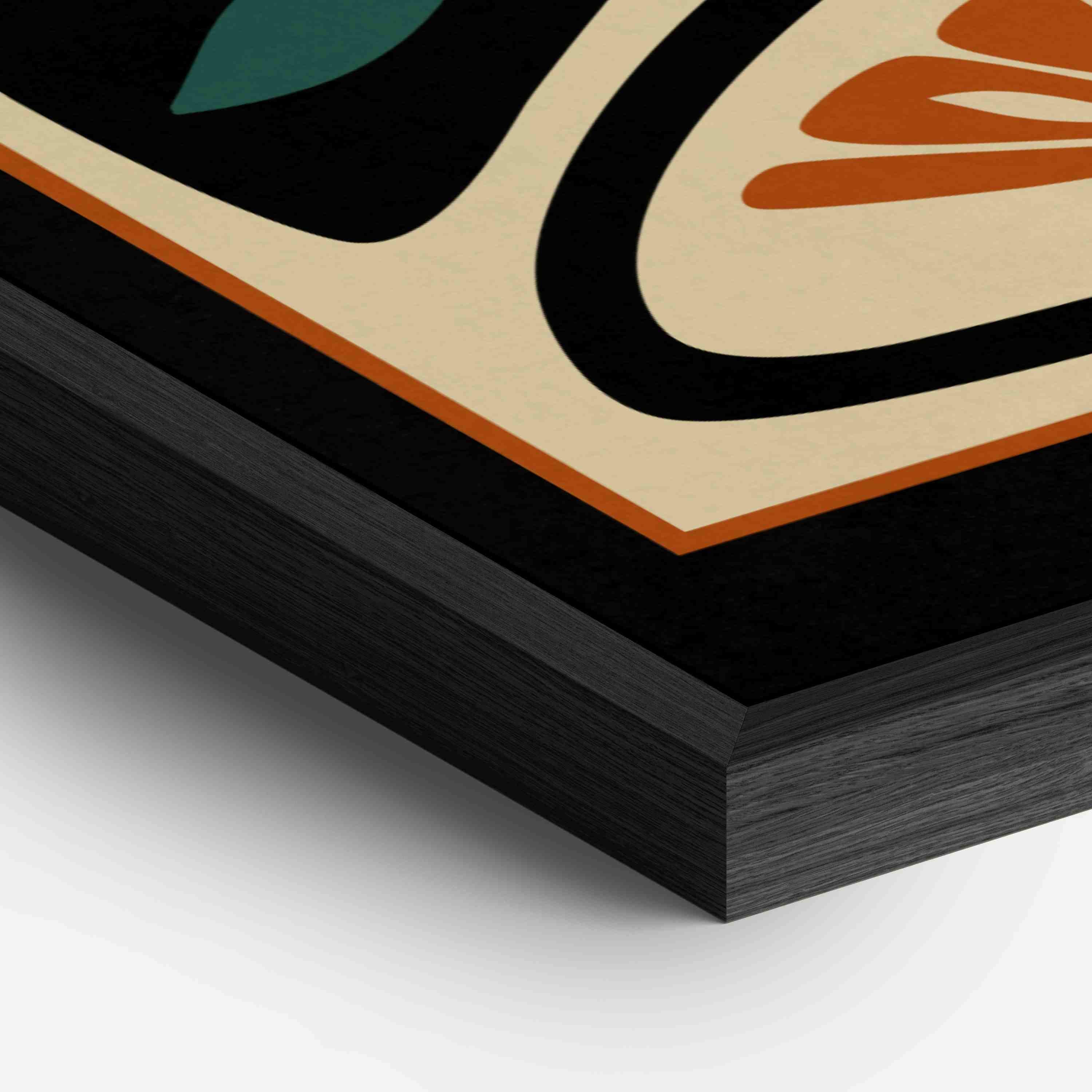 Framed abstract mid century floral print featuring stylized flowers and leaves in a black, burnt orange, teal and cream color palette. This piece blends retro botanical style with mid century modern design, creating a look that’s both earthy and bold.