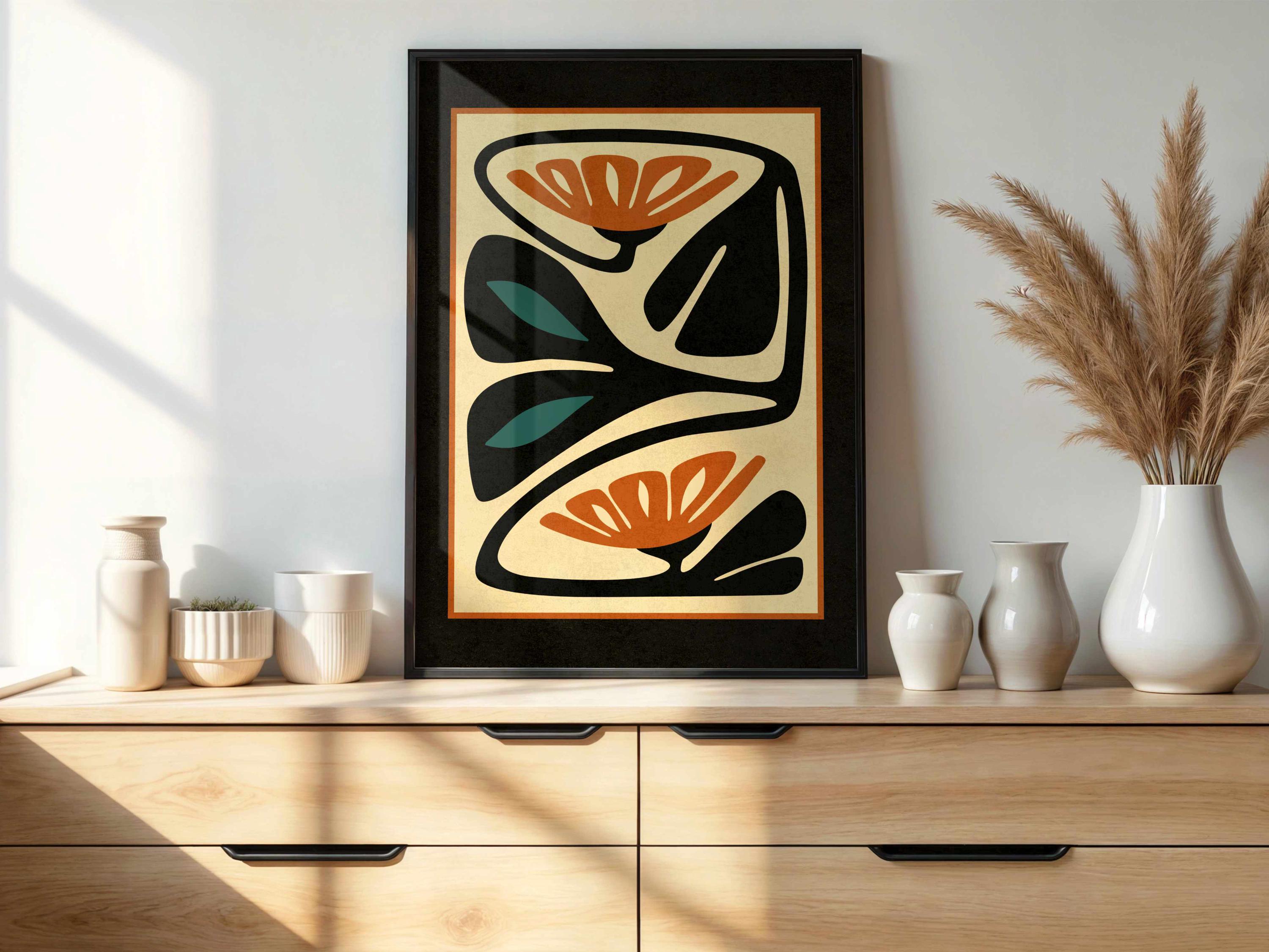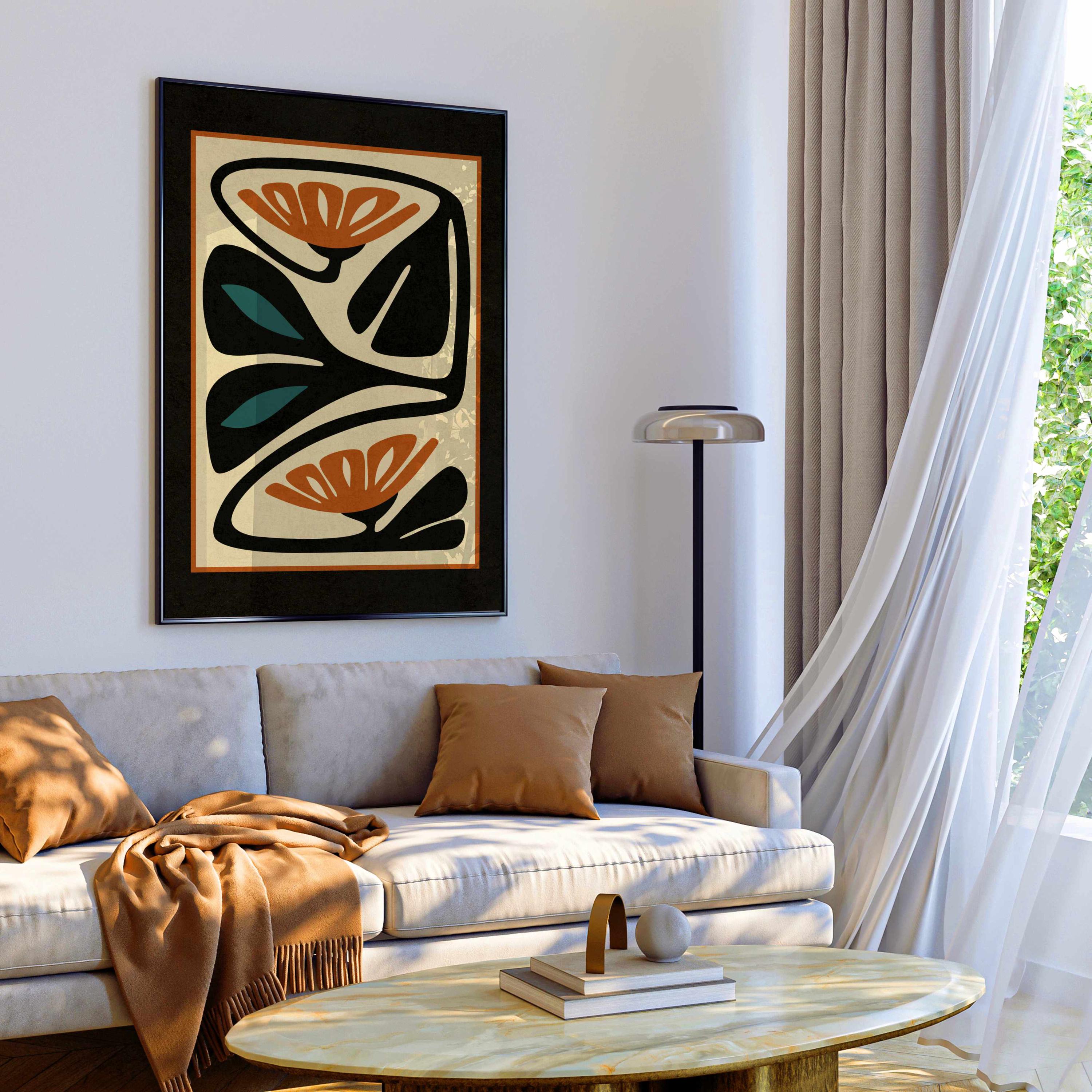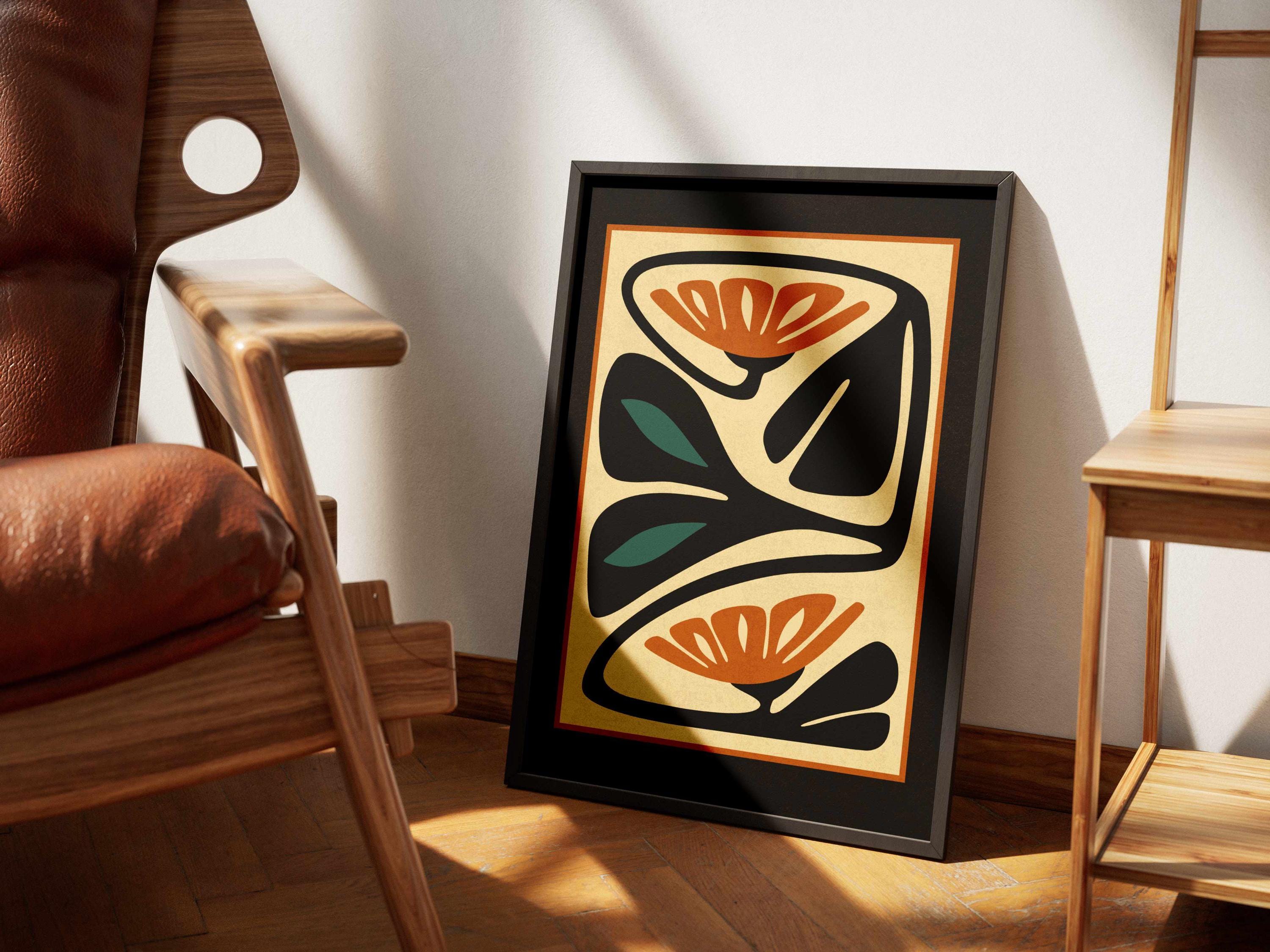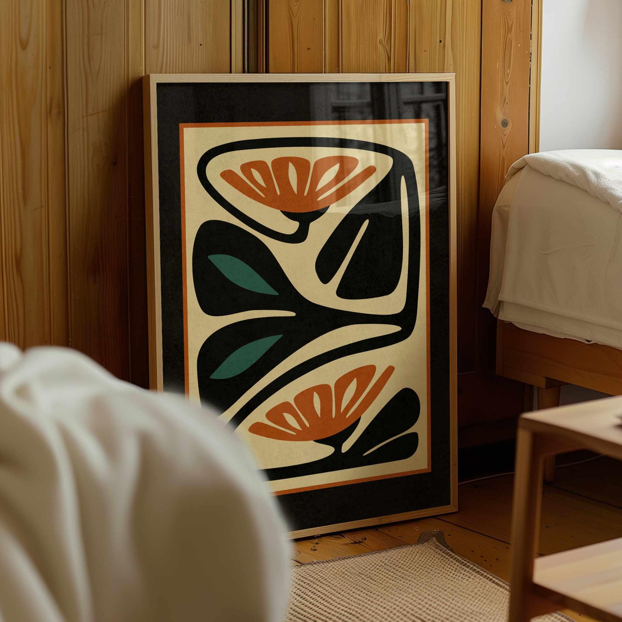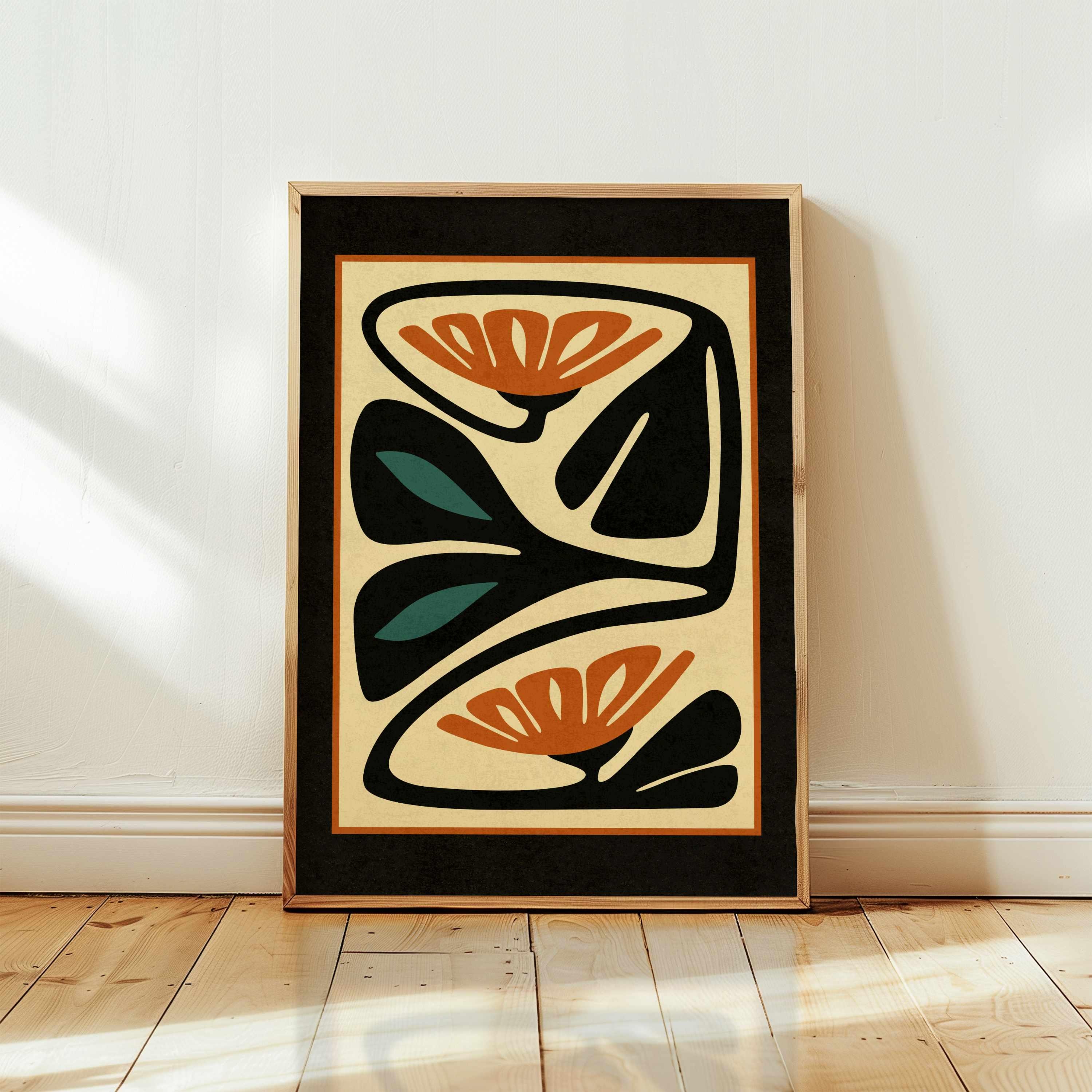 Framed abstract mid century floral print featuring stylized flowers and leaves in black, burnt orange, teal and cream color palette. This piece blends retro botanical style with mid century modern design, creating a look that’s both earthy and bold.