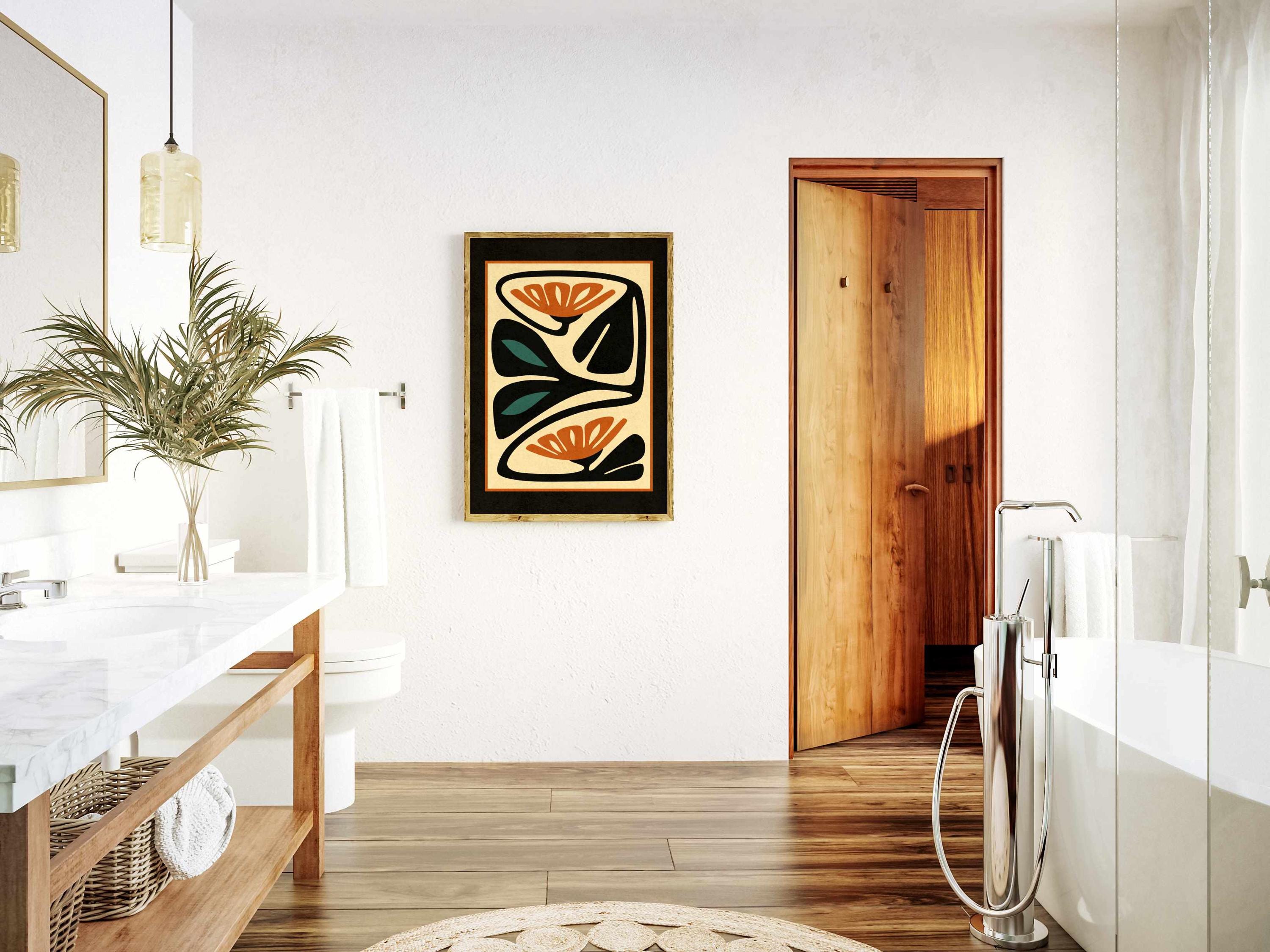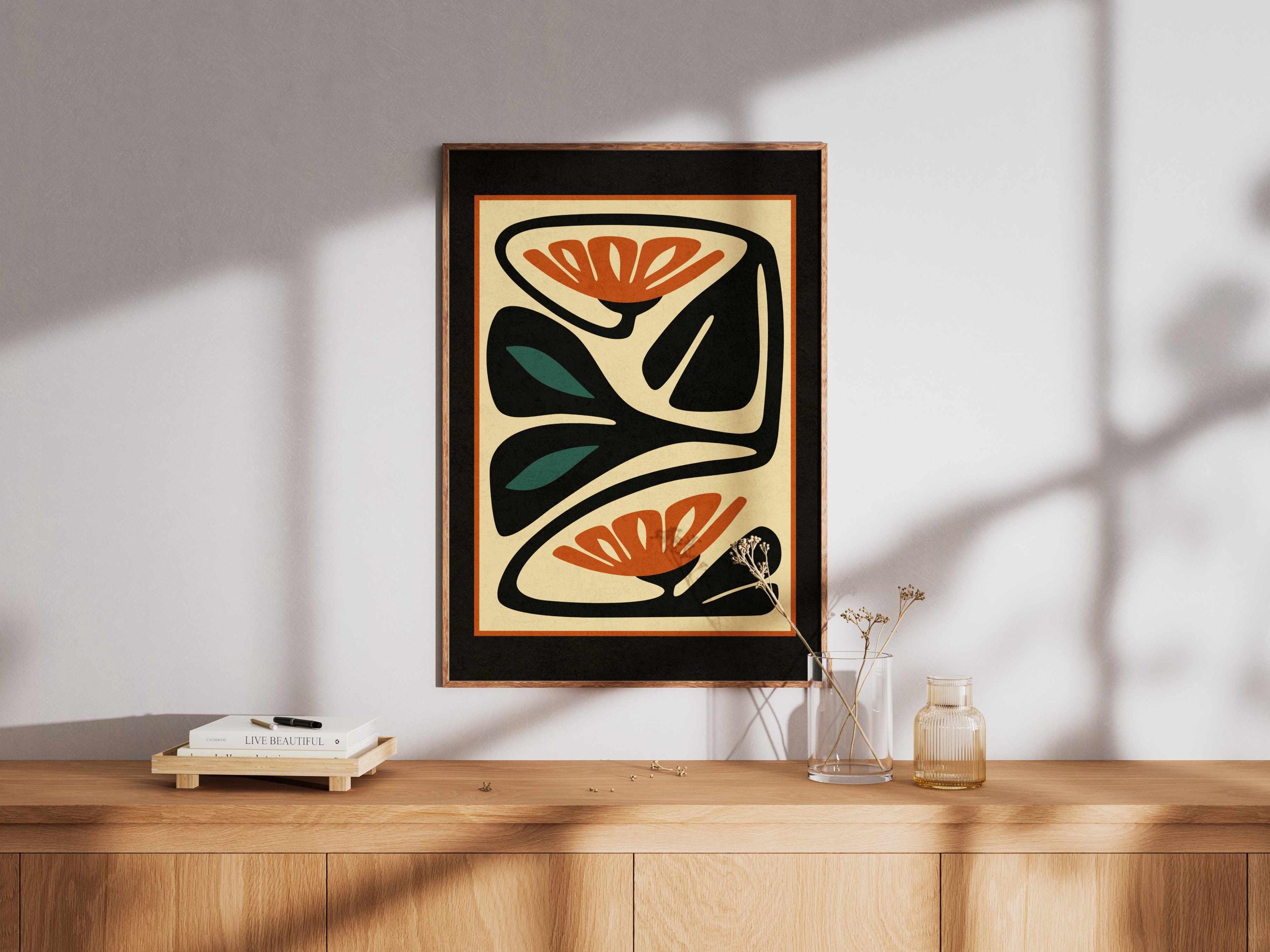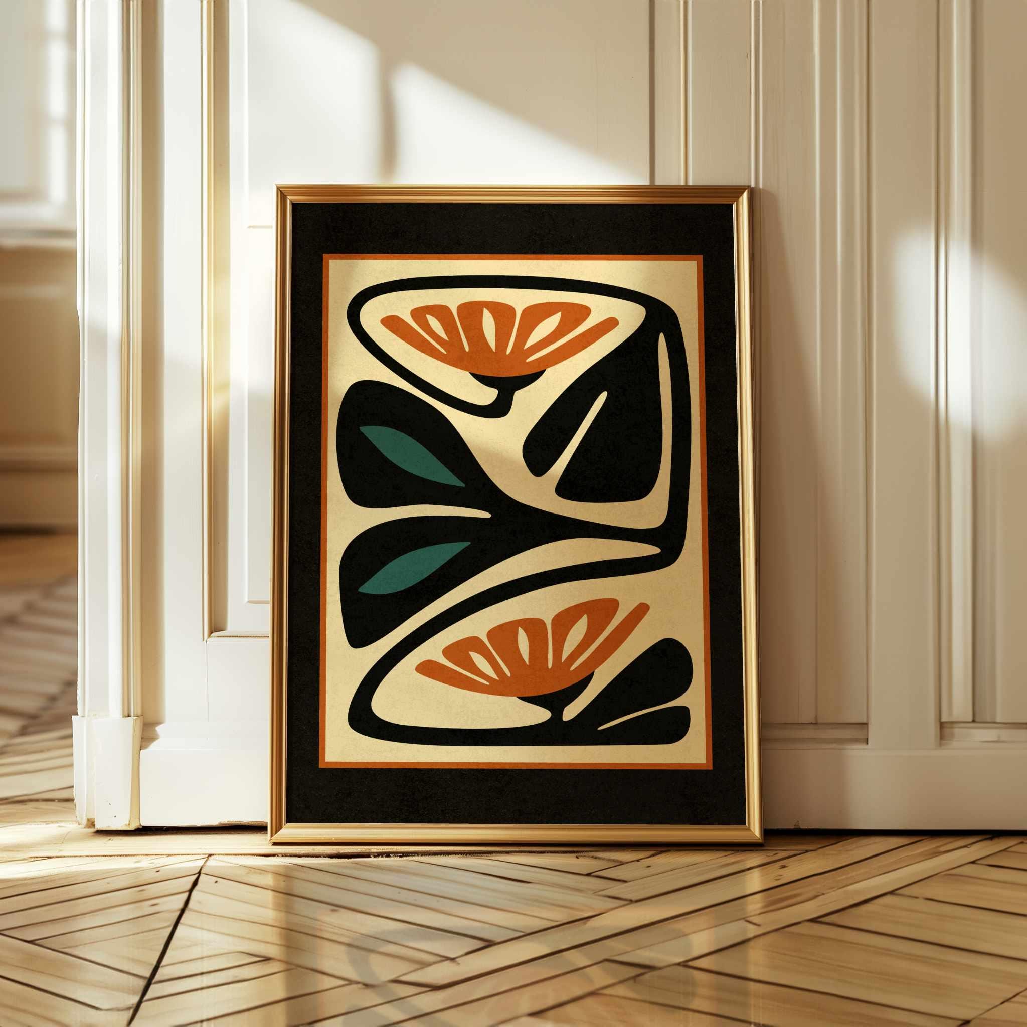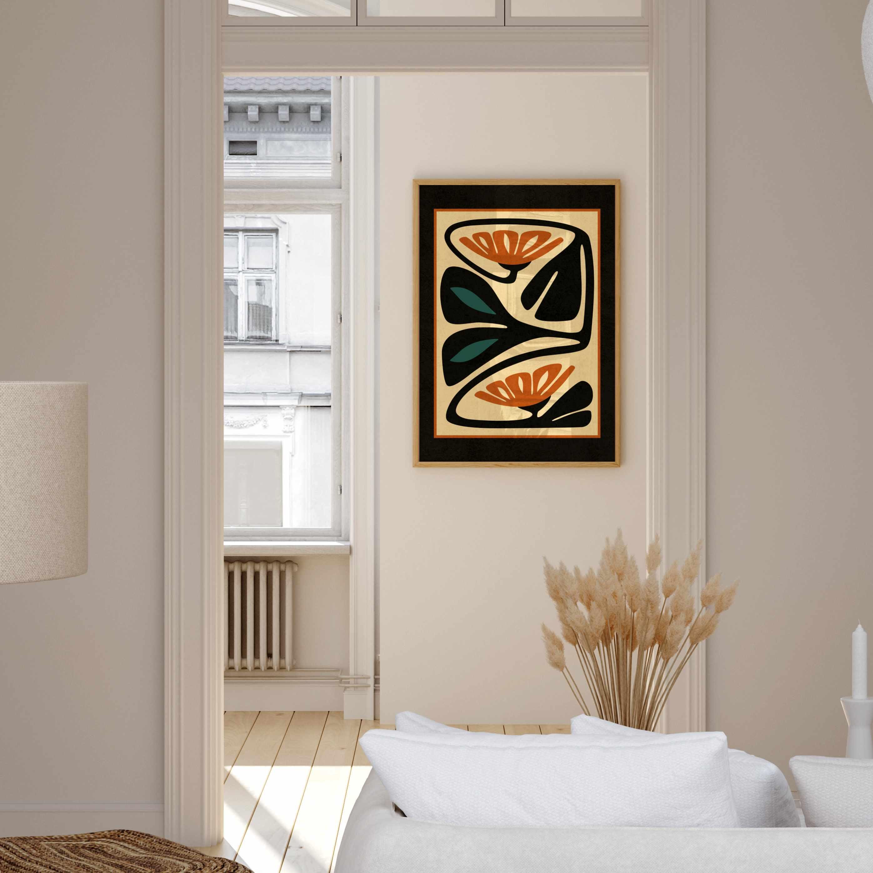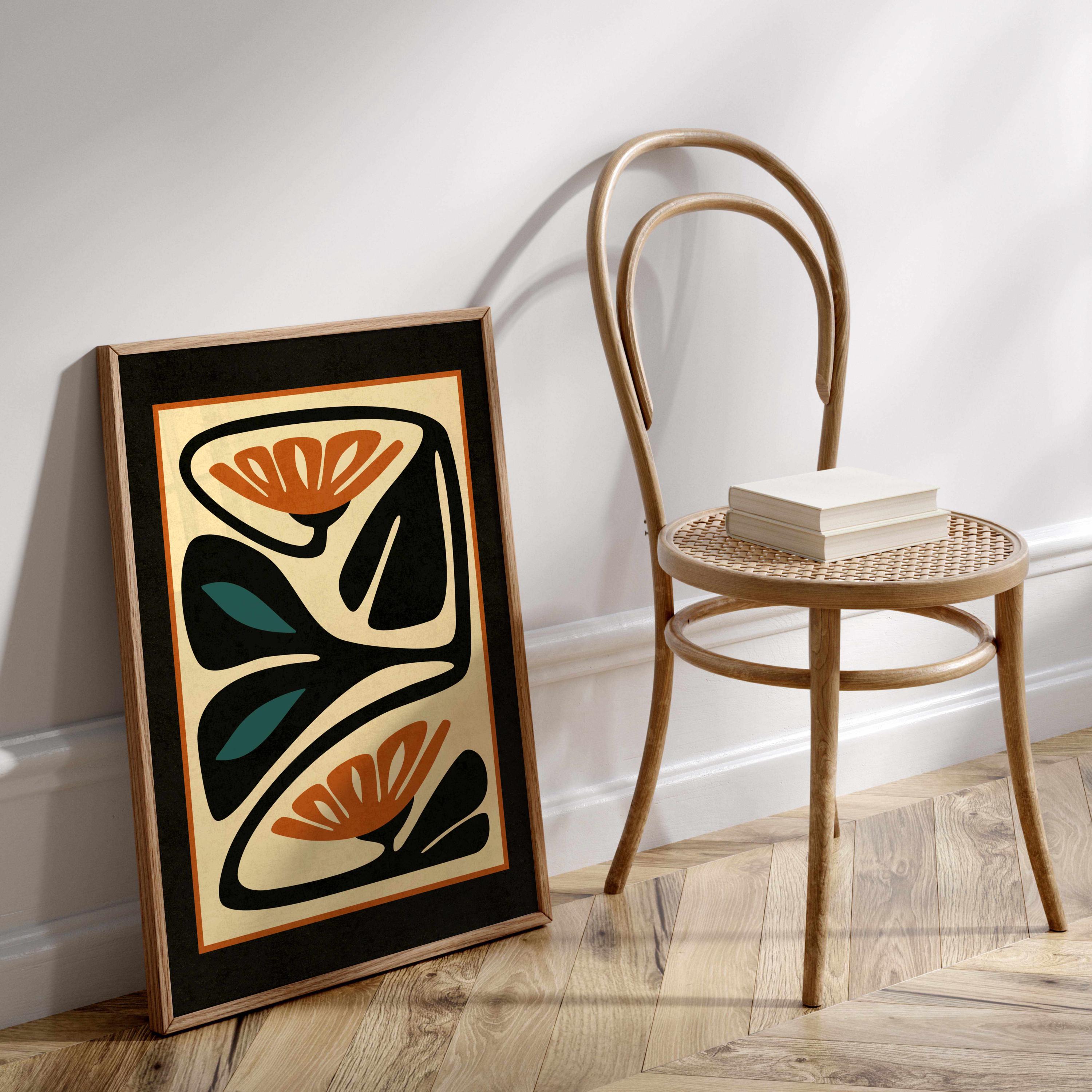 Framed abstract mid century floral print featuring stylized flowers and leaves in black, burnt orange, teal and cream color palette. This piece blends retro botanical style with mid century modern design, creating a look that’s both earthy and bold.