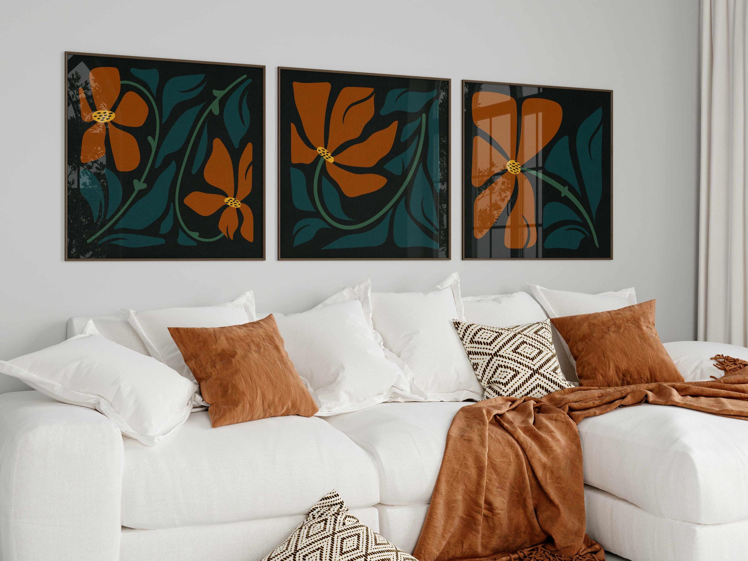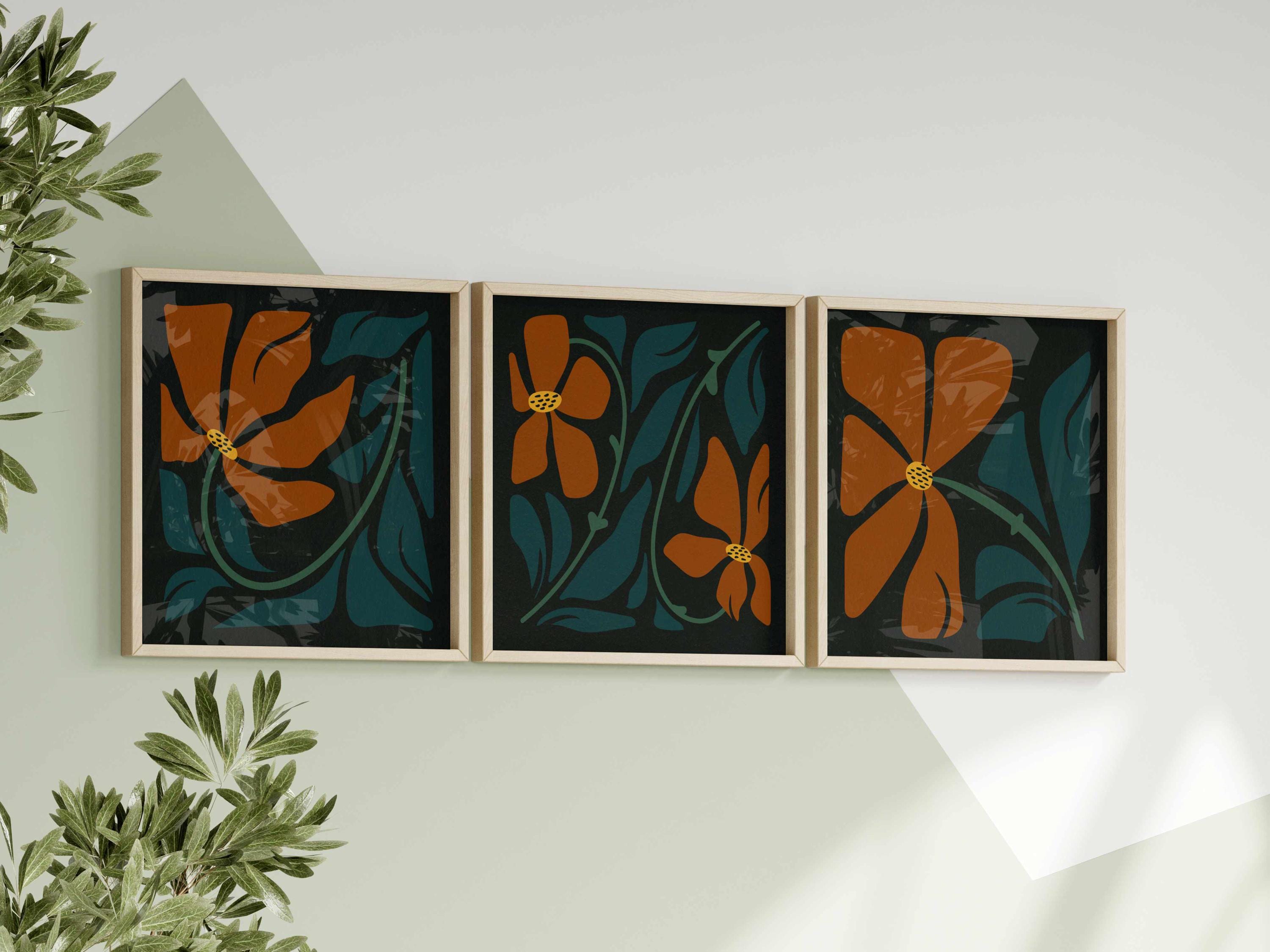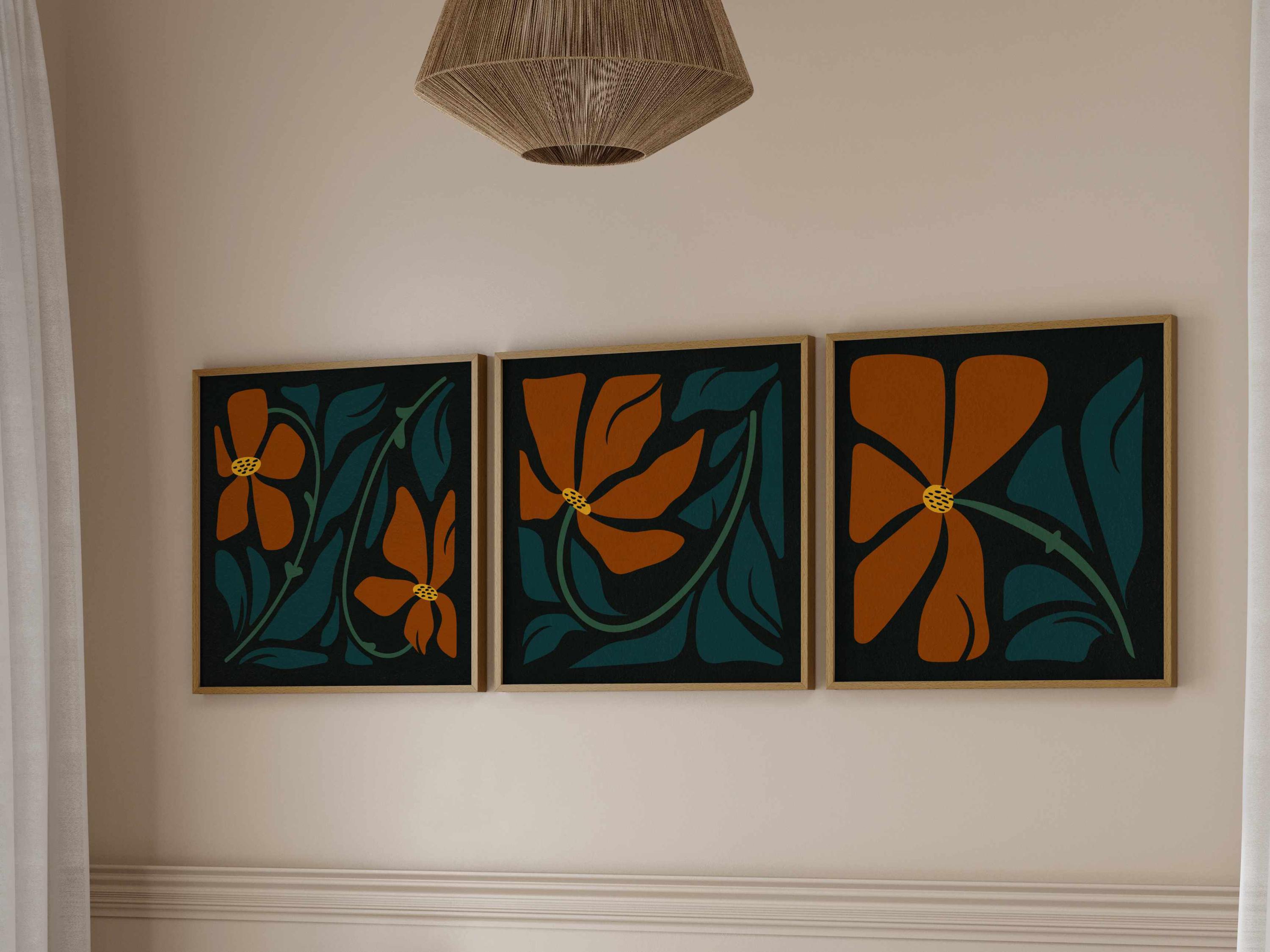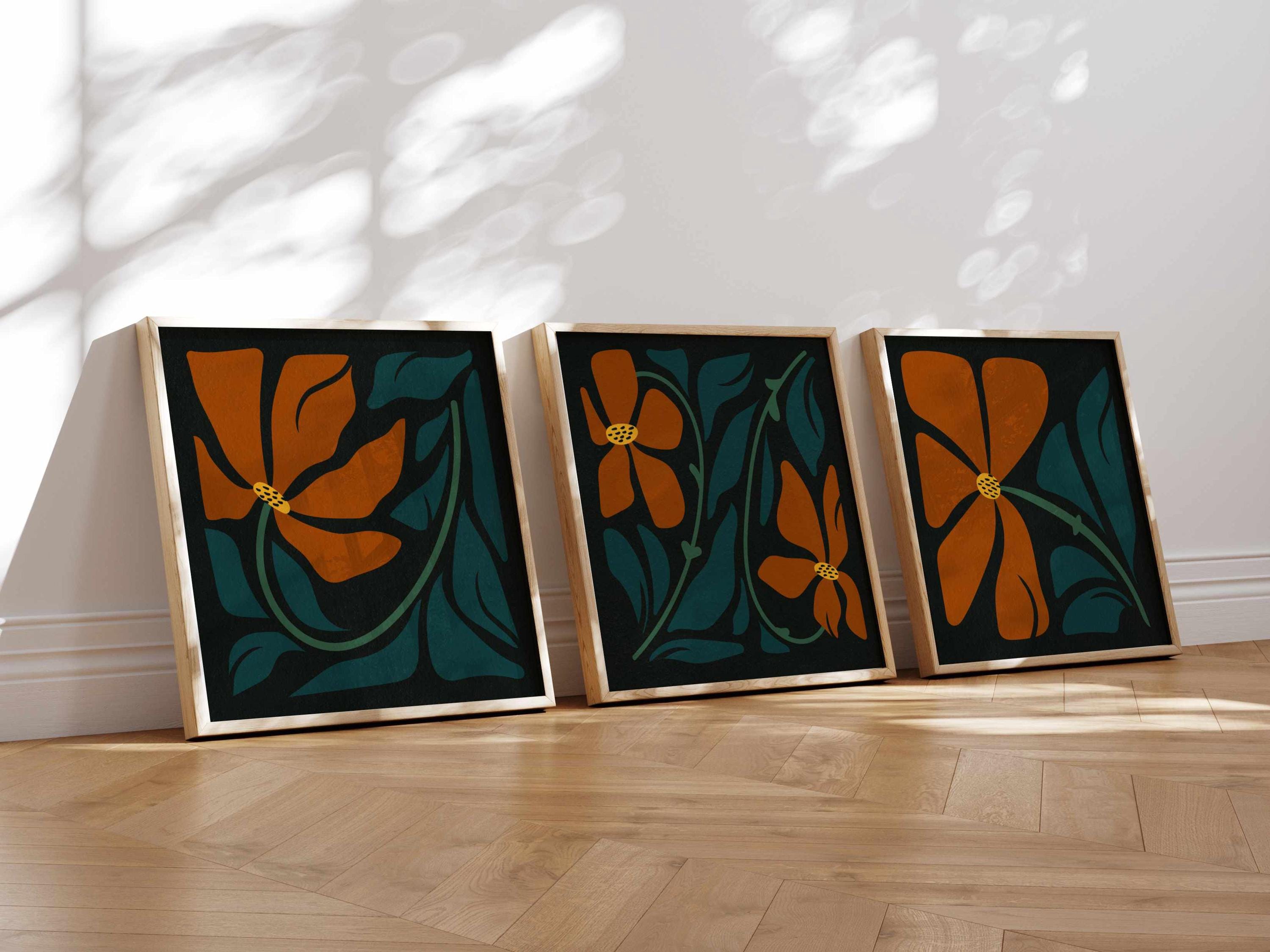 Abstract retro floral wall art set inspired by Matisse flower shapes and groovy 70s design. This botanical trio features burnt orange blooms and deep teal leaves layered over a dark background.