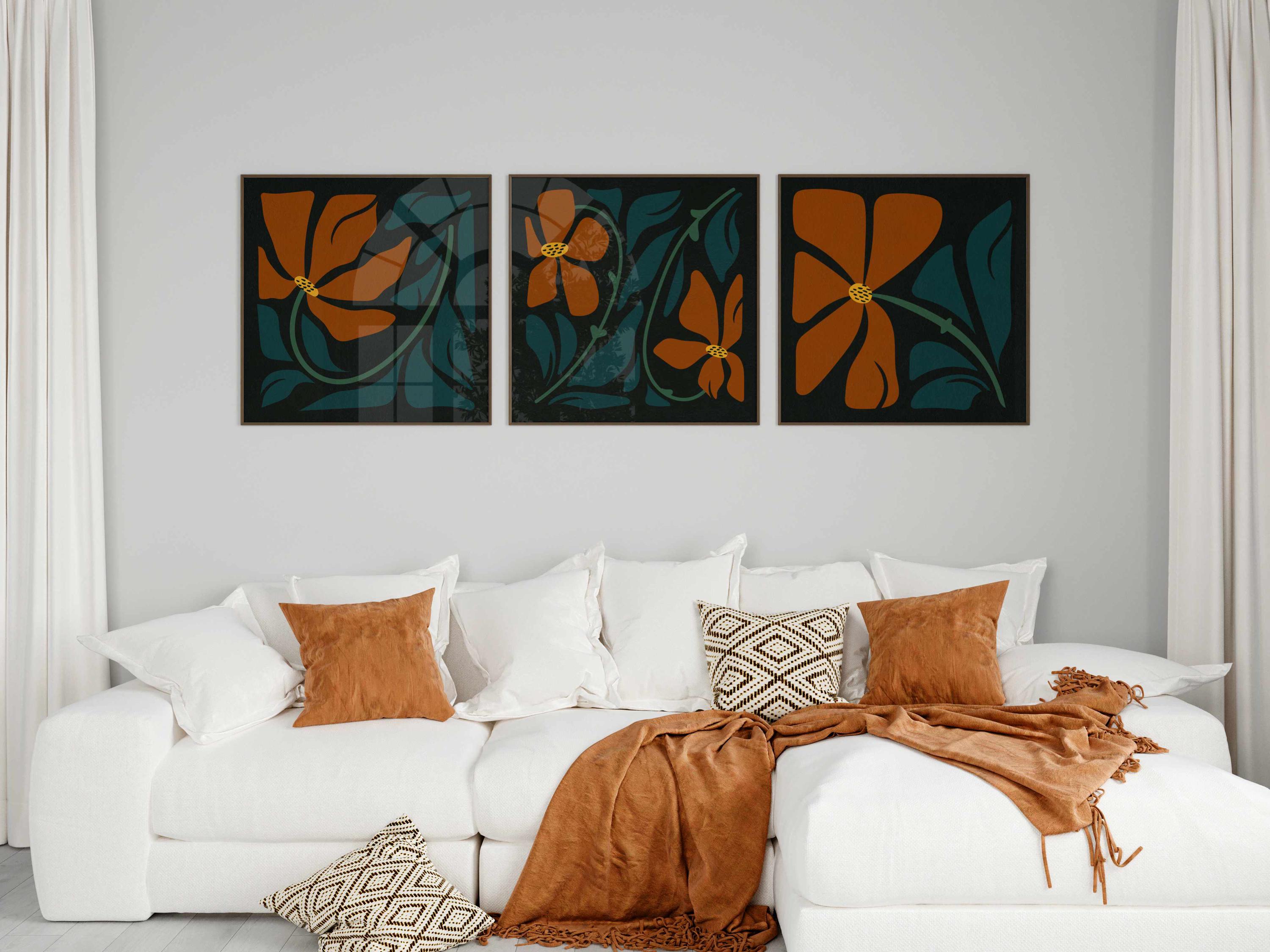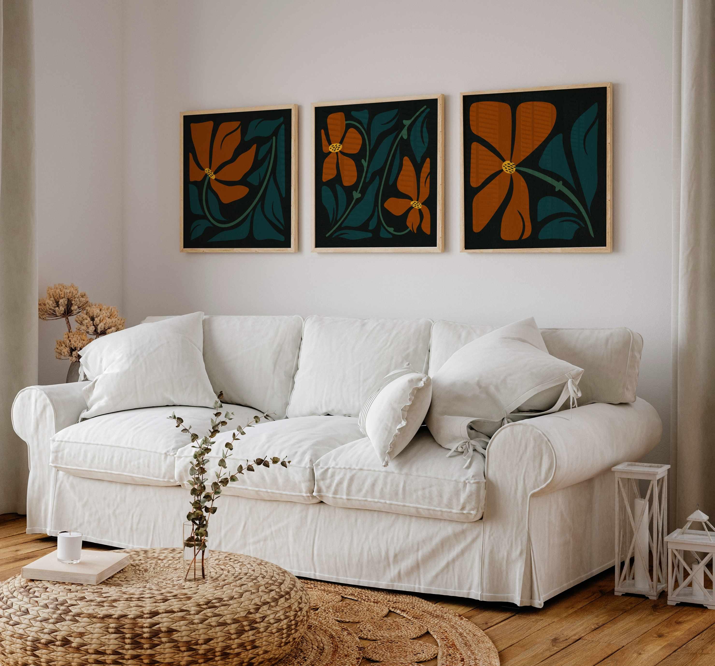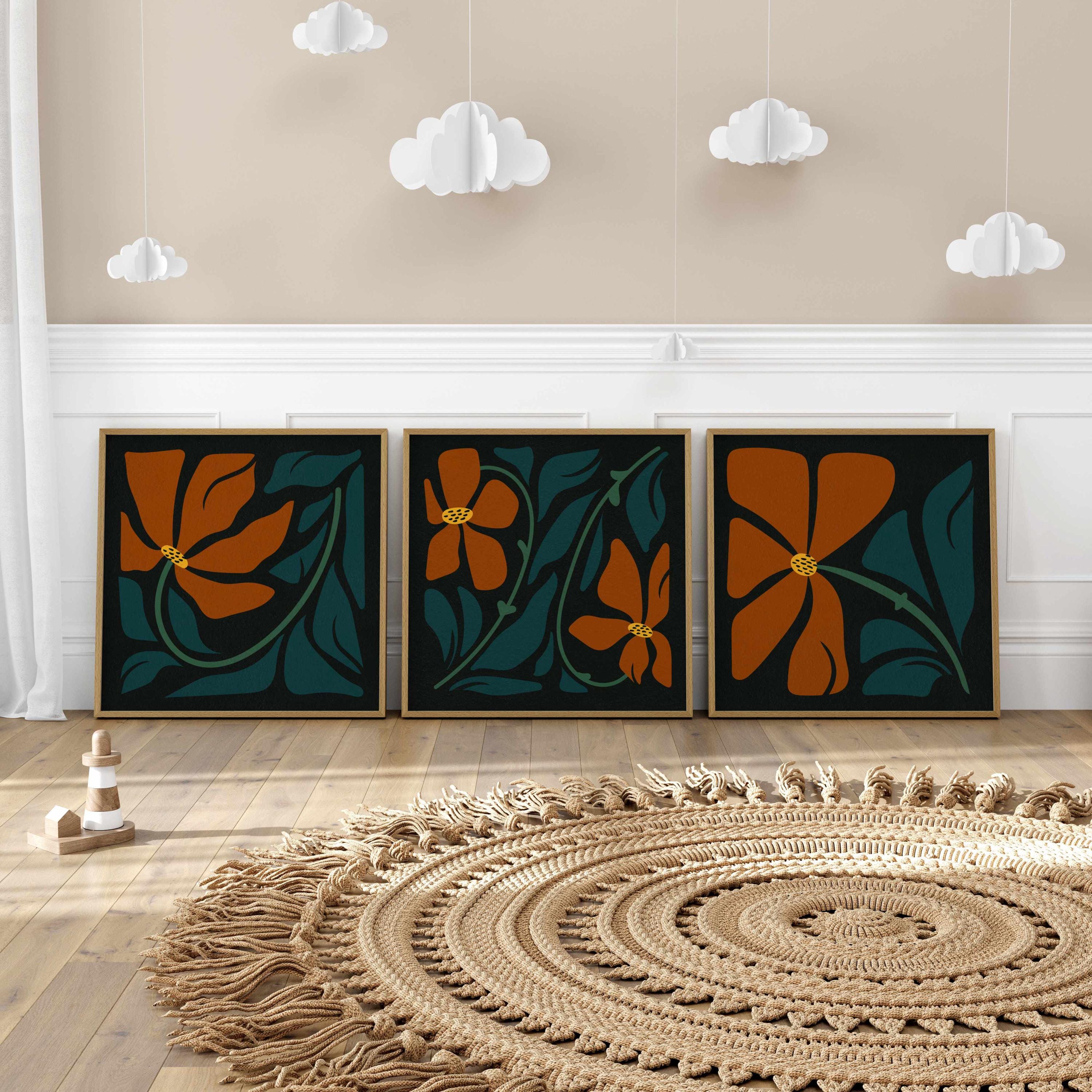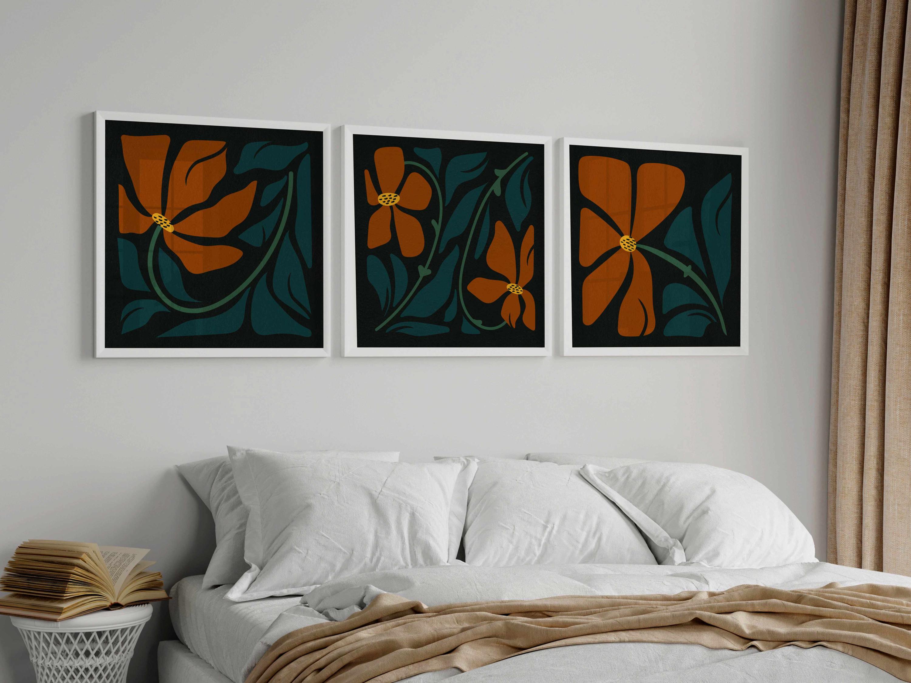 Abstract retro floral wall art set inspired by Matisse flower shapes and groovy 70s design. This botanical trio features burnt orange blooms and deep teal leaves layered over a dark background.
