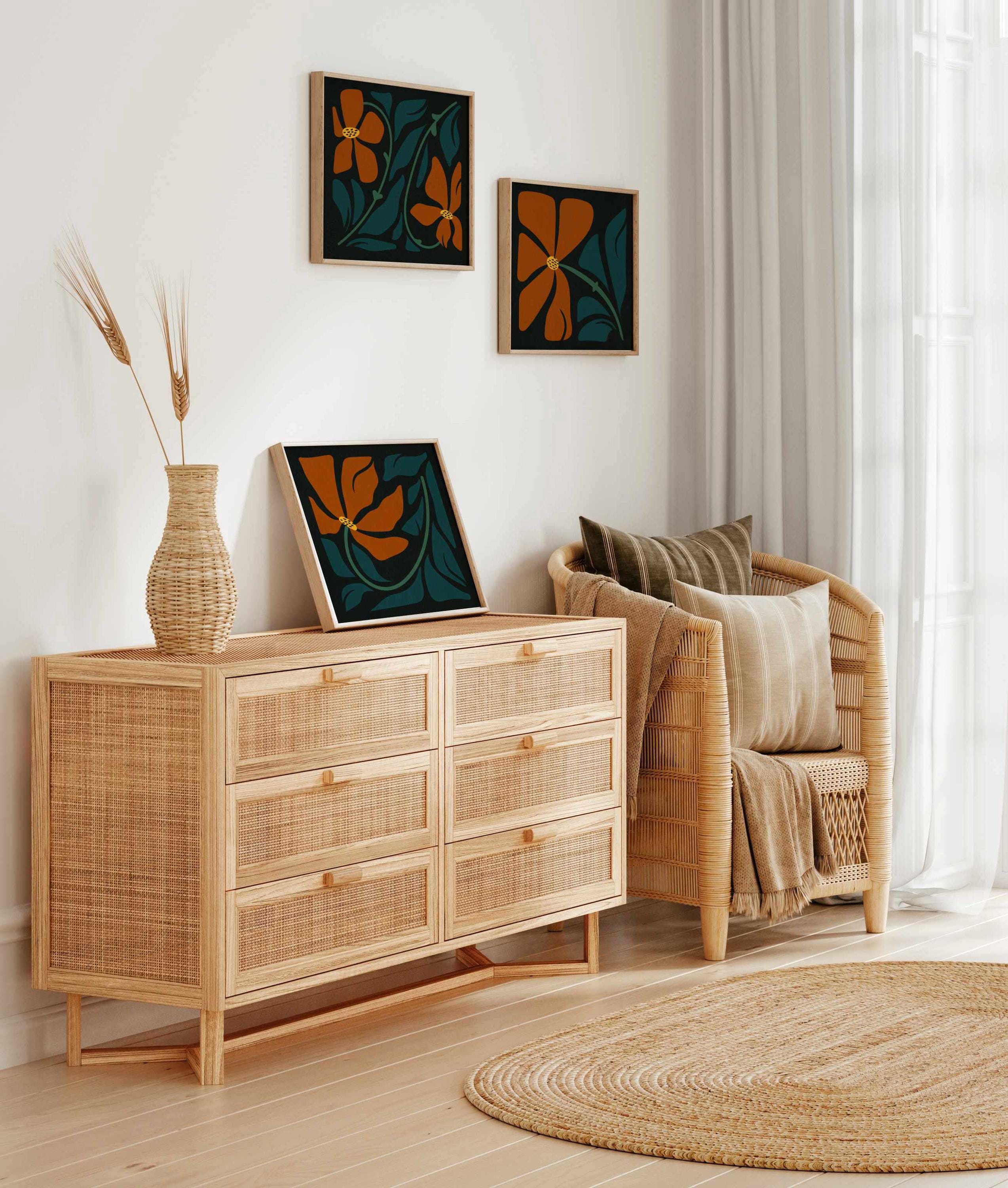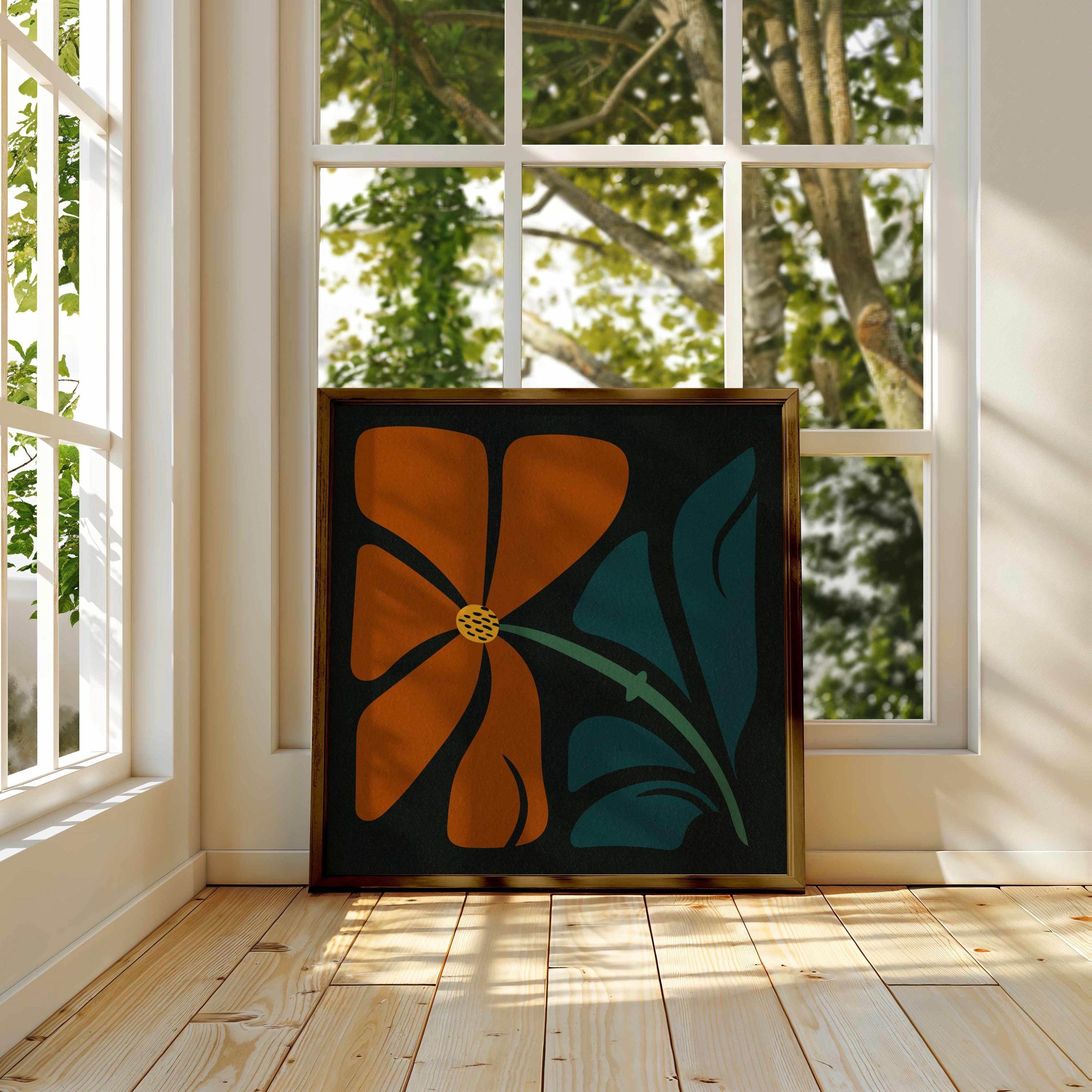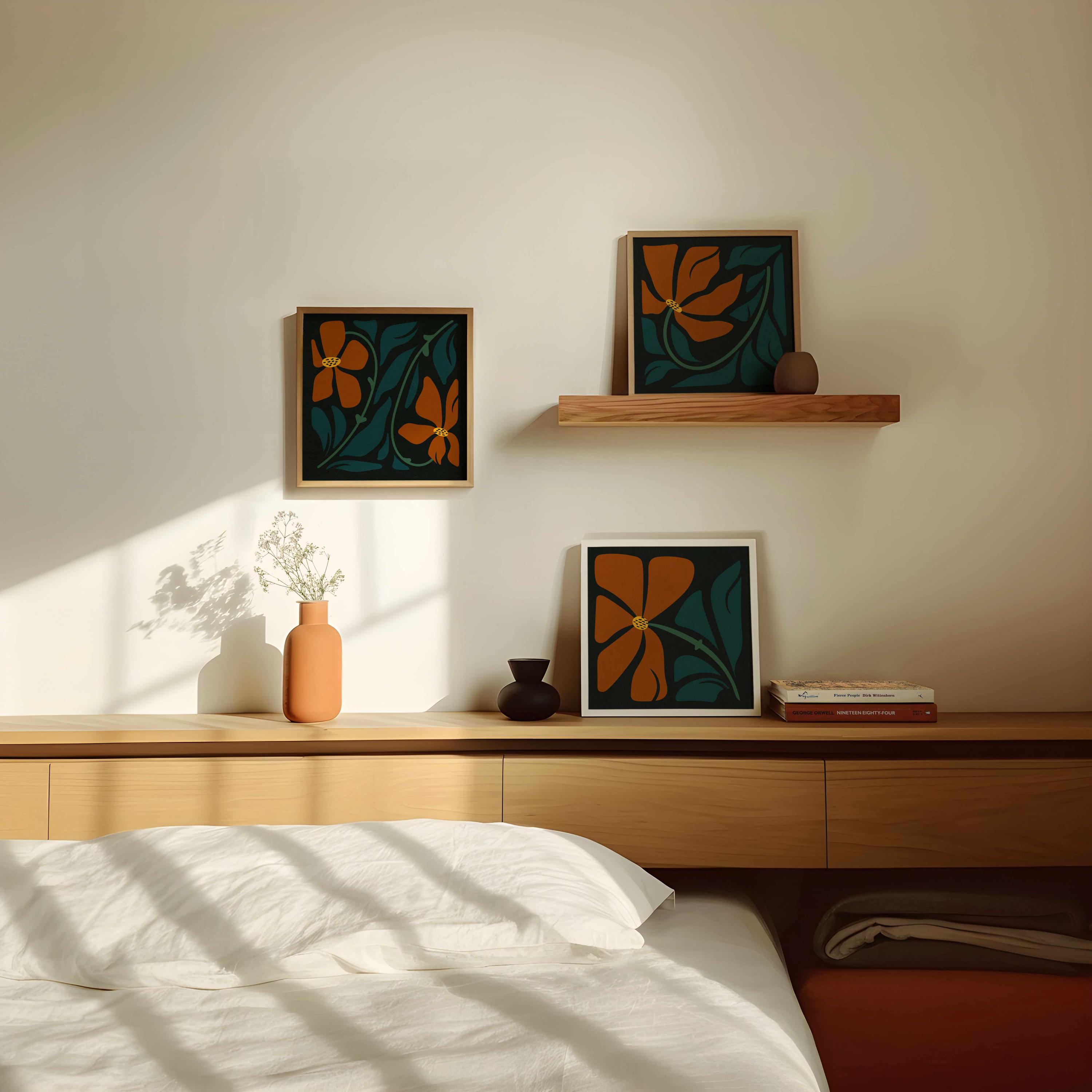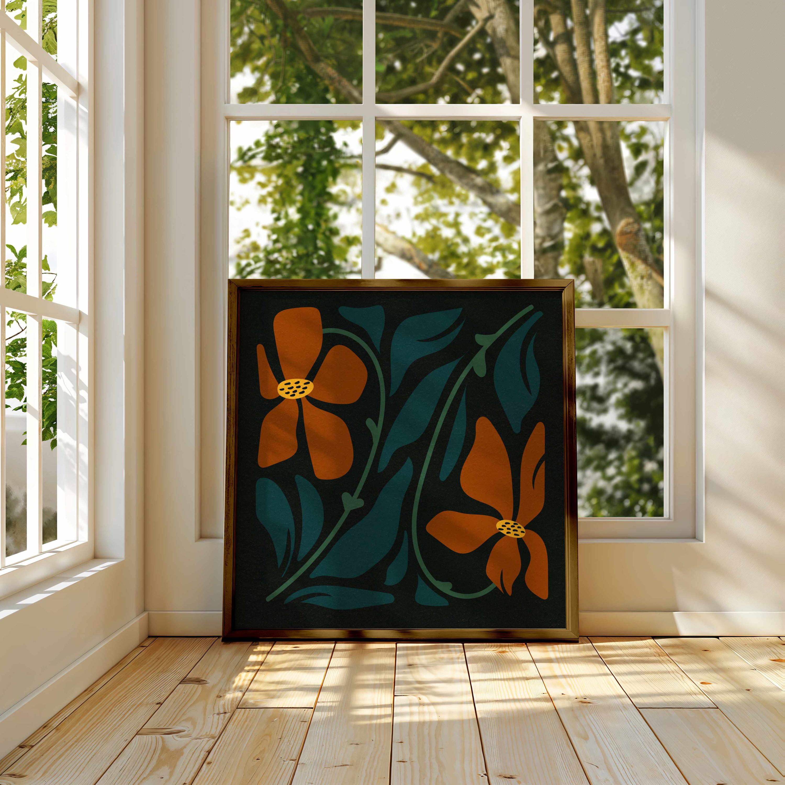 Abstract retro floral wall art set inspired by Matisse flower shapes and groovy 70s design. This botanical trio features burnt orange blooms and deep teal leaves layered over a dark background.