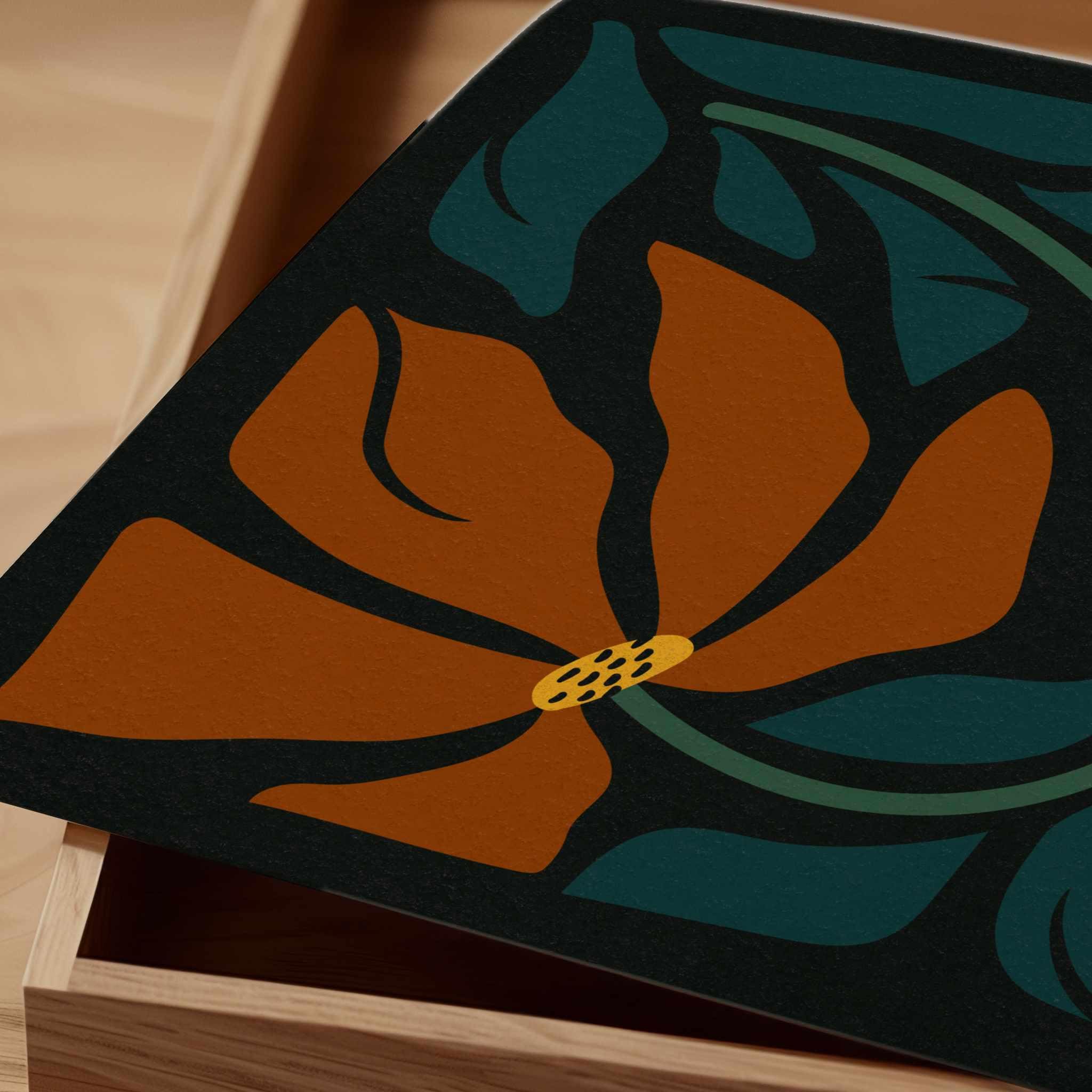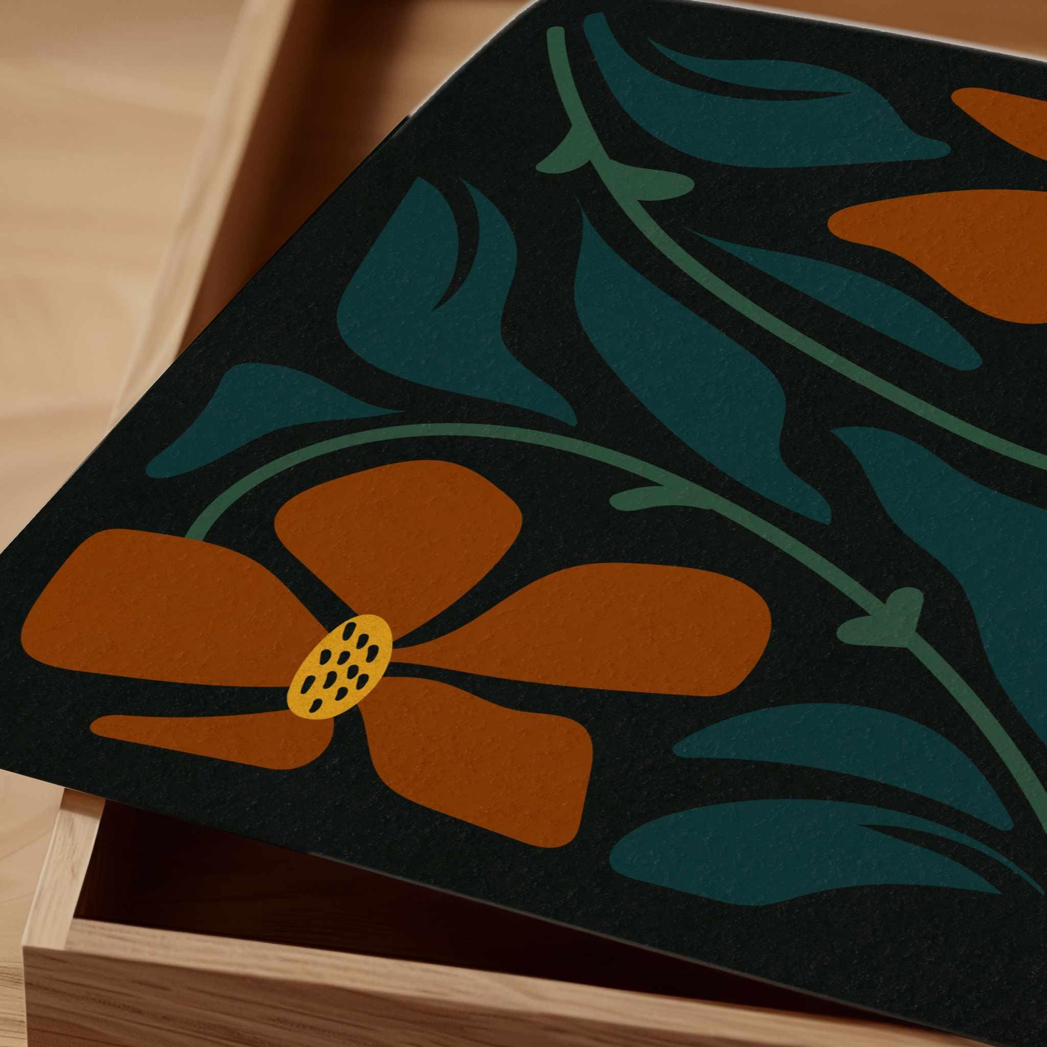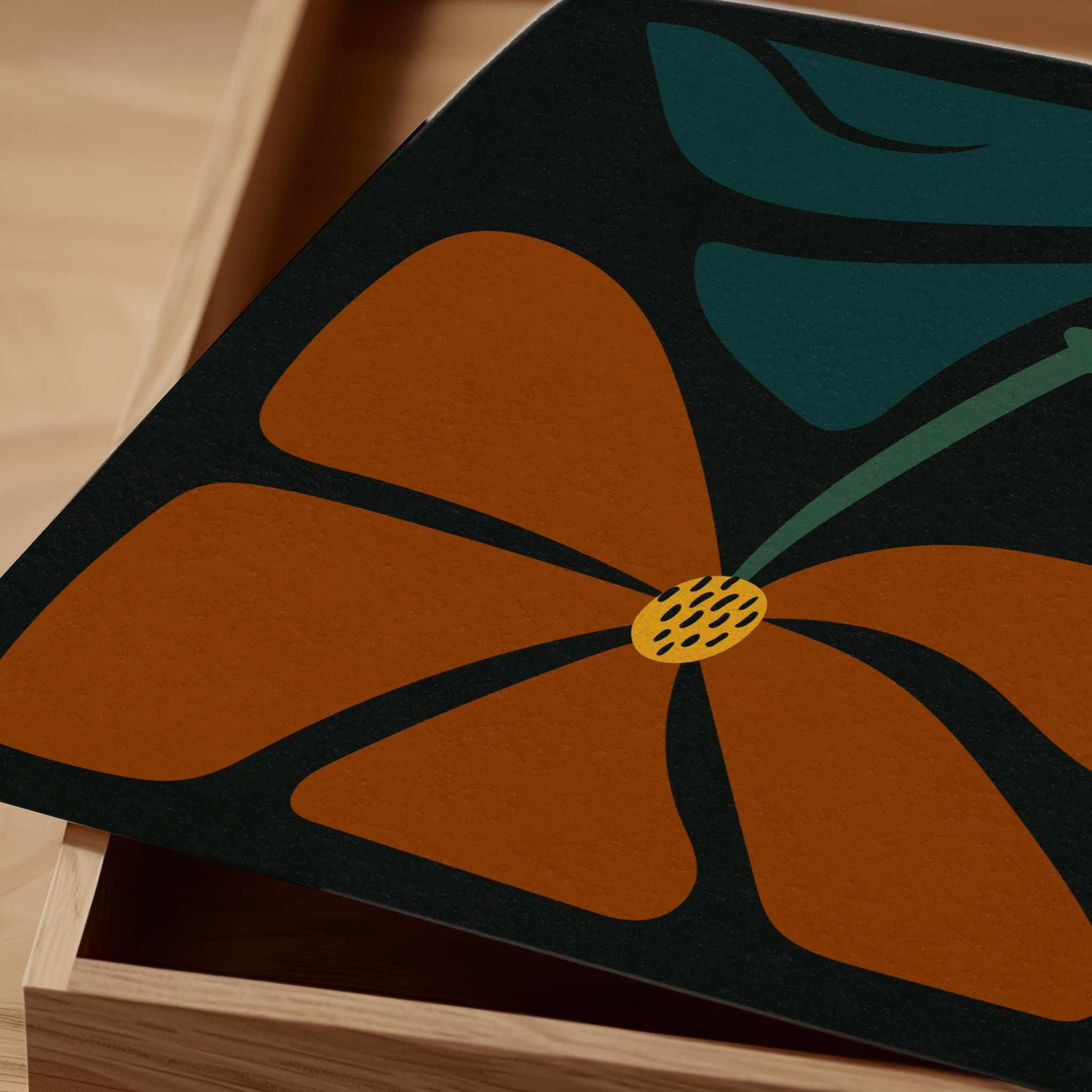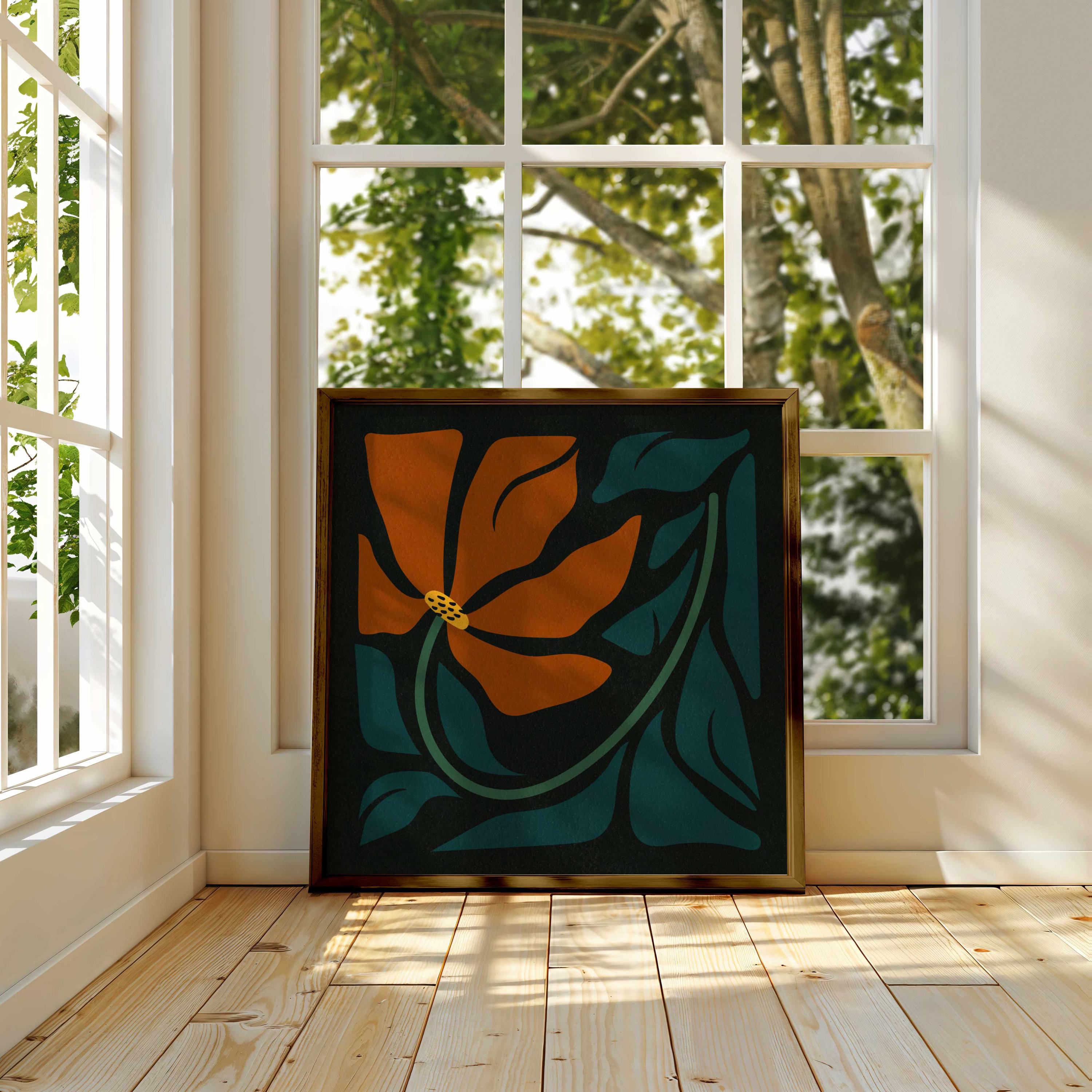 Abstract retro floral wall art set inspired by Matisse flower shapes and groovy 70s design. This botanical trio features burnt orange blooms and deep teal leaves layered over a dark background.