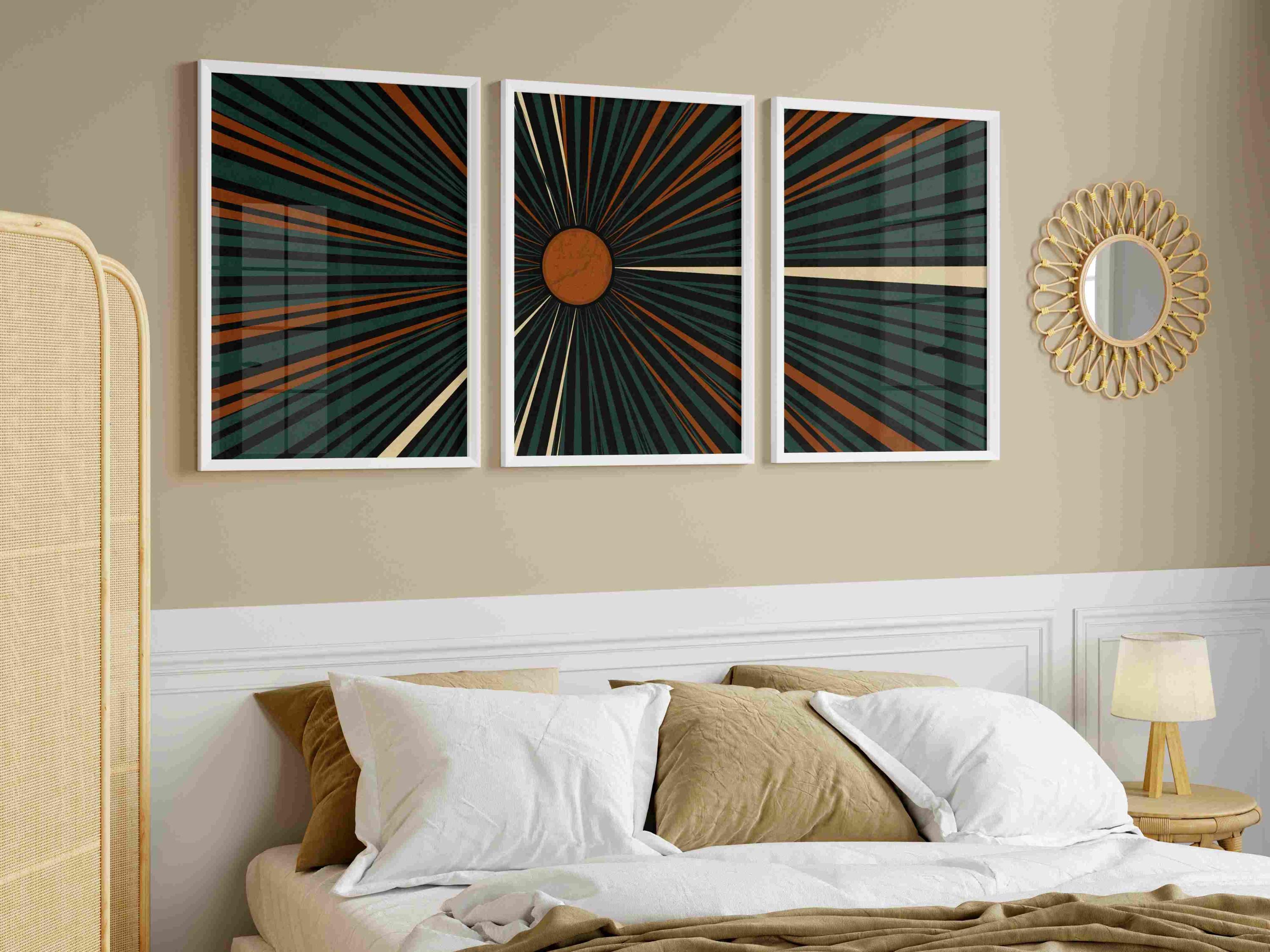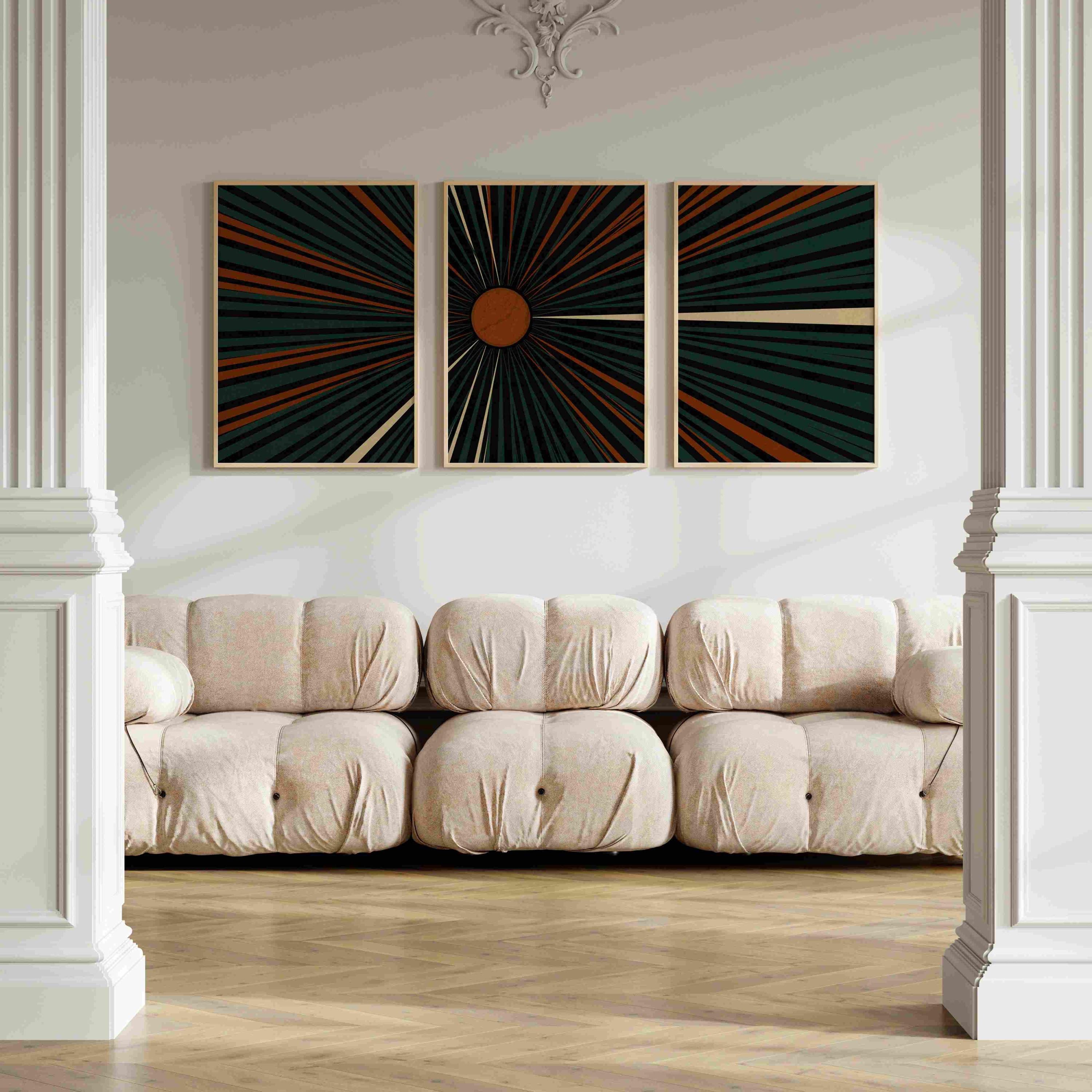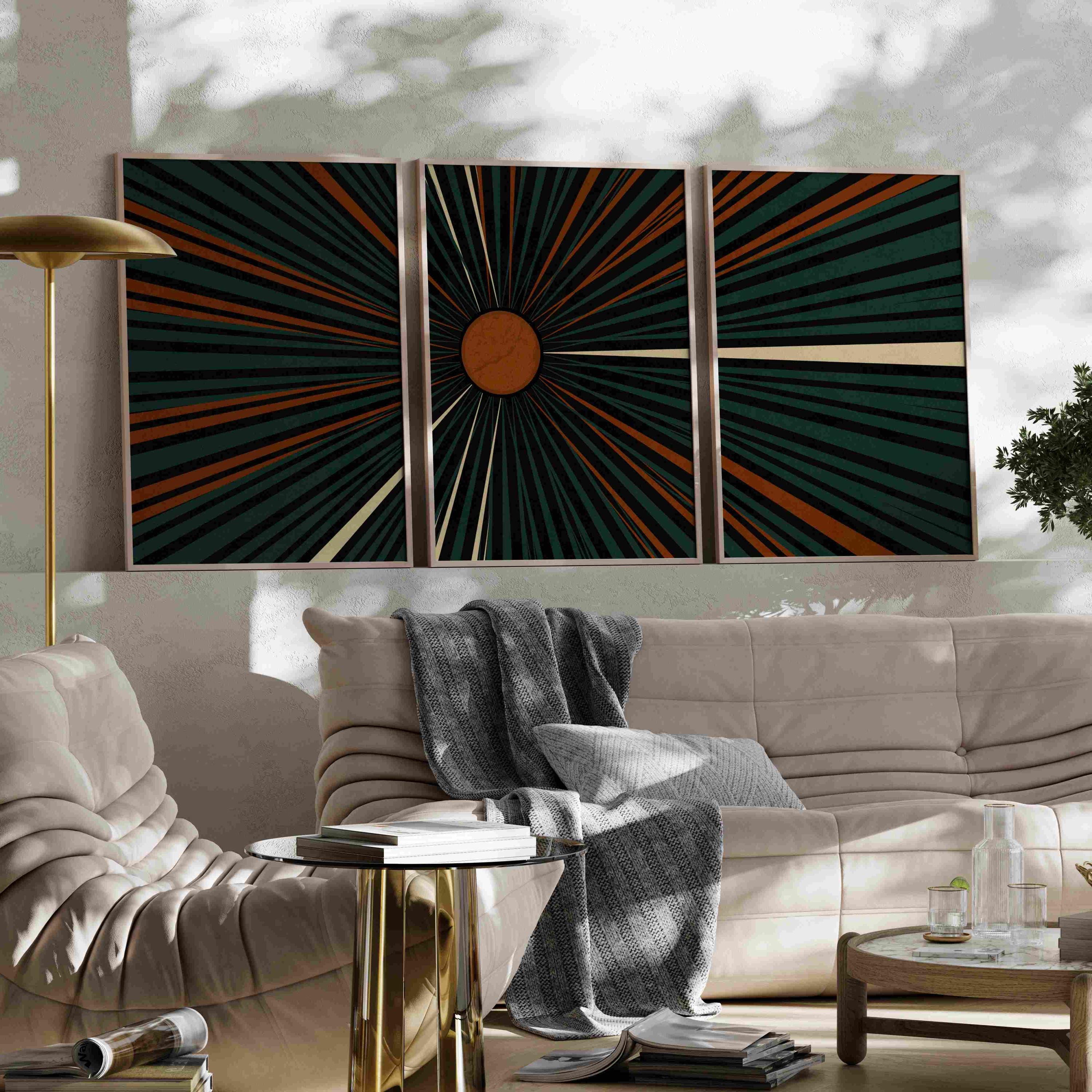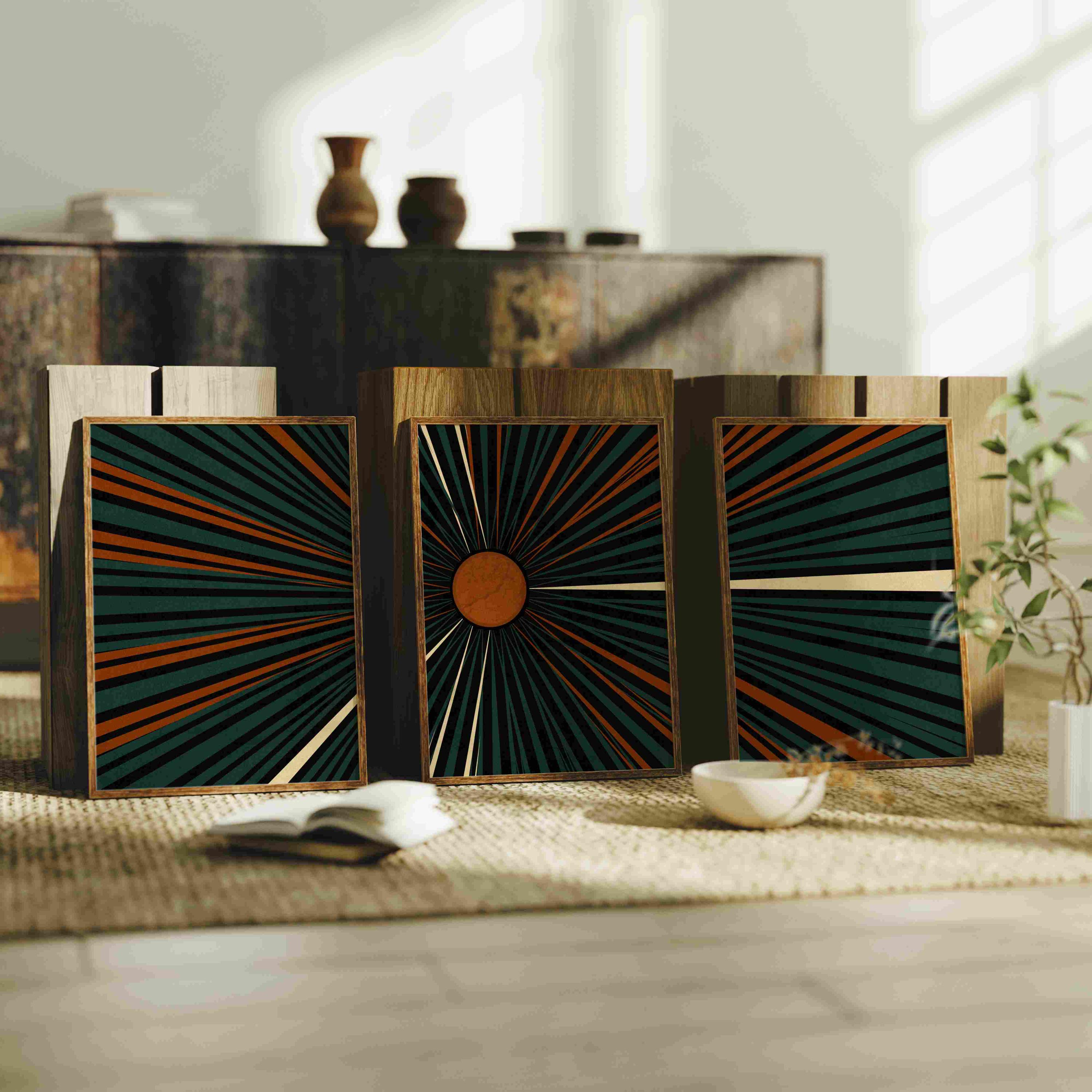 Mid century modern set of three prints featuring graphic linework and abstract geometric shapes in a deep teal, burnt orange, cream and black color palette. This abstract print set is designed to be displayed as a triptych, creating a captivating focal point on your wall.
