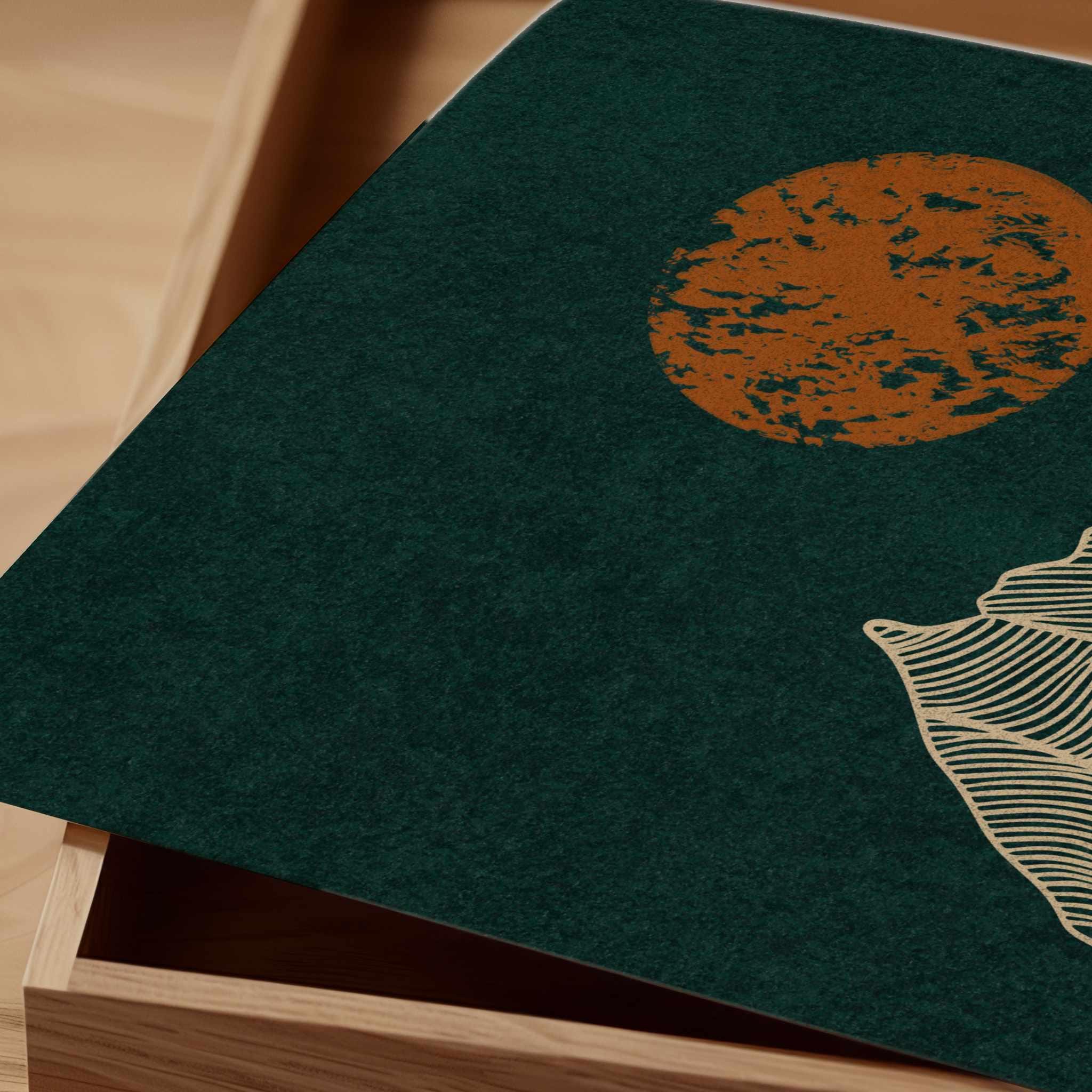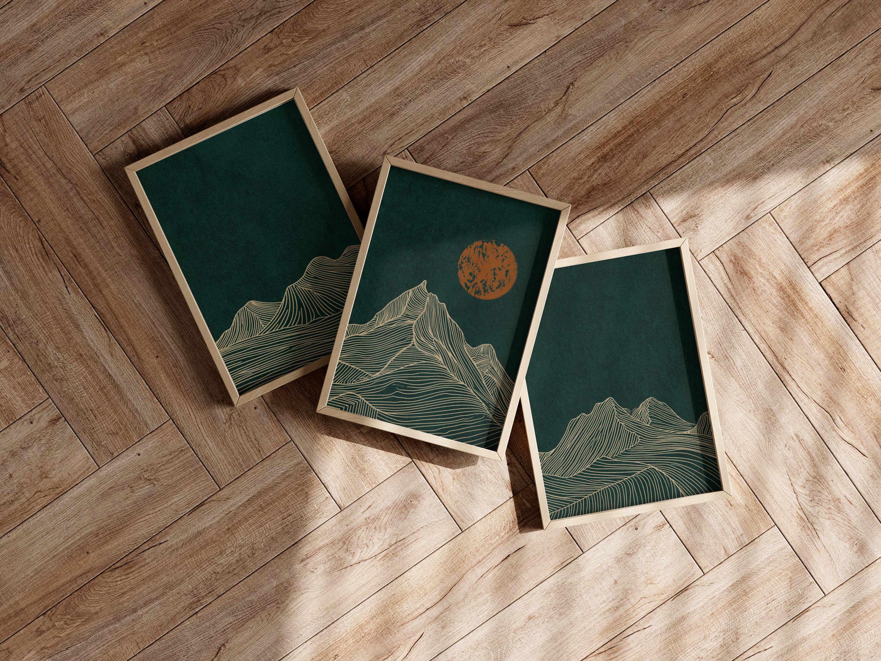 Mountain wall art set featuring a minimalist night landscape with full moon in a deep emerald green, burnt orange and light beige color palette. This abstract nature set is designed to be displayed as a triptych, creating a stunning focal point on your wall.