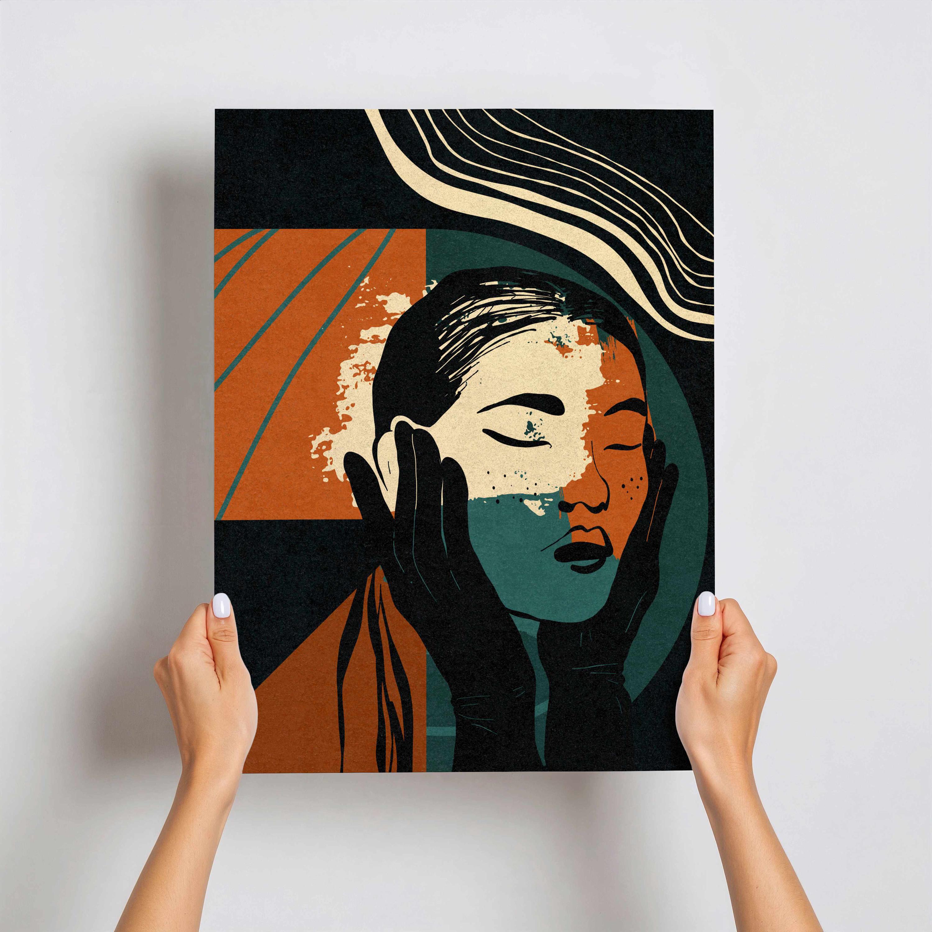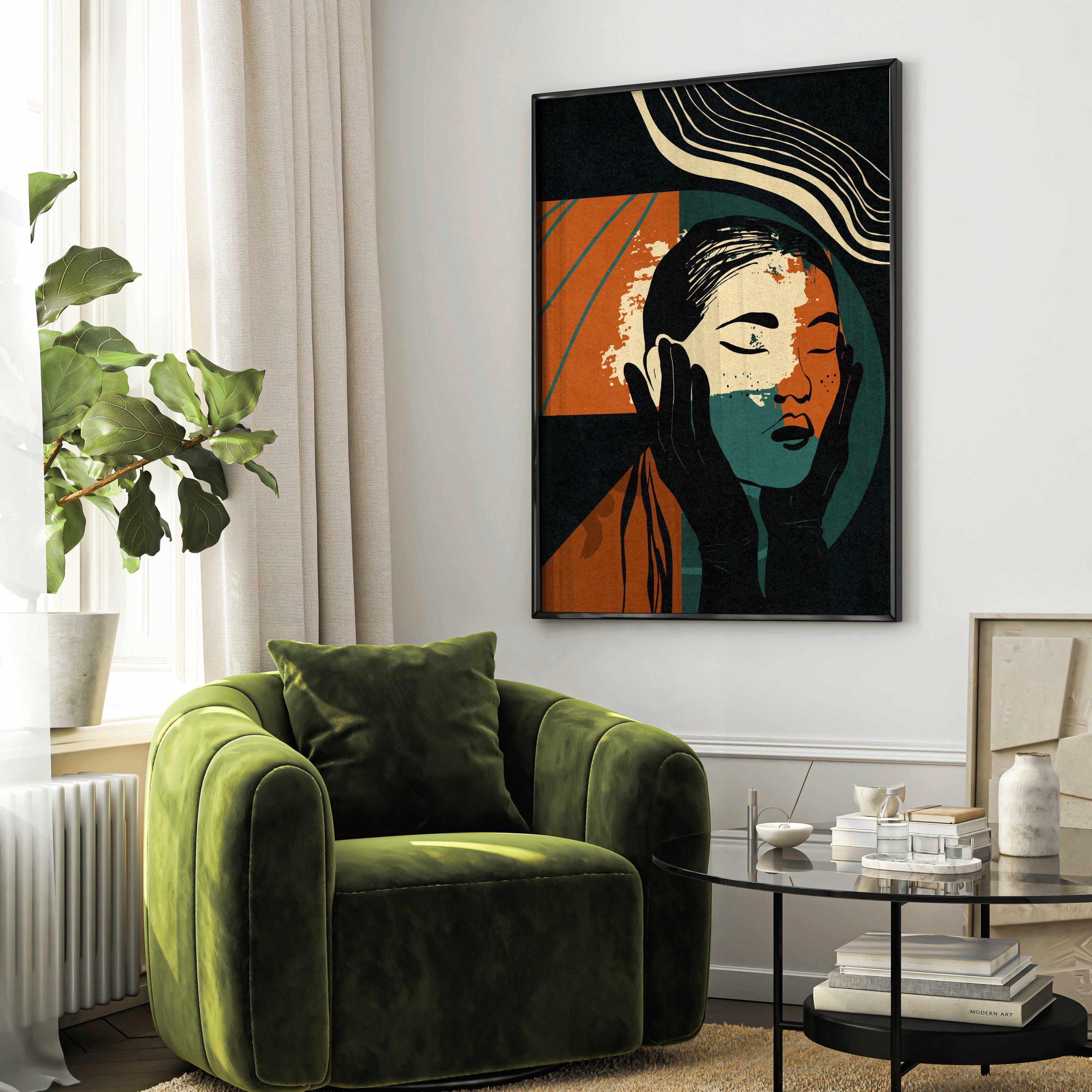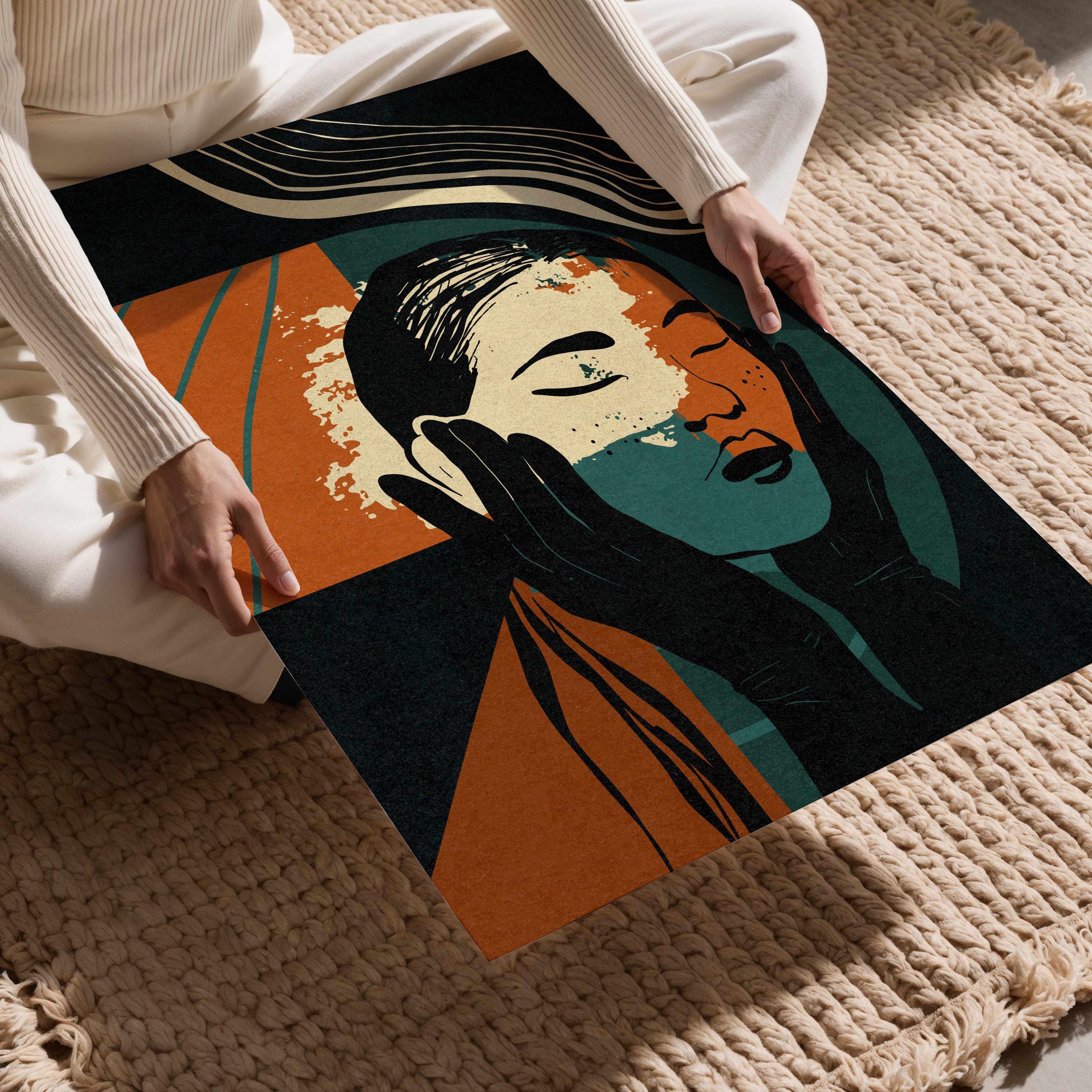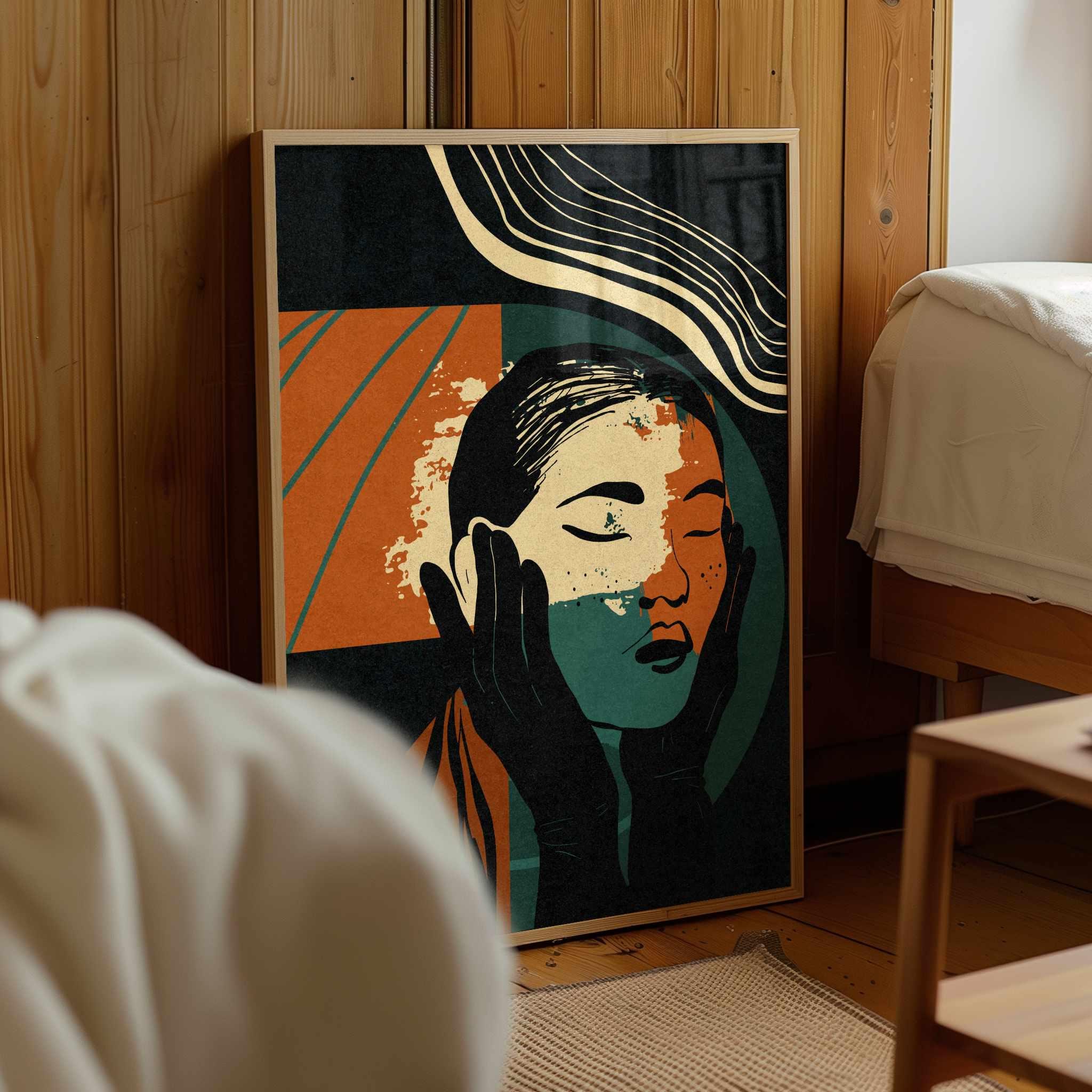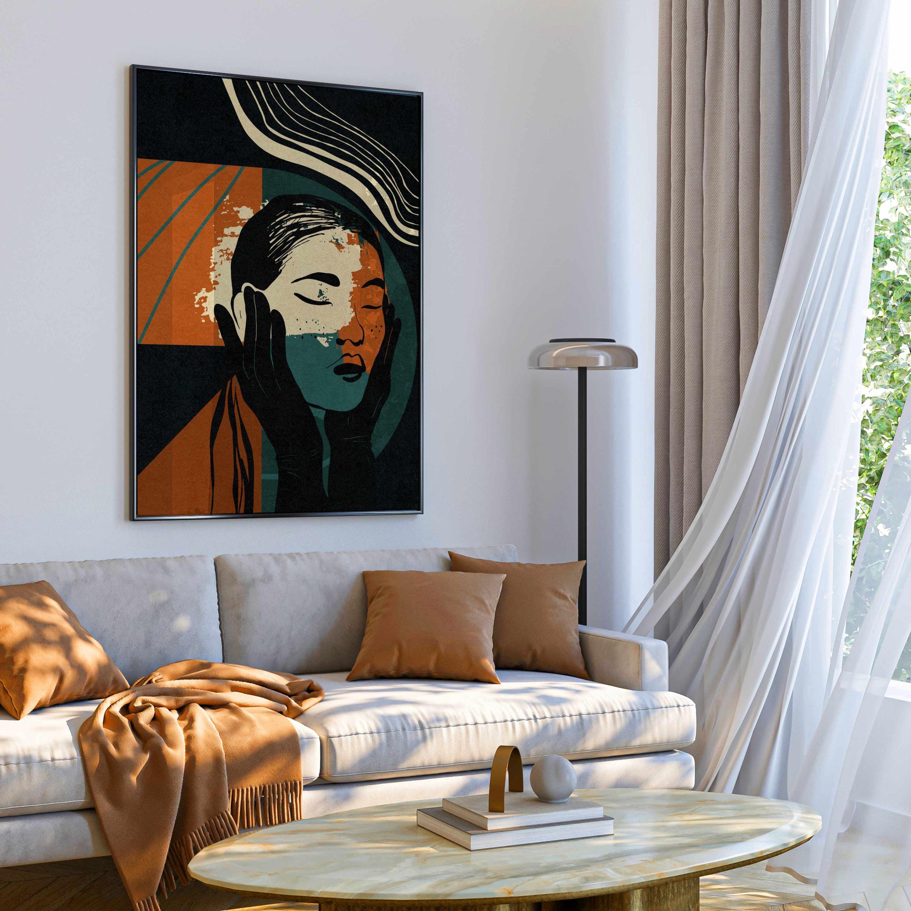 Abstract woman portrait art print in black, burnt orange, cream and teal color palette. This modern minimalist print is perfect for mid century, contemporary or eclectic interiors. Whether styled in a gallery wall or as a focal point in a bedroom or living space, this piece adds elegance and depth without clutter.