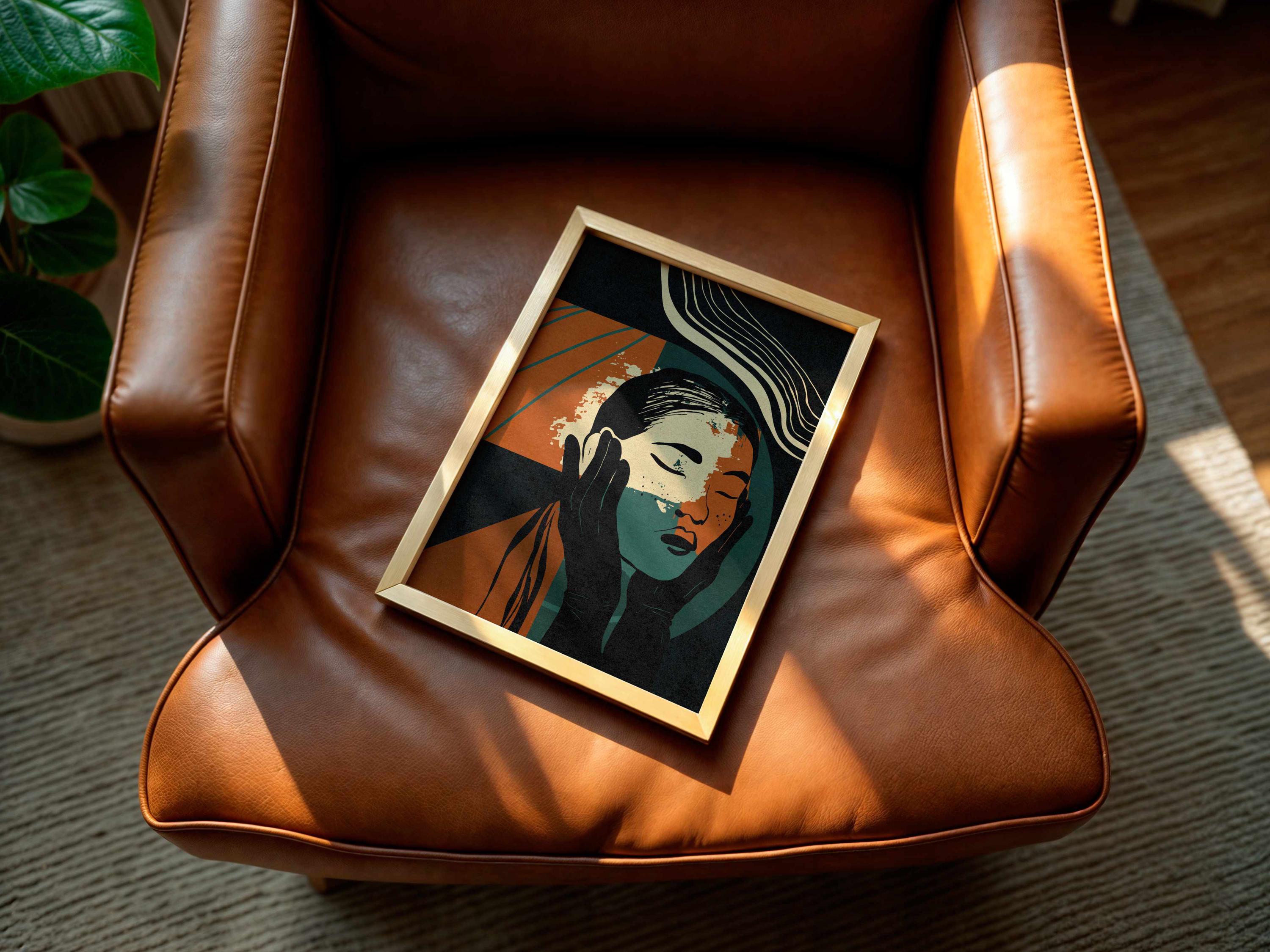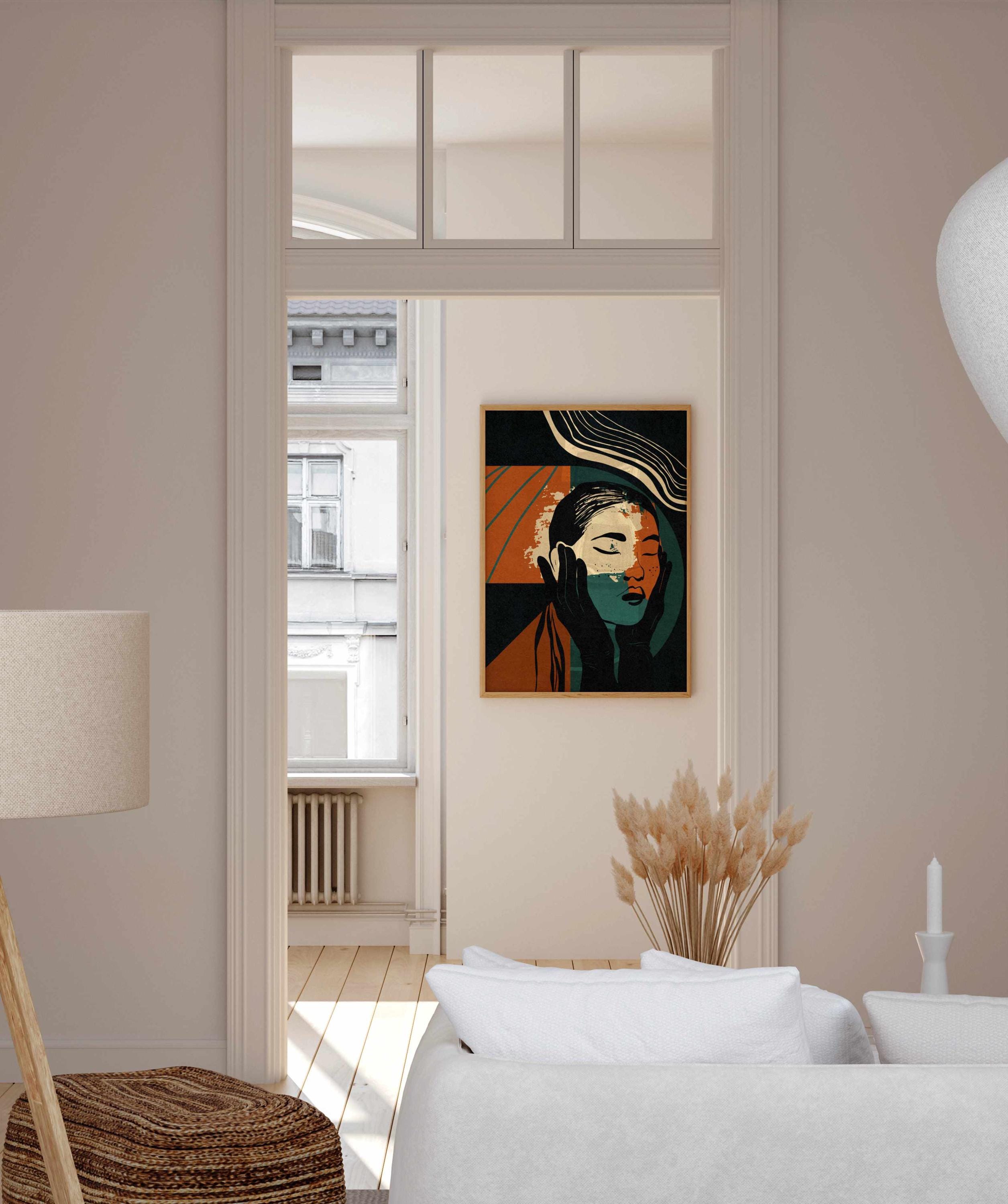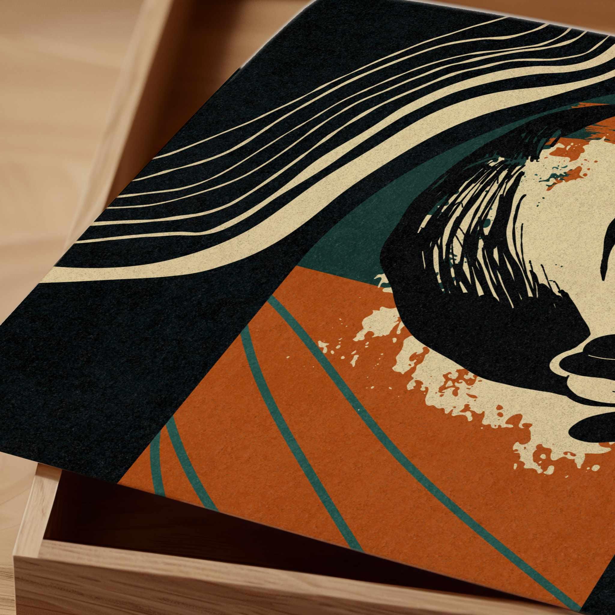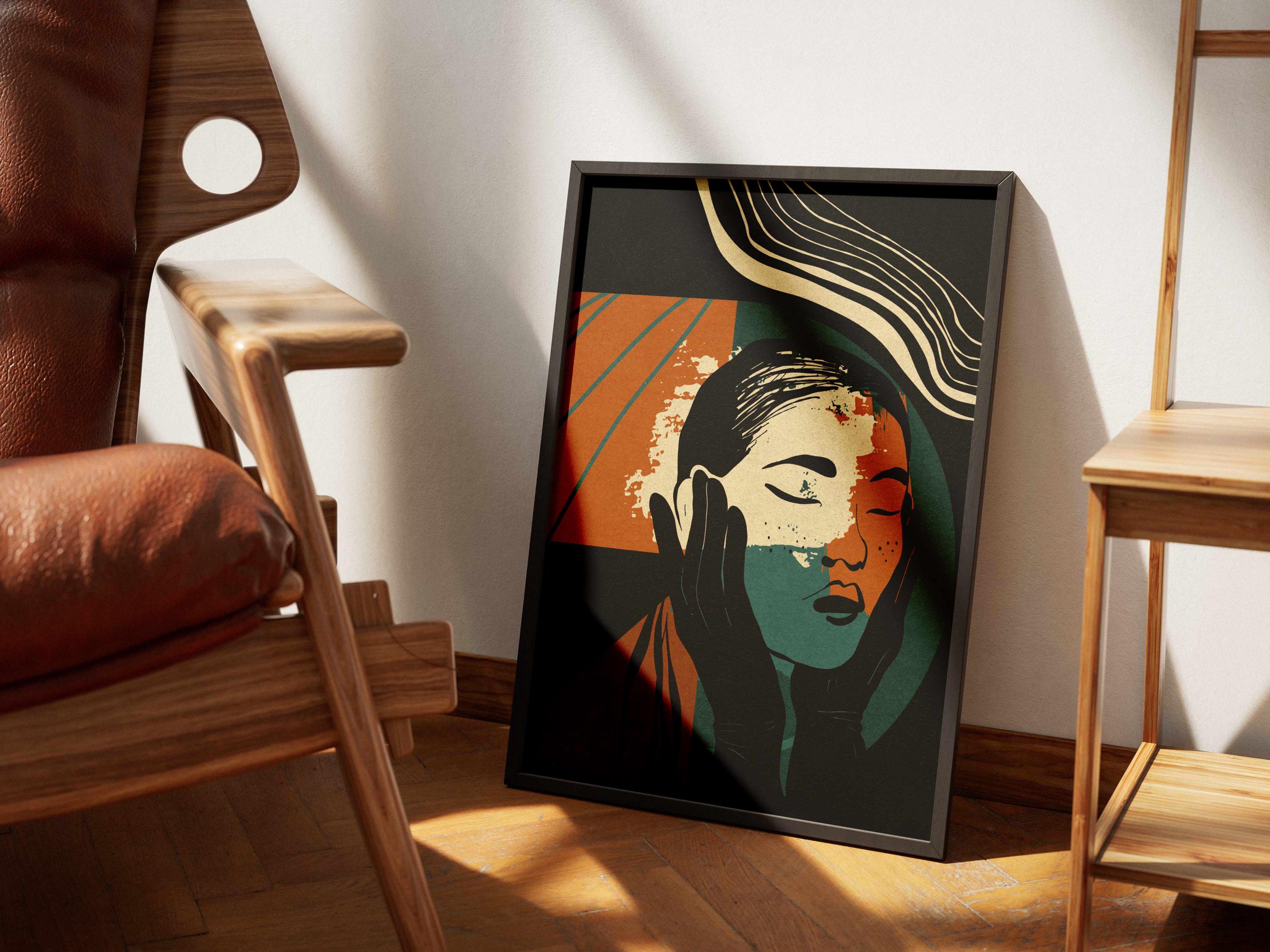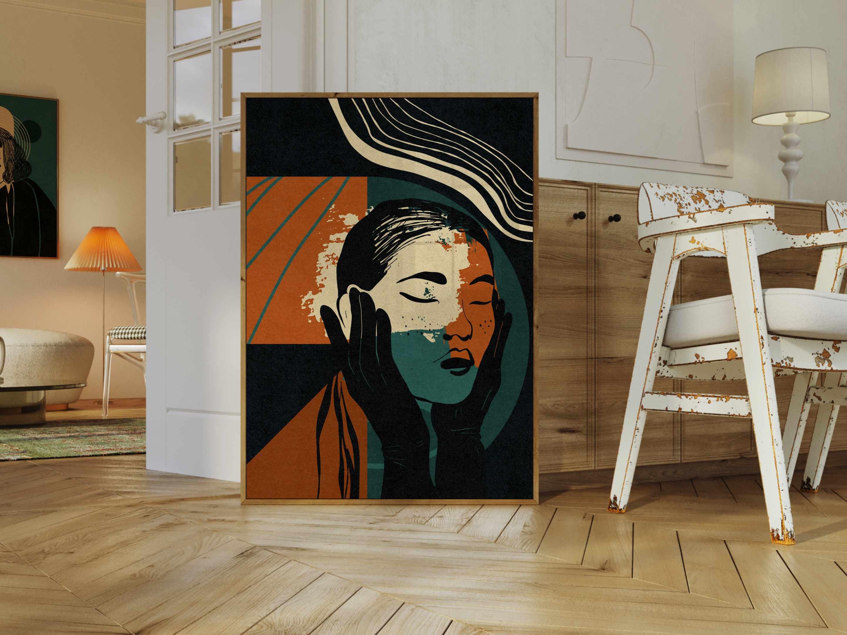 Abstract woman portrait art print in black, burnt orange, cream and teal color palette. This modern minimalist print is perfect for mid century, contemporary or eclectic interiors. Whether styled in a gallery wall or as a focal point in a bedroom or living space, this piece adds elegance and depth without clutter.
