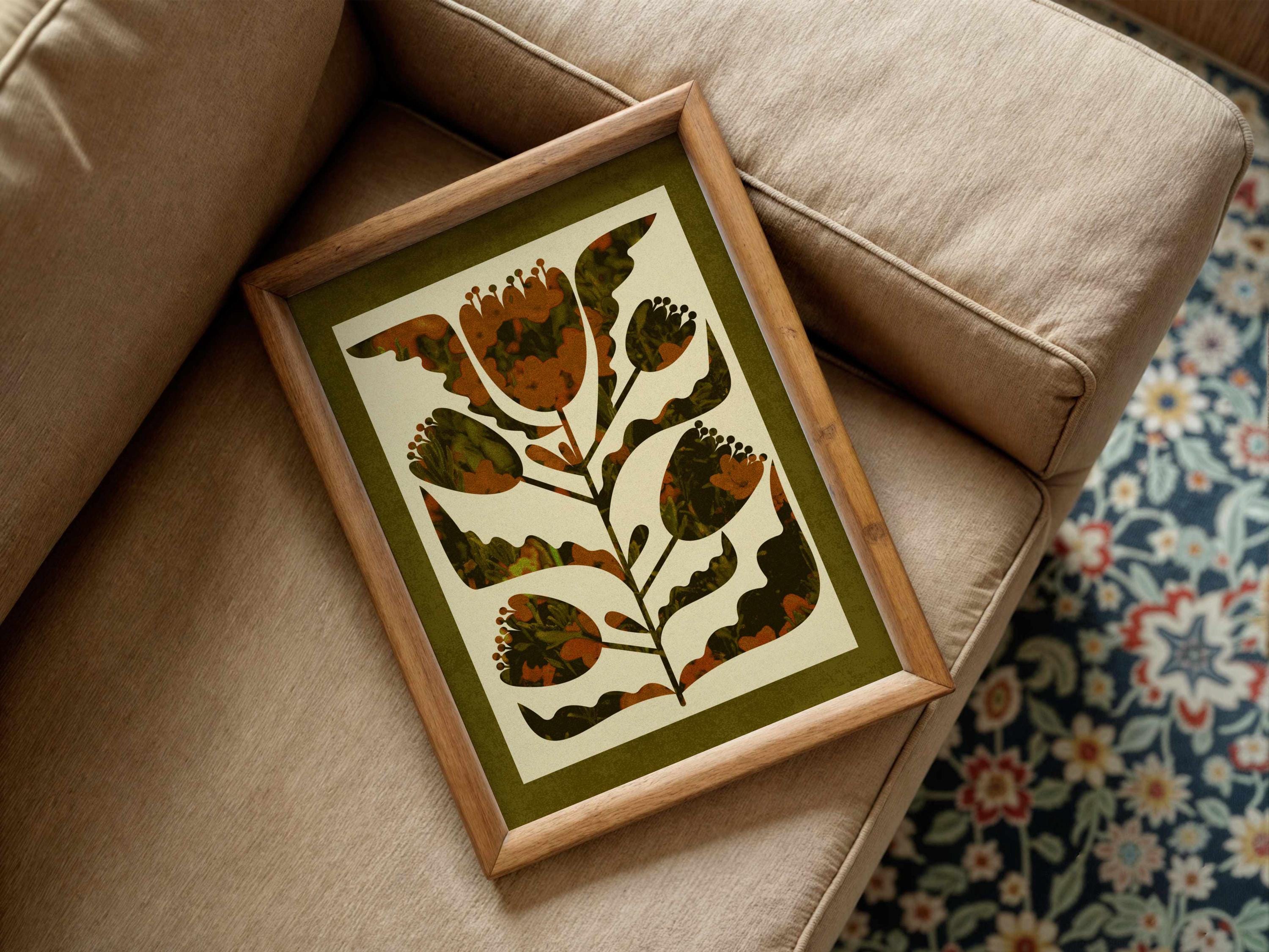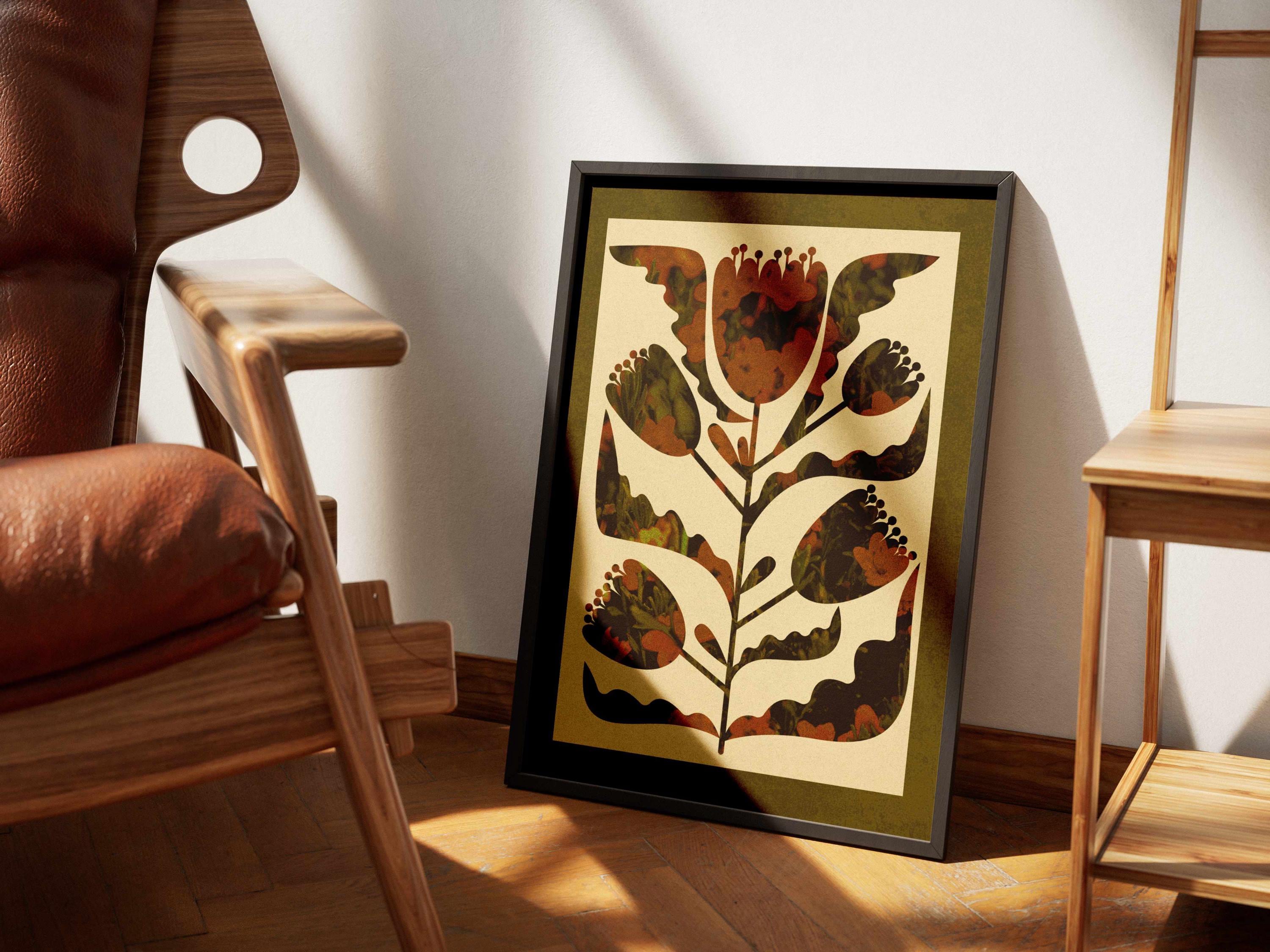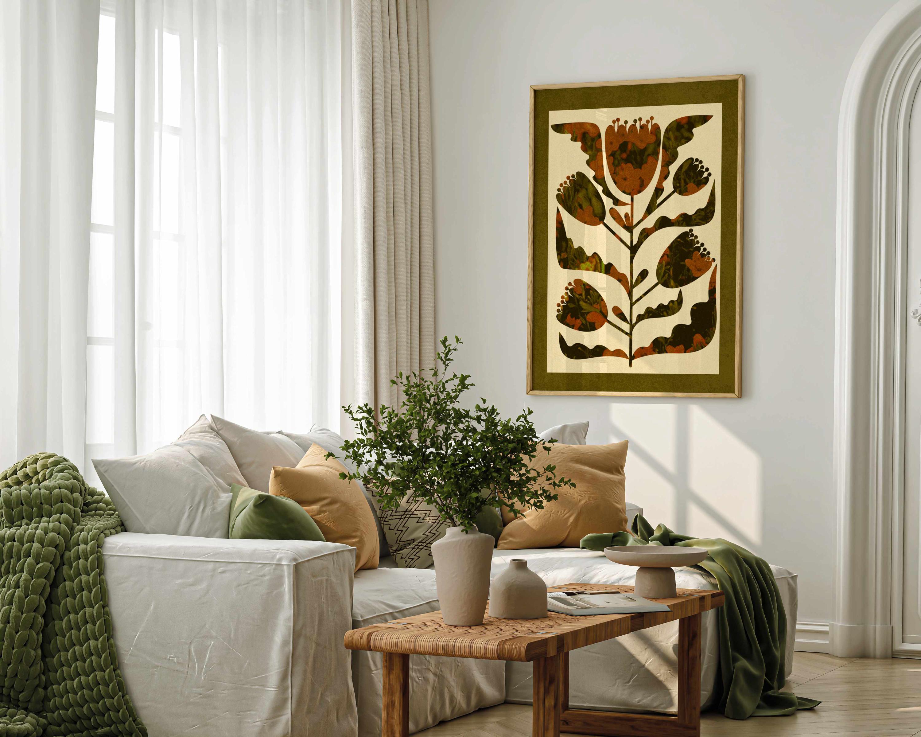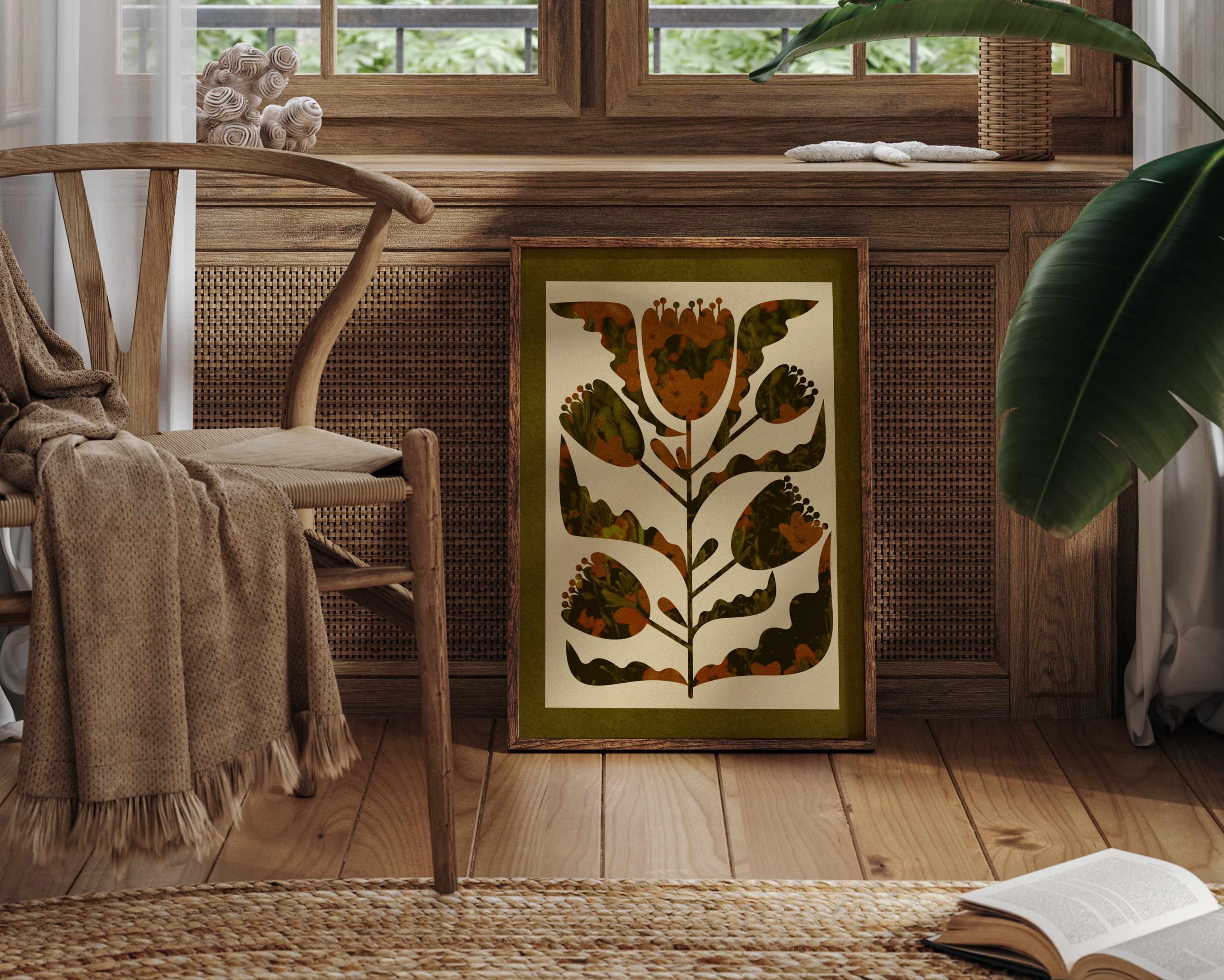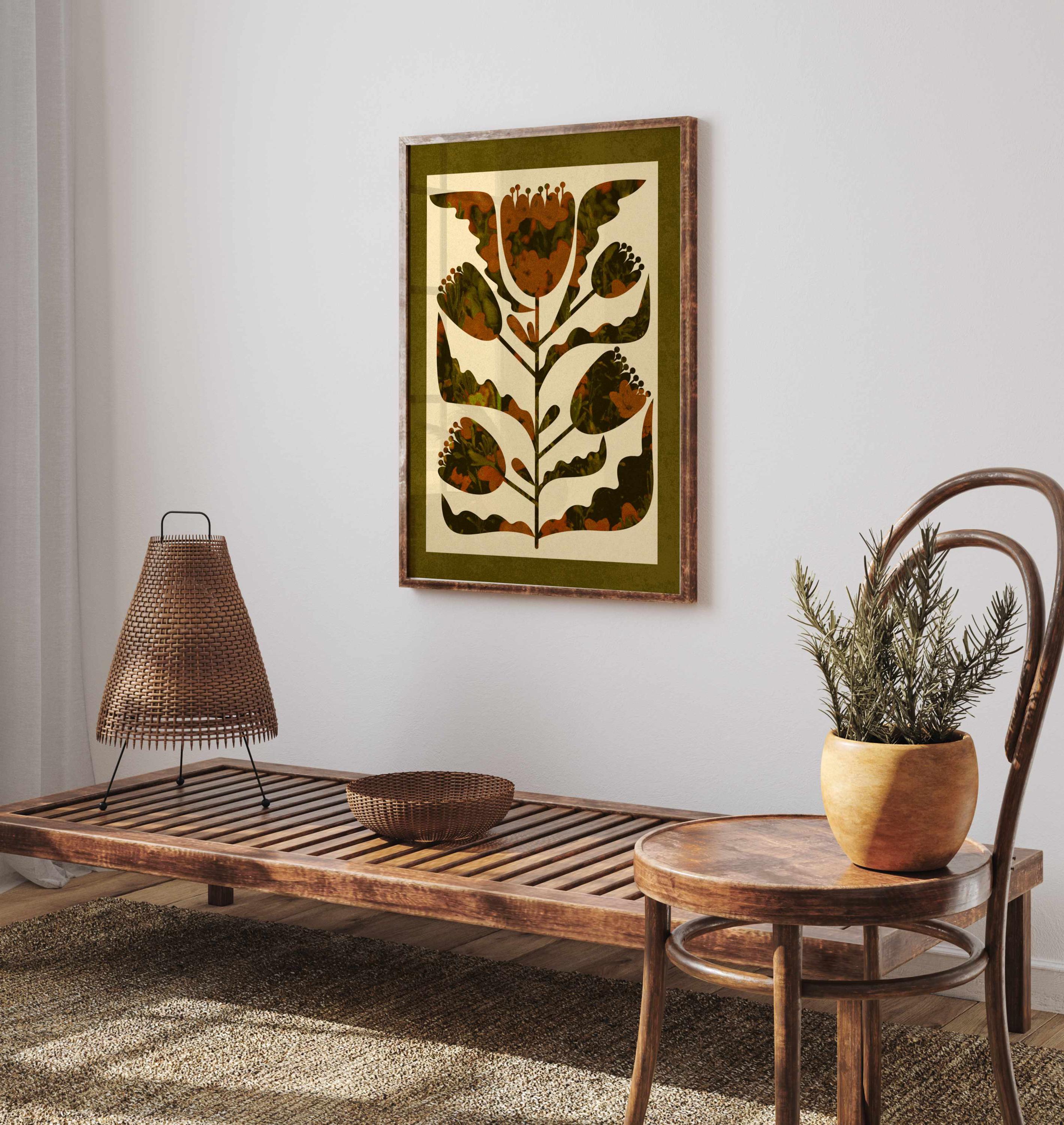 Abstract botanical print featuring soft organic plant shapes and blooms in earthy, fall colors. This mid century style artwork blends vintage aesthetics with a modern, boho home vibe, making it perfect for living rooms, bedrooms, offices or gallery walls.