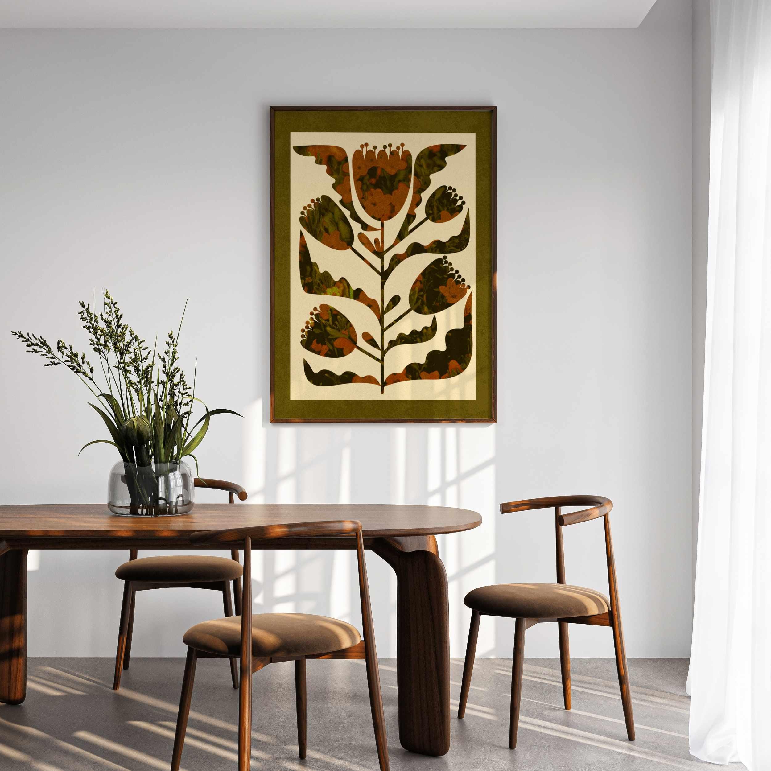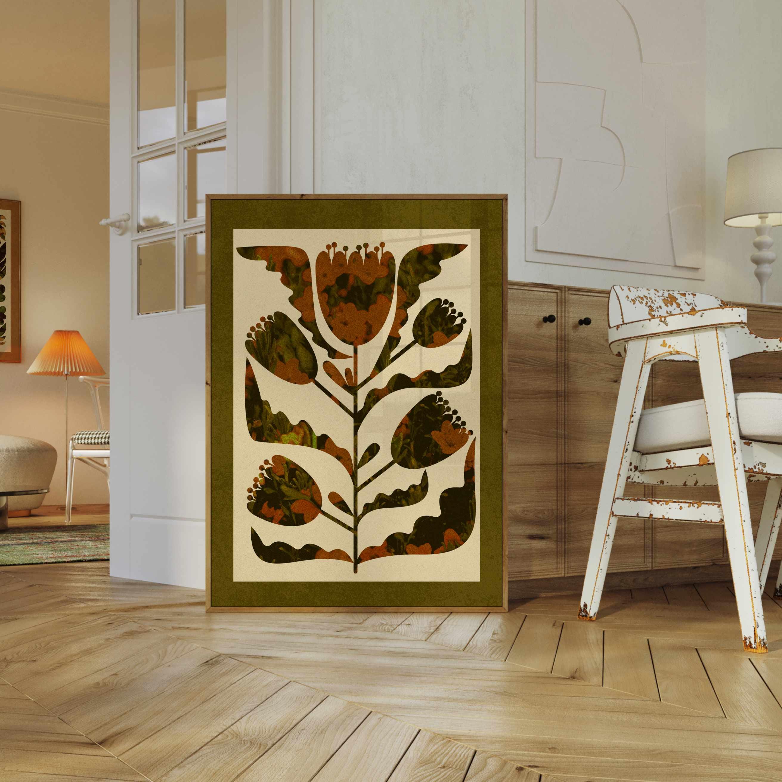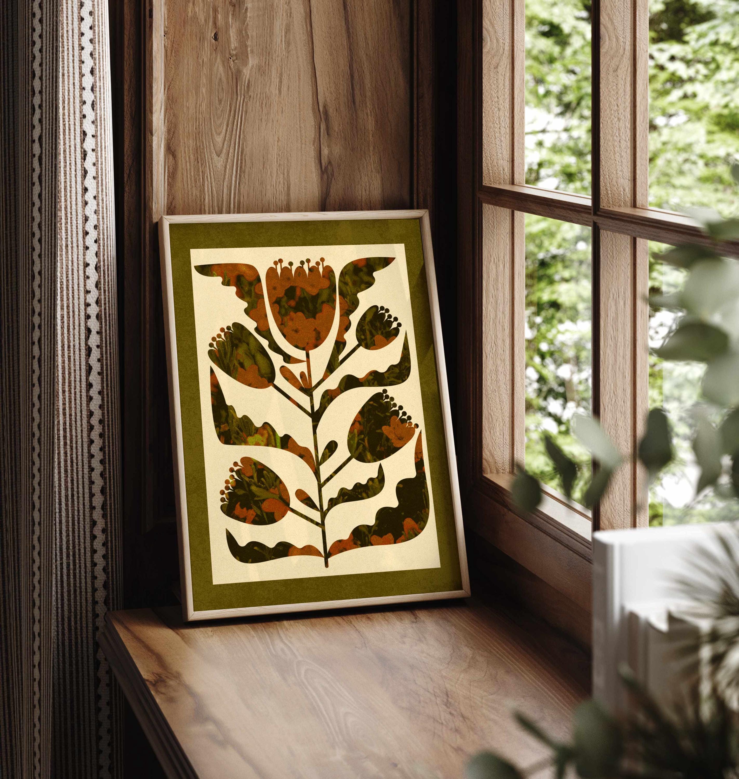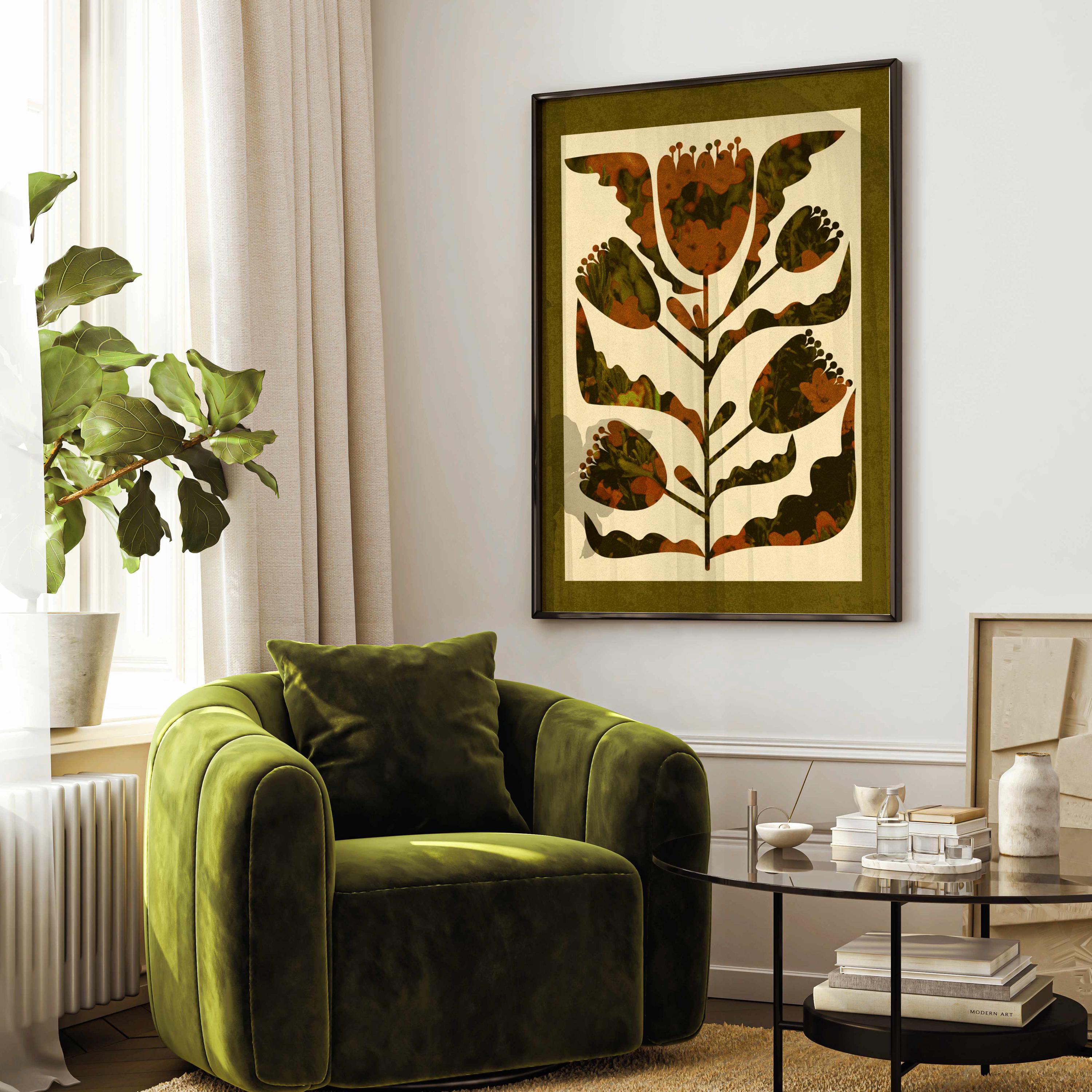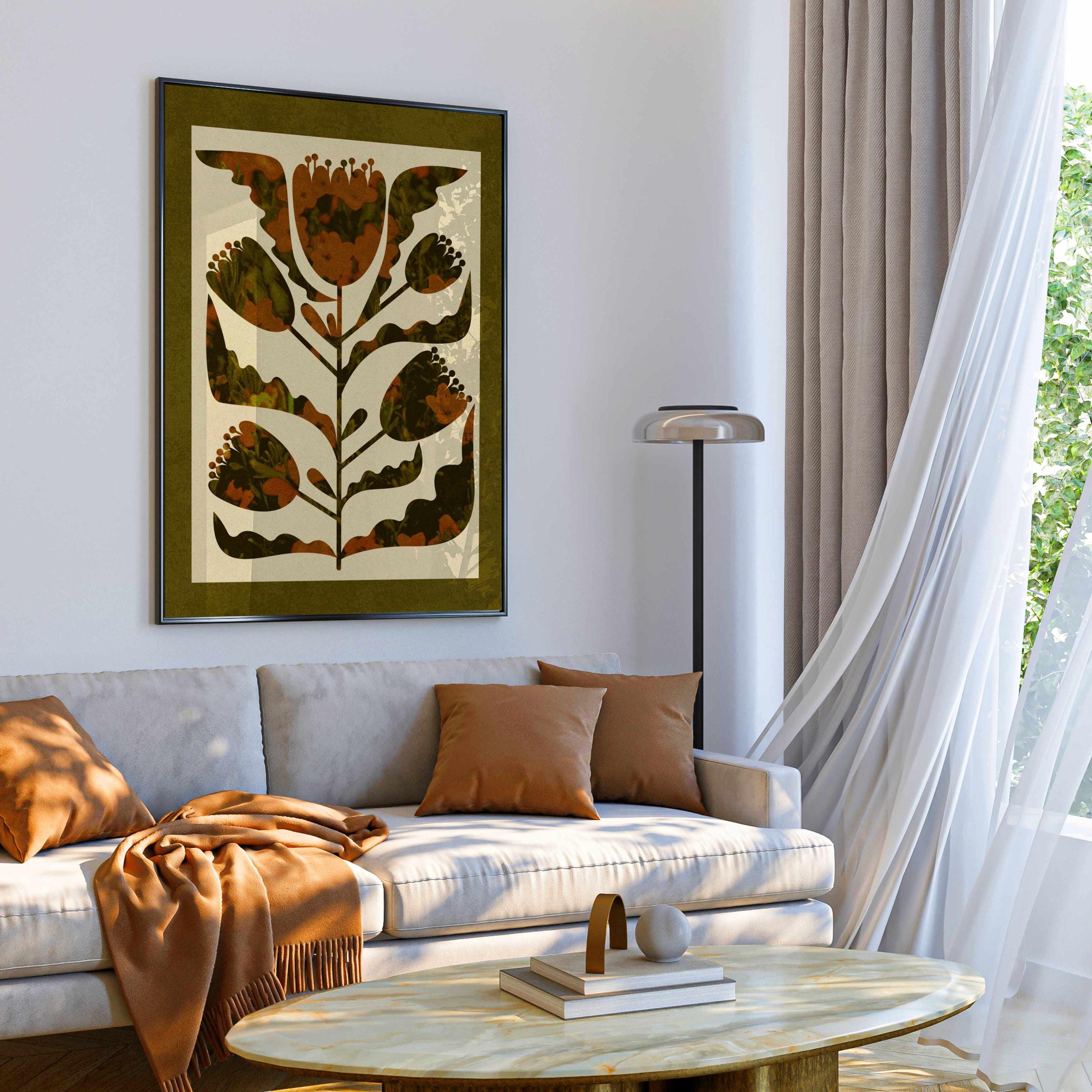 Abstract botanical print featuring soft organic plant shapes and blooms in earthy, fall colors. This mid century style artwork blends vintage aesthetics with a modern, boho home vibe, making it perfect for living rooms, bedrooms, offices or gallery walls.