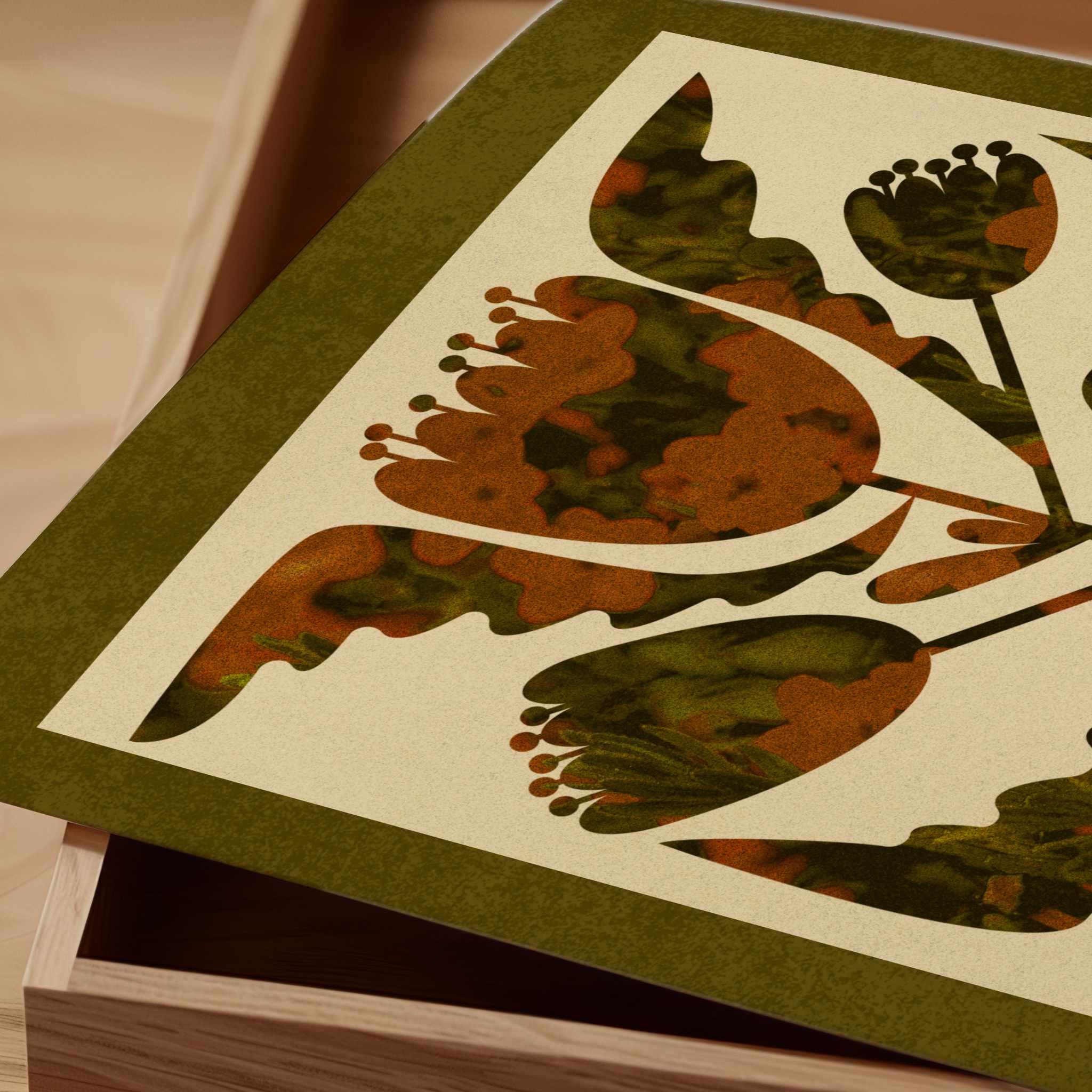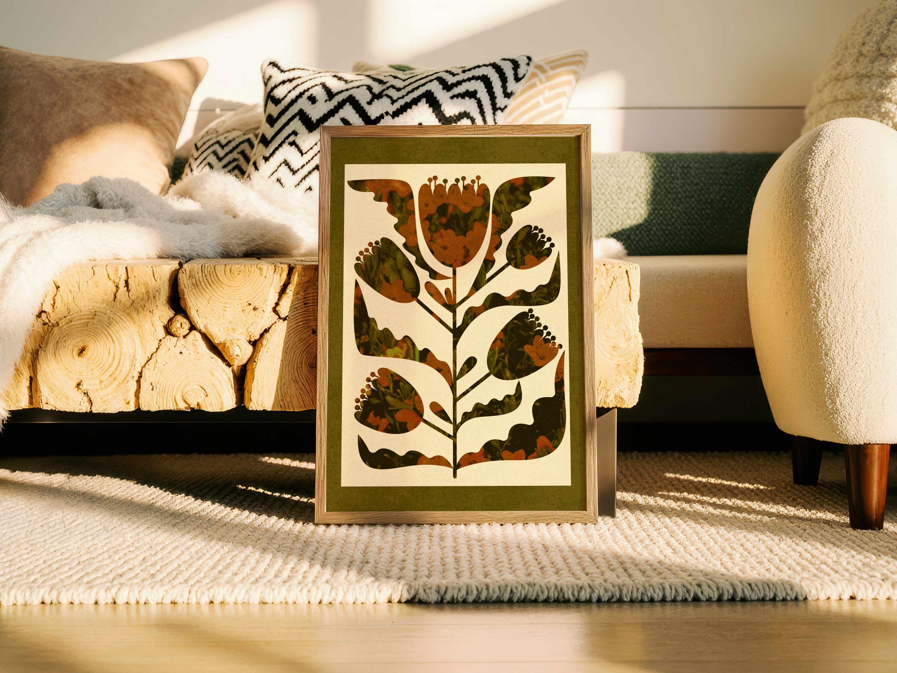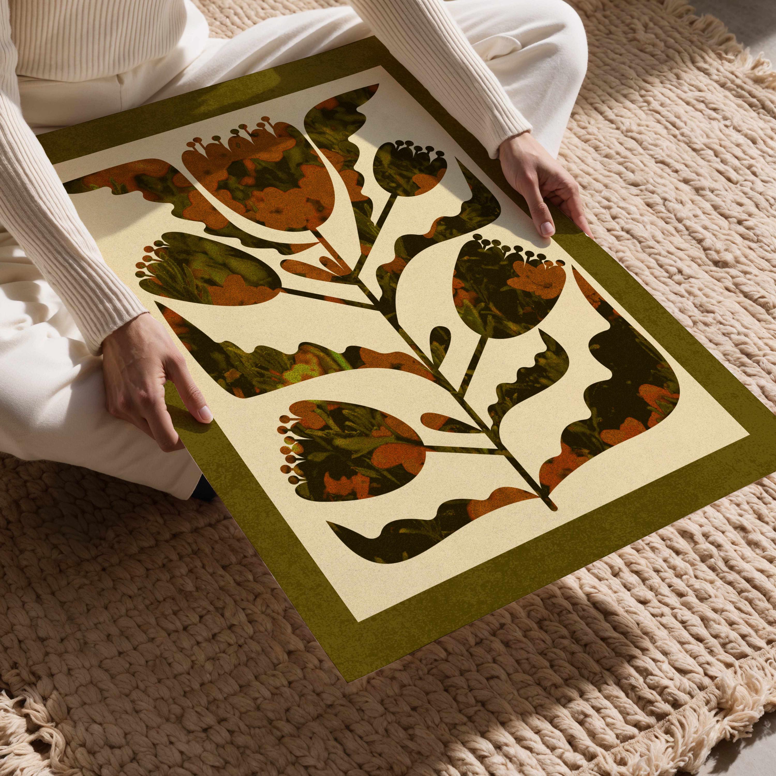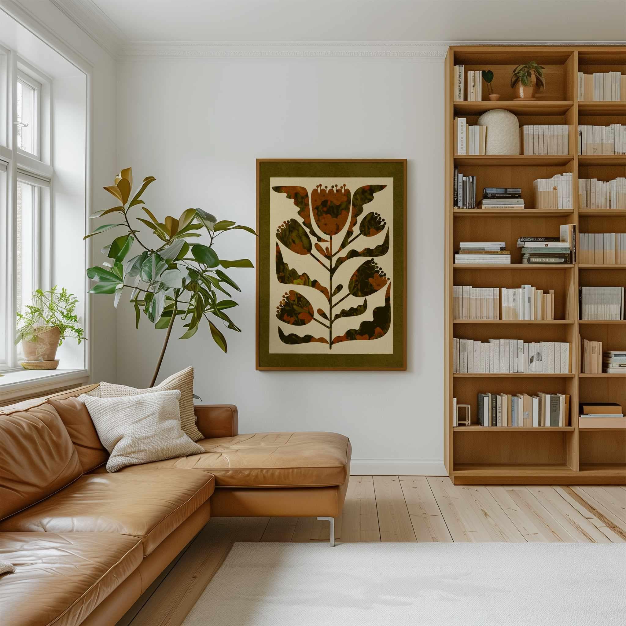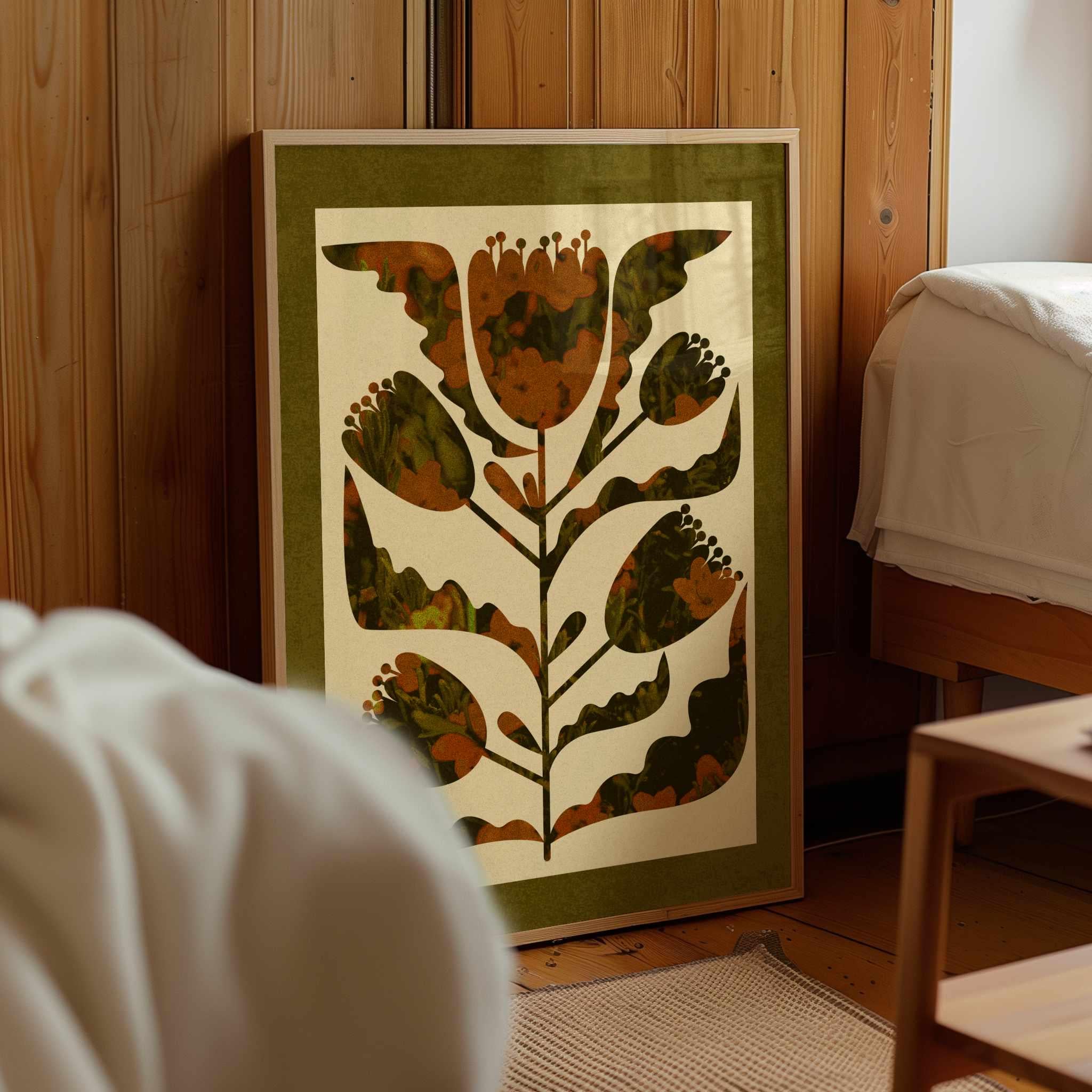 Abstract botanical print featuring soft organic plant shapes and blooms in earthy, fall colors. This mid century style artwork blends vintage aesthetics with a modern, boho home vibe, making it perfect for living rooms, bedrooms, offices or gallery walls.
