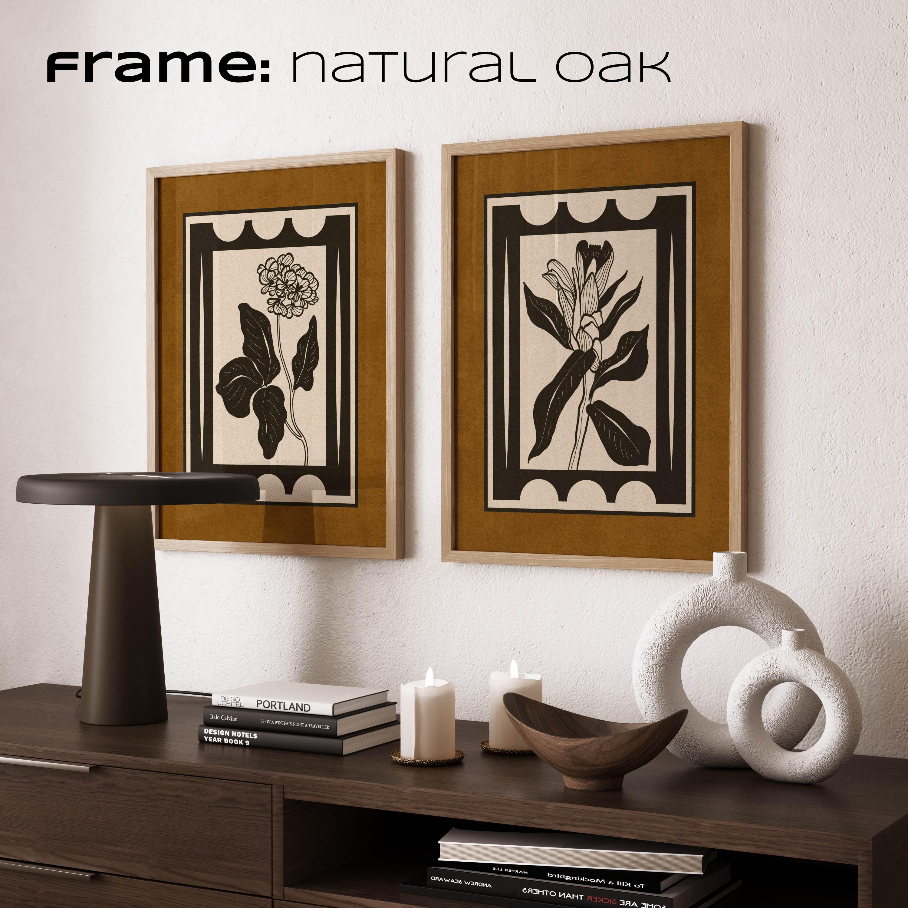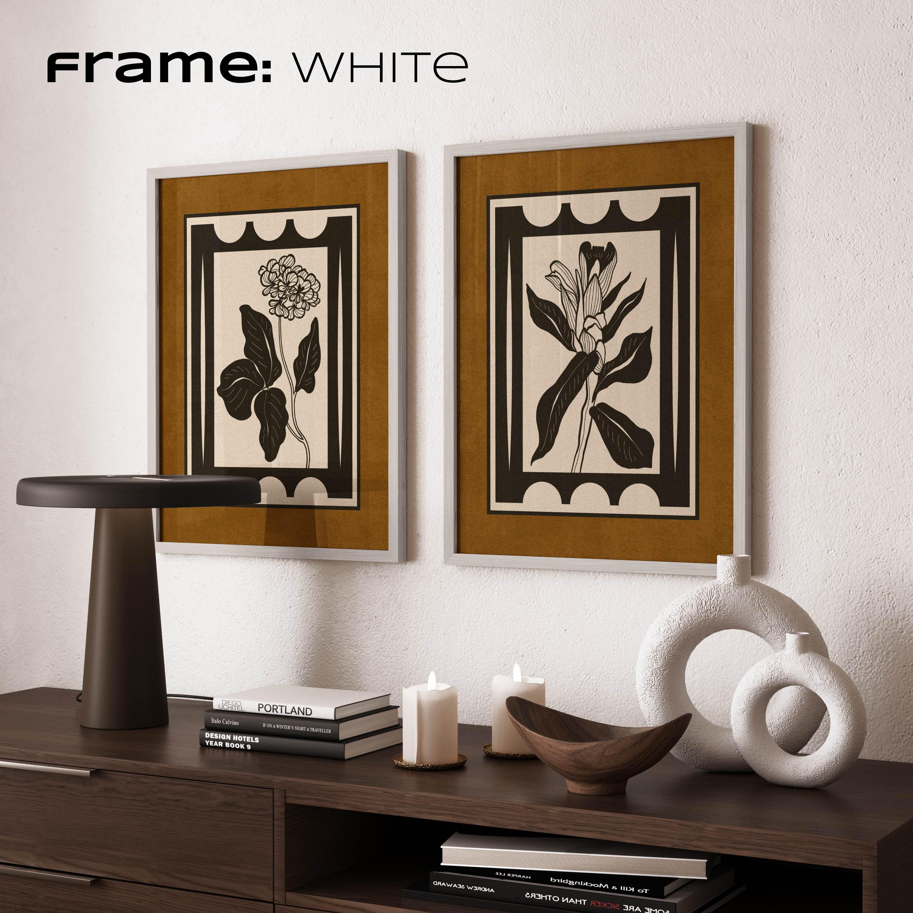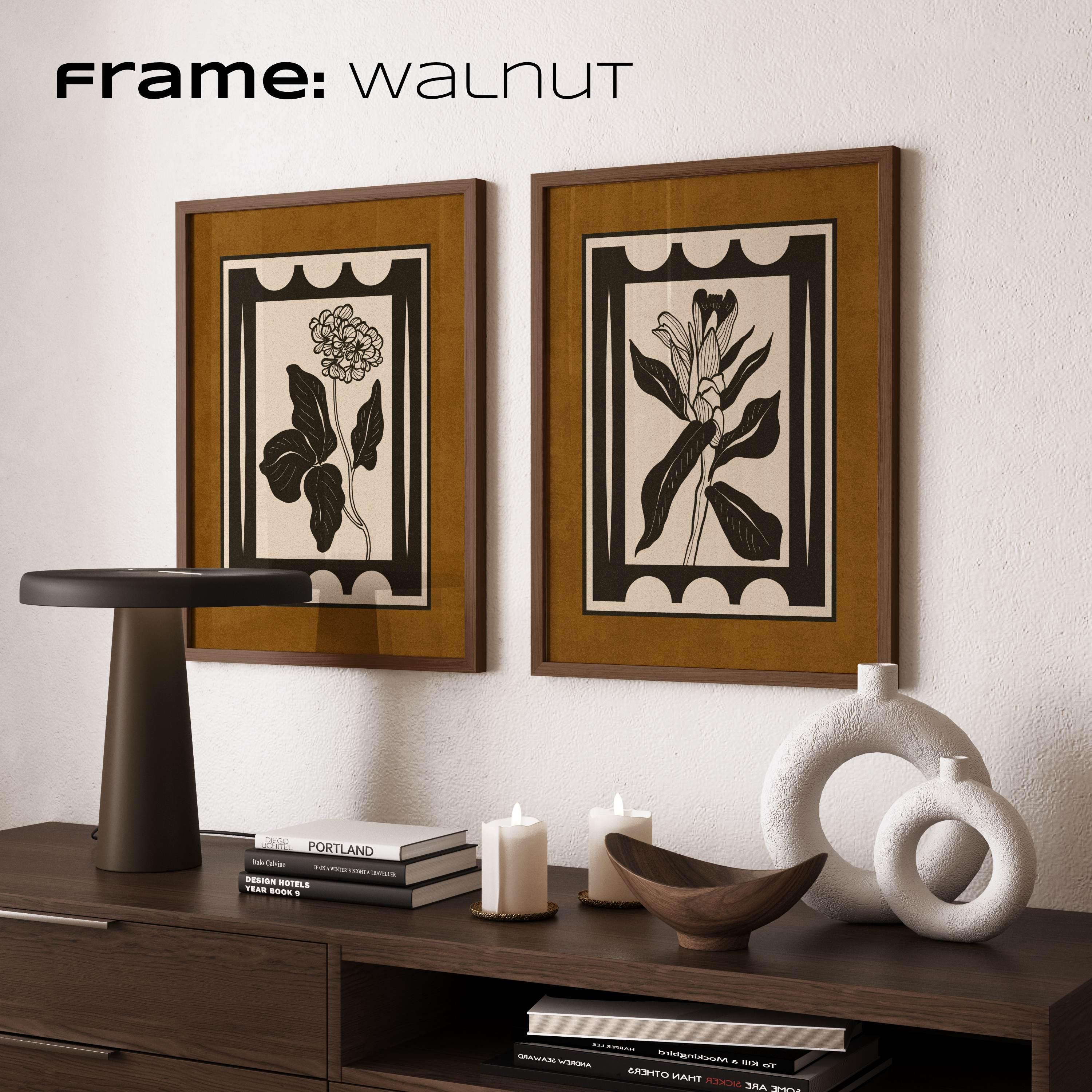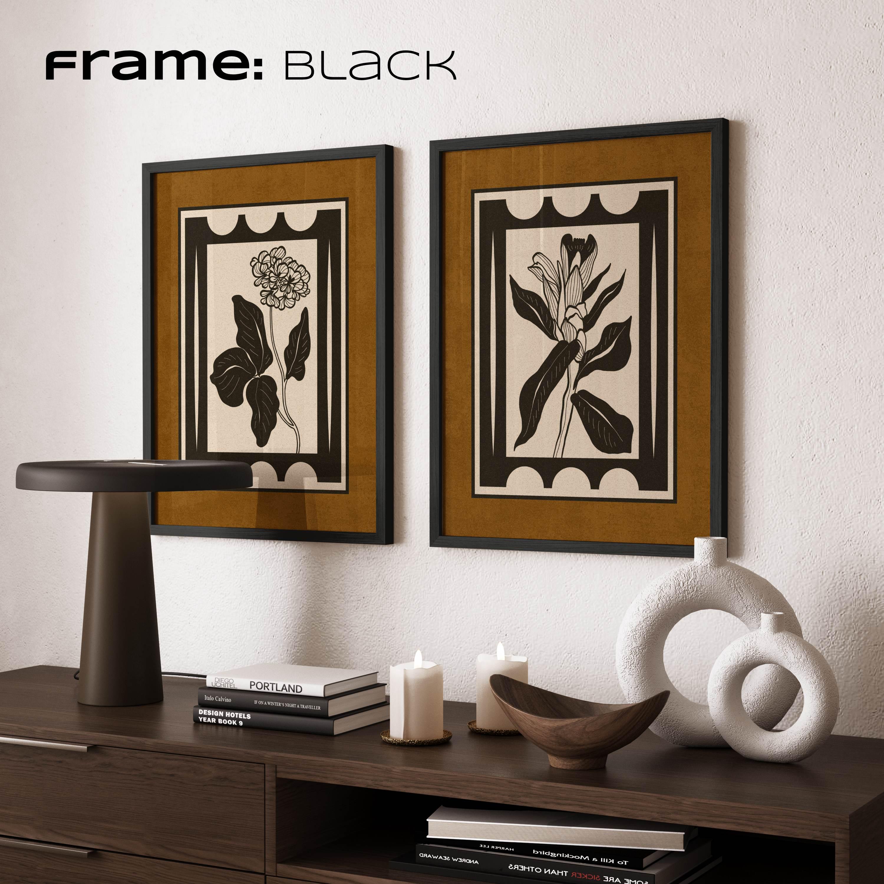 Framed set of two vintage botanical prints with bold, graphic floral shapes and a clean, structured layout. The earthy color palette of charcoal black, warm brown, and light beige creates a modern vintage look that works well in mid century, Scandinavian, and neutral interiors.