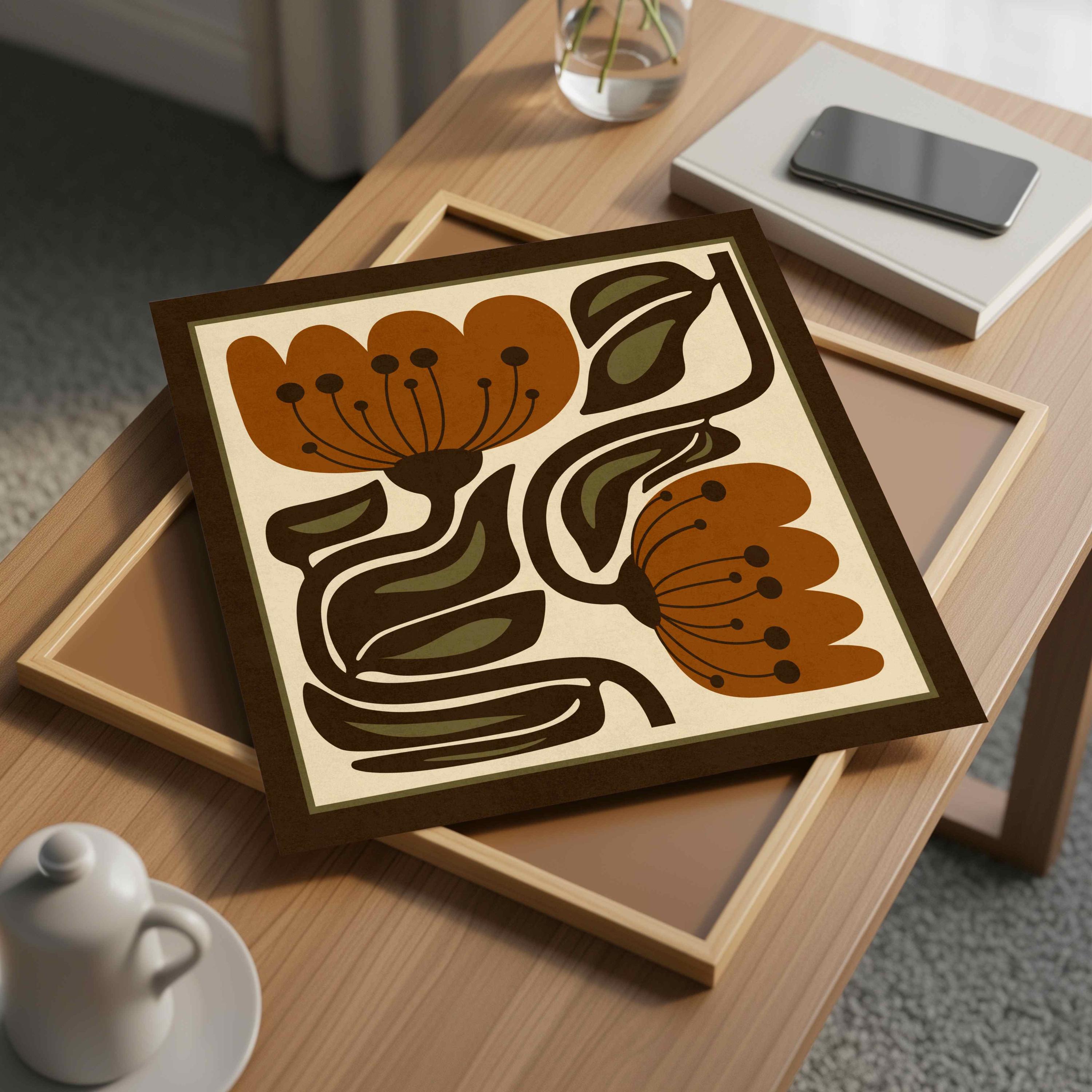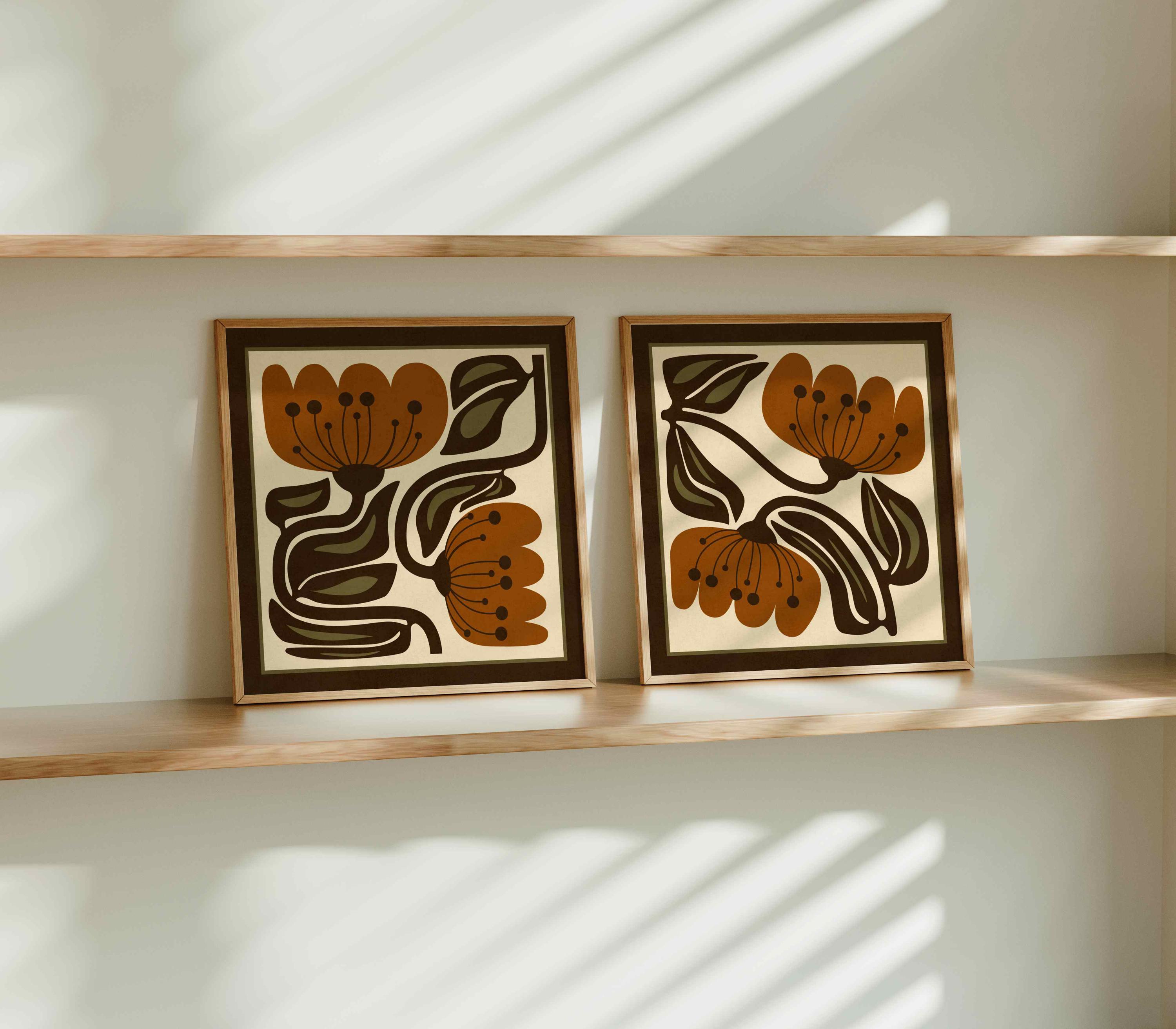 Abstract retro floral print set inspired by Matisse botanical shapes and groovy 70s design. This earthy flower duo features warm terracotta blooms, dark mocha brown leaves and soft olive green details layered over a cream background, and finished off with a deep brown border.