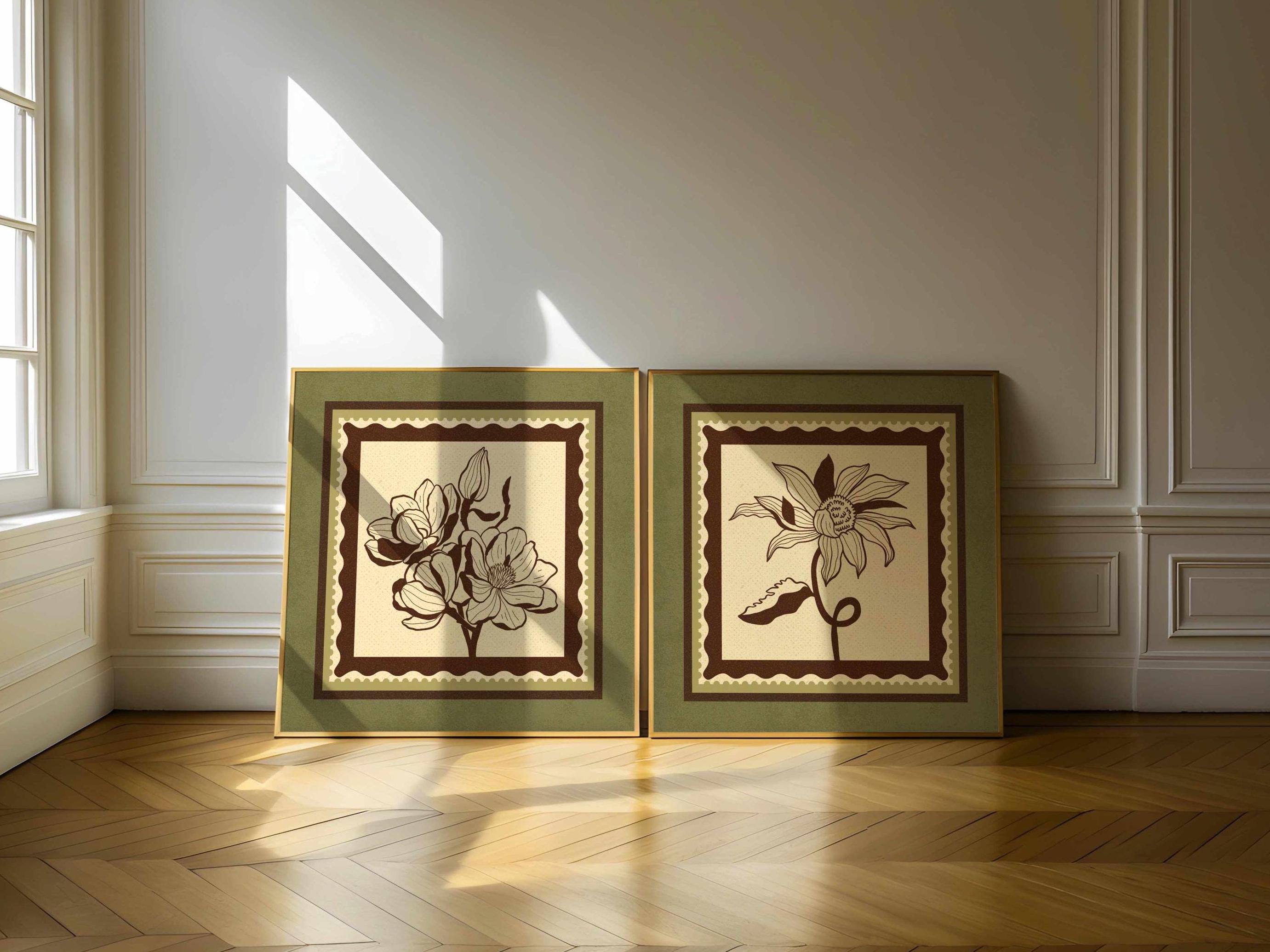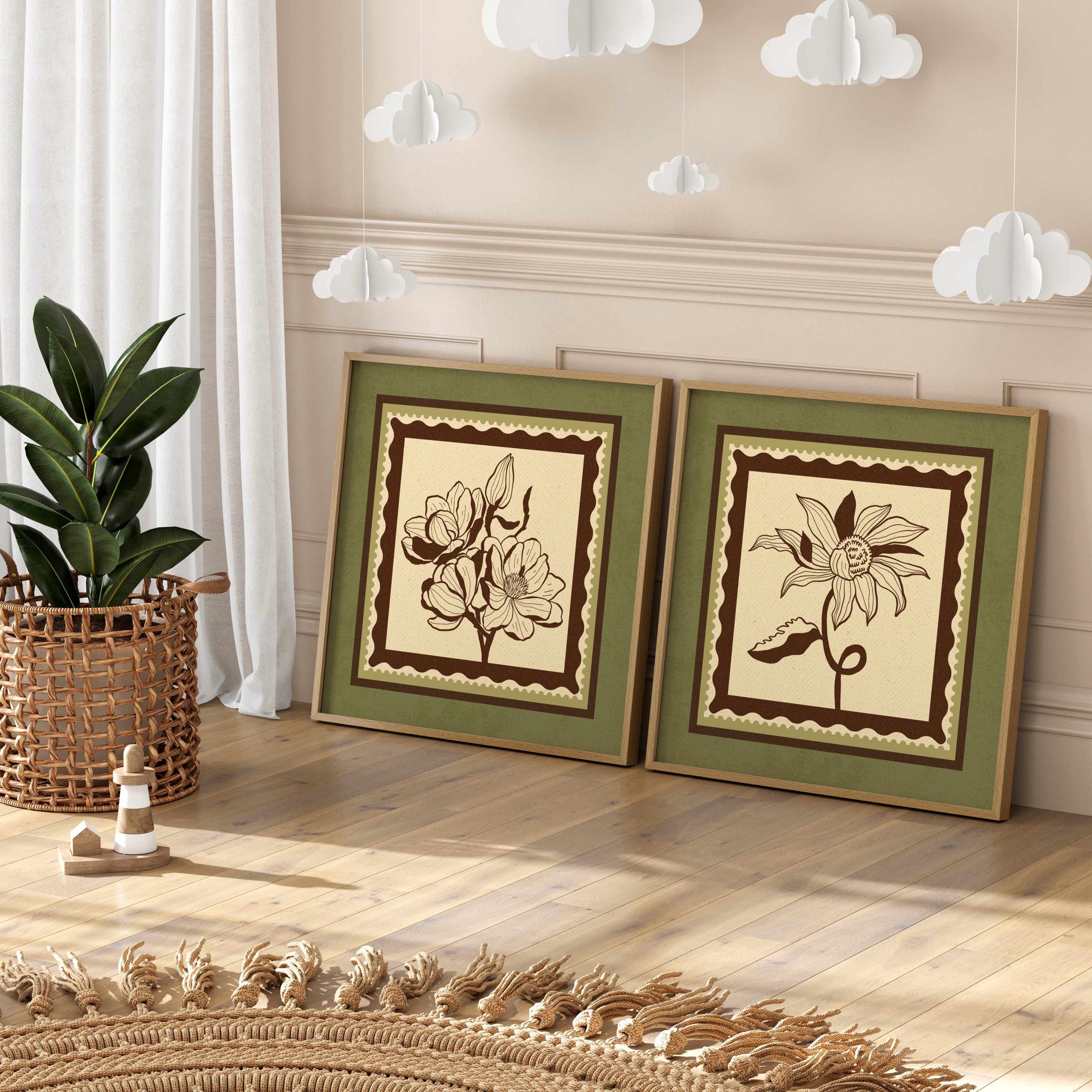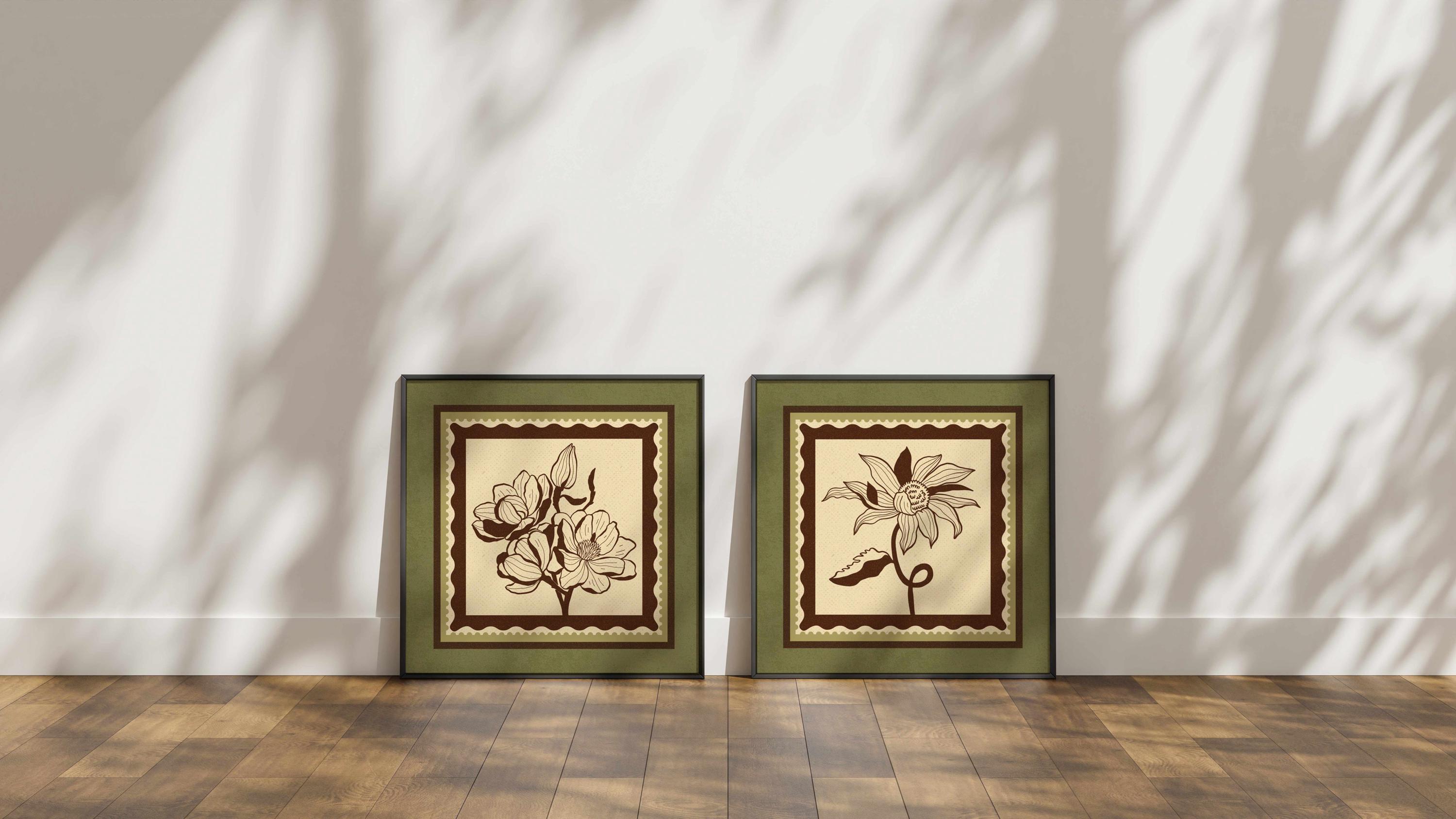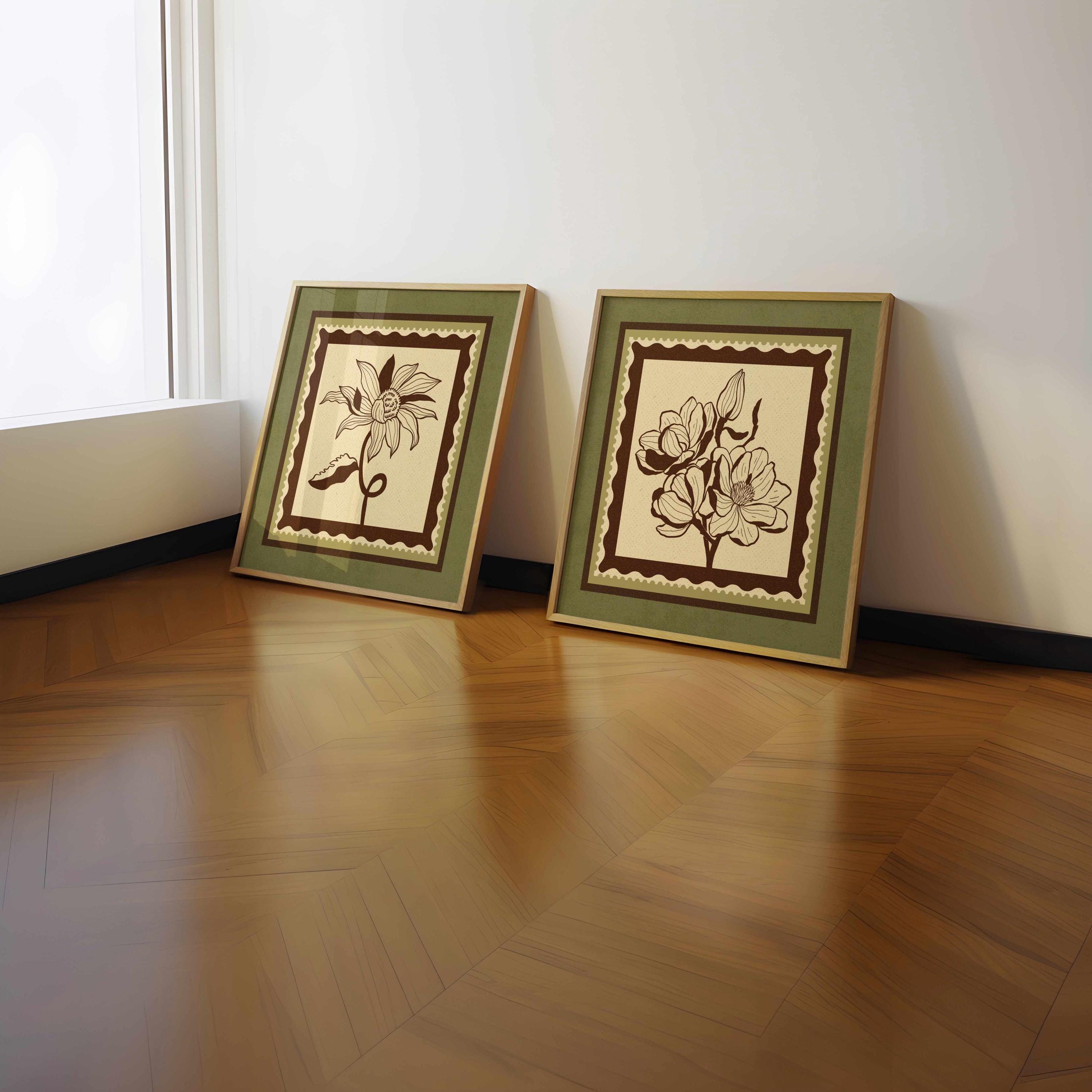 Set of two vintage botanical prints featuring delicate wildflowers inspired by retro design and nature’s quiet beauty. Designed in a stamp-style layout with earthy tones of warm mocha brown, light beige, and soft moss green, this set blends mid-century design, retro florals, and cottagecore aesthetics — making it the perfect addition to a gallery wall, reading nook, bedroom, or cozy kitchen.