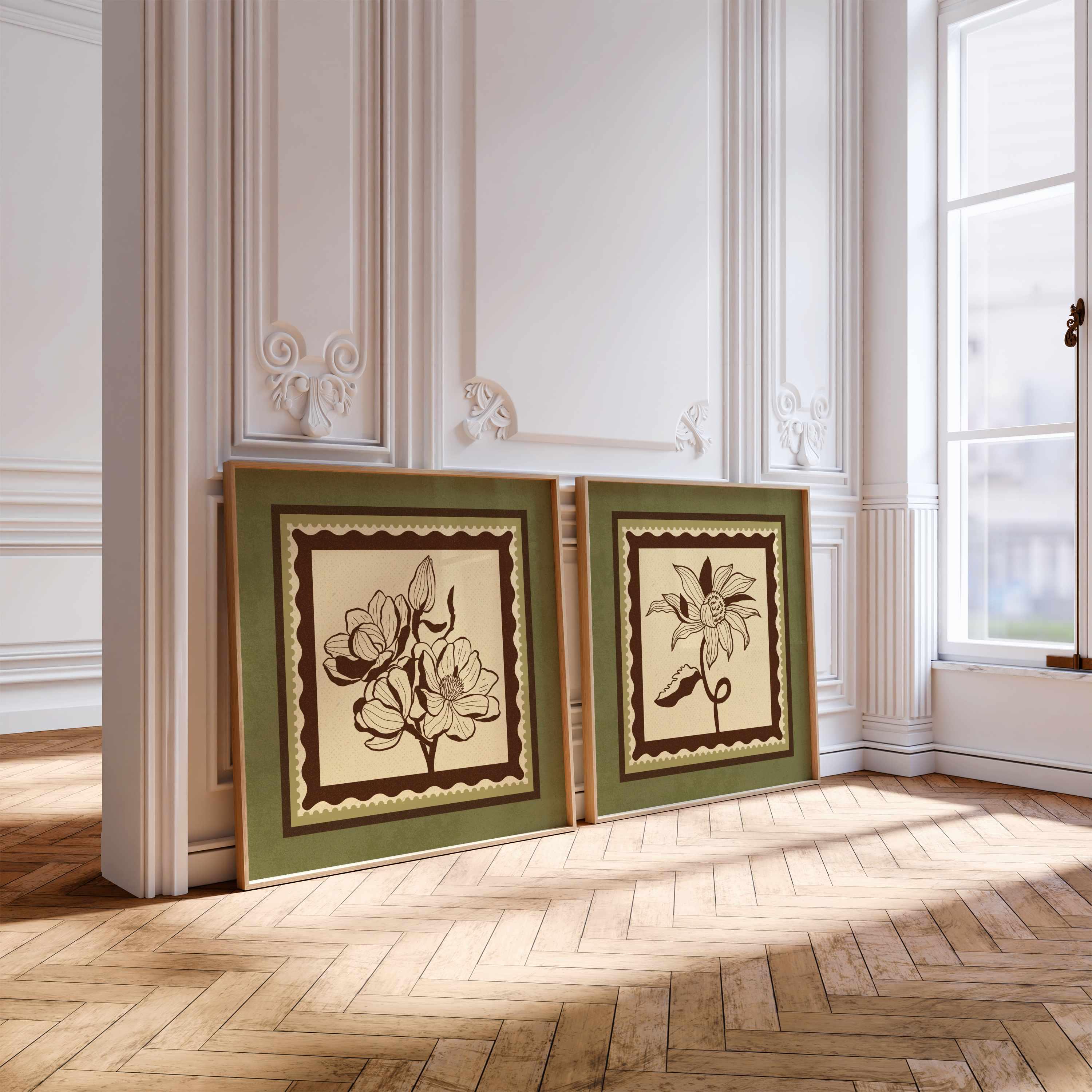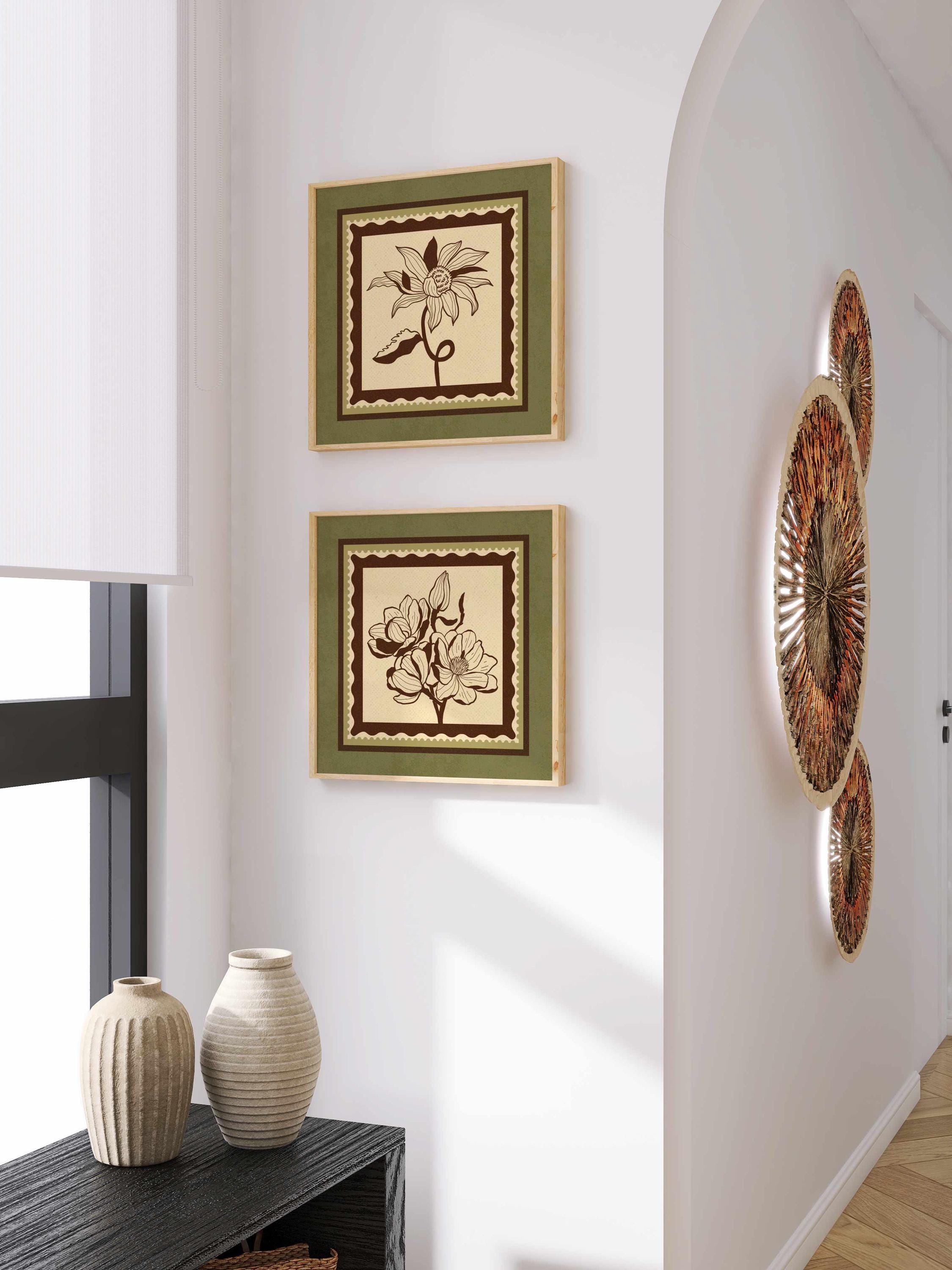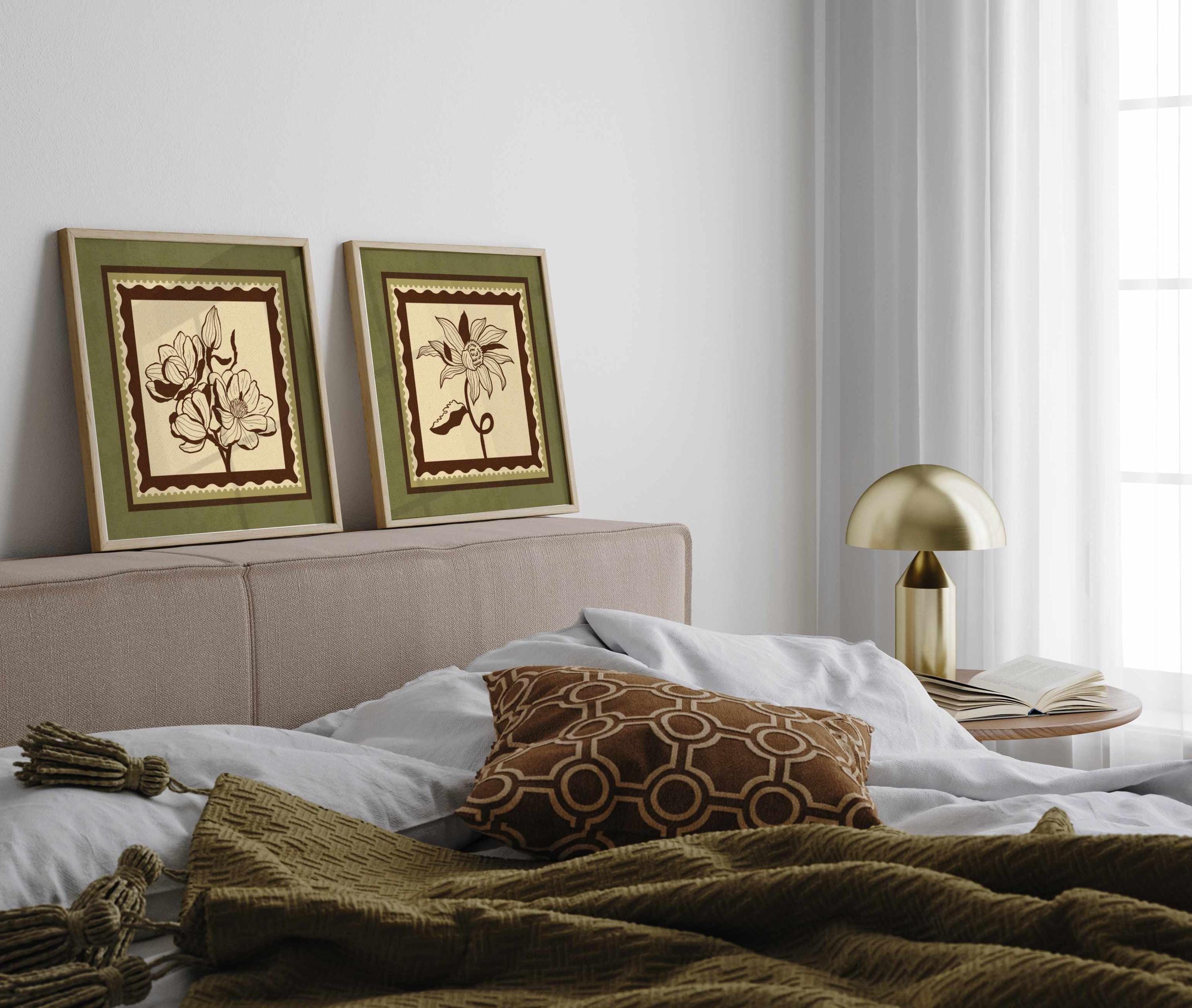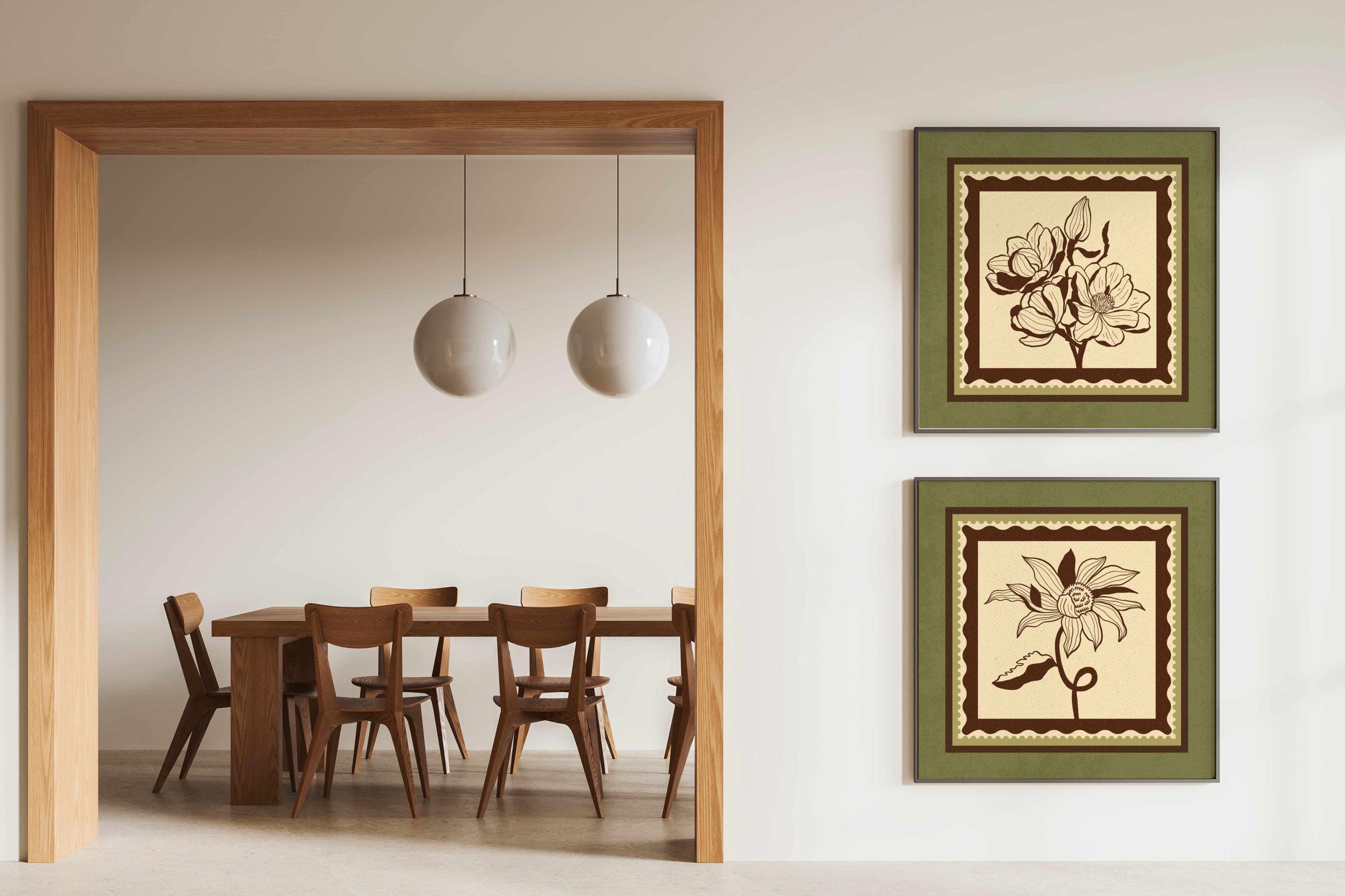Set of two vintage botanical prints featuring delicate wildflowers inspired by retro design and nature’s quiet beauty. Designed in a stamp-style layout with earthy tones of warm mocha brown, light beige, and soft moss green, this set blends mid-century design, retro florals, and cottagecore aesthetics — making it the perfect addition to a gallery wall, reading nook, bedroom, or cozy kitchen.