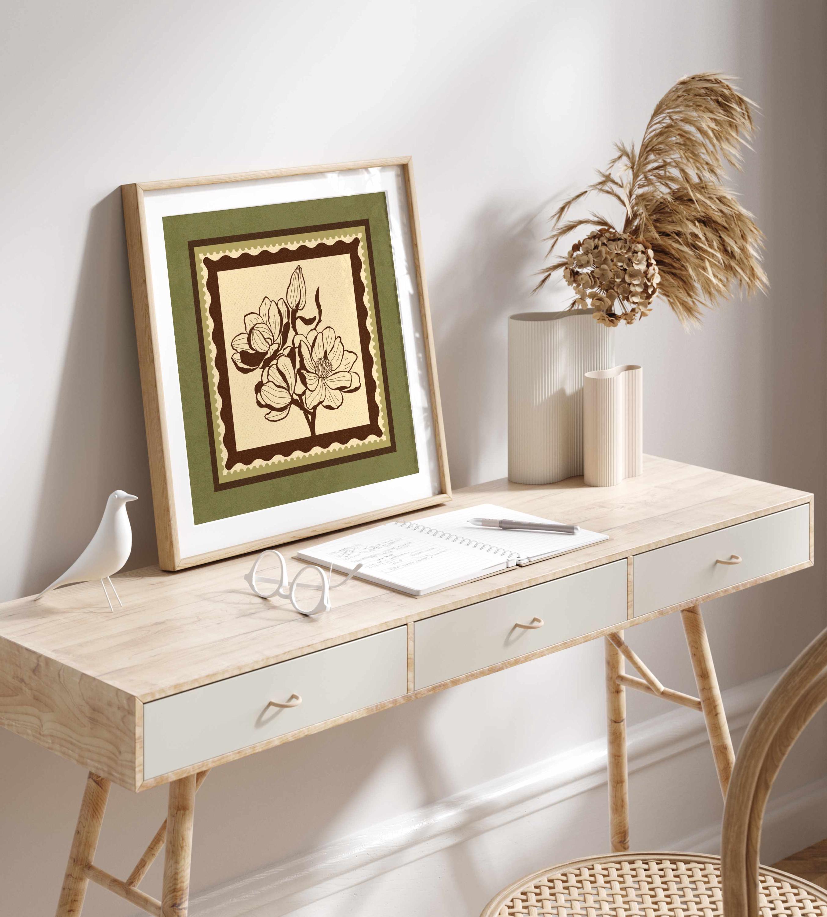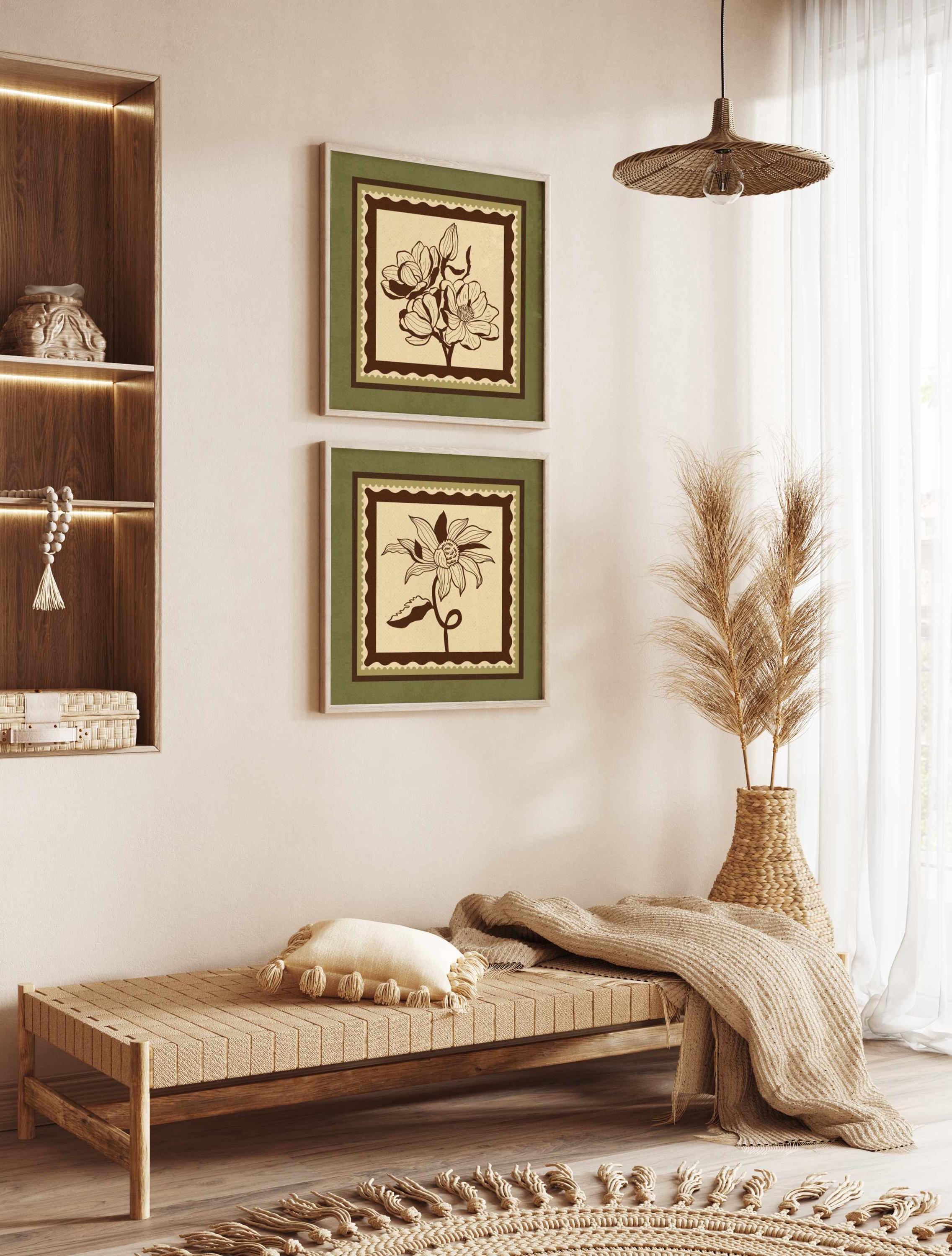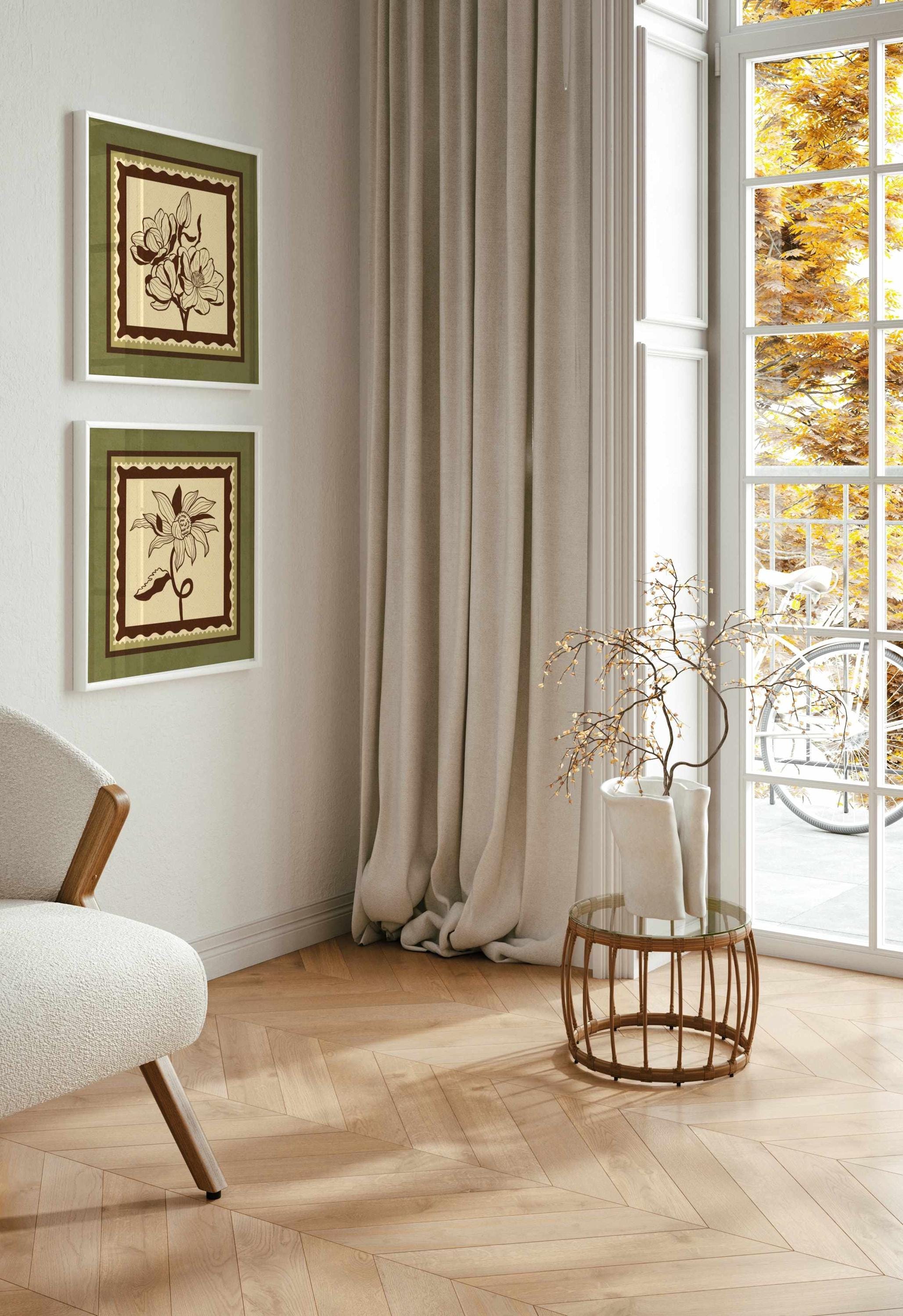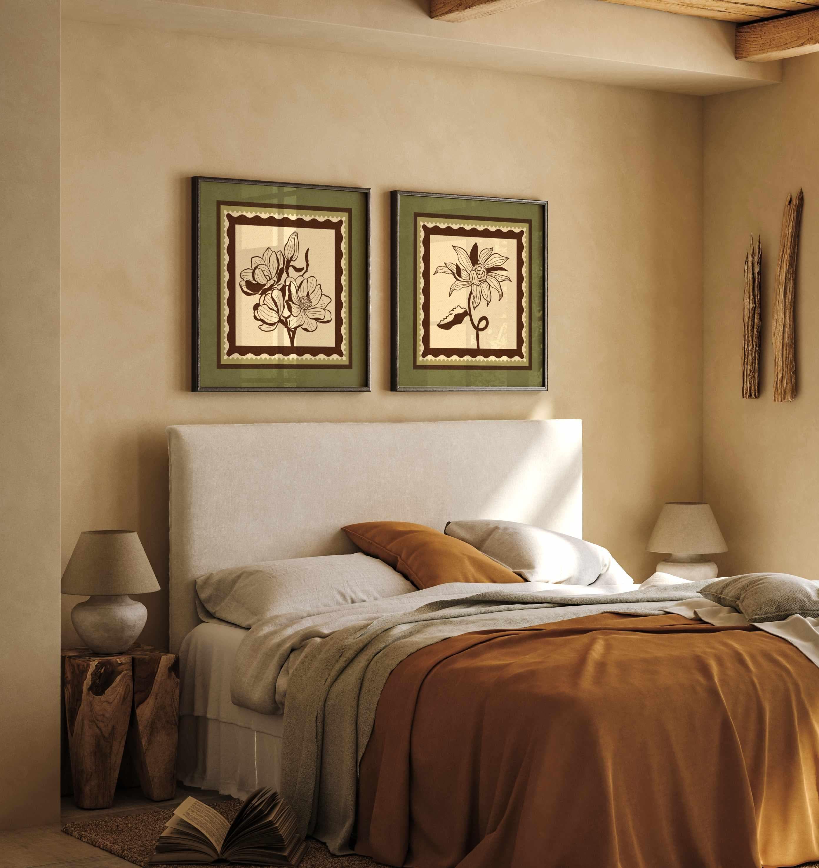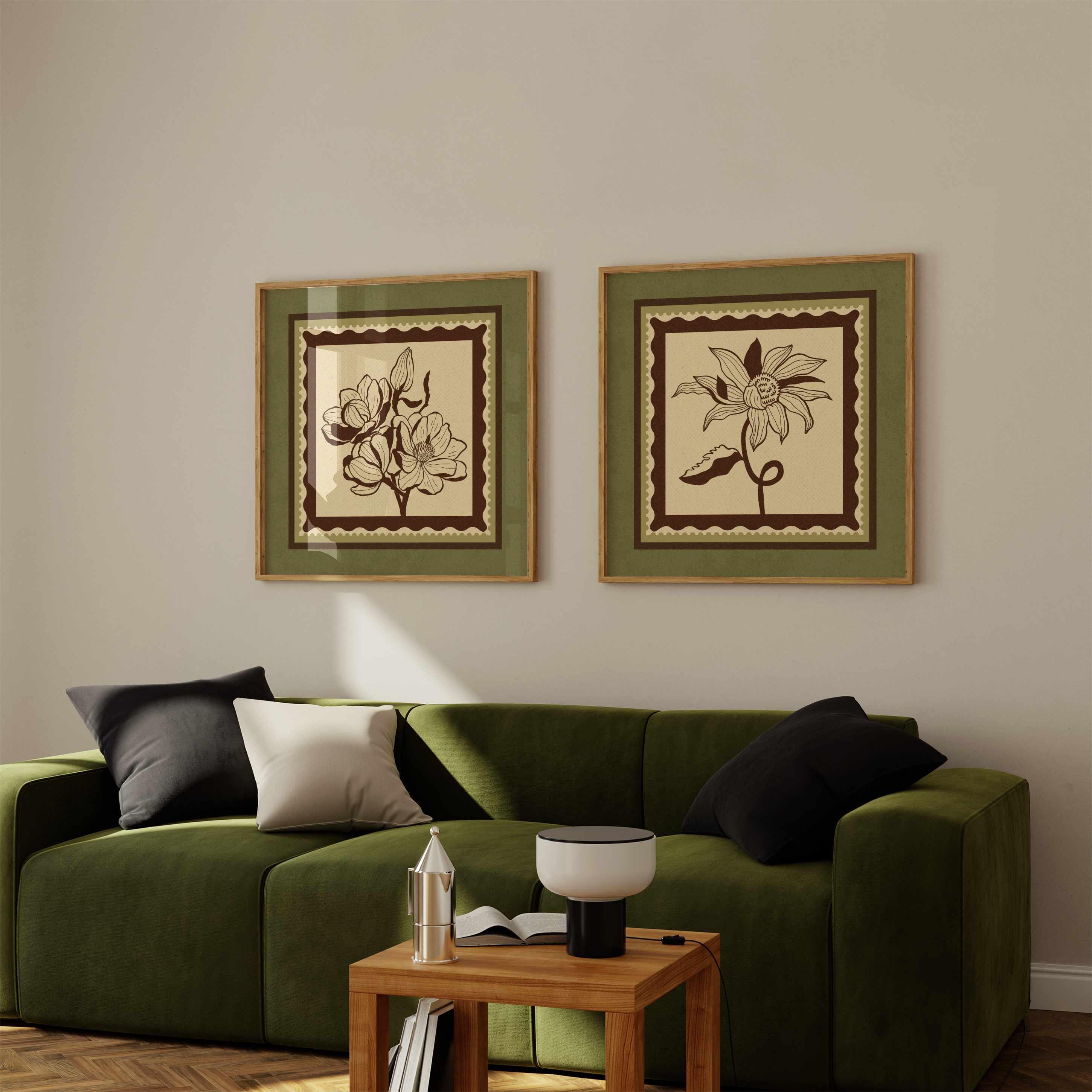 Set of two vintage botanical prints featuring delicate wildflowers inspired by retro design and nature’s quiet beauty. Designed in a stamp-style layout with earthy tones of warm mocha brown, light beige, and soft moss green, this set blends mid-century design, retro florals, and cottagecore aesthetics — making it the perfect addition to a gallery wall, reading nook, bedroom, or cozy kitchen.