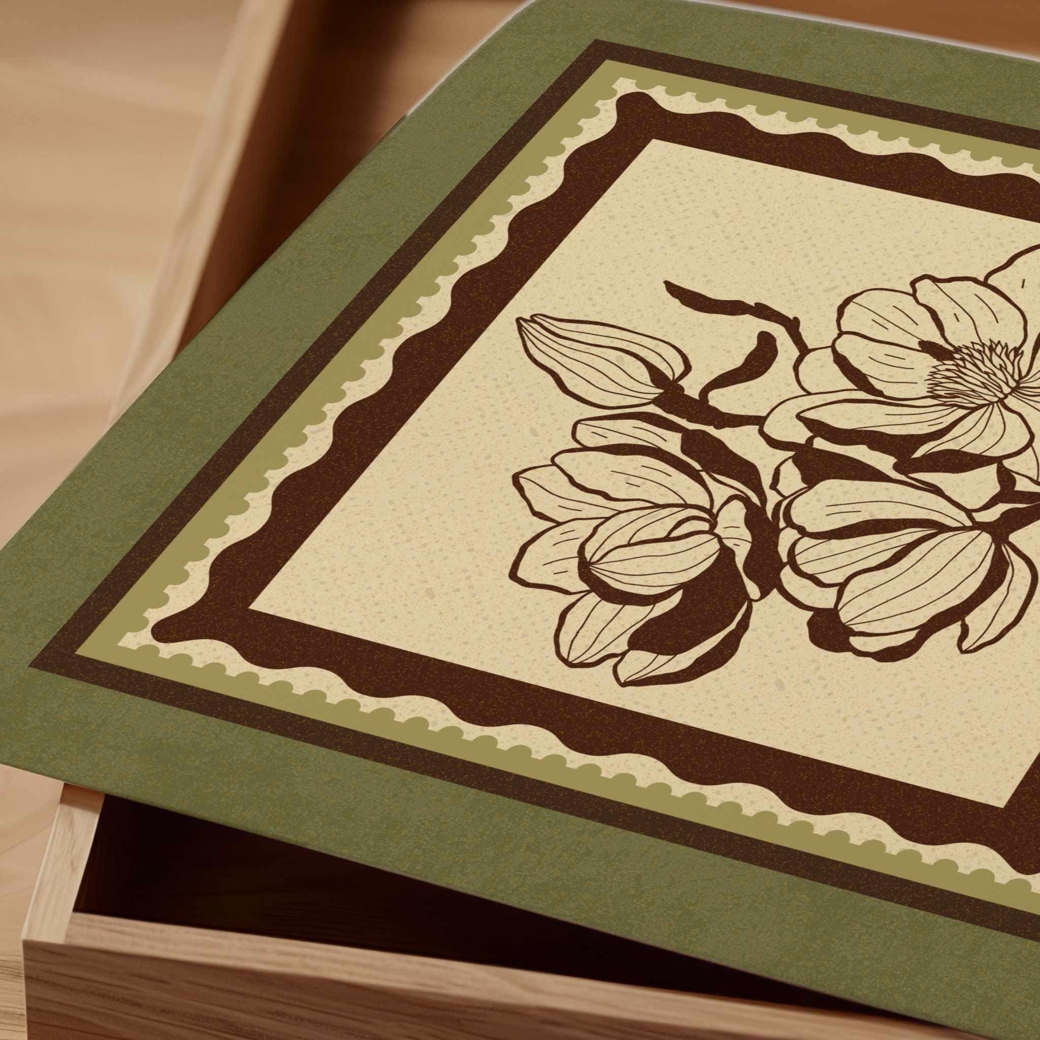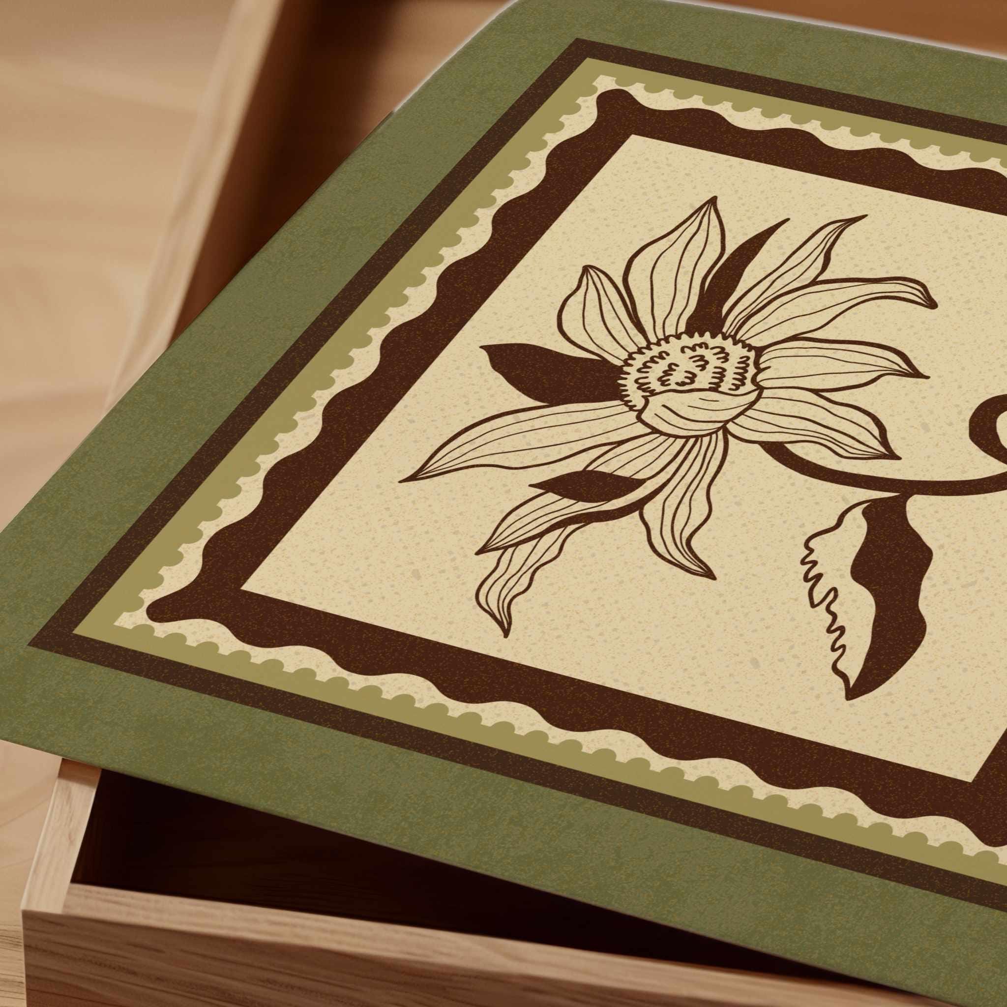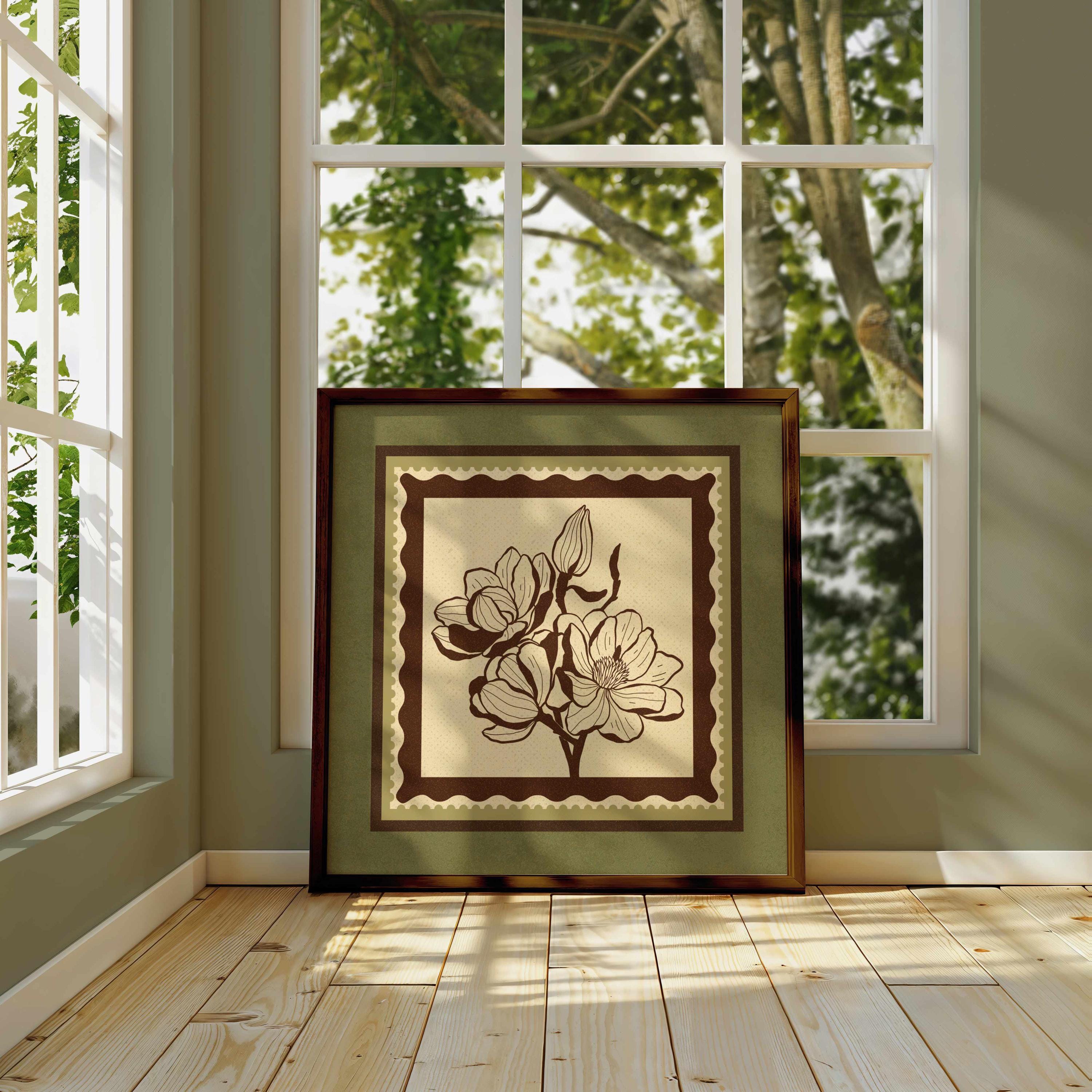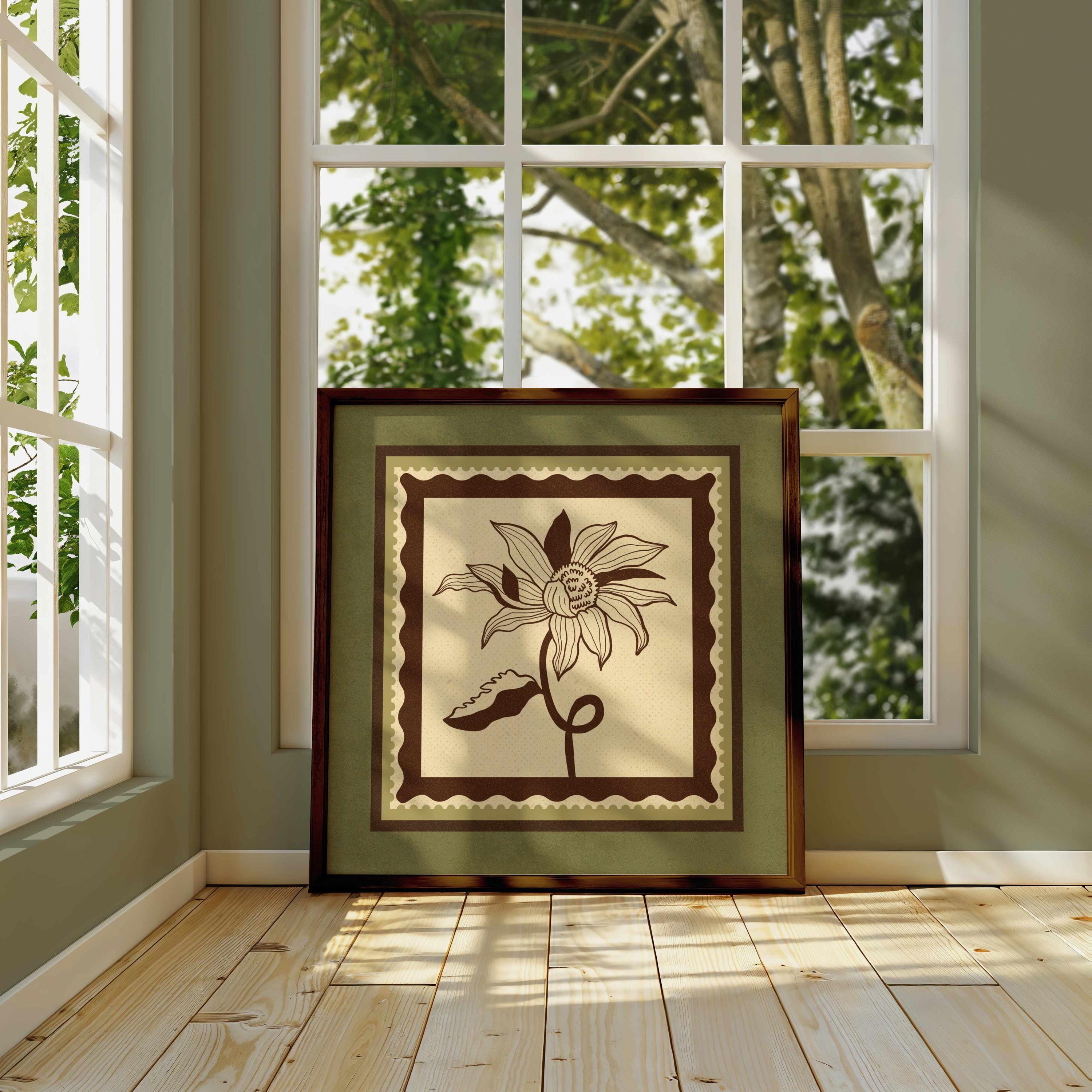 Set of two vintage botanical prints featuring delicate wildflowers inspired by retro design and nature’s quiet beauty. Designed in a stamp-style layout with earthy tones of warm mocha brown, light beige, and soft moss green, this set blends mid-century design, retro florals, and cottagecore aesthetics — making it the perfect addition to a gallery wall, reading nook, bedroom, or cozy kitchen.