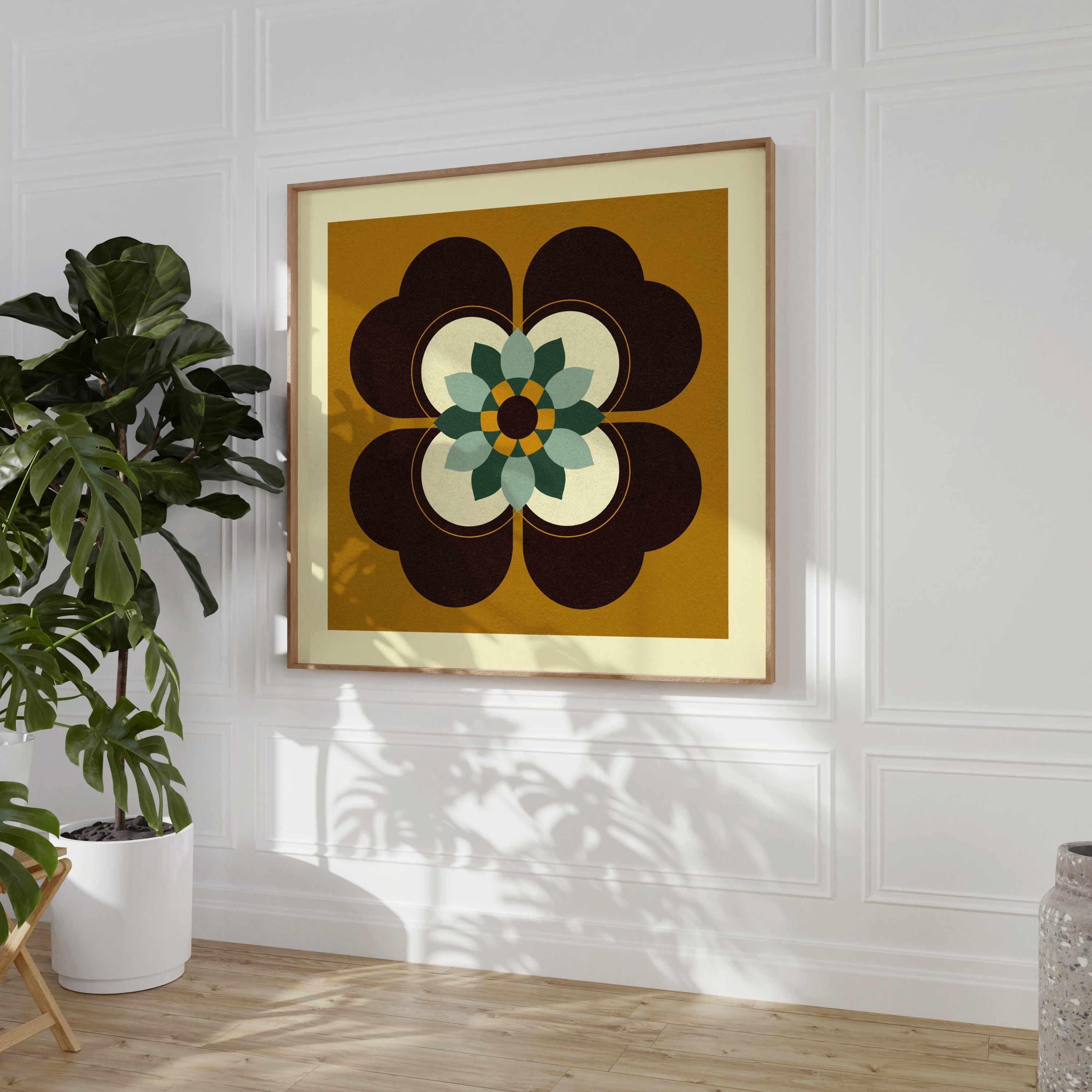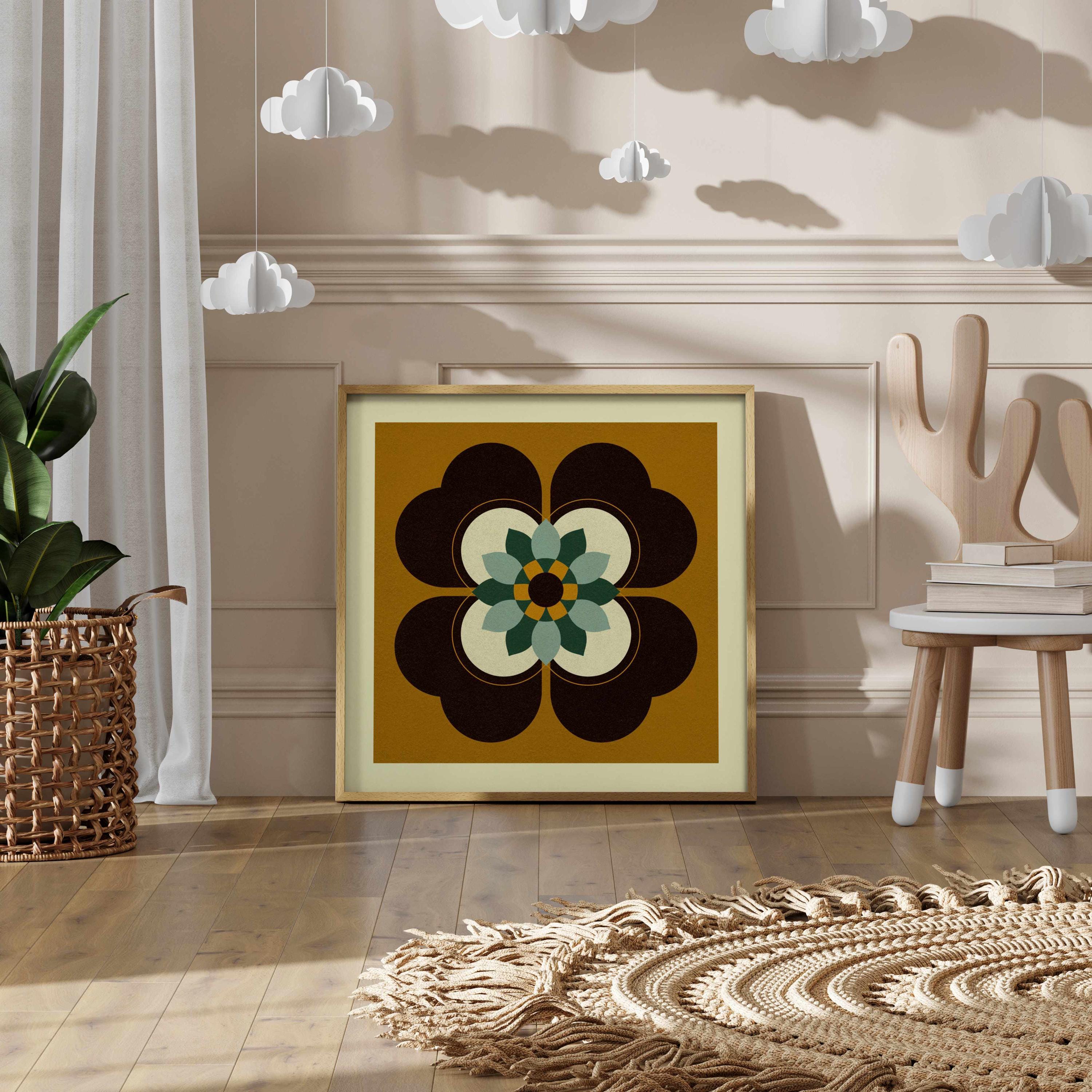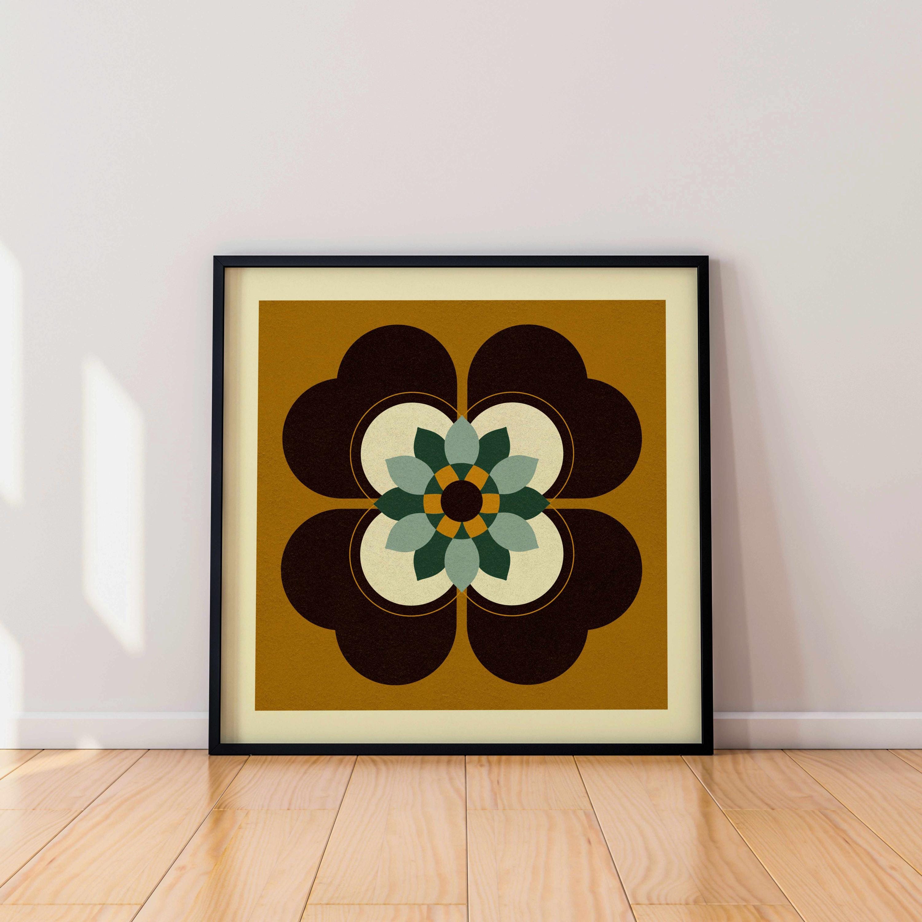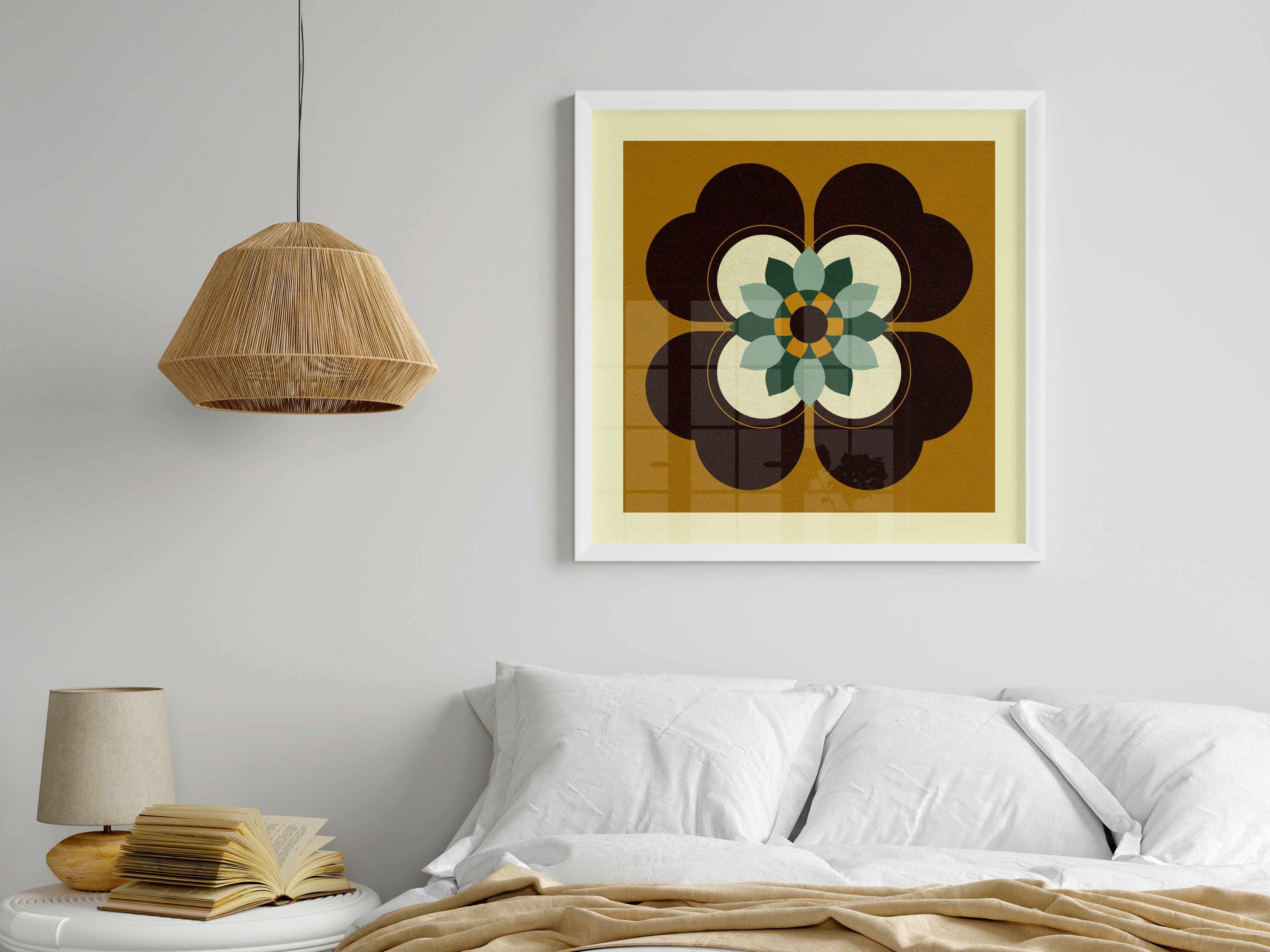 Groovy 70s flower print in a retro color palette of dark brown, warm ochre, emerald green and soft cream. This geometric floral print is perfect for enhancing up any mid century, retro or boho space, be it your living room, bedroom, office, or anywhere else.