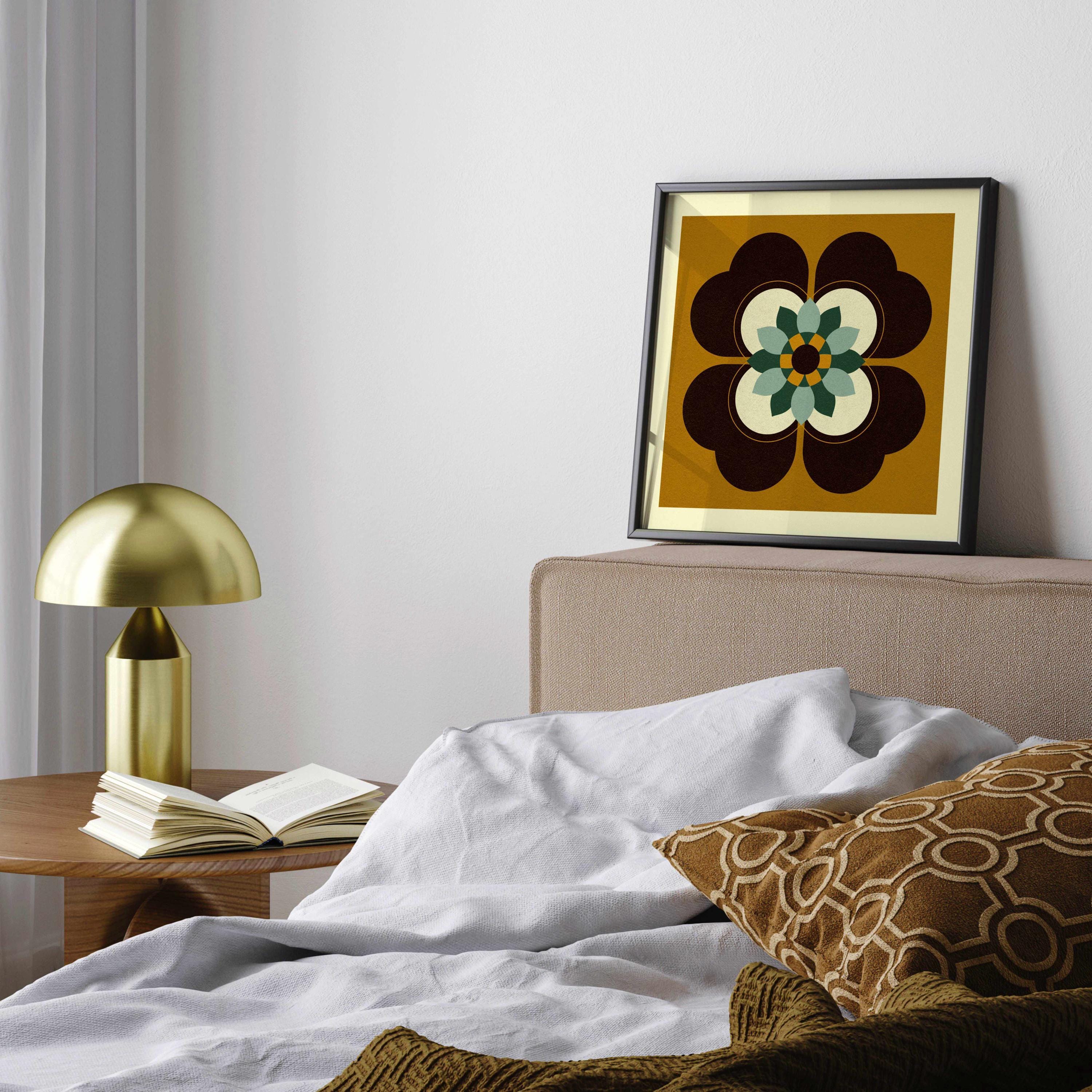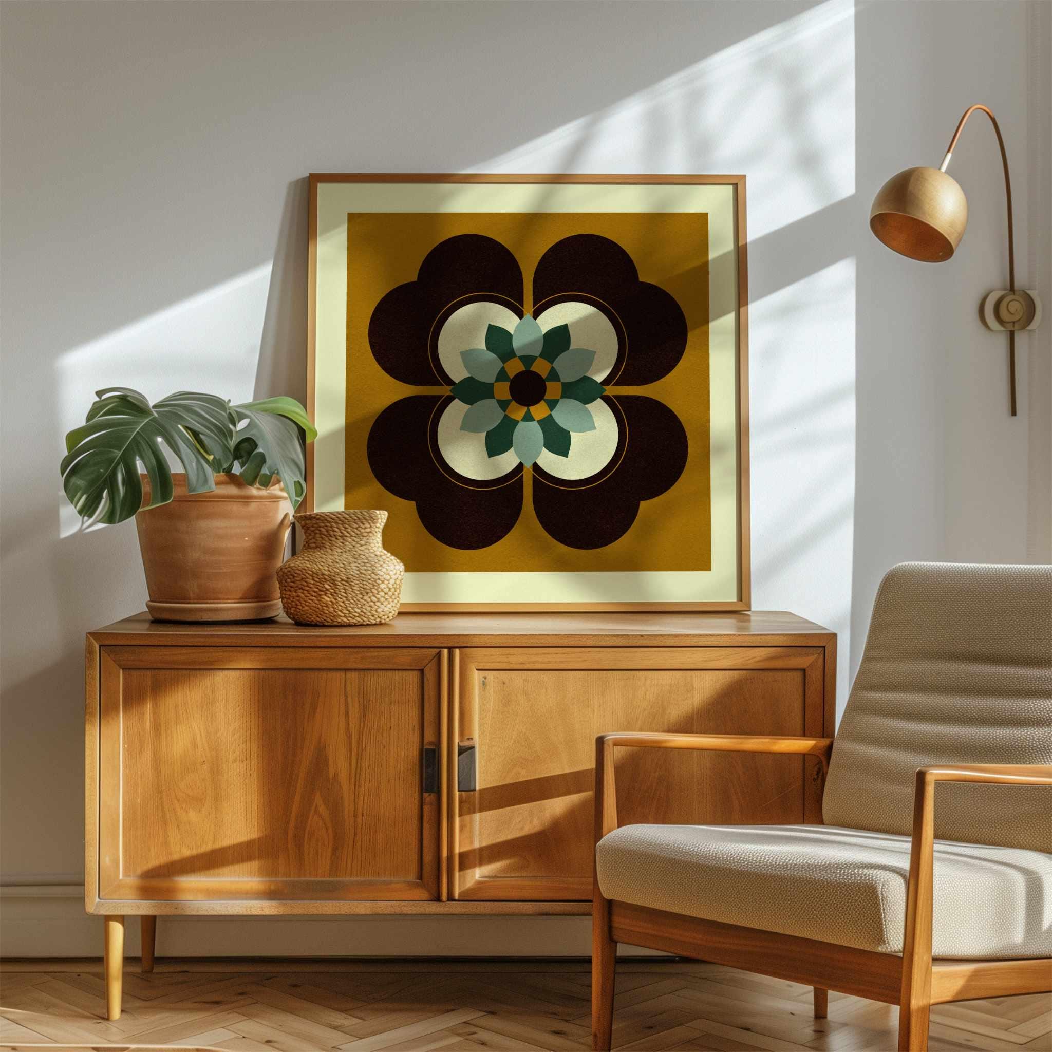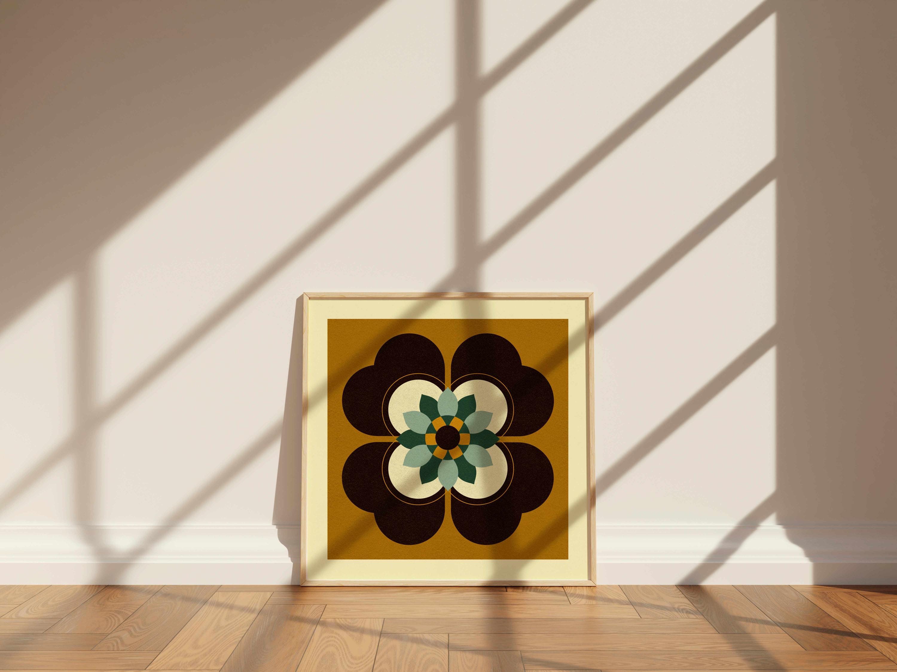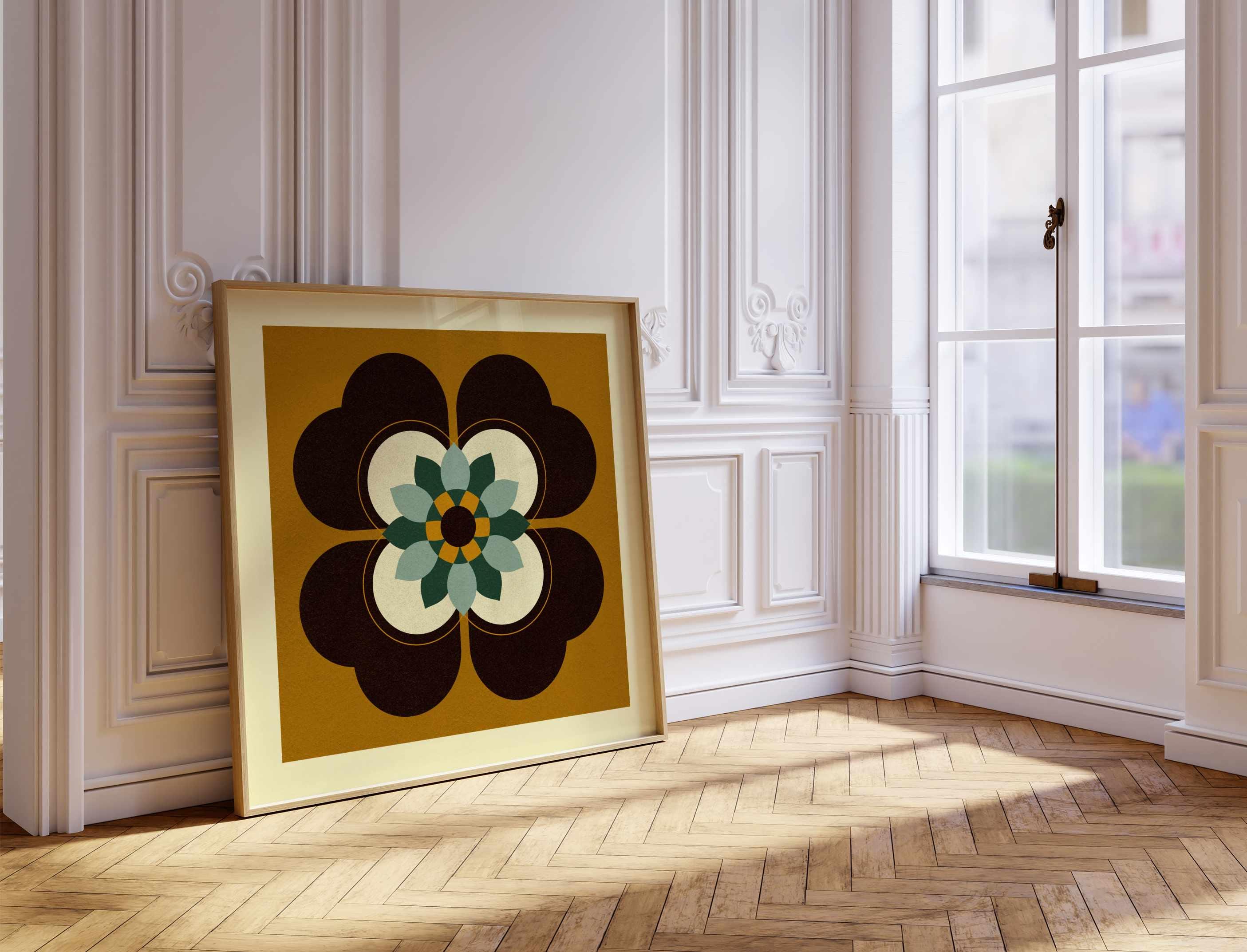 Groovy 70s flower print in a retro color palette of dark brown, warm ochre, emerald green and soft cream. This geometric floral print is perfect for enhancing up any mid century, retro or boho space, be it your living room, bedroom, office, or anywhere else.