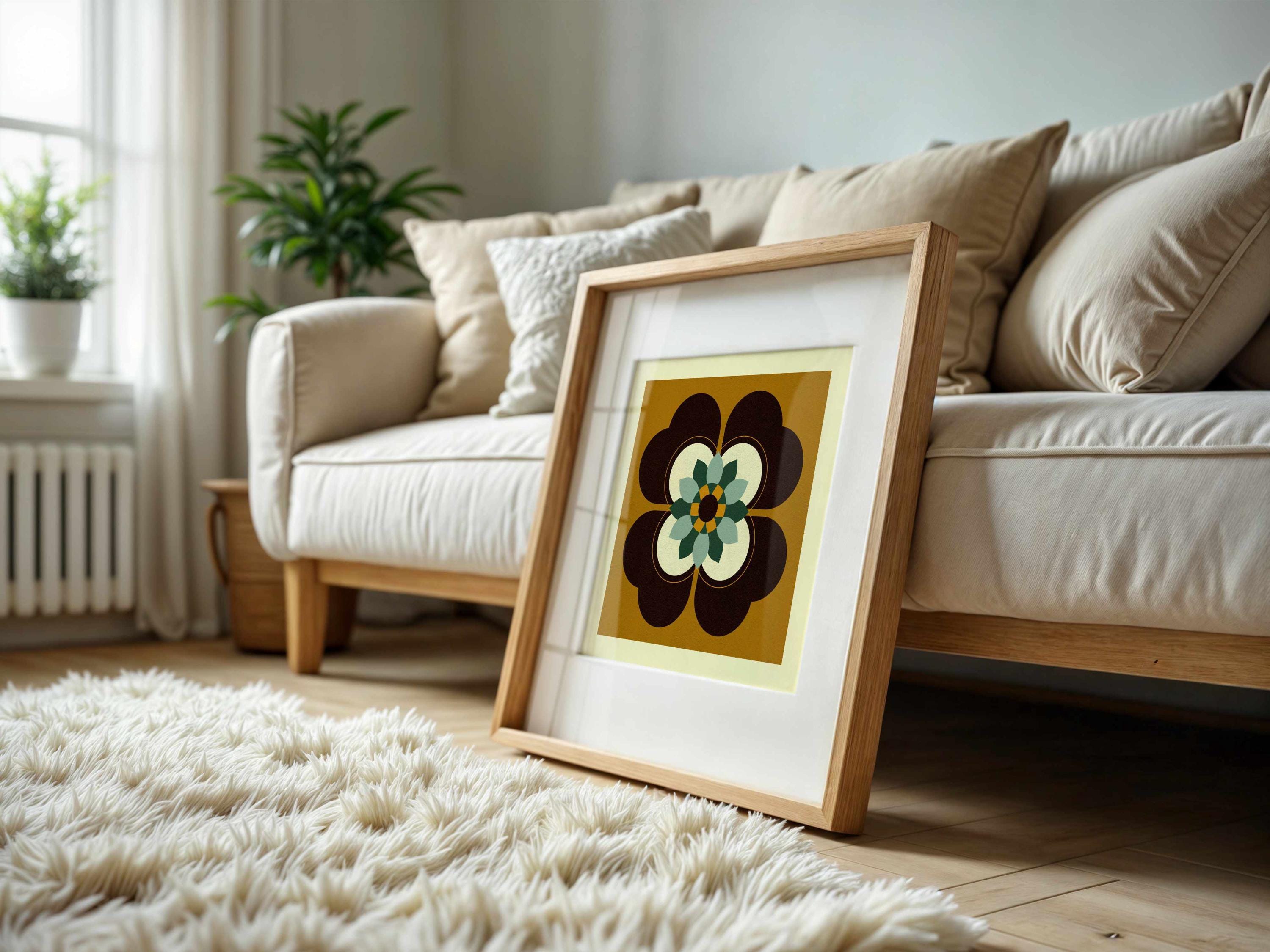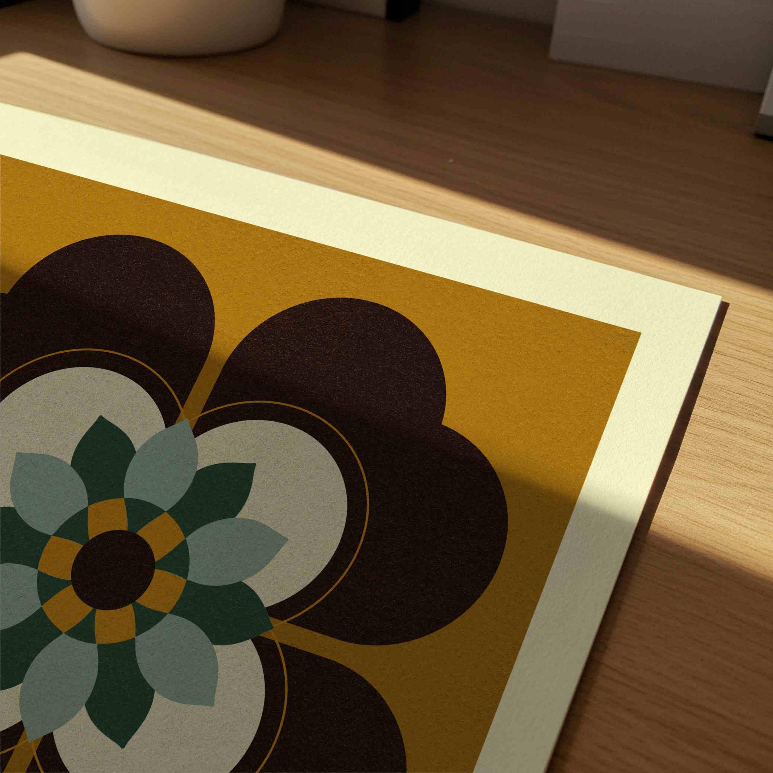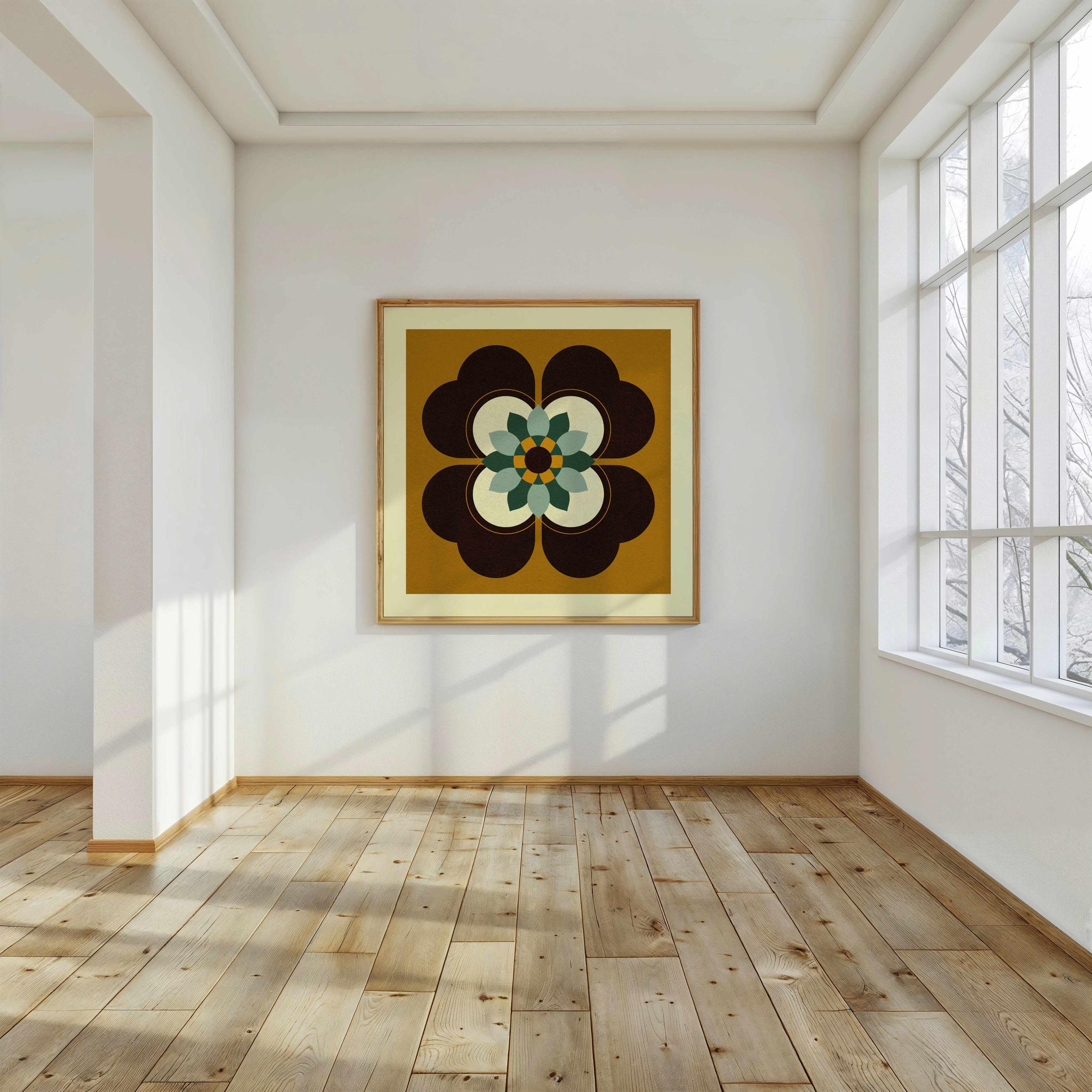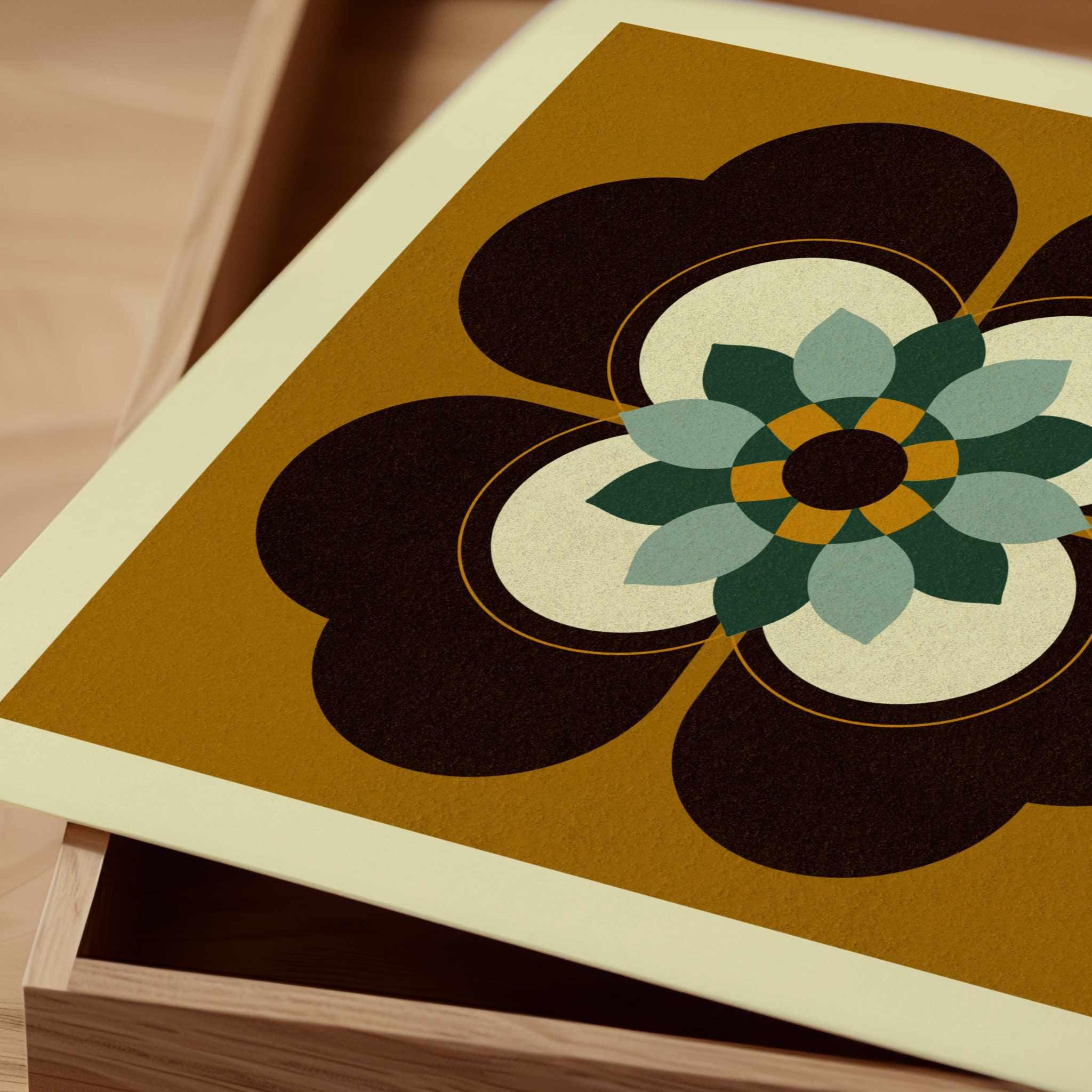 Groovy 70s flower print in a retro color palette of dark brown, warm ochre, emerald green and soft cream. This geometric floral print is perfect for enhancing up any mid century, retro or boho space, be it your living room, bedroom, office, or anywhere else.