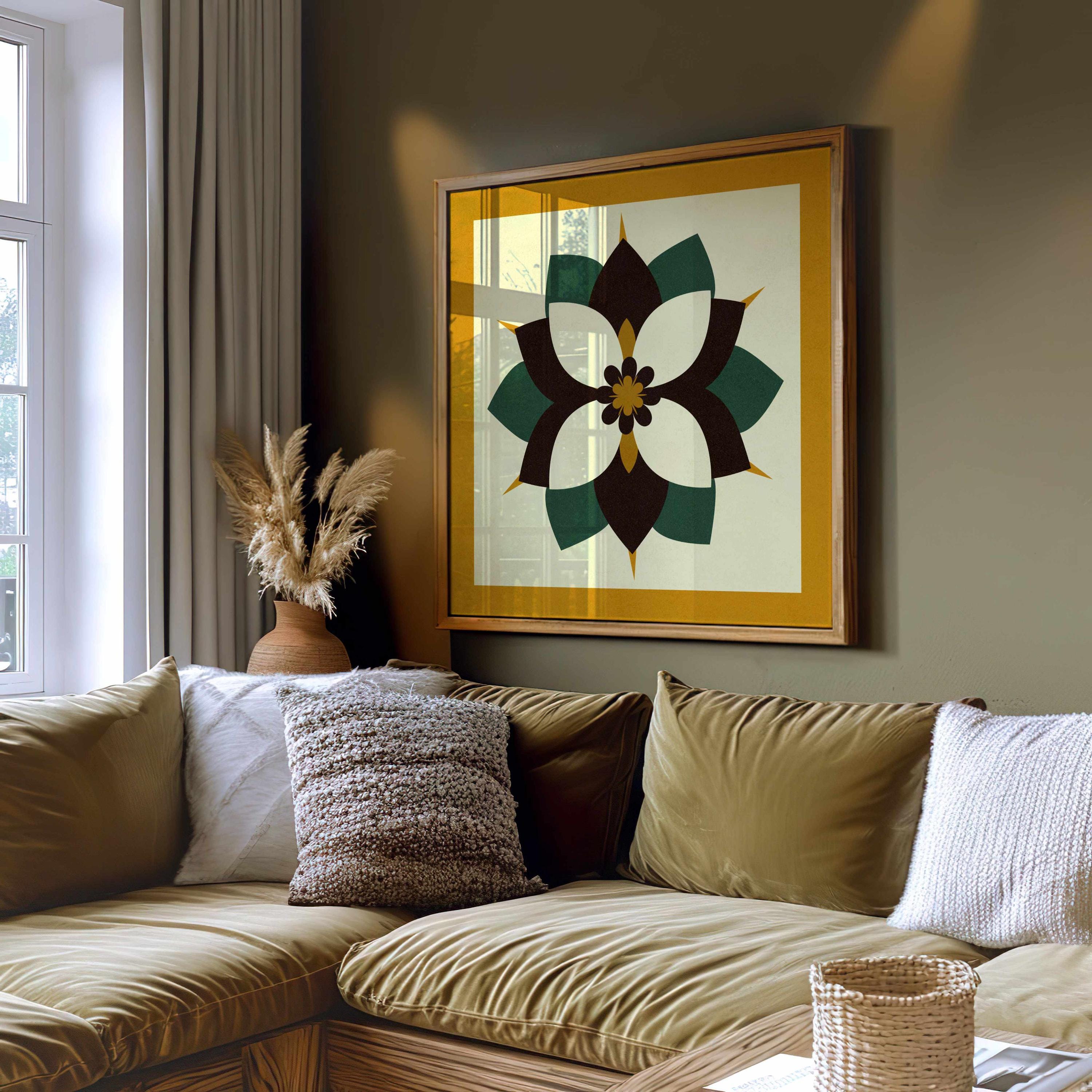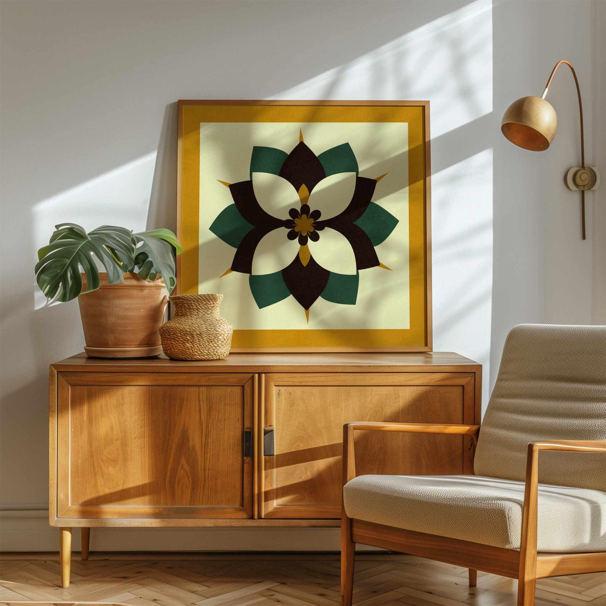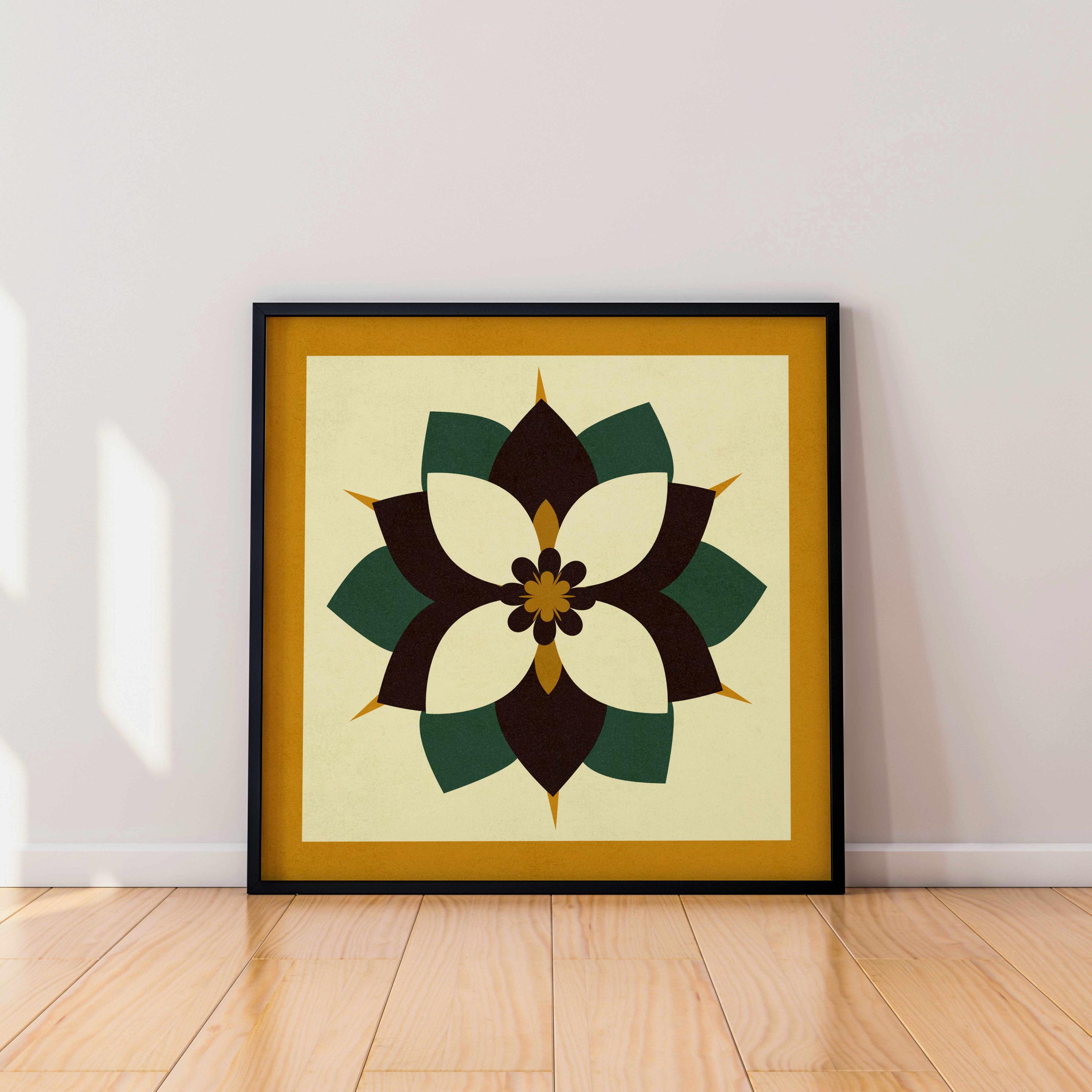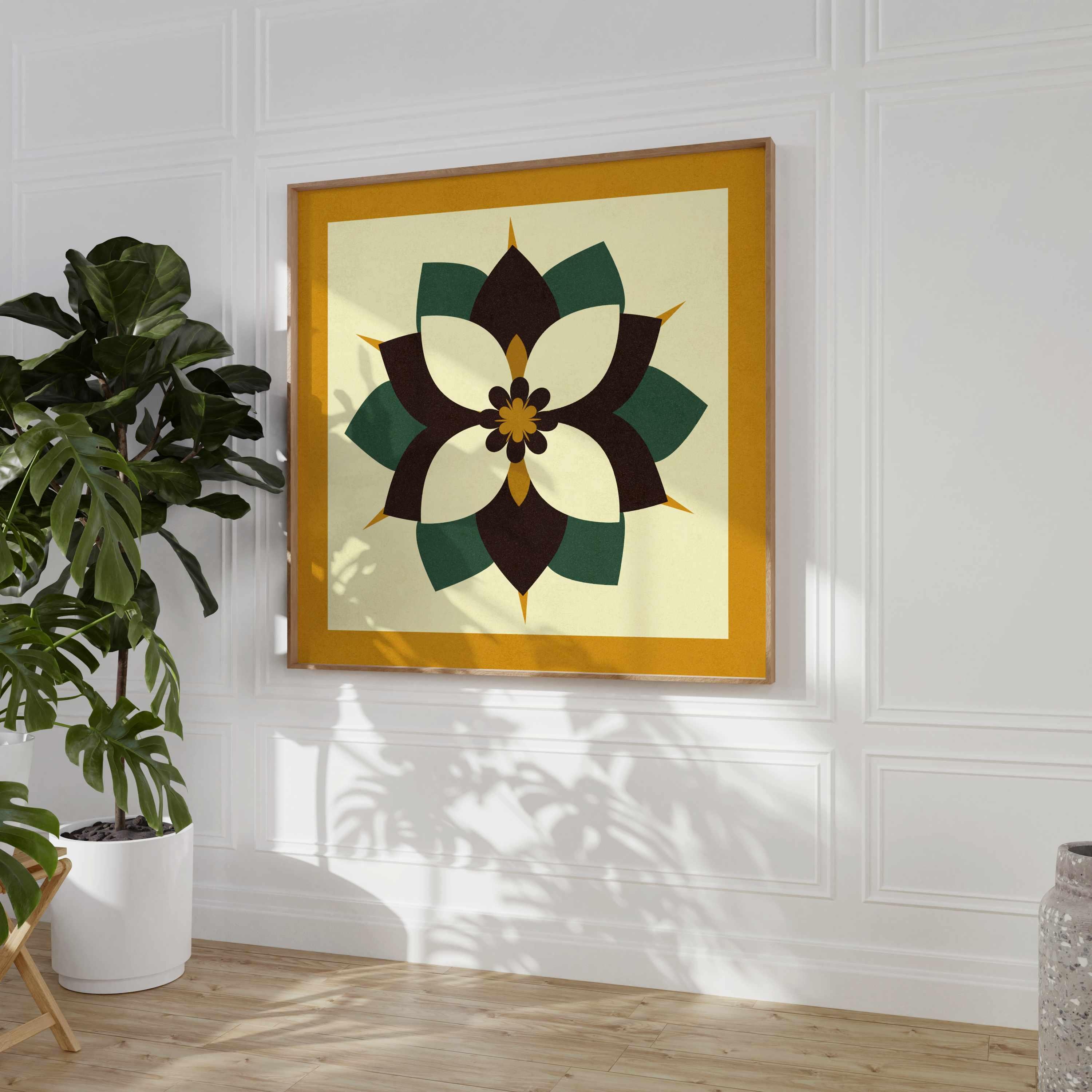 Groovy 70s flower print in a retro color palette of dark brown, warm ochre, emerald green and soft cream. This geometric floral print is perfect for enhancing up any mid century, retro or boho space, be it your living room, bedroom, office, or anywhere else.