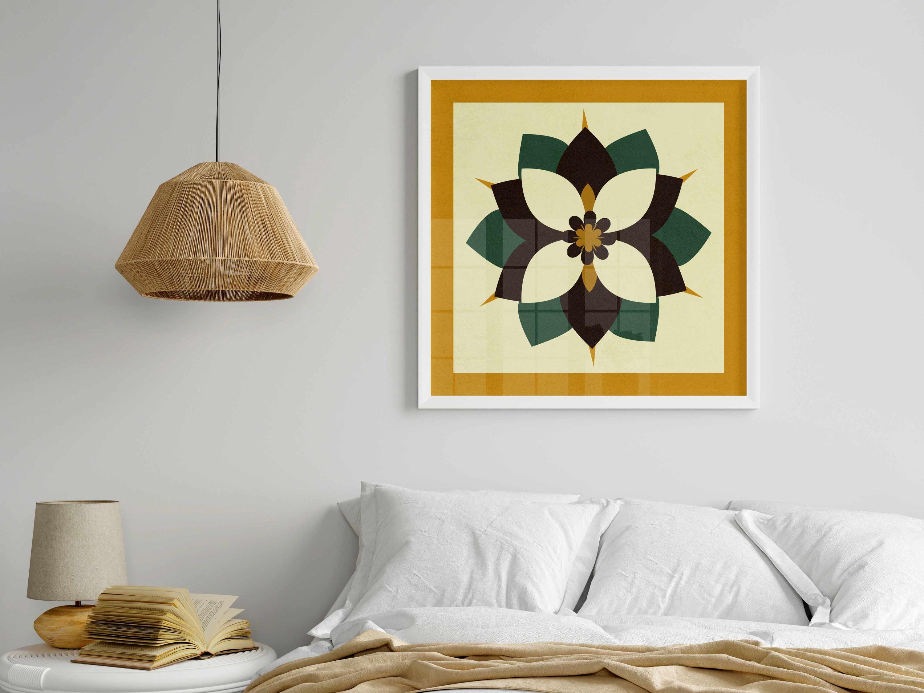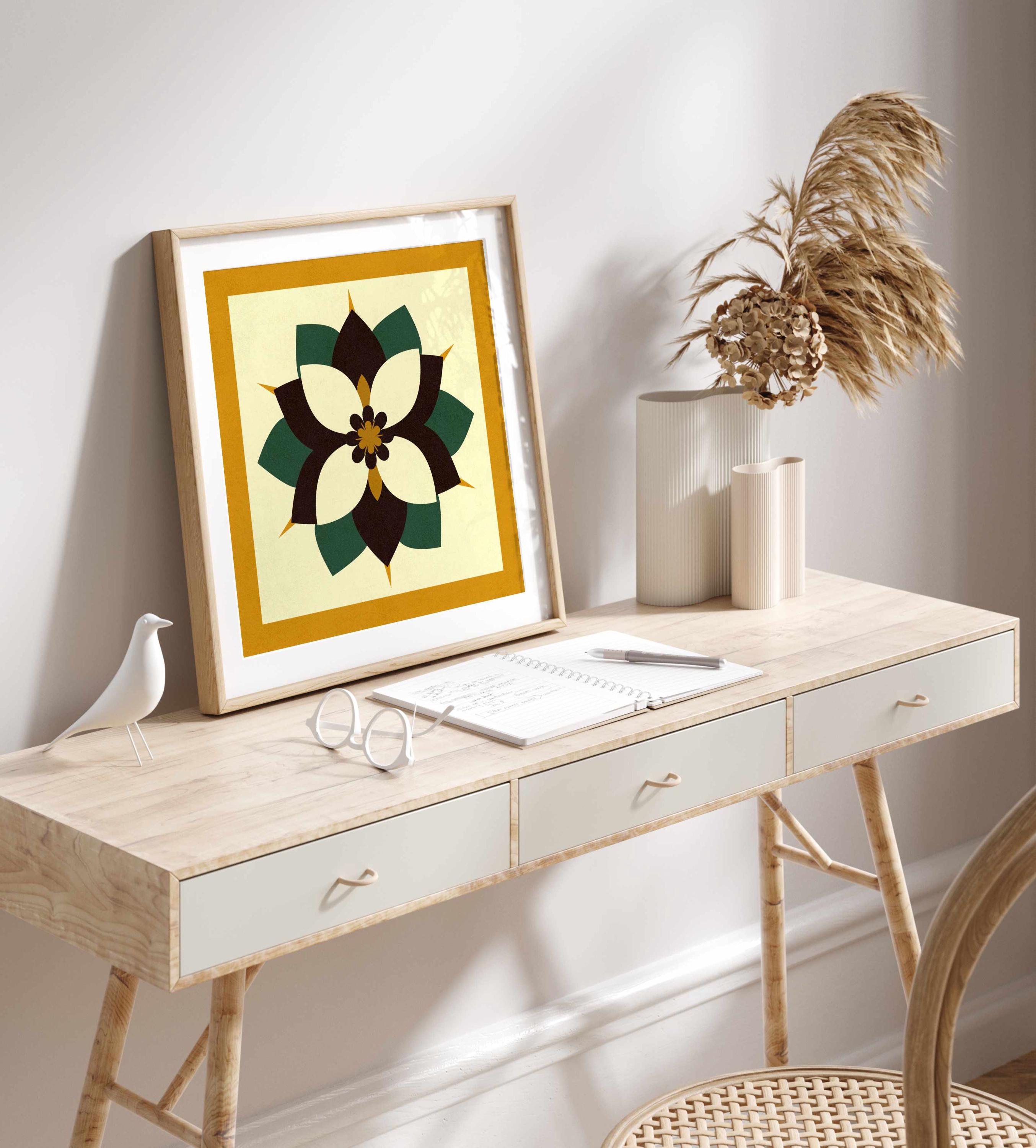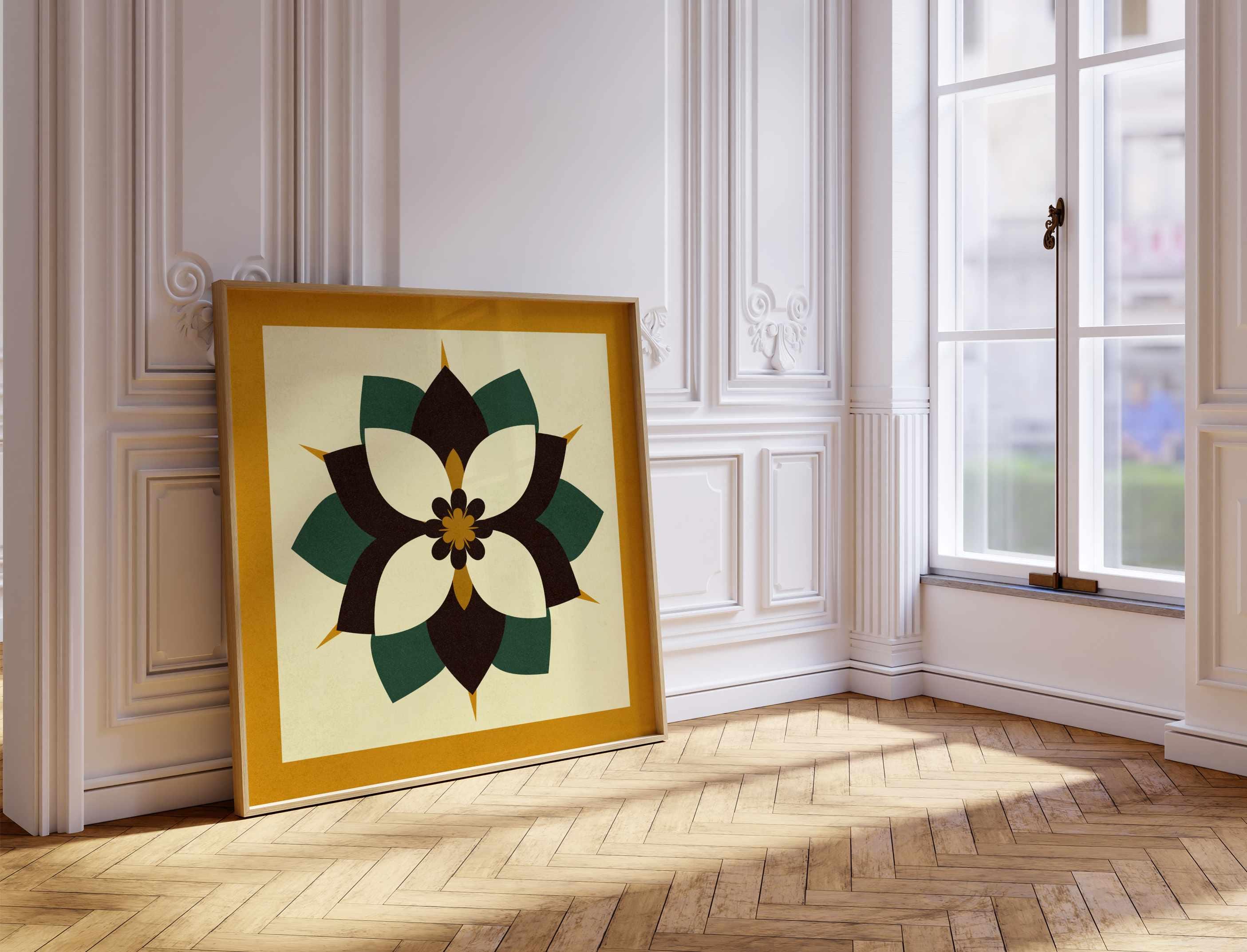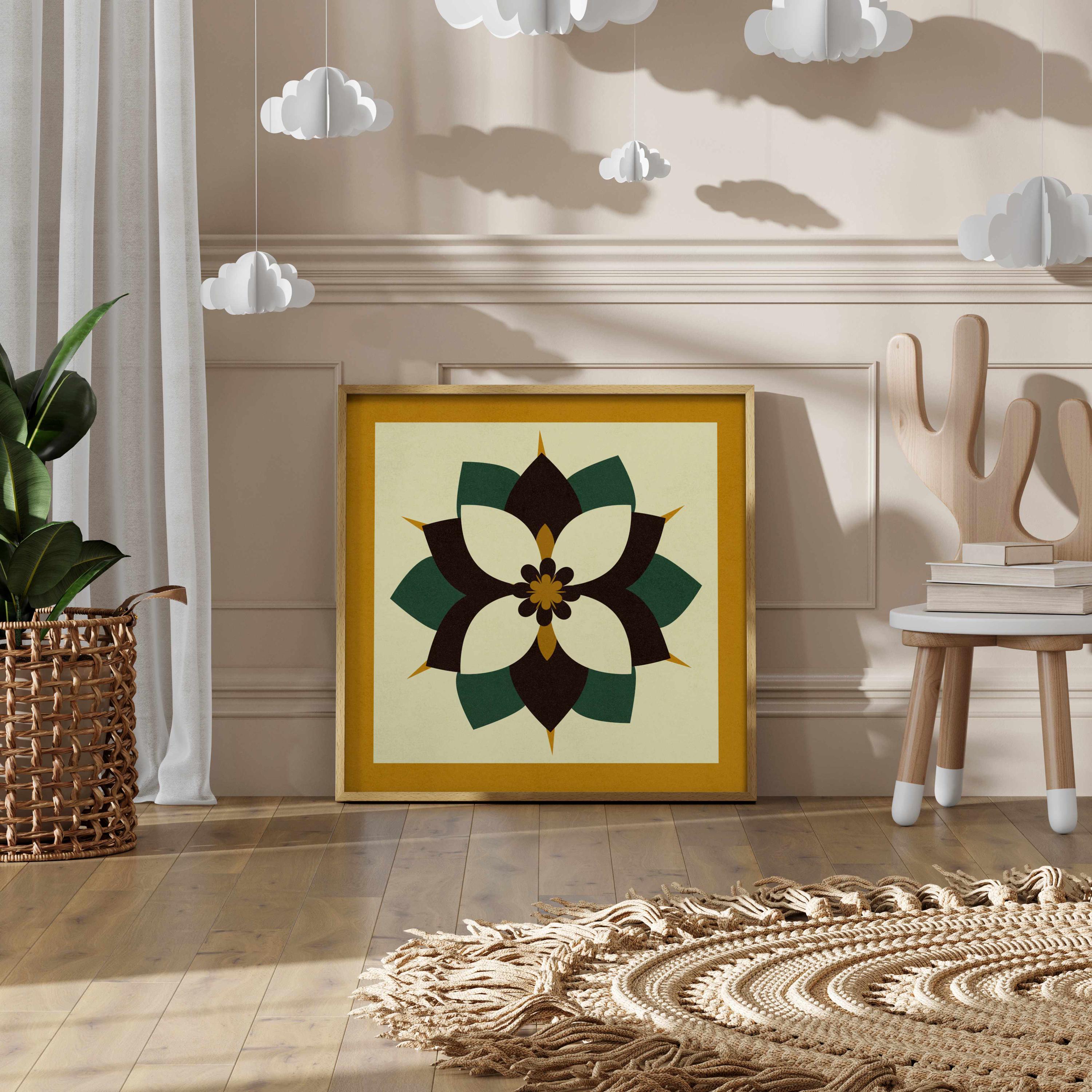 Groovy 70s flower print in a retro color palette of dark brown, warm ochre, emerald green and soft cream. This geometric floral print is perfect for enhancing up any mid century, retro or boho space, be it your living room, bedroom, office, or anywhere else.