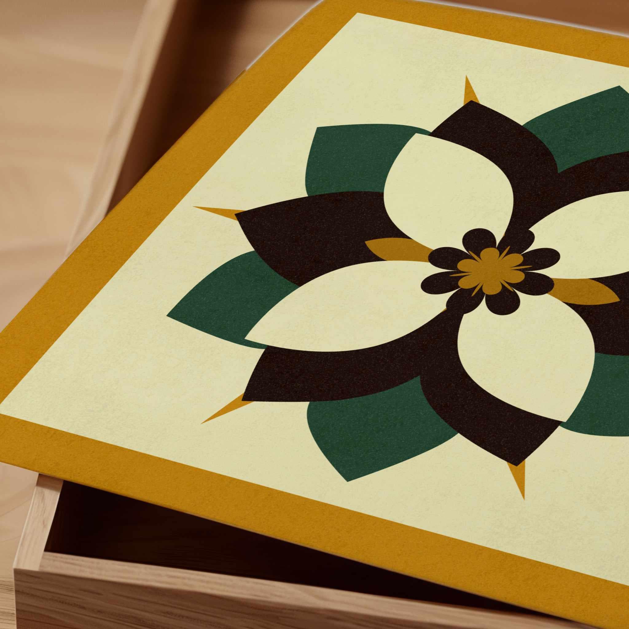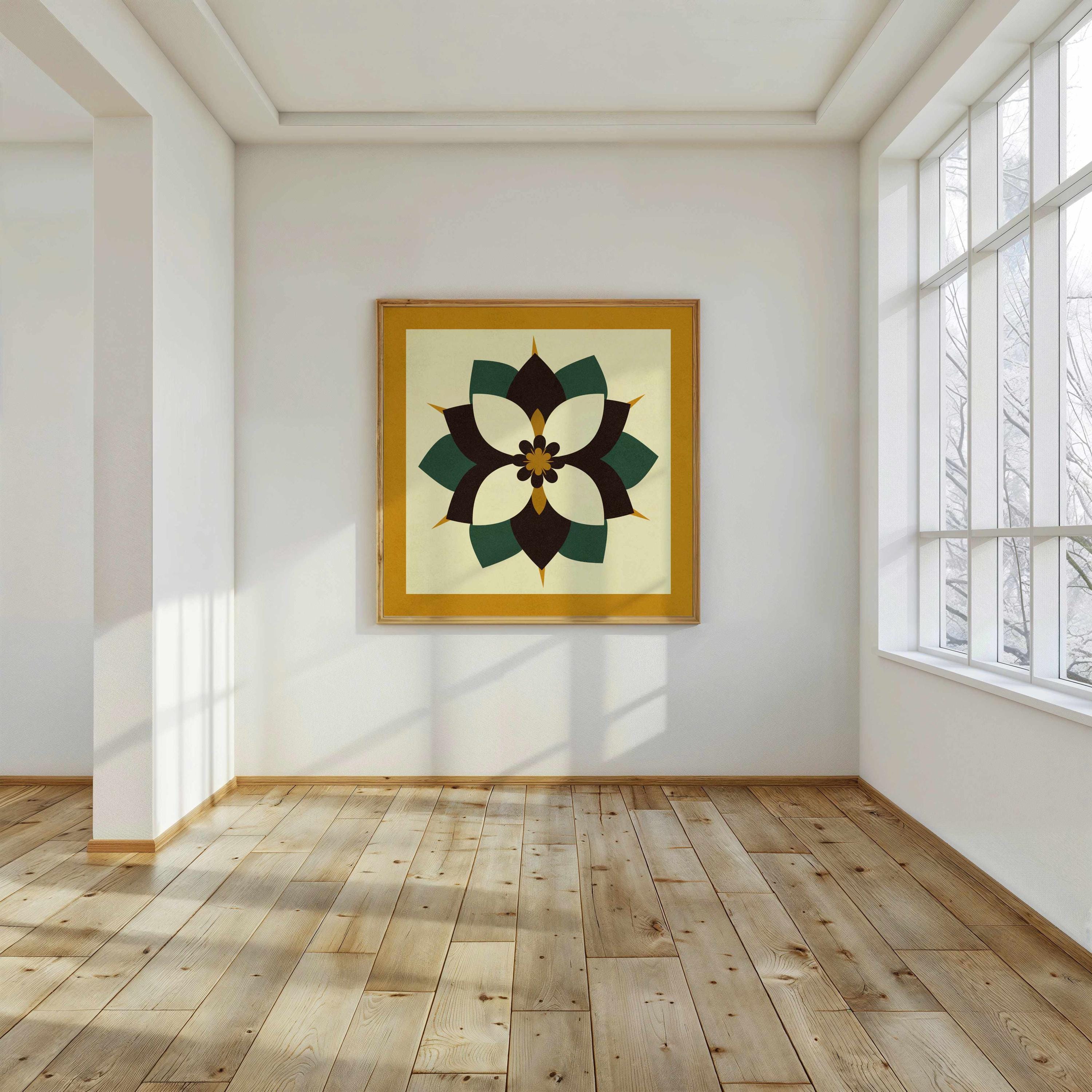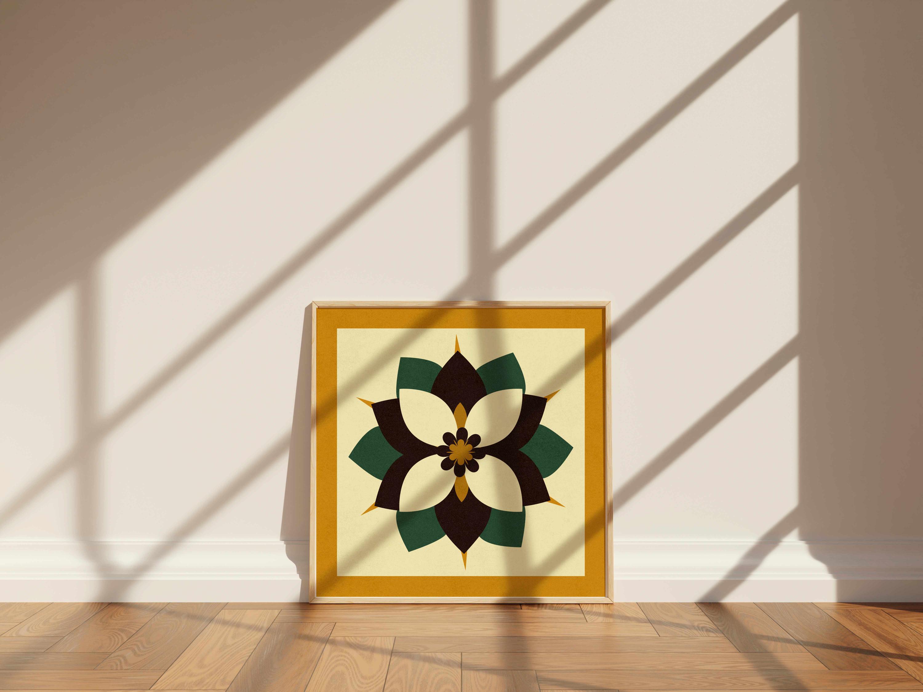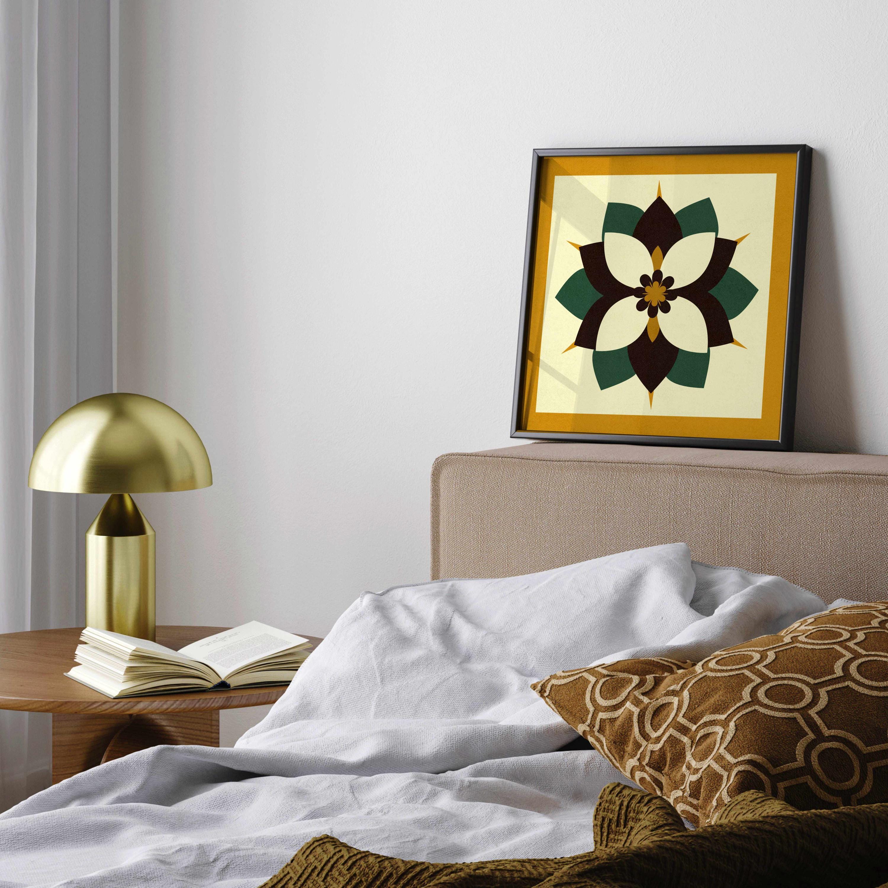 Groovy 70s flower print in a retro color palette of dark brown, warm ochre, emerald green and soft cream. This geometric floral print is perfect for enhancing up any mid century, retro or boho space, be it your living room, bedroom, office, or anywhere else.