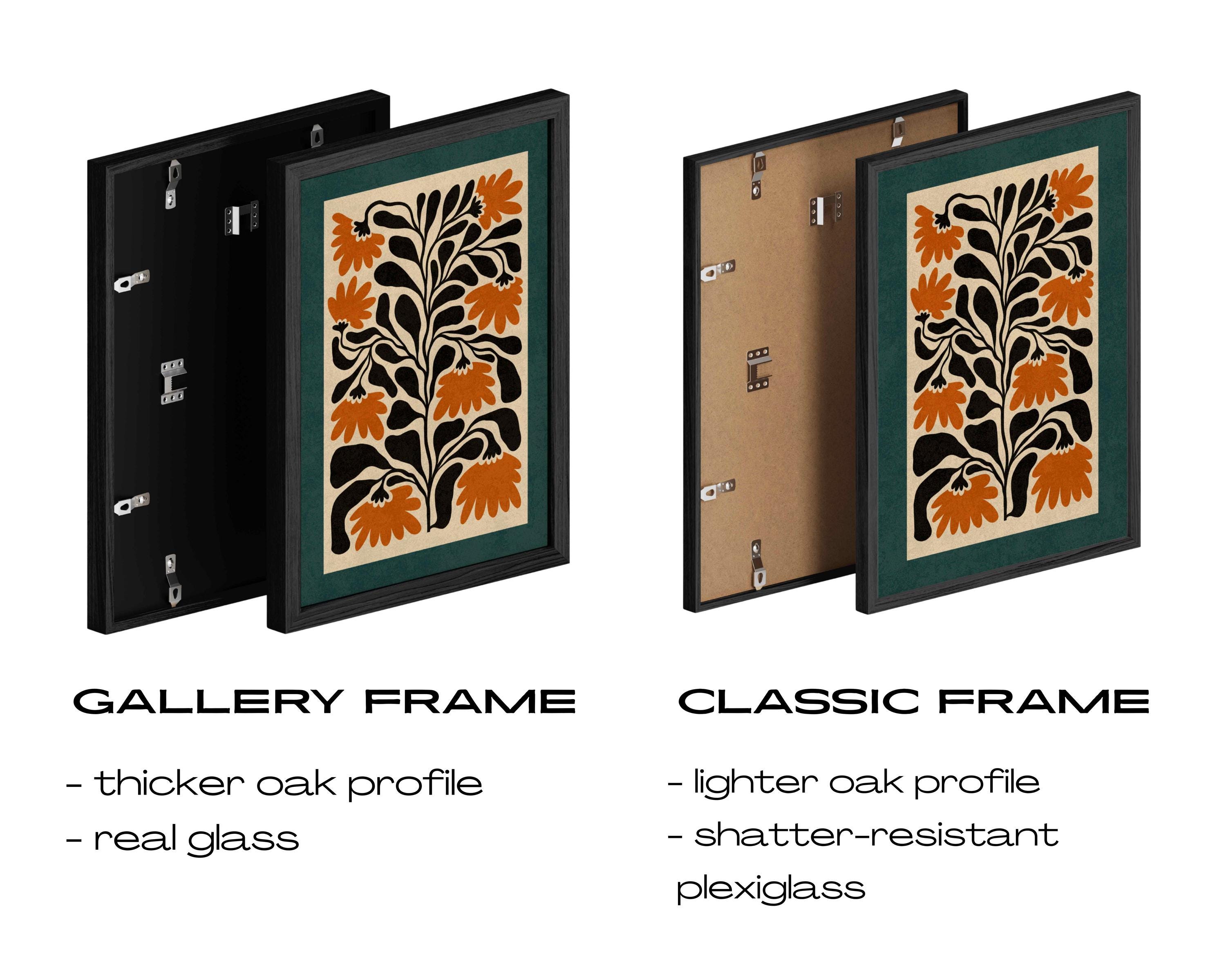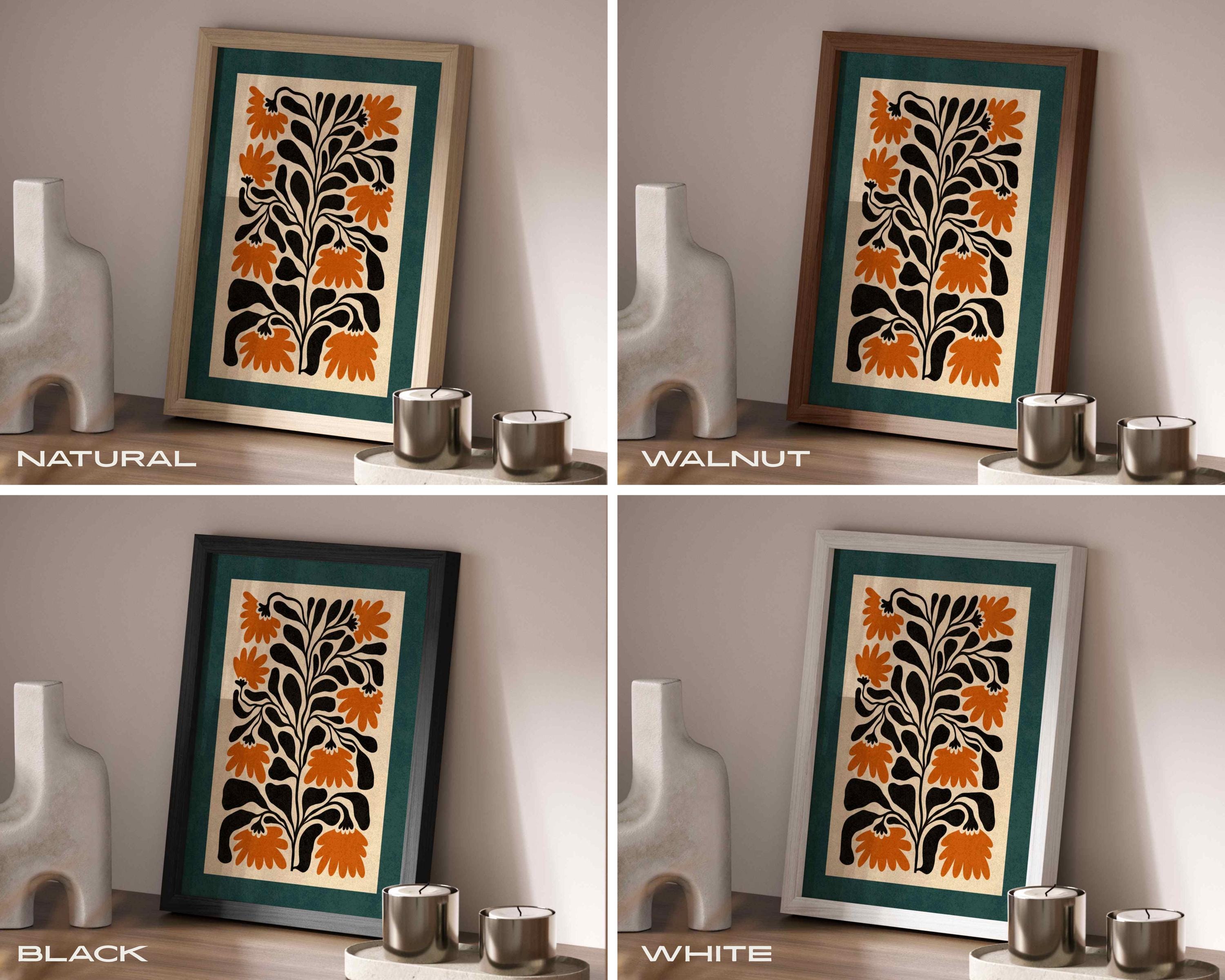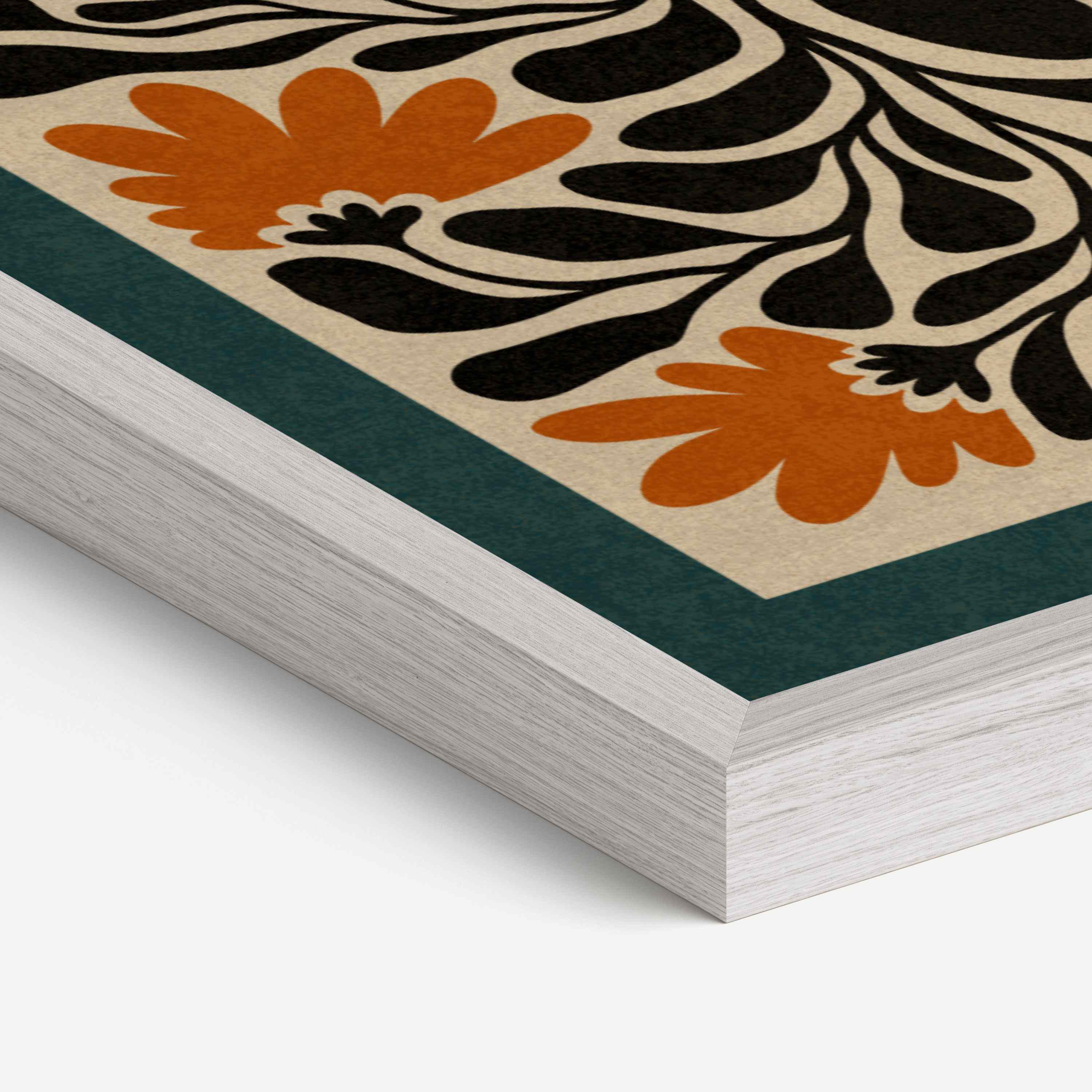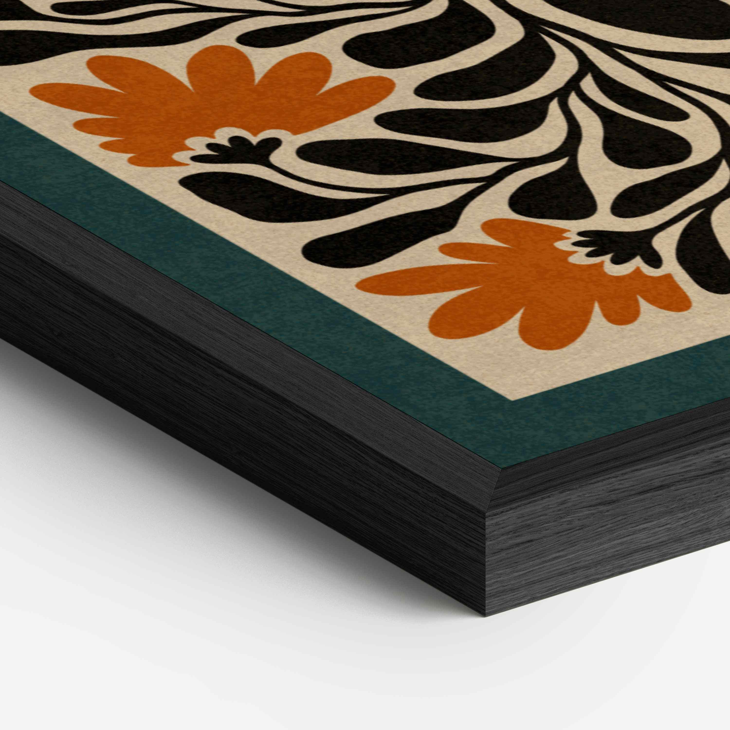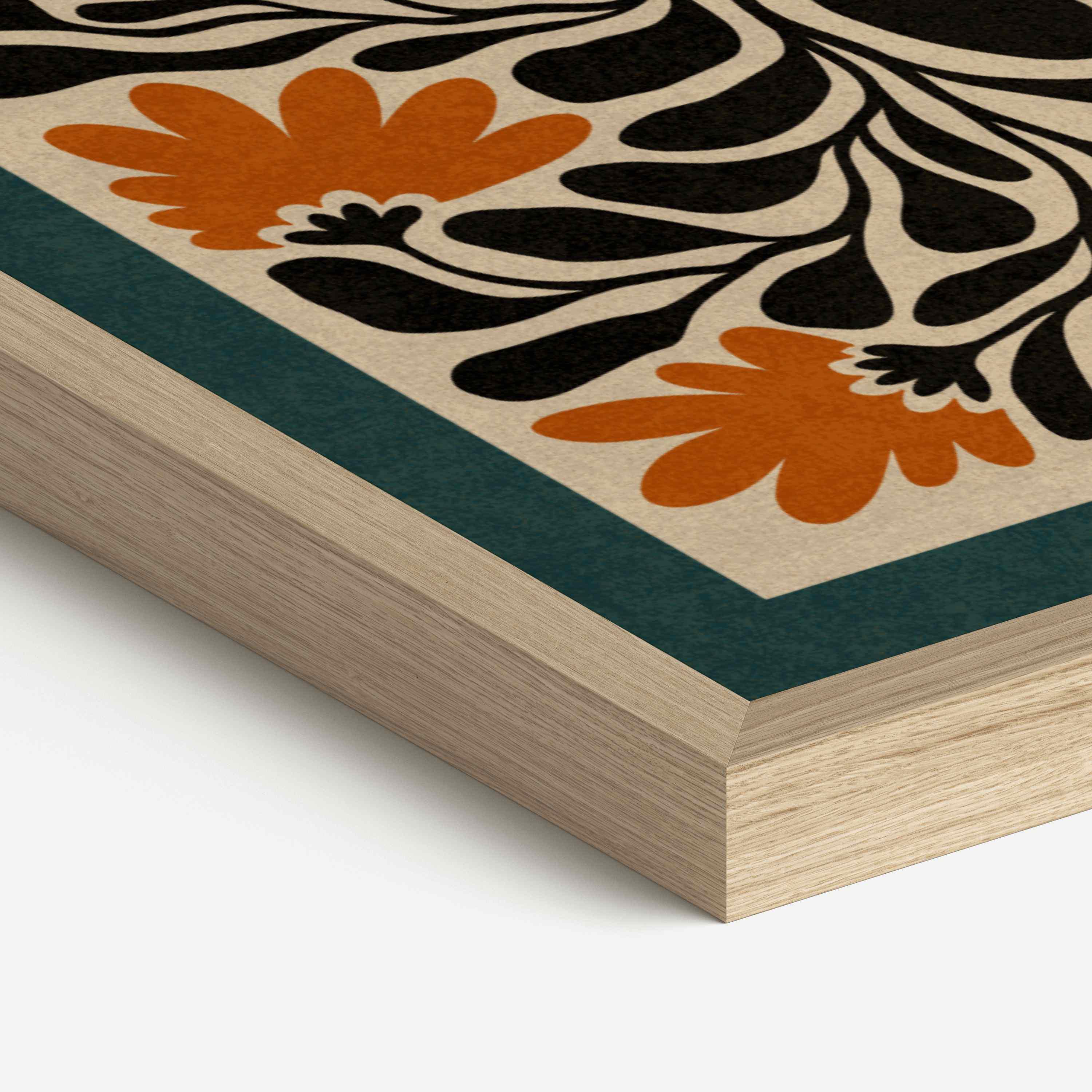 Framed retro floral print featuring an abstract Matisse-style botanical design in rich burnt orange, deep teal, warm cream and charcoal black.