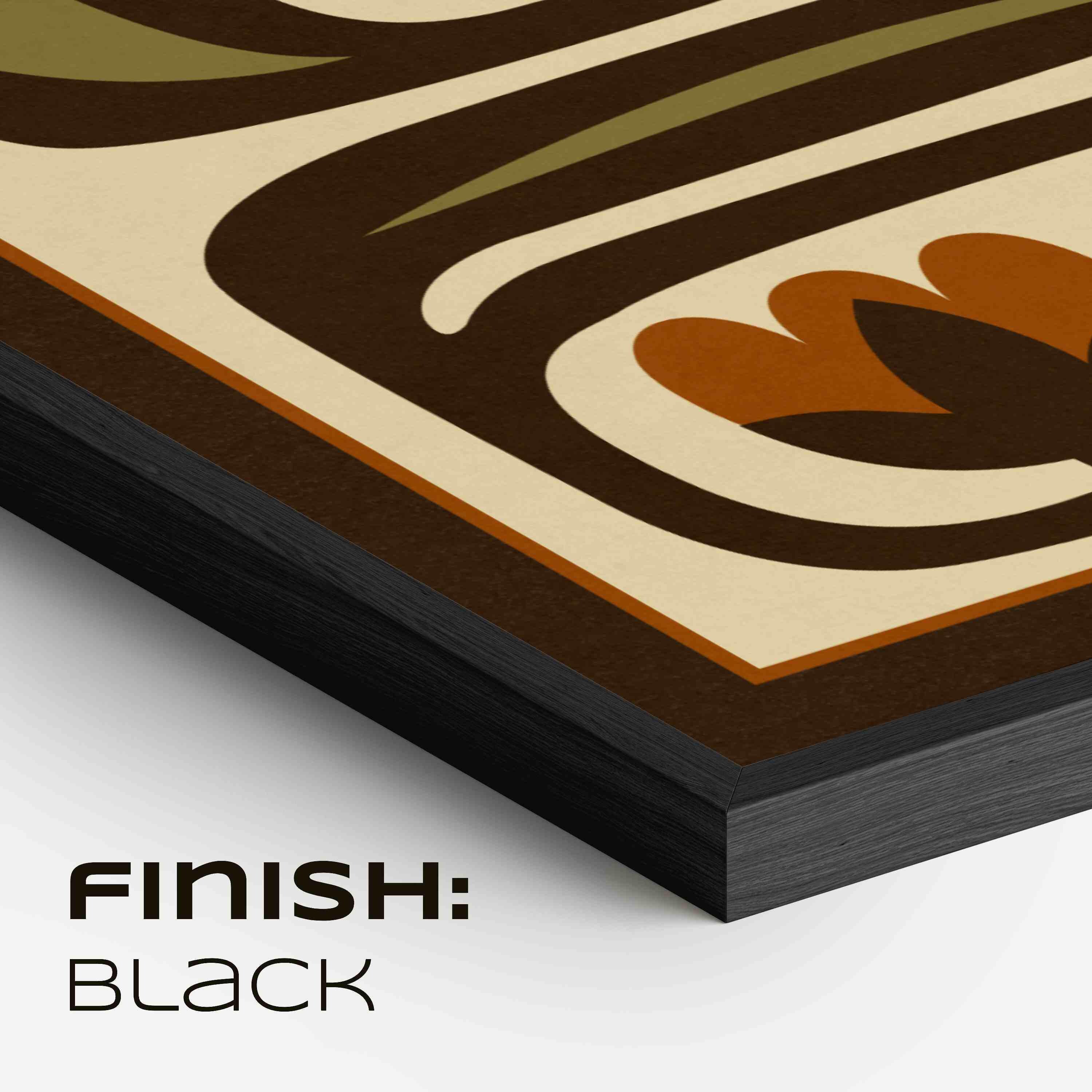 Framed abstract retro floral prints inspired by Matisse botanical shapes and vintage mid-century design. This earthy flower duo features rust orange blooms, dark brown leaves and olive green details layered over a cream background, and finished off with a deep brown border.