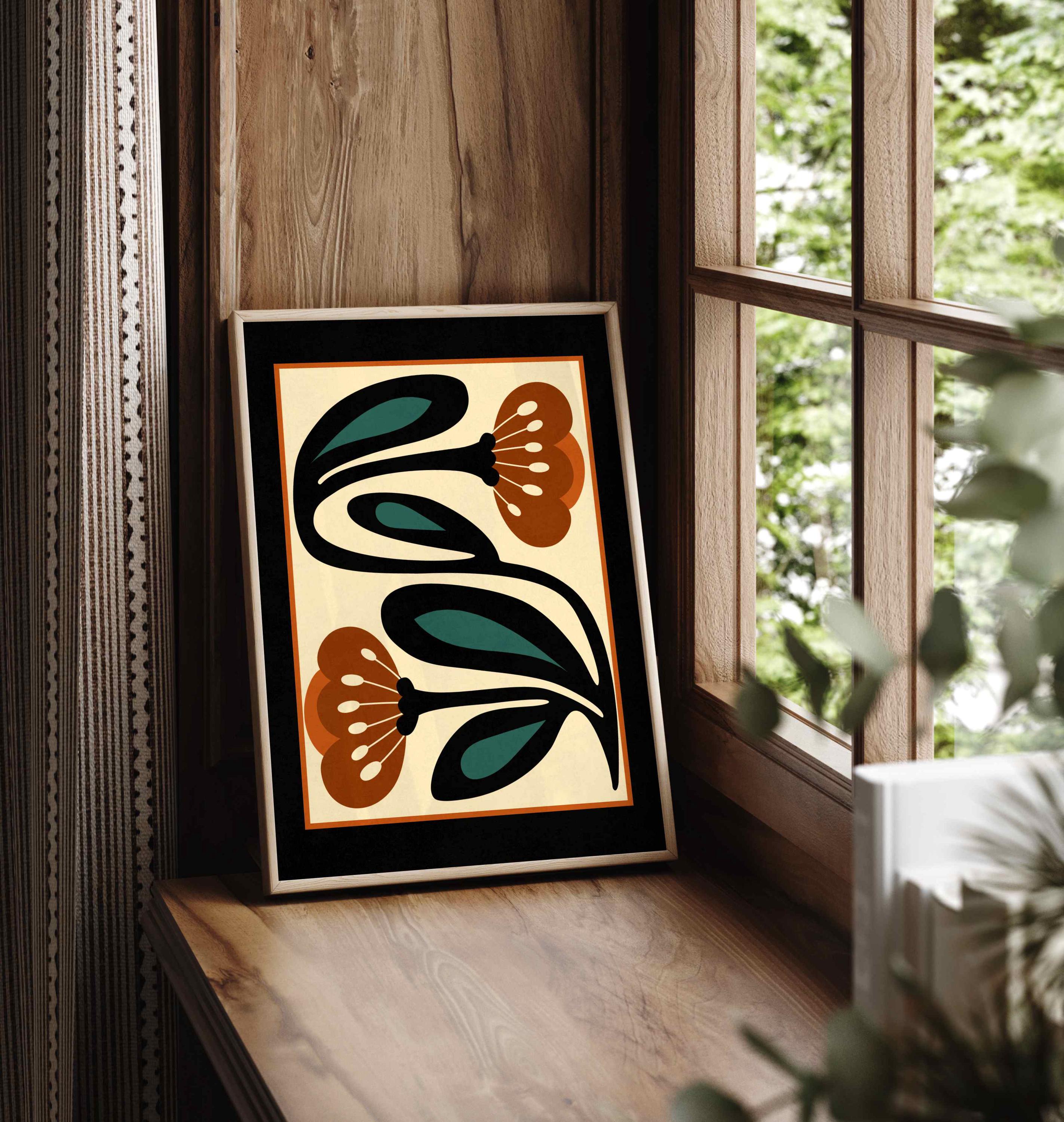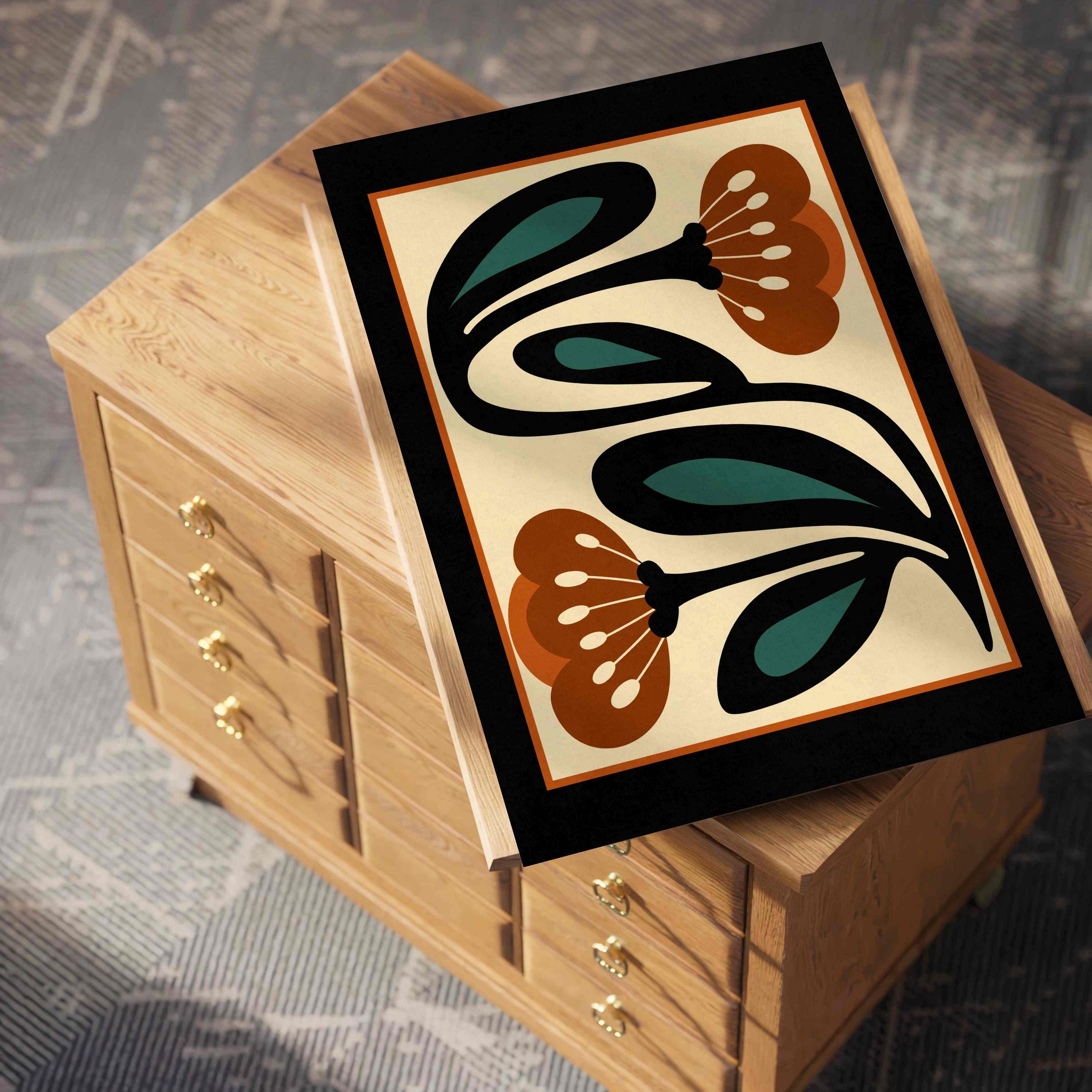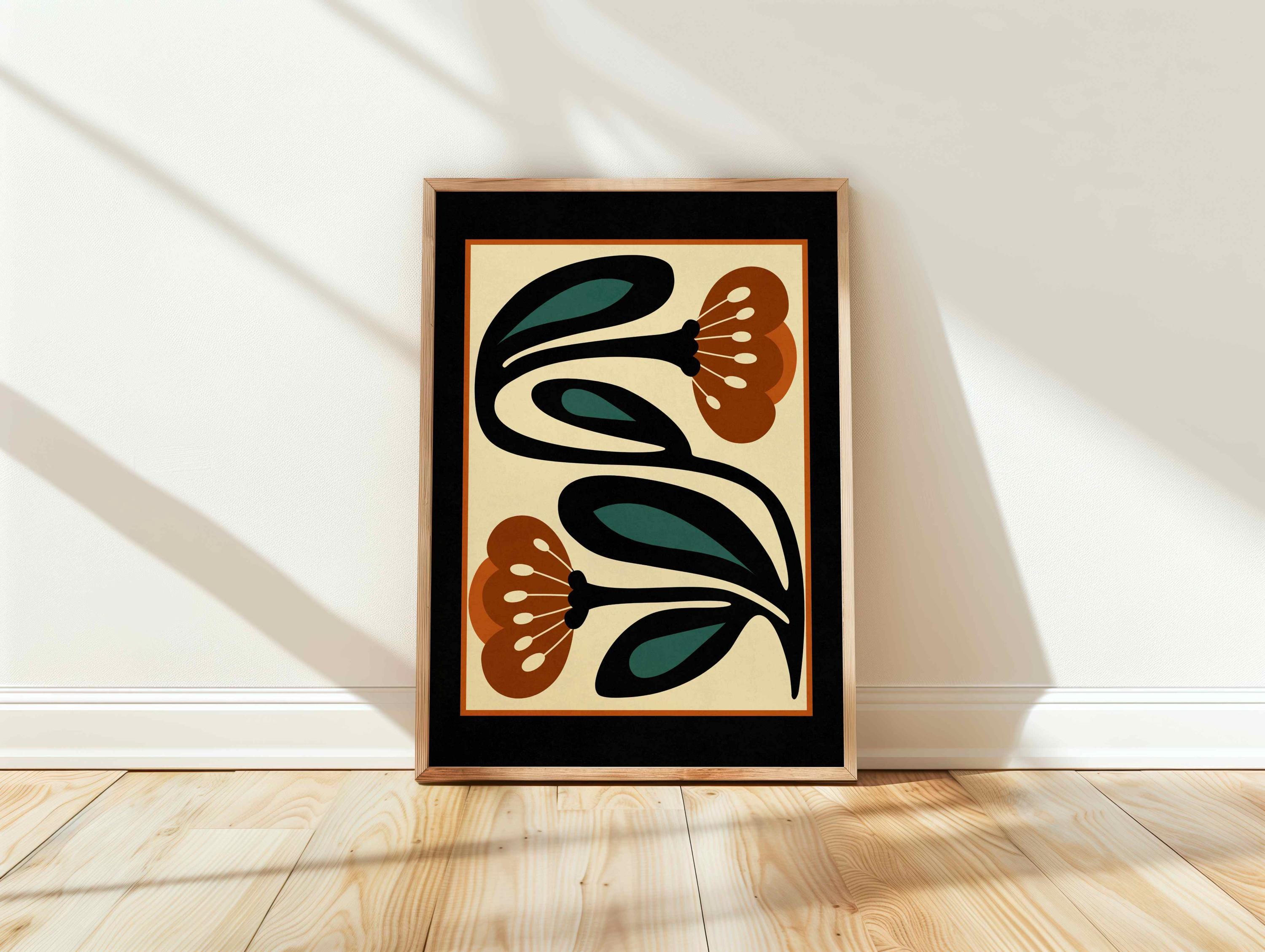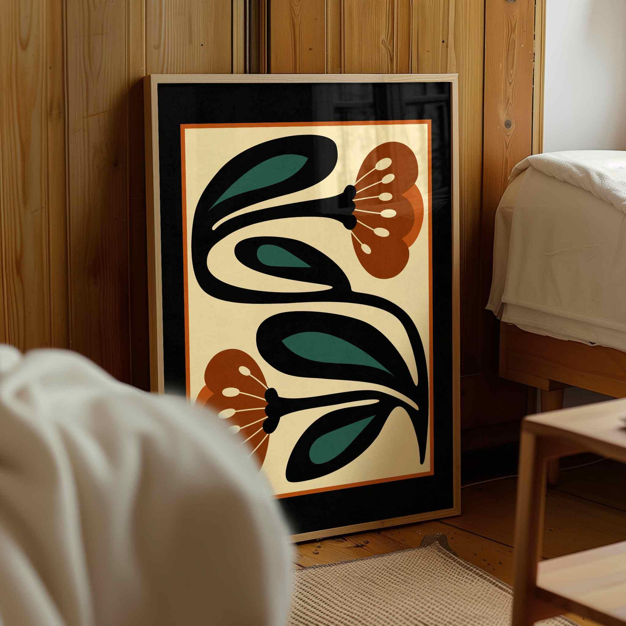 Unframed abstract mid century floral print featuring stylized flowers and leaves in a black, burnt orange, rust, teal and cream color palette. This piece blends retro botanical style with mid century modern design, creating a look that’s both earthy and bold.