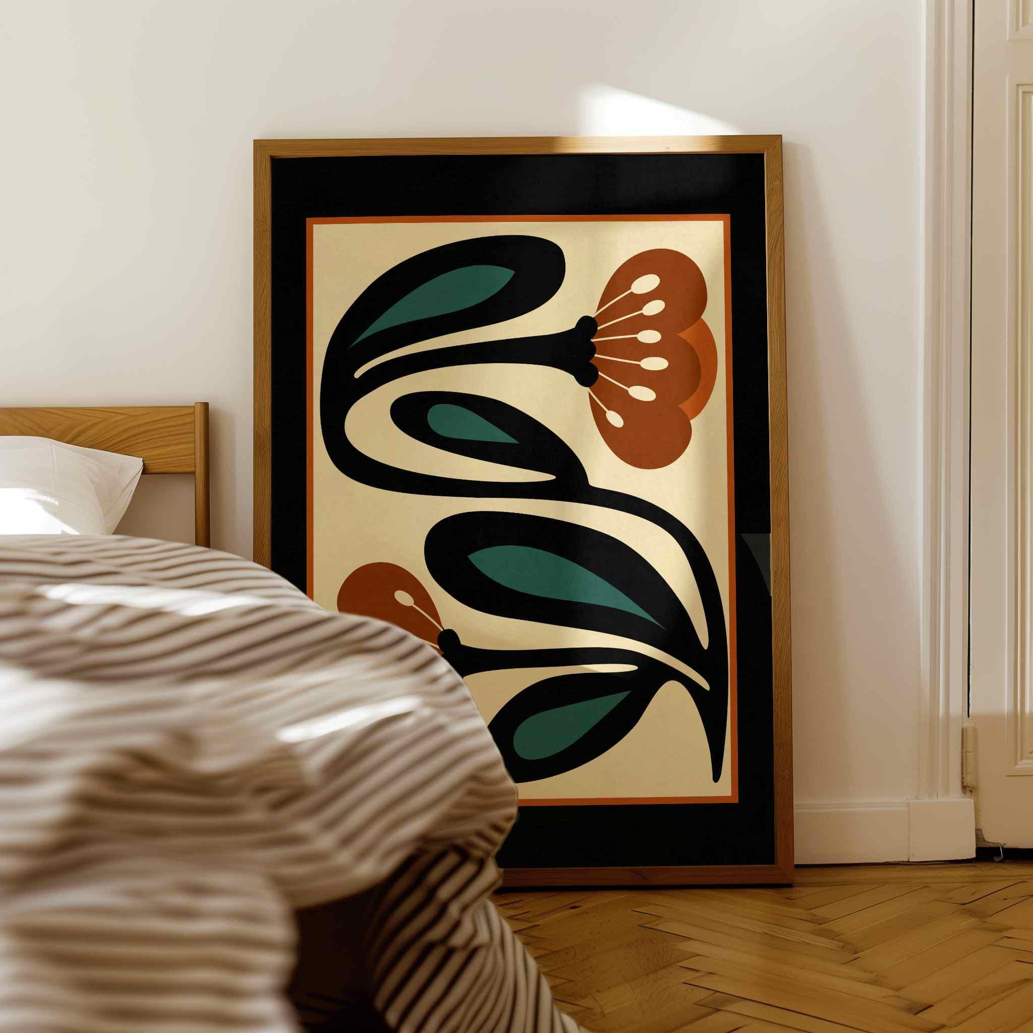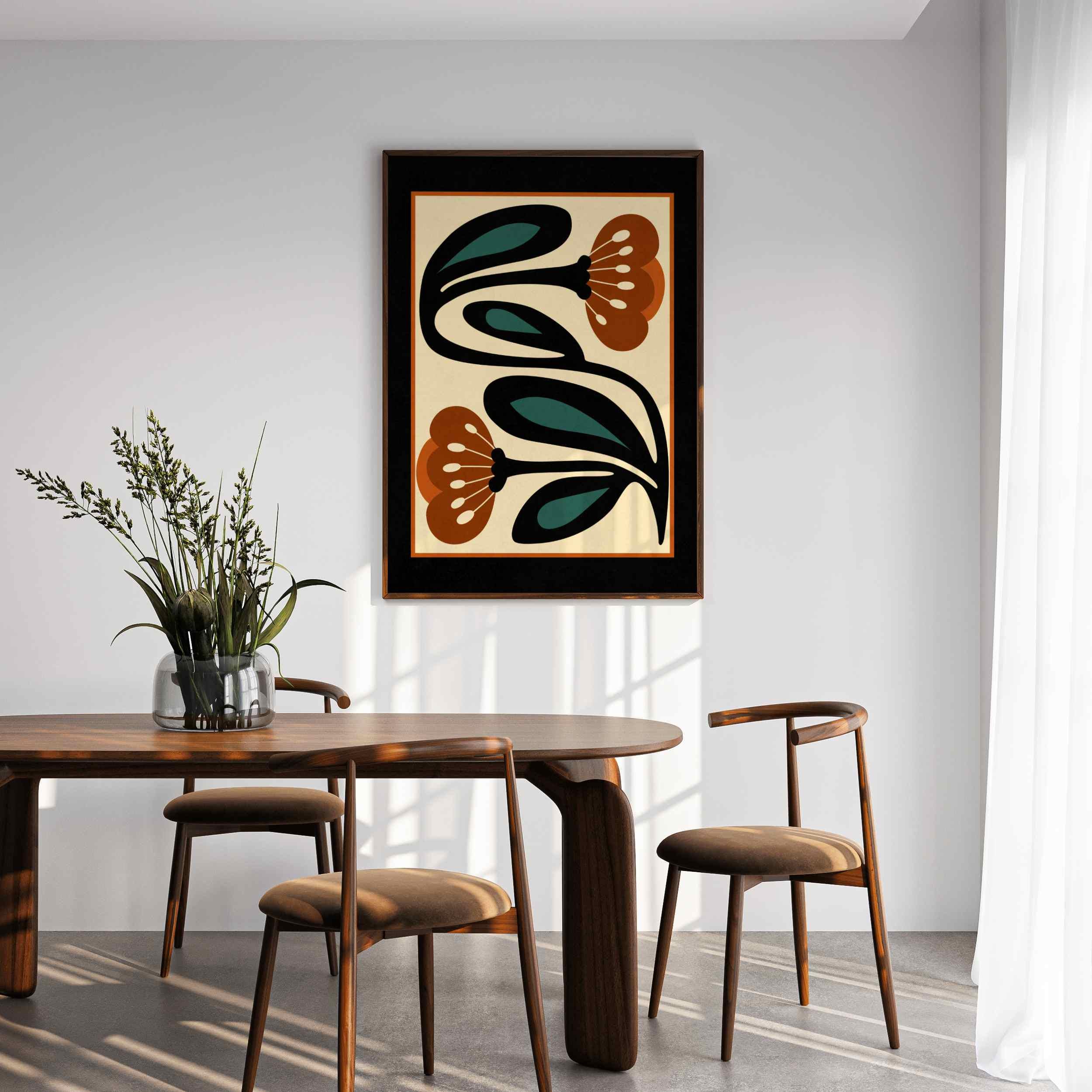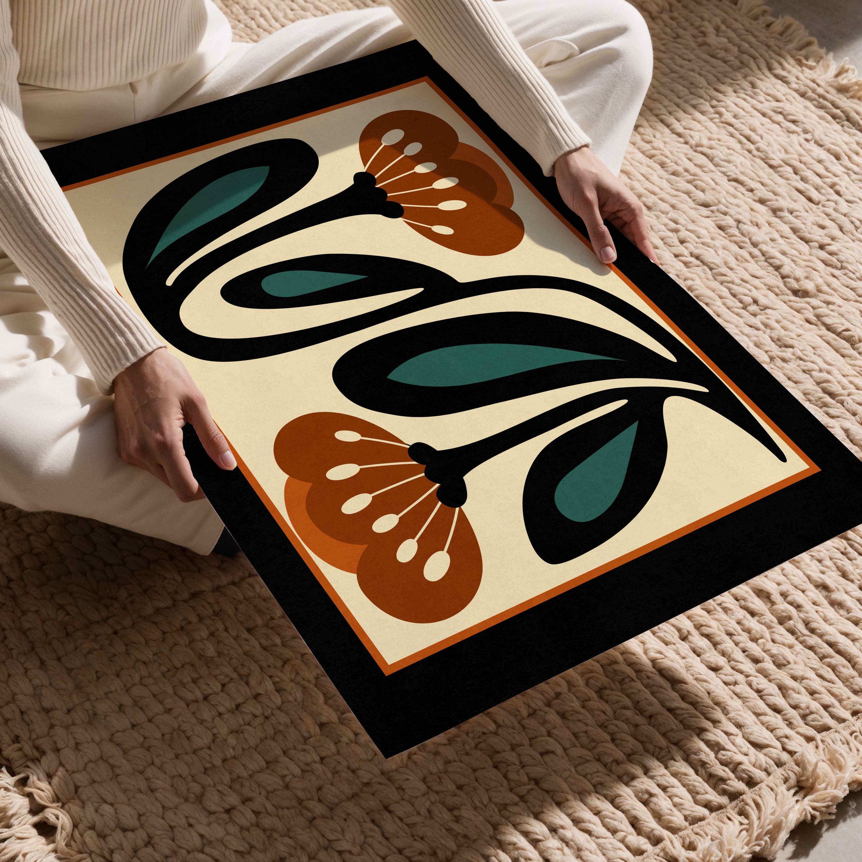 Unframed abstract mid century floral print featuring stylized flowers and leaves in a black, burnt orange, rust, teal and cream color palette. This piece blends retro botanical style with mid century modern design, creating a look that’s both earthy and bold.