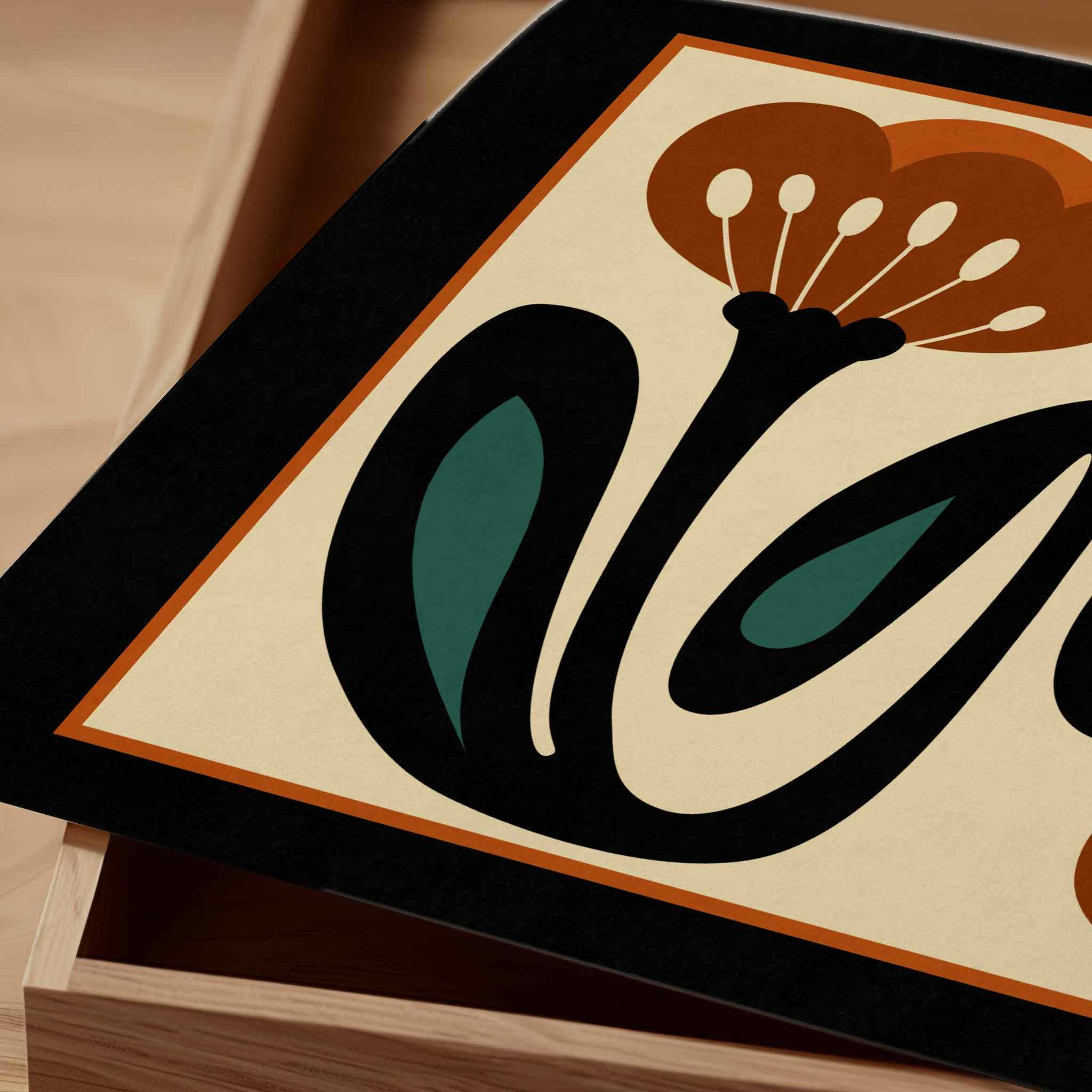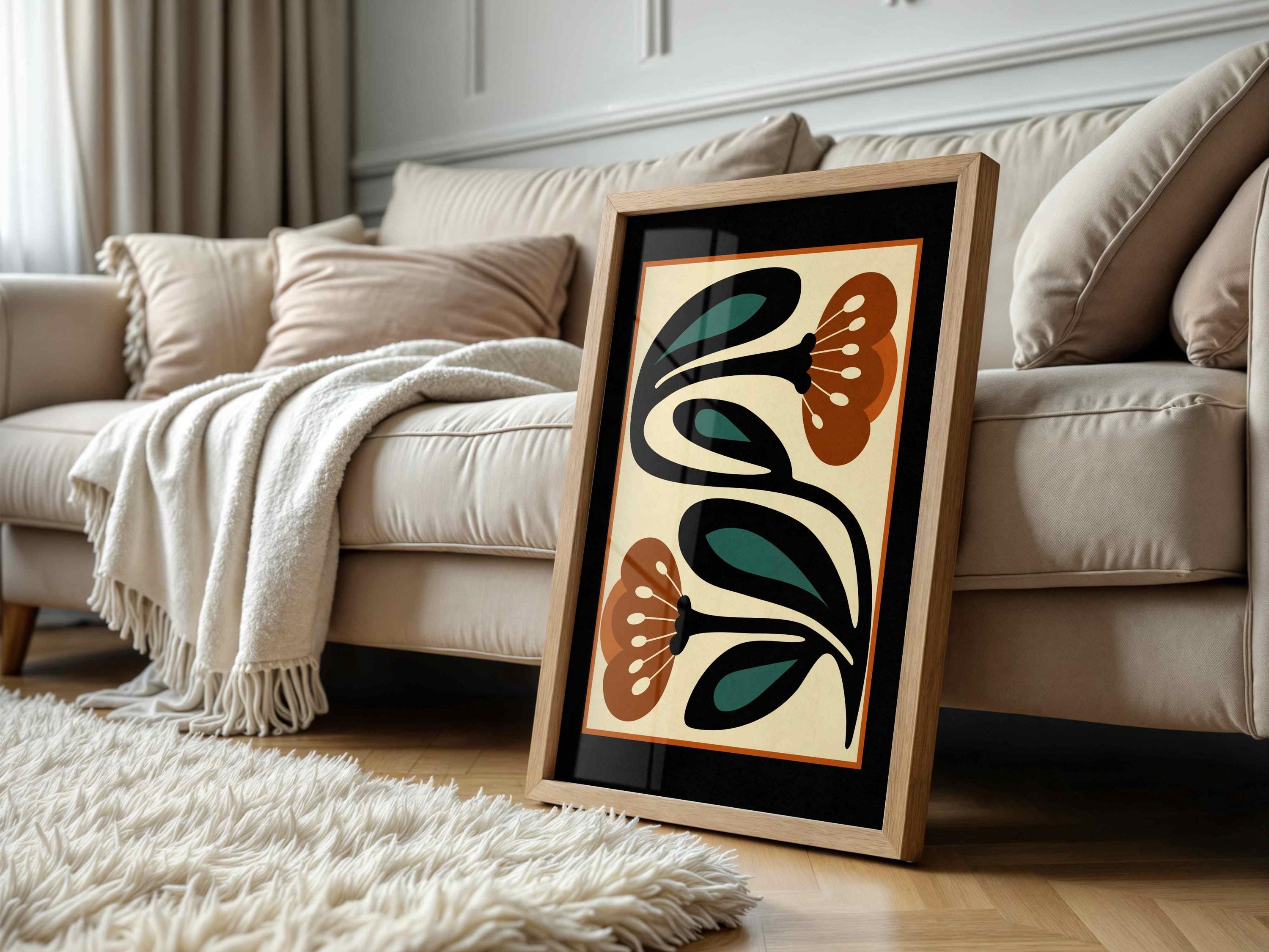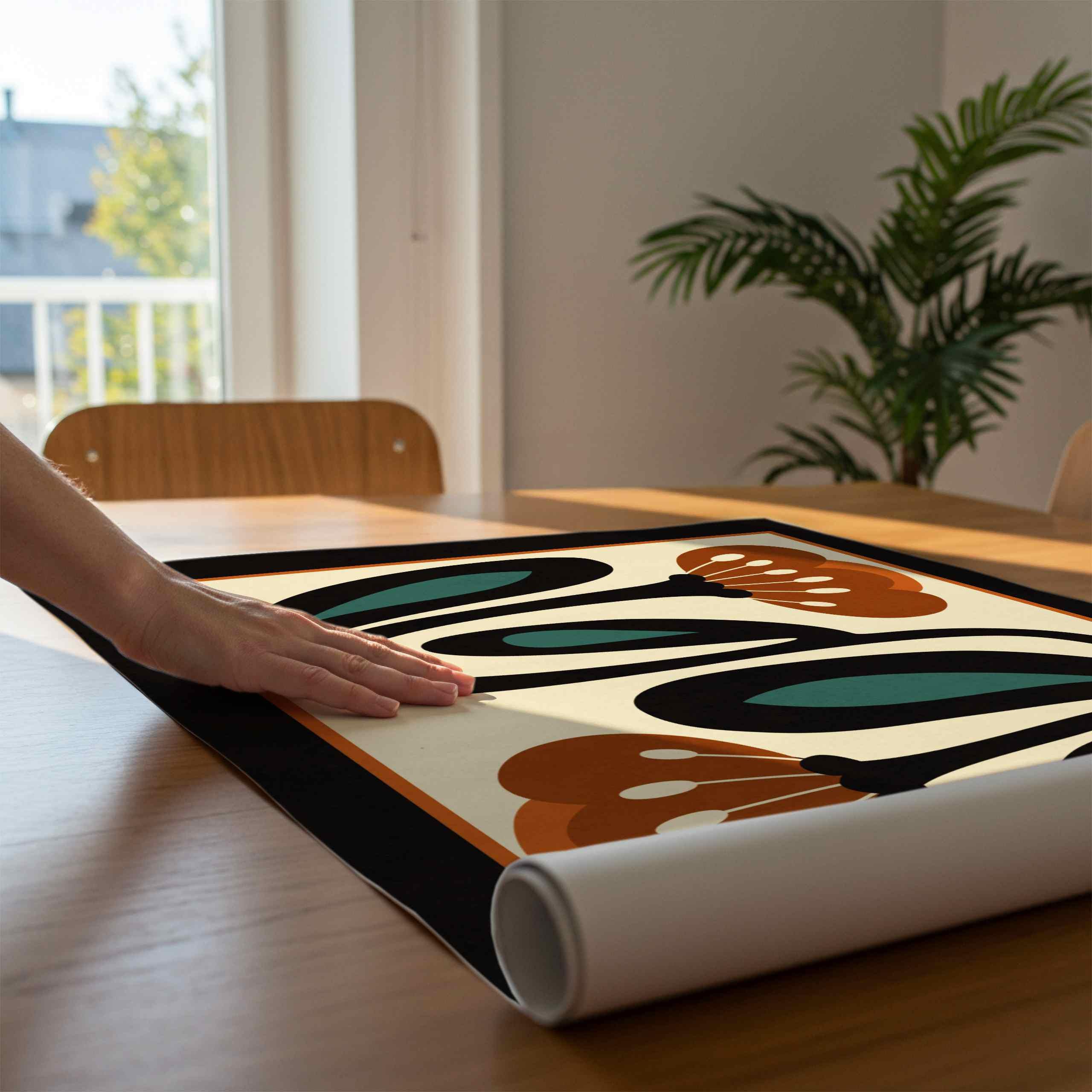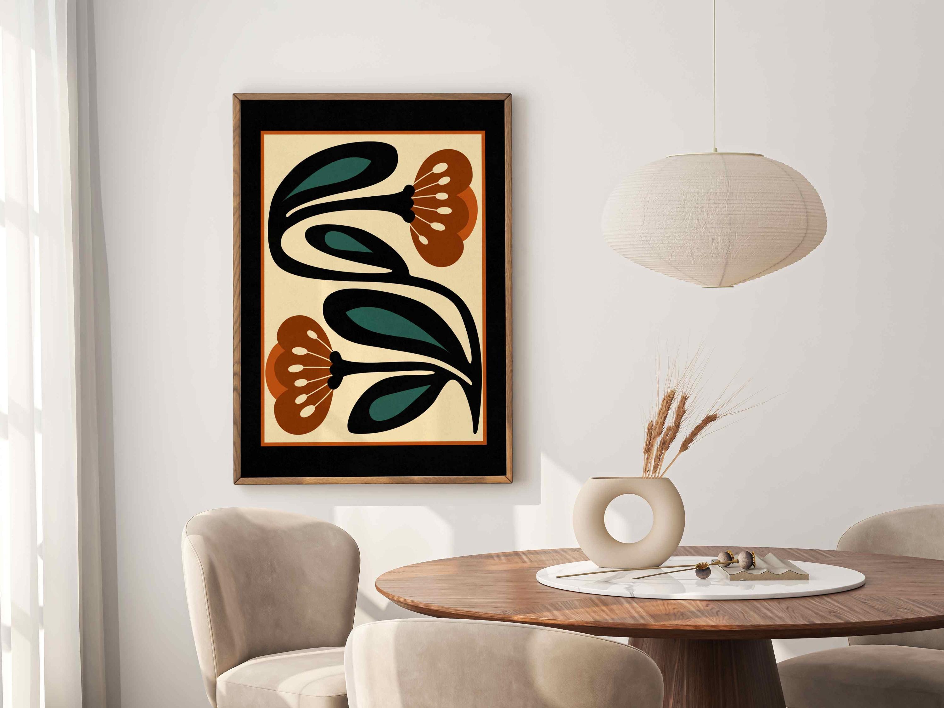 Unframed abstract mid century floral print featuring stylized flowers and leaves in a black, burnt orange, rust, teal and cream color palette. This piece blends retro botanical style with mid century modern design, creating a look that’s both earthy and bold.