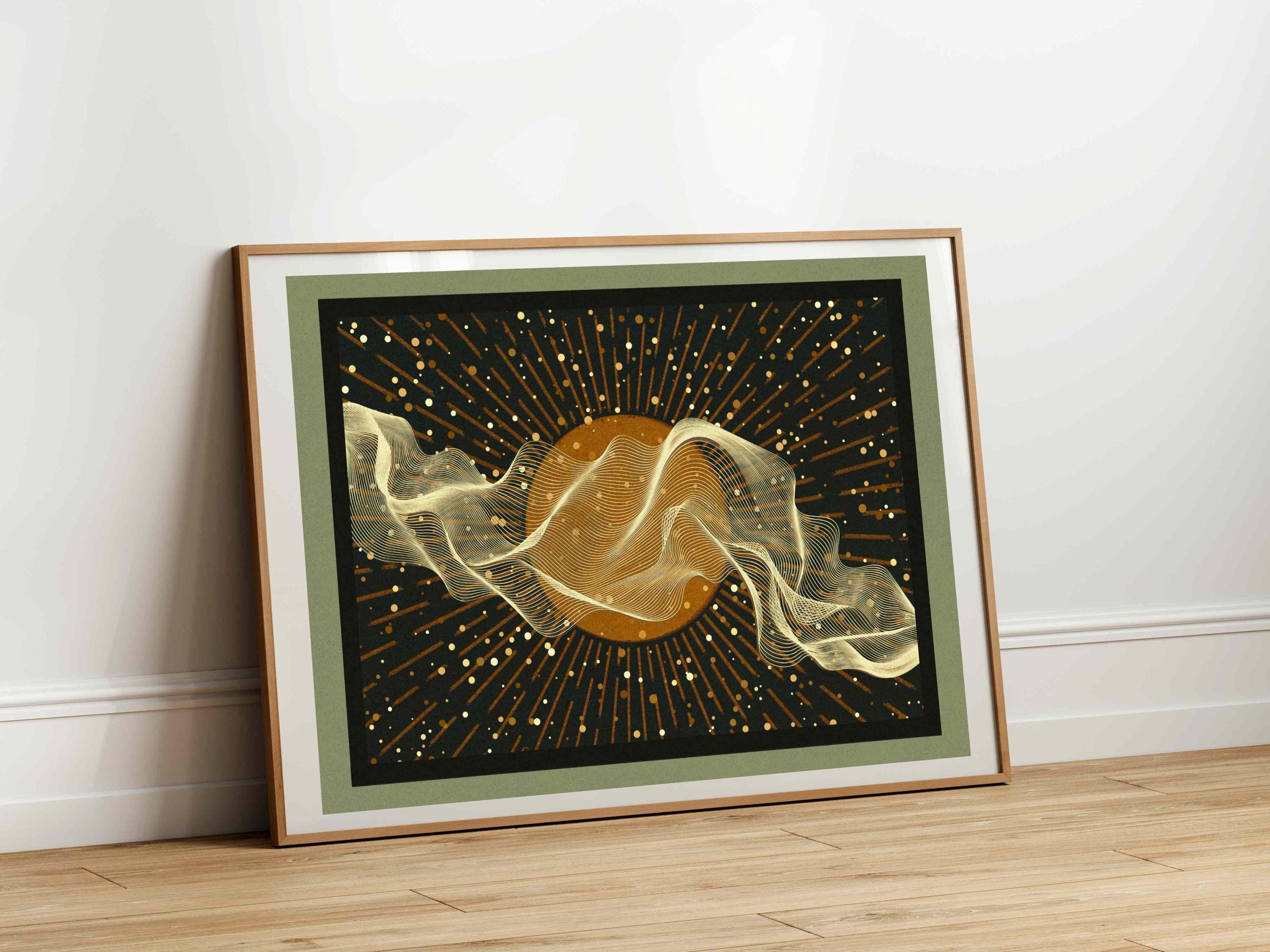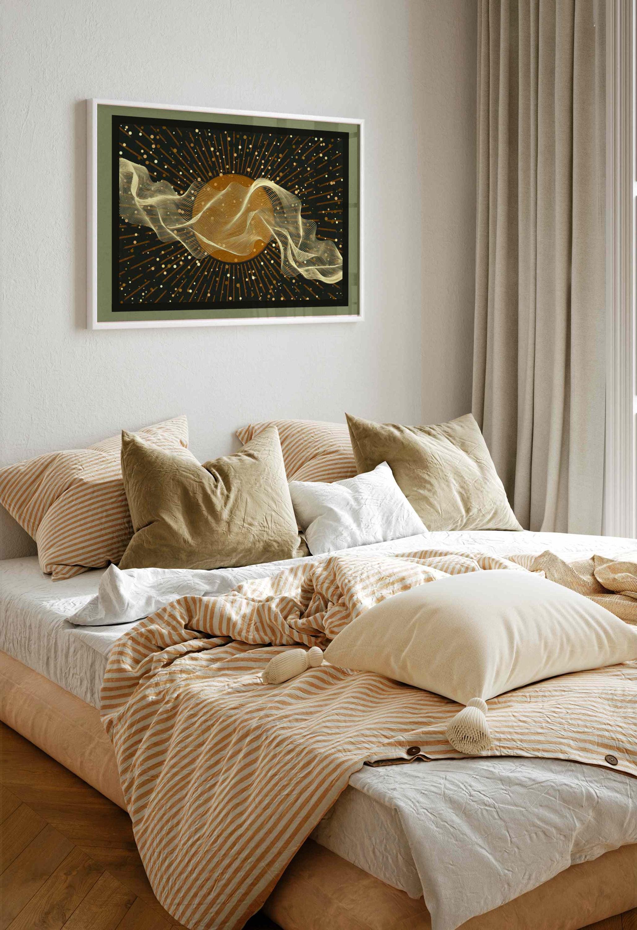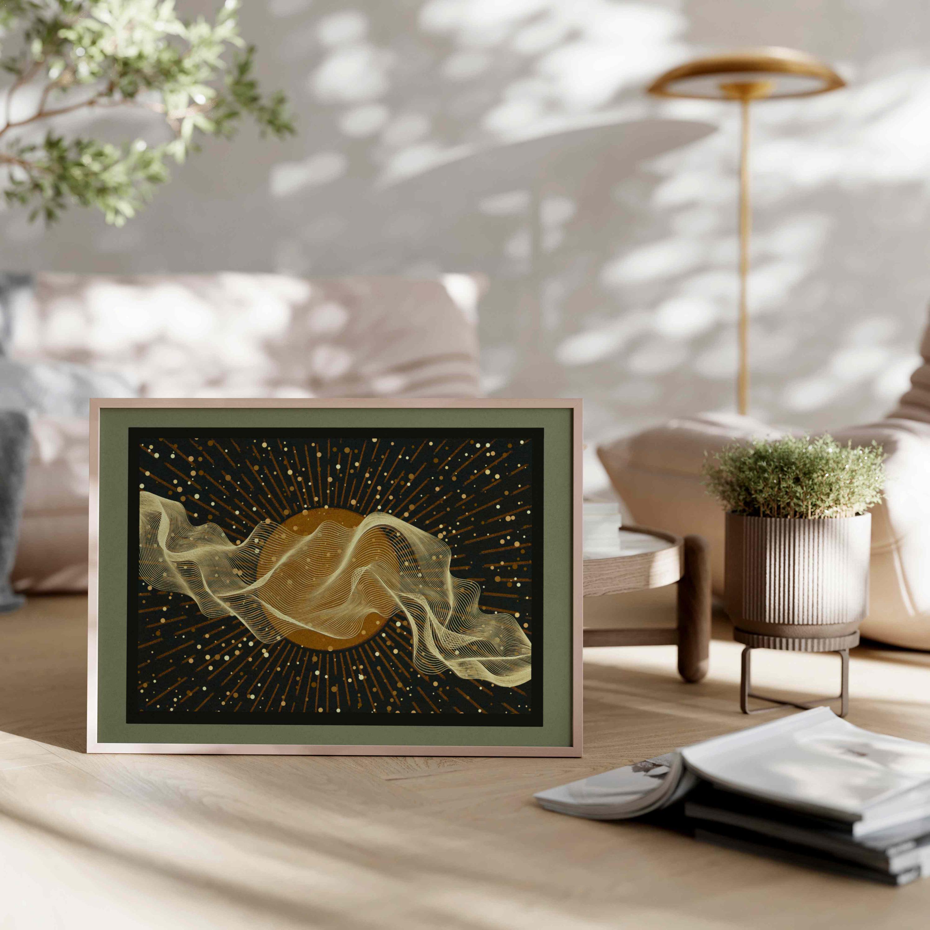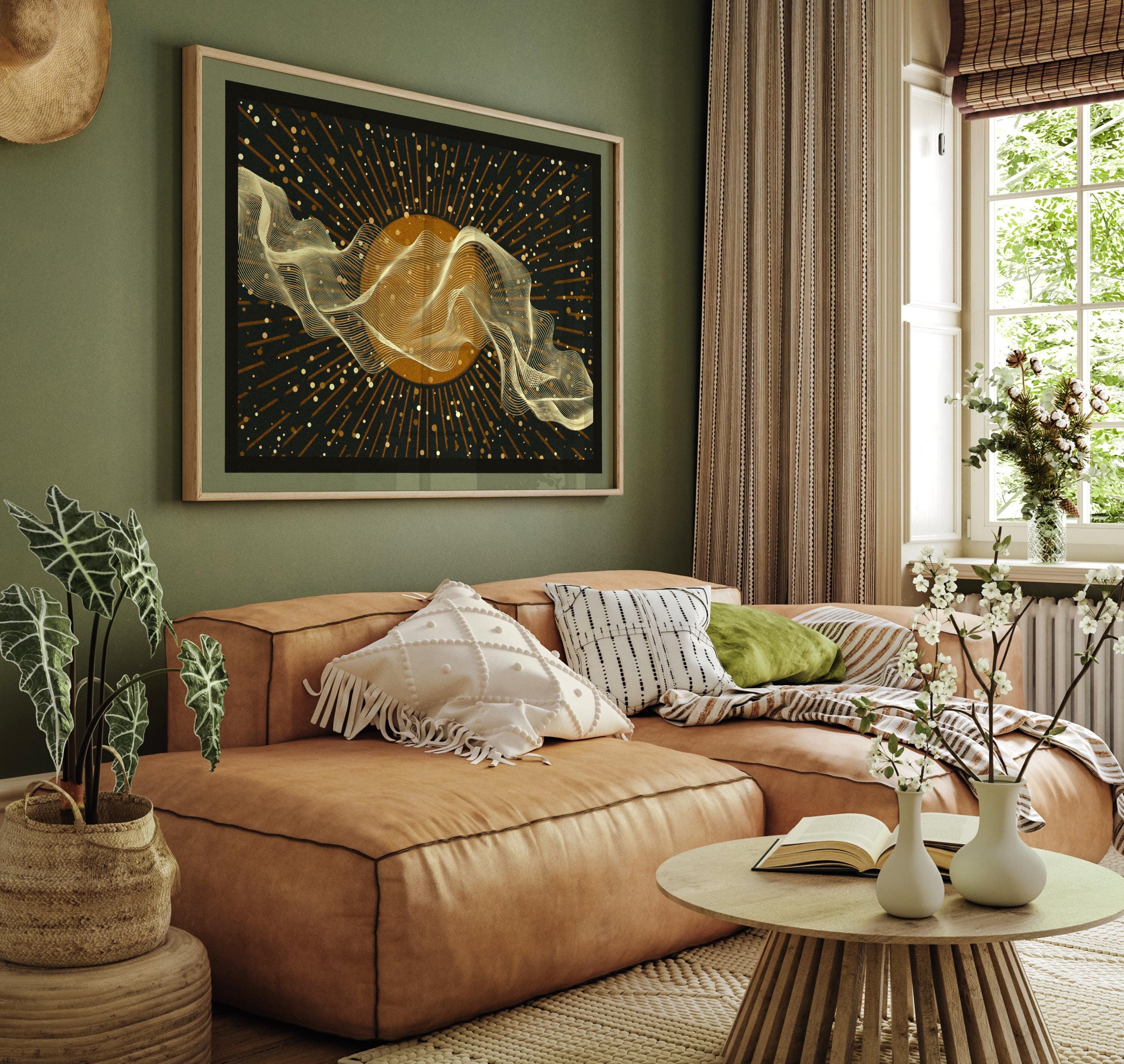The warm neutral tones and subtle contrast give the piece a quiet presence that works well as a focal point or as part of a larger gallery wall. This print suits mid-century modern, minimalist, contemporary and soft boho interiors. It works especially well in living rooms, bedrooms, home offices and calm spaces like reading corners or meditation areas.