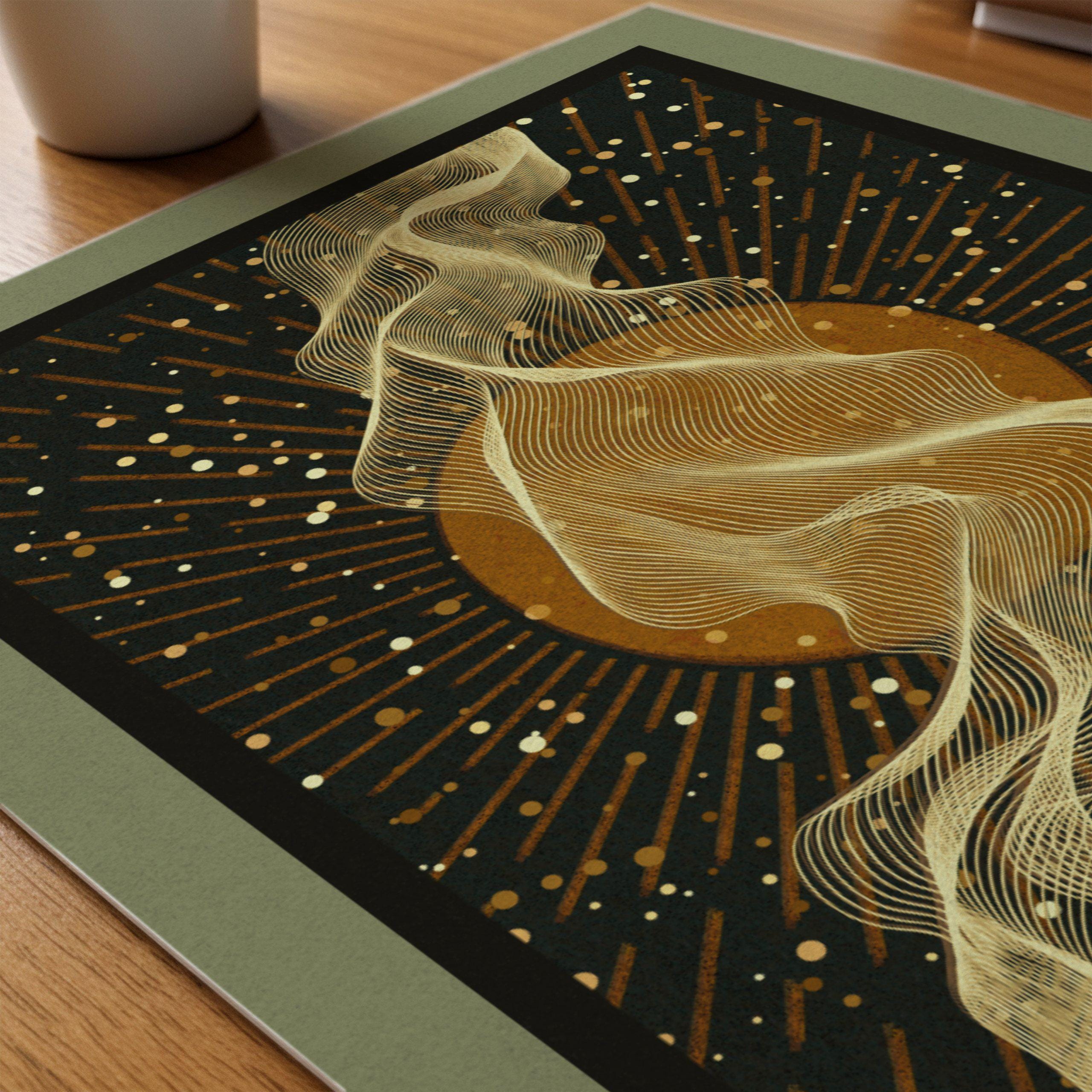 This abstract mid century modern print is inspired by space and the night sky. A dark background, scattered stars, and a full moon create a sense of depth and quiet movement. The composition balances clean, structured elements with softer, flowing lines, giving the piece a calm but slightly energetic feel.