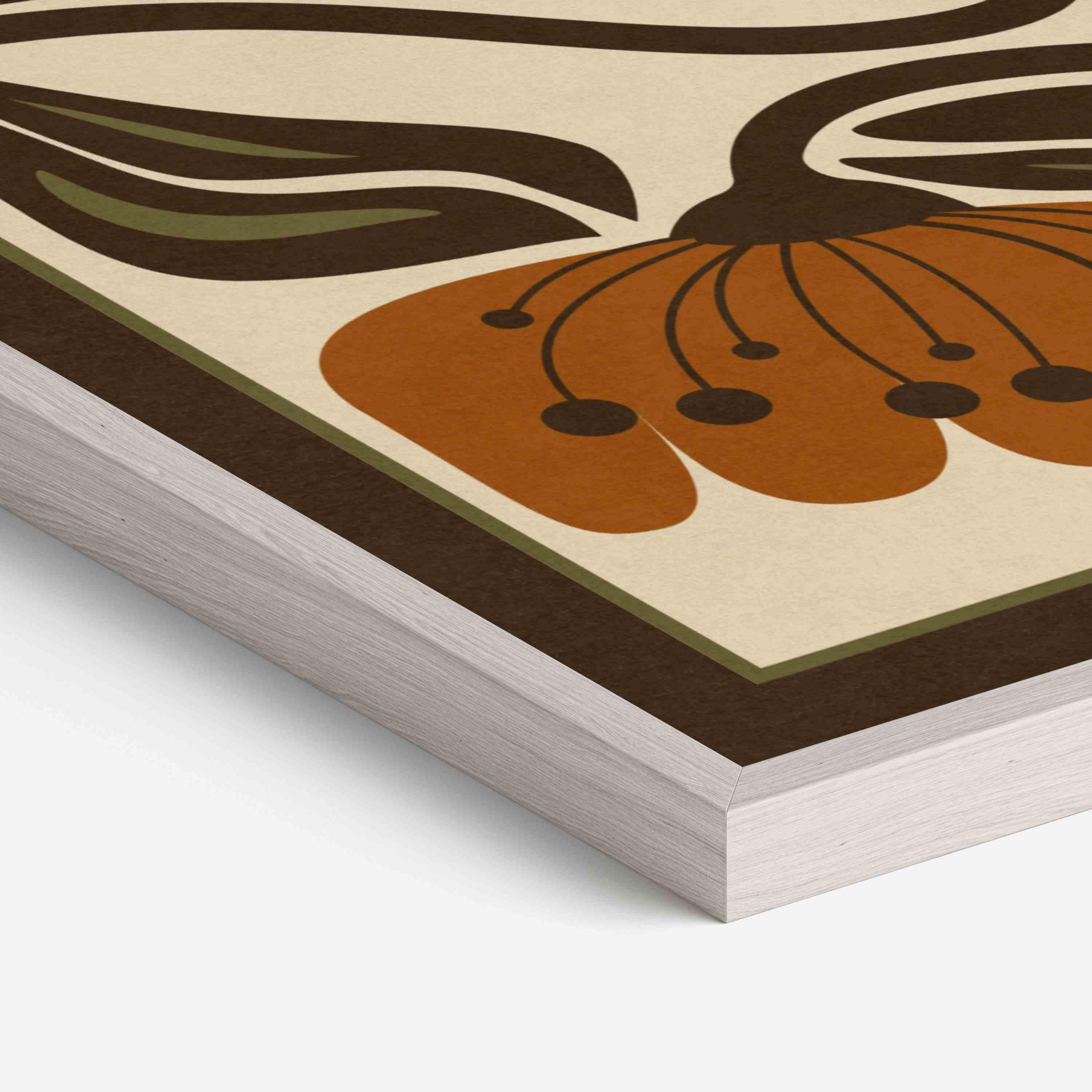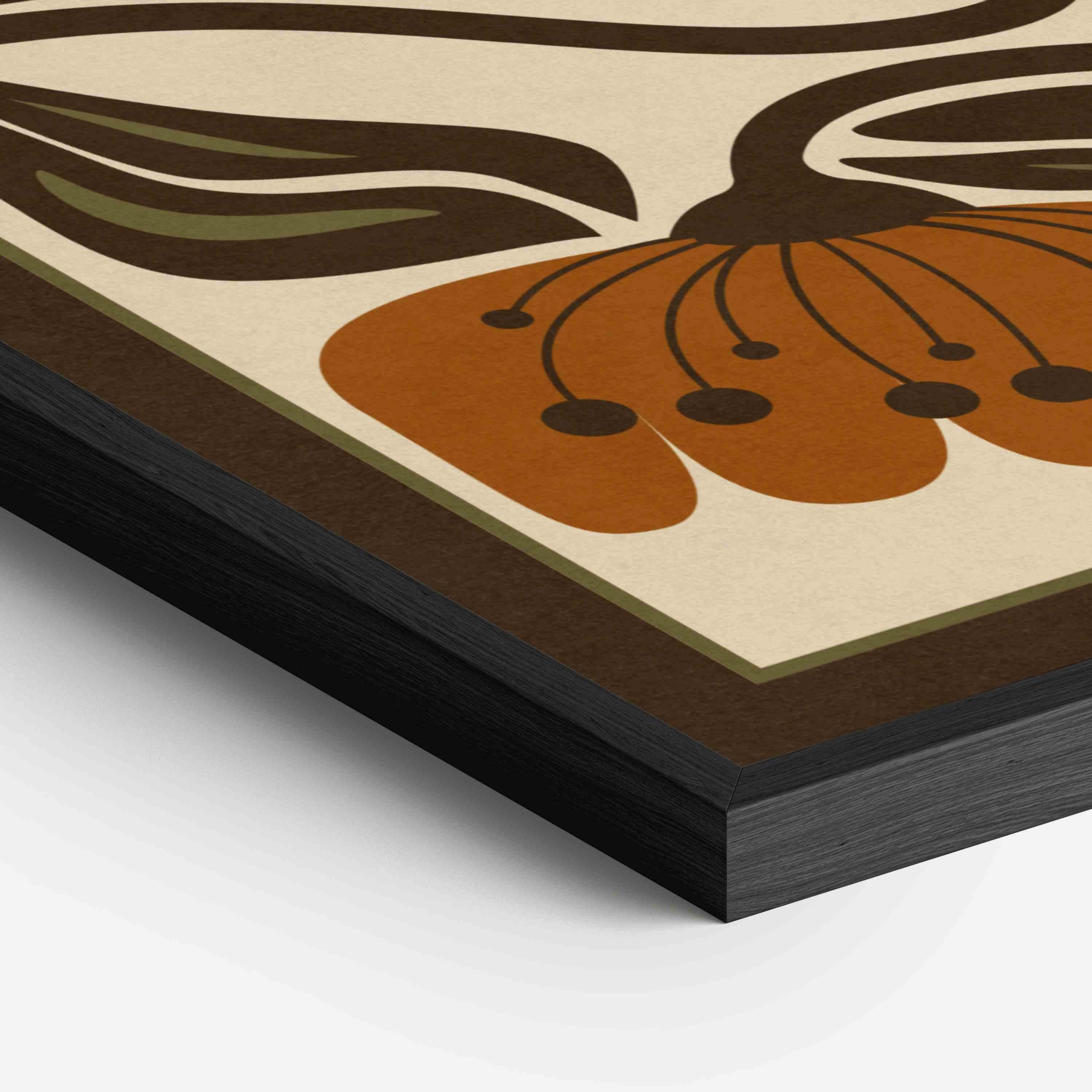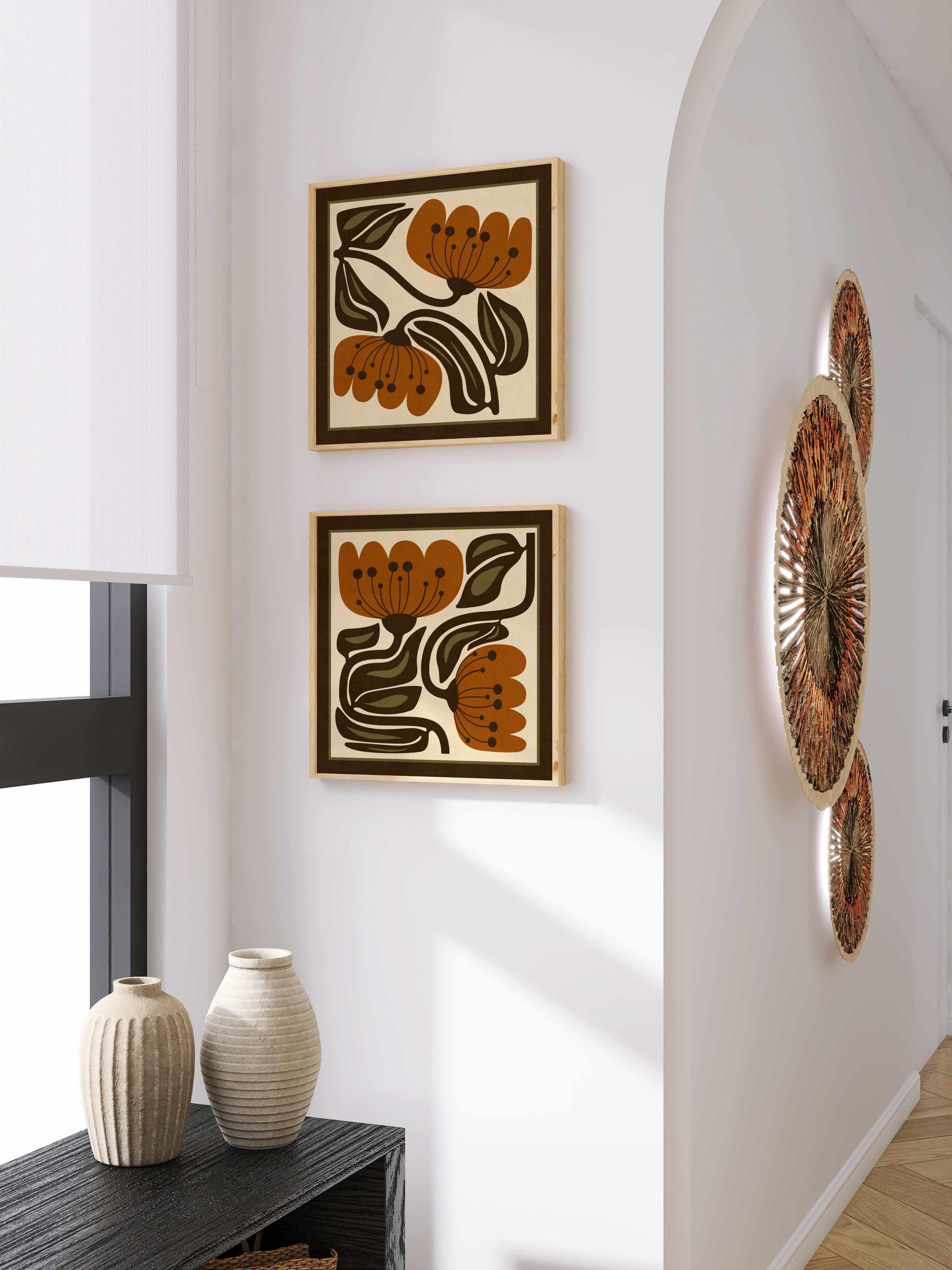 Framed abstract retro floral print set inspired by Matisse botanical shapes and groovy 70s design. This earthy flower duo features warm terracotta blooms, dark mocha brown leaves and soft olive green details layered over a cream background, and finished off with a deep brown border.