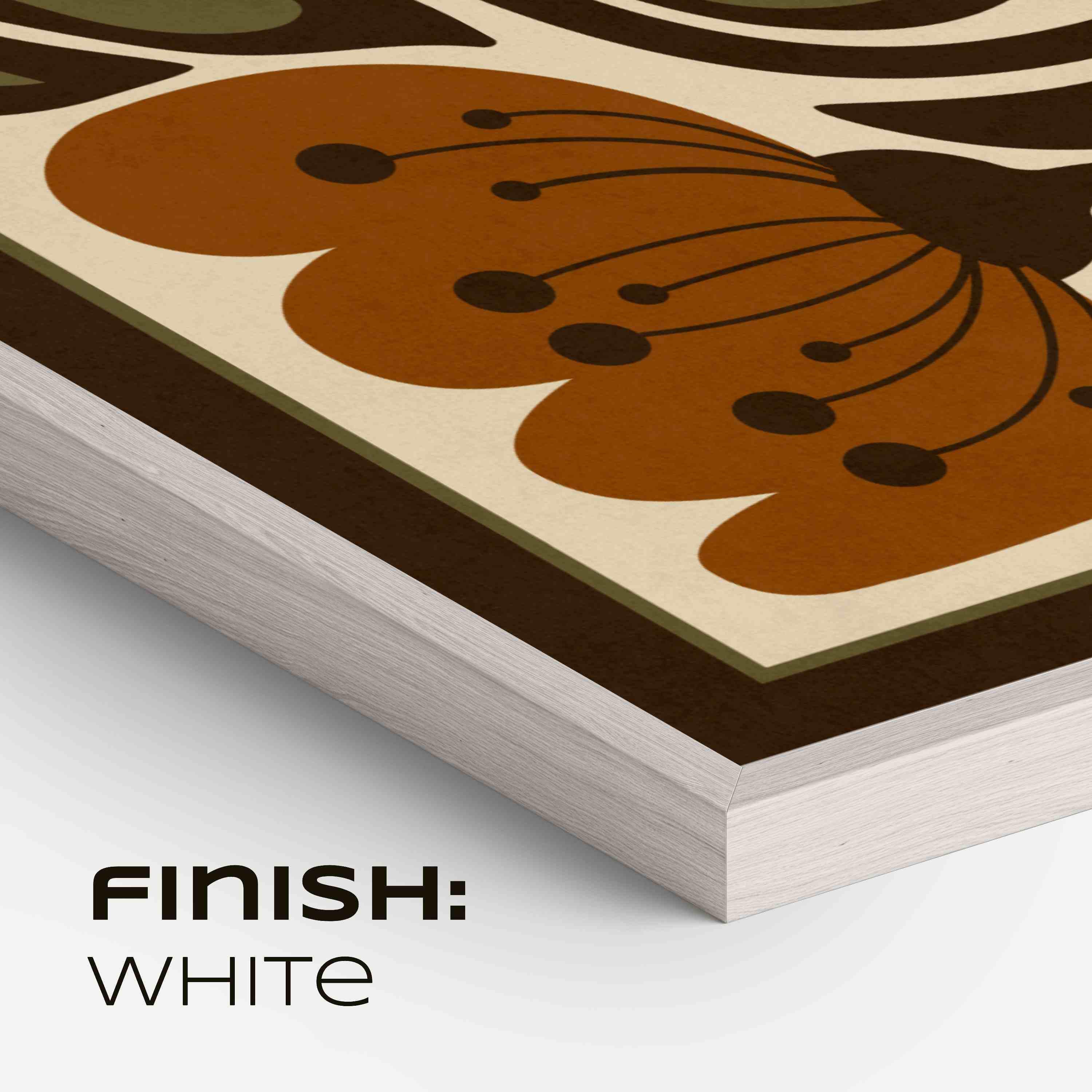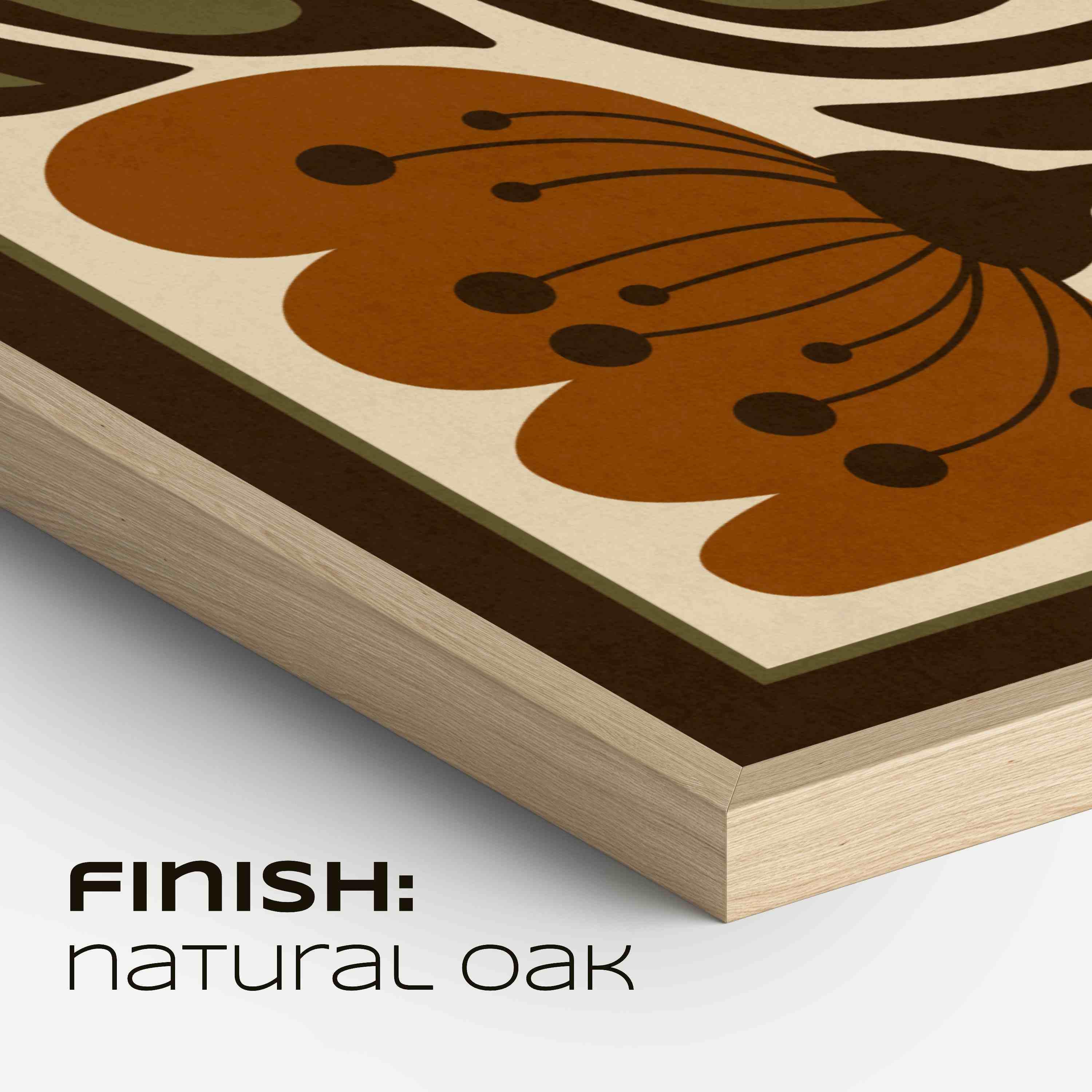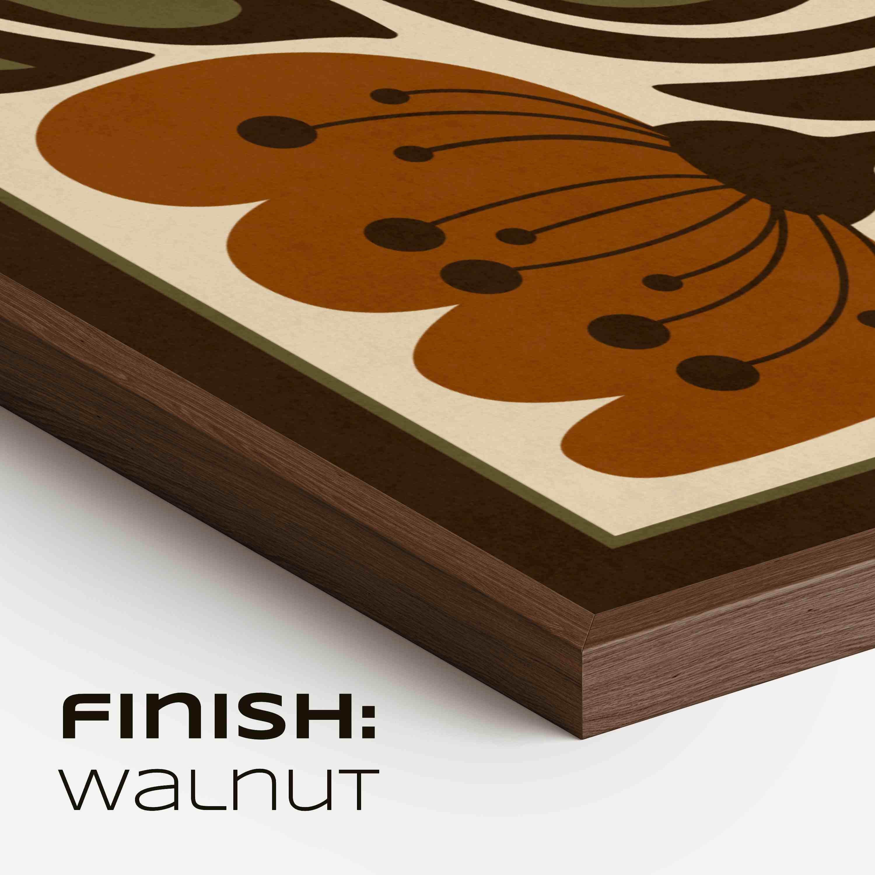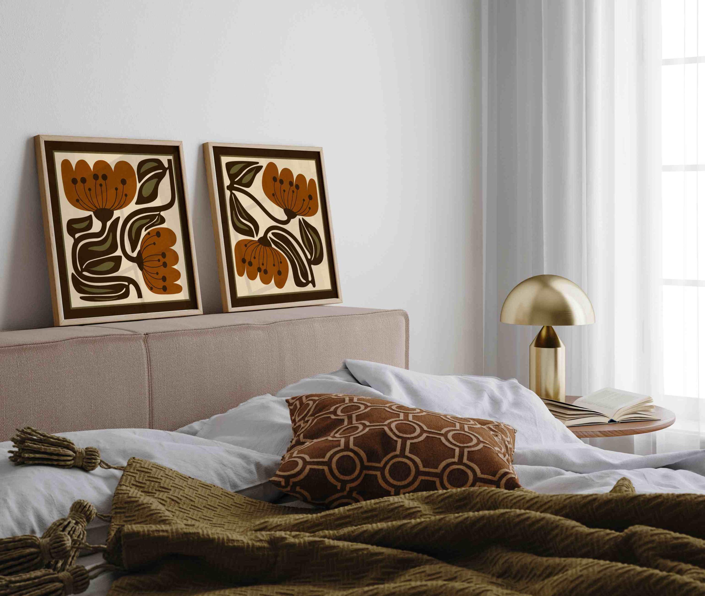 Framed abstract retro floral prints inspired by Matisse botanical shapes and vintage mid-century design. This earthy flower duo features warm terracotta blooms, dark mocha brown leaves, and soft olive green details layered over a cream background, and finished with a deep brown border.
