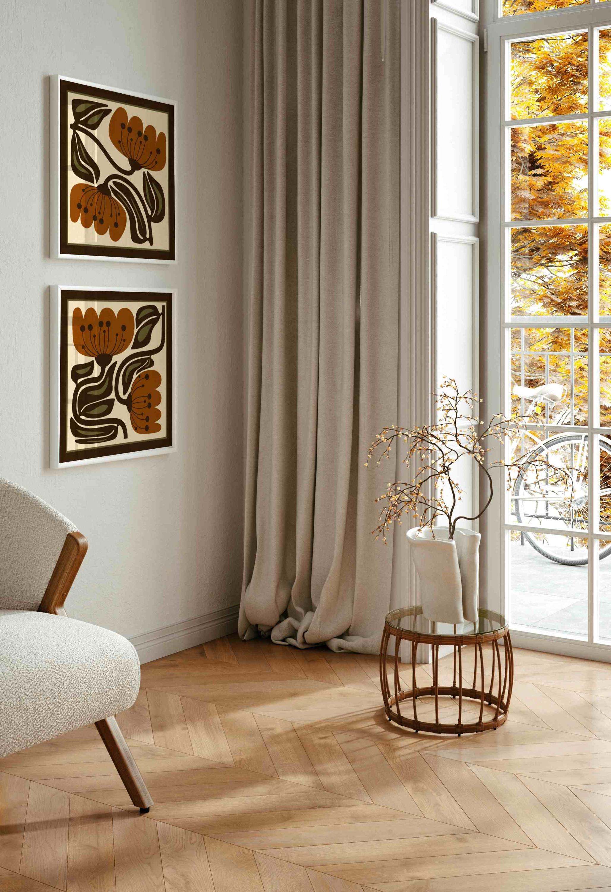 These square prints bring warmth and character to mid-century modern, retro, or vintage-inspired interiors, and work beautifully as a cohesive pair or as part of a gallery wall.