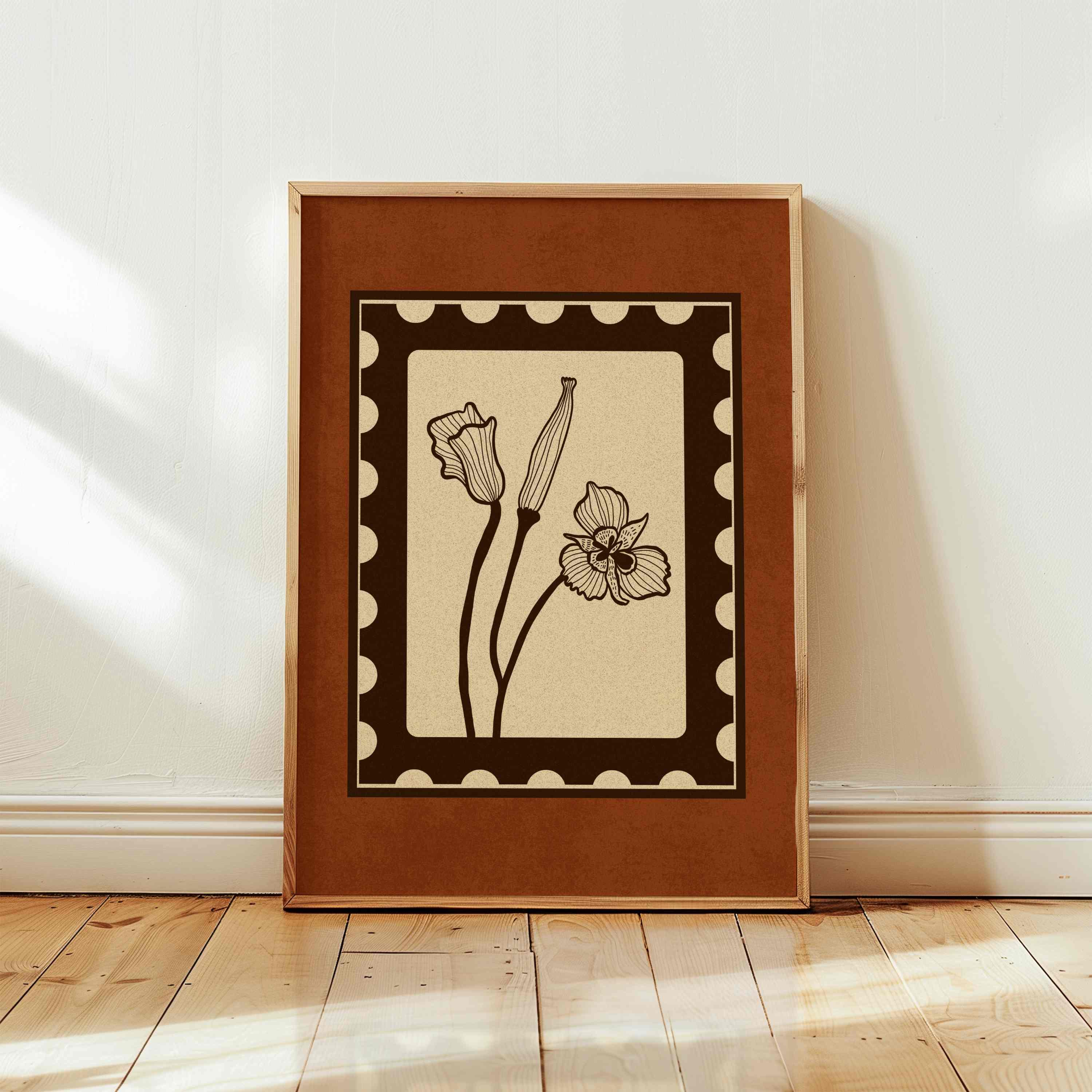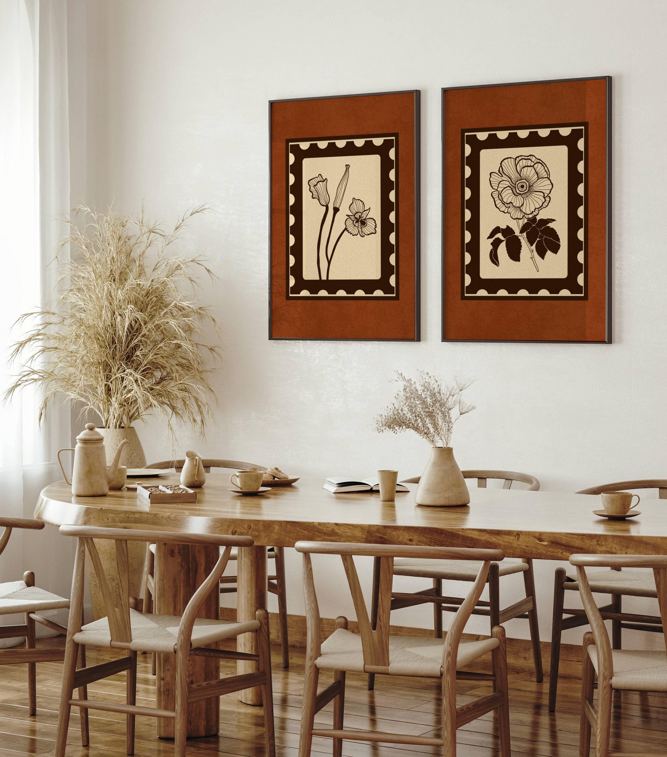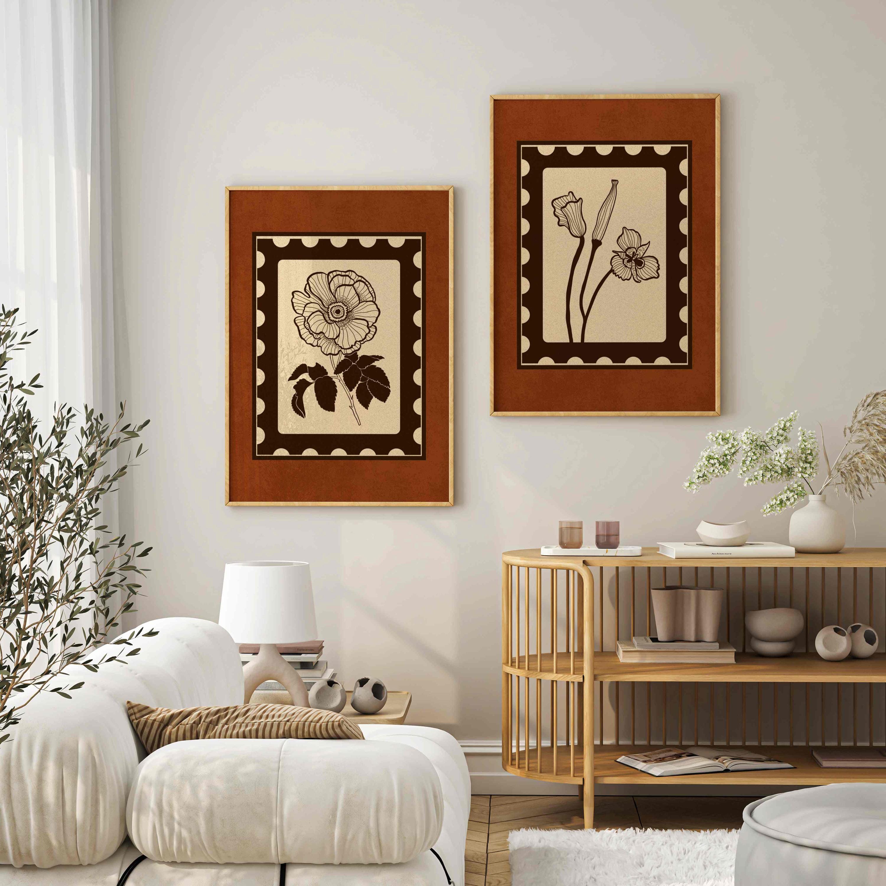 Designed in a stamp-style layout with muted tones of light beige, rich brown, and warm rust red, this set blends mid-century design, retro florals, and cottagecore aesthetics — making it the perfect addition to a gallery wall, reading nook, bedroom, or cozy kitchen.