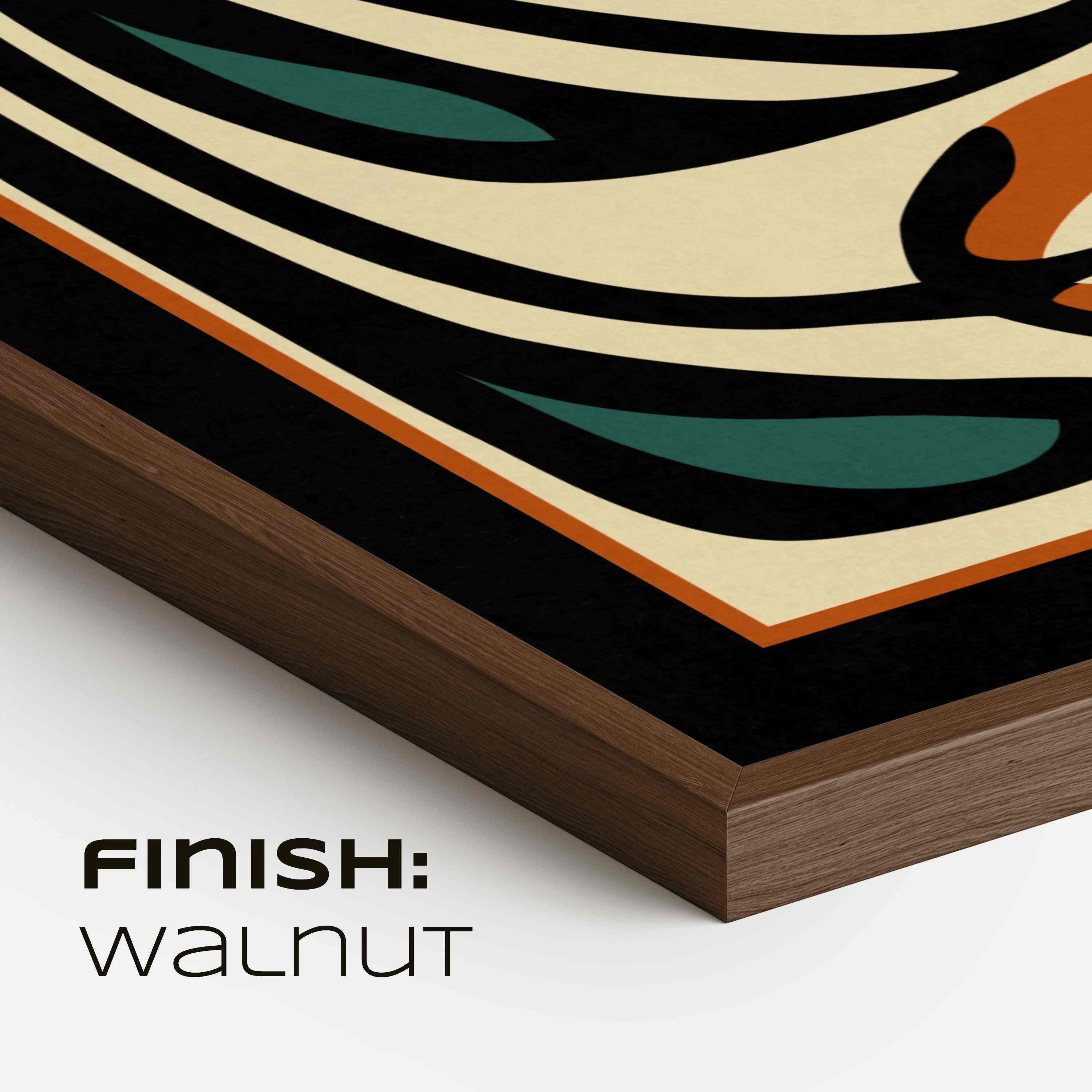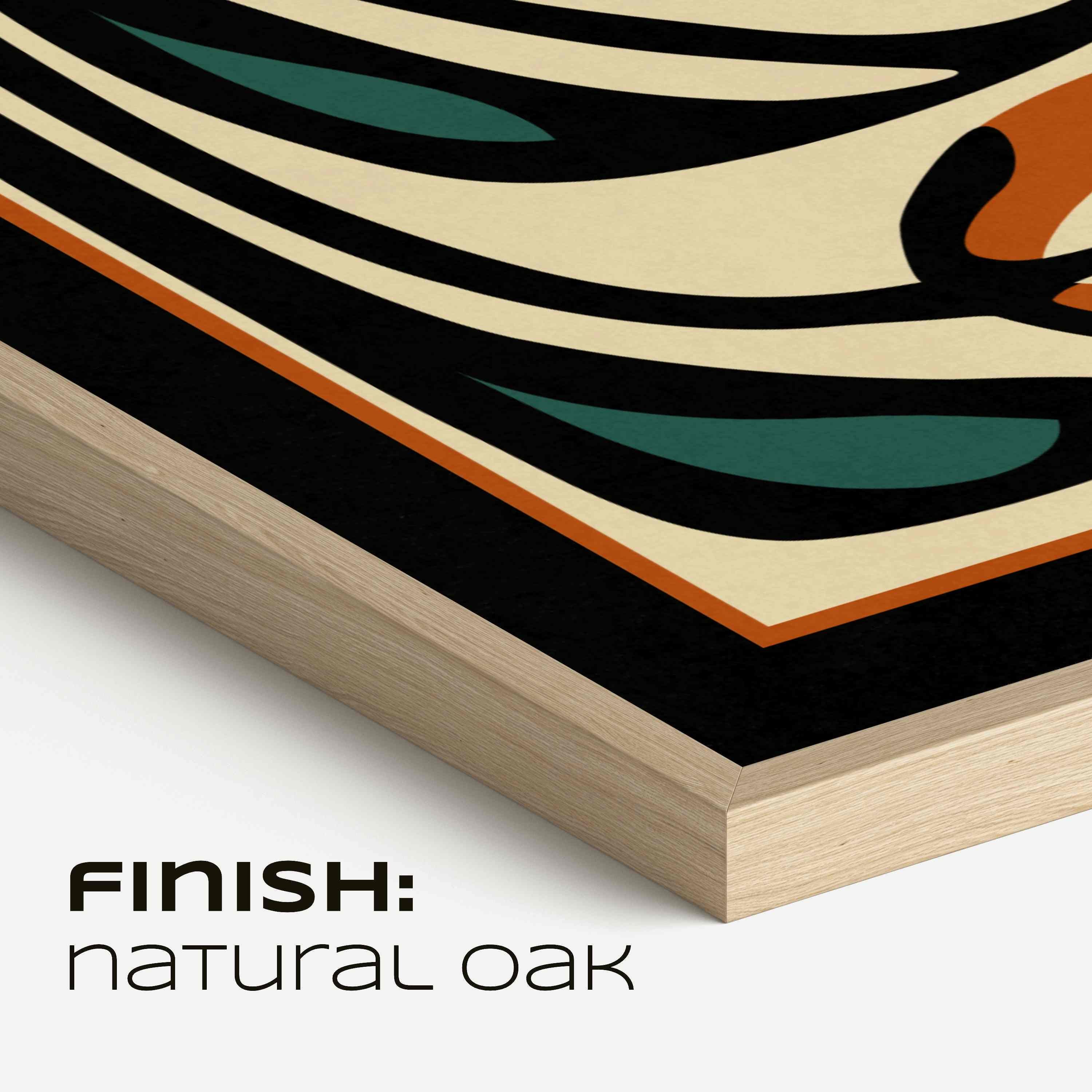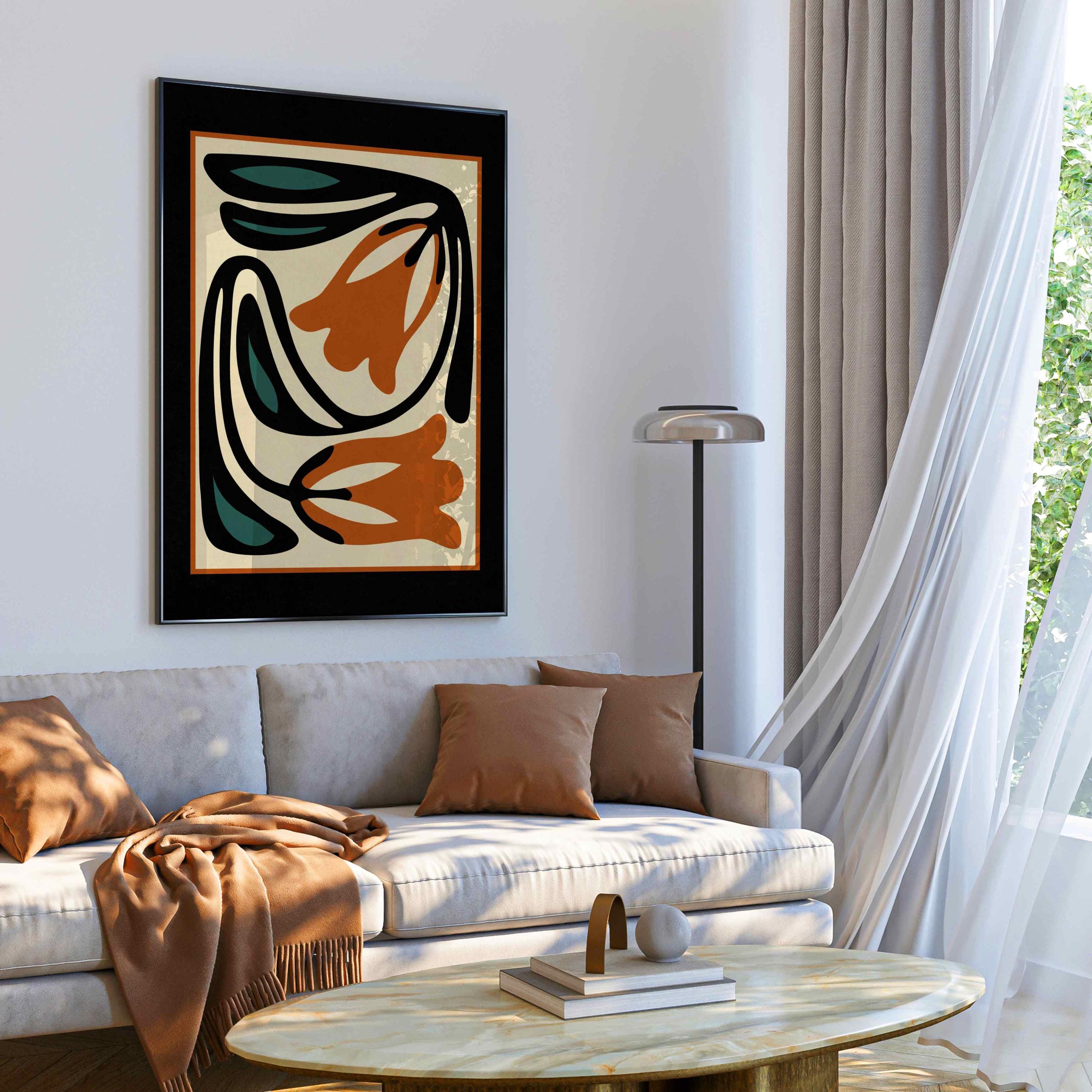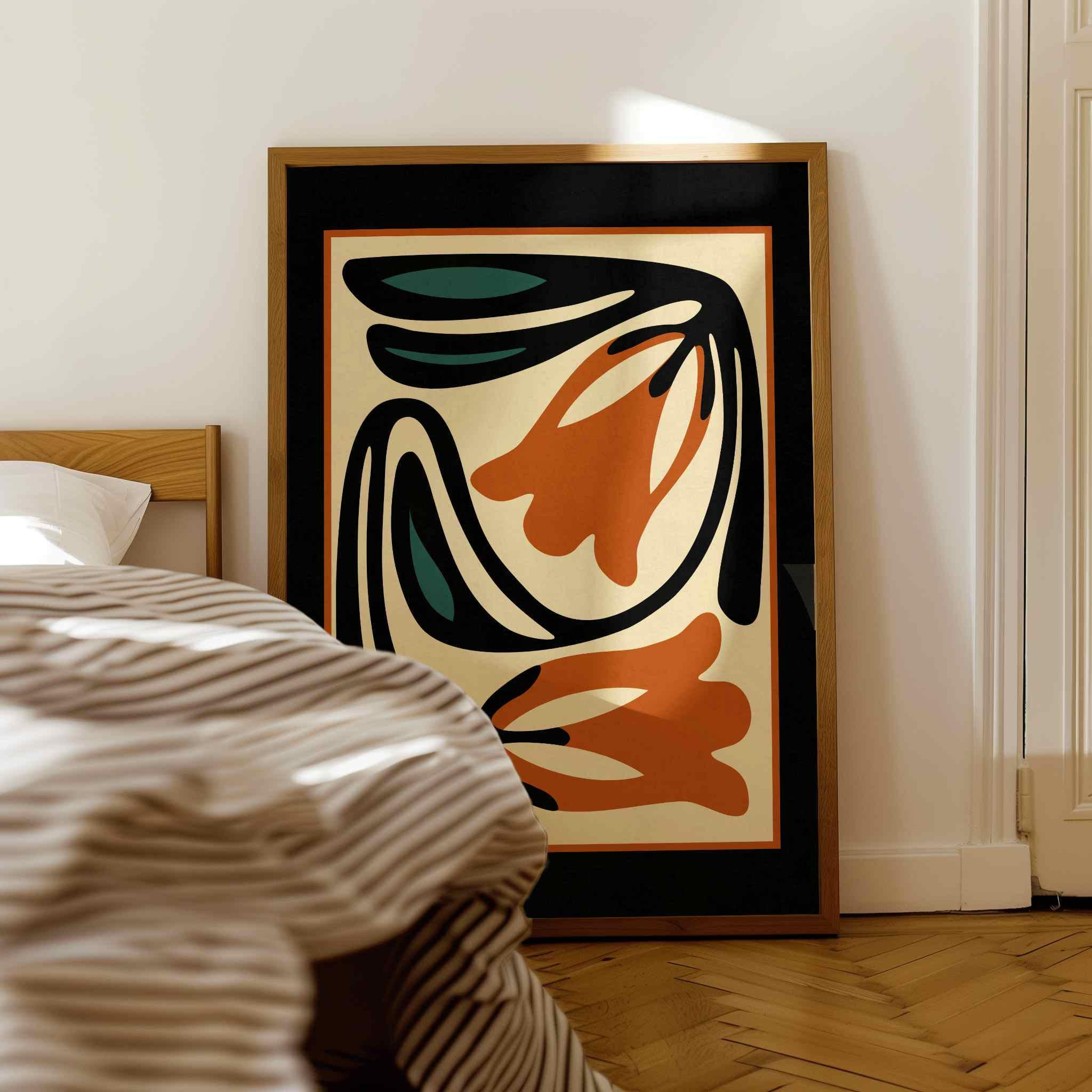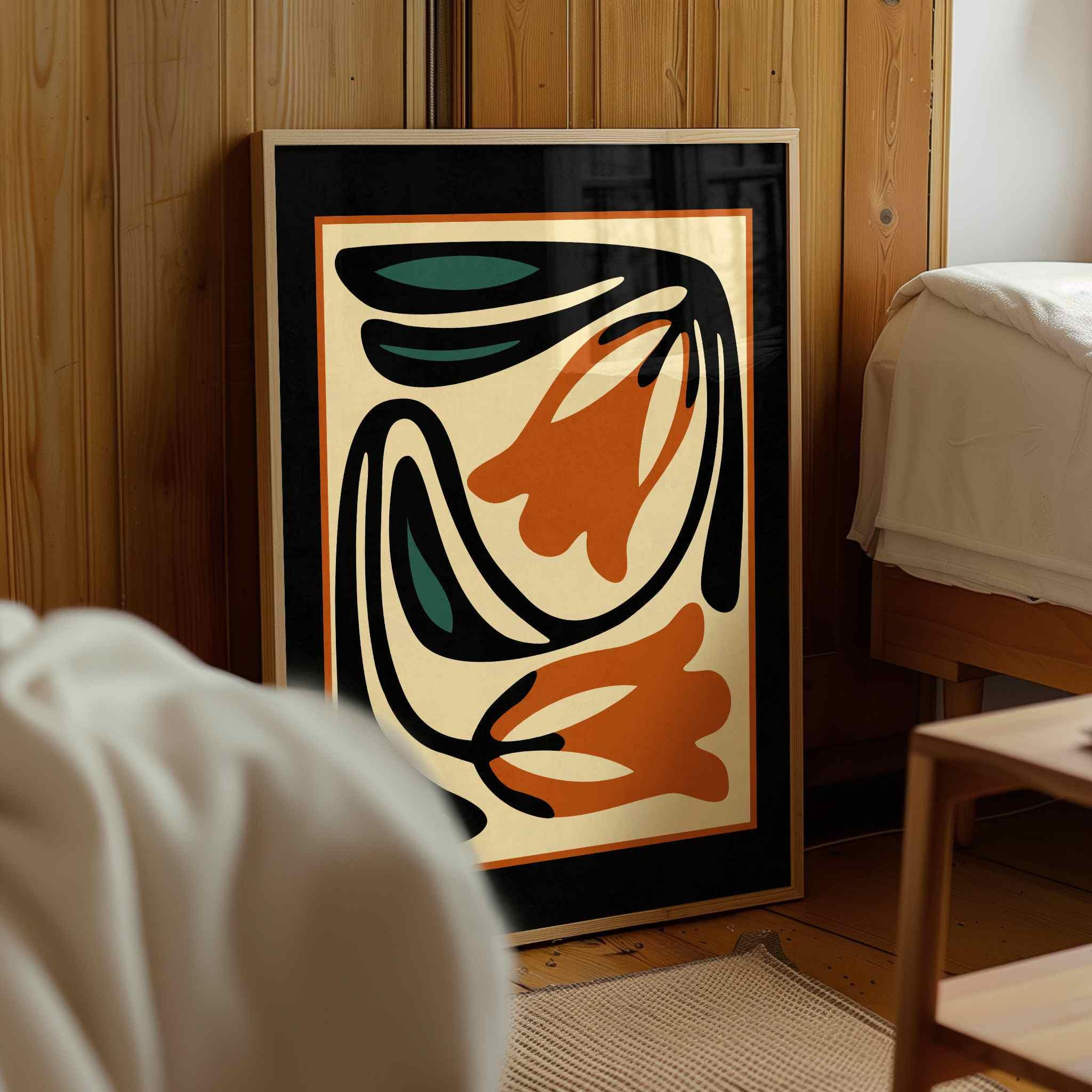 Framed abstract retro floral print featuring stylized flowers and leaves in a black, burnt orange, teal and cream color palette. This piece blends retro botanical style with mid century modern design, creating a look that’s both earthy and bold. Perfect for living rooms, kitchens, bedrooms, or gallery walls, it brings a stylish vibe into any modern boho, eclectic, or vintage-inspired space.