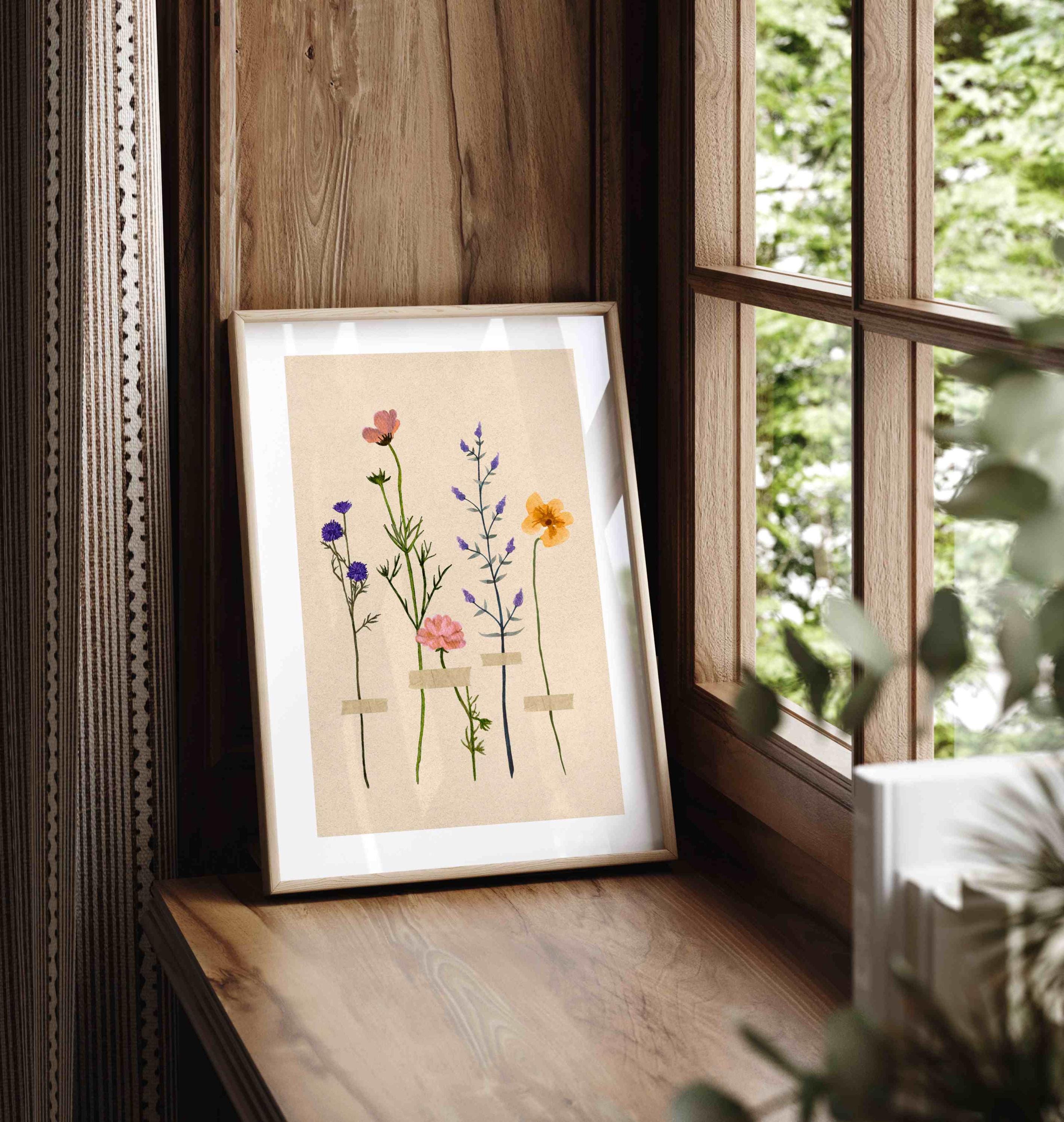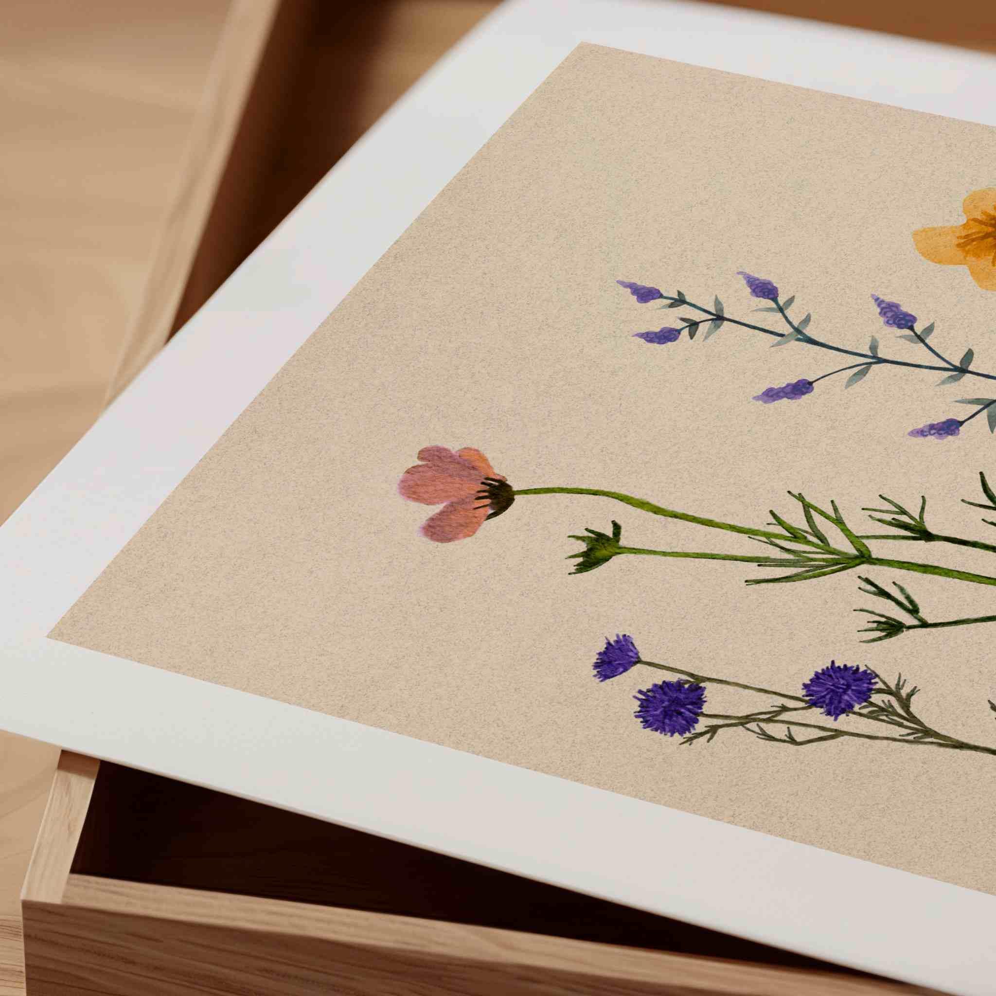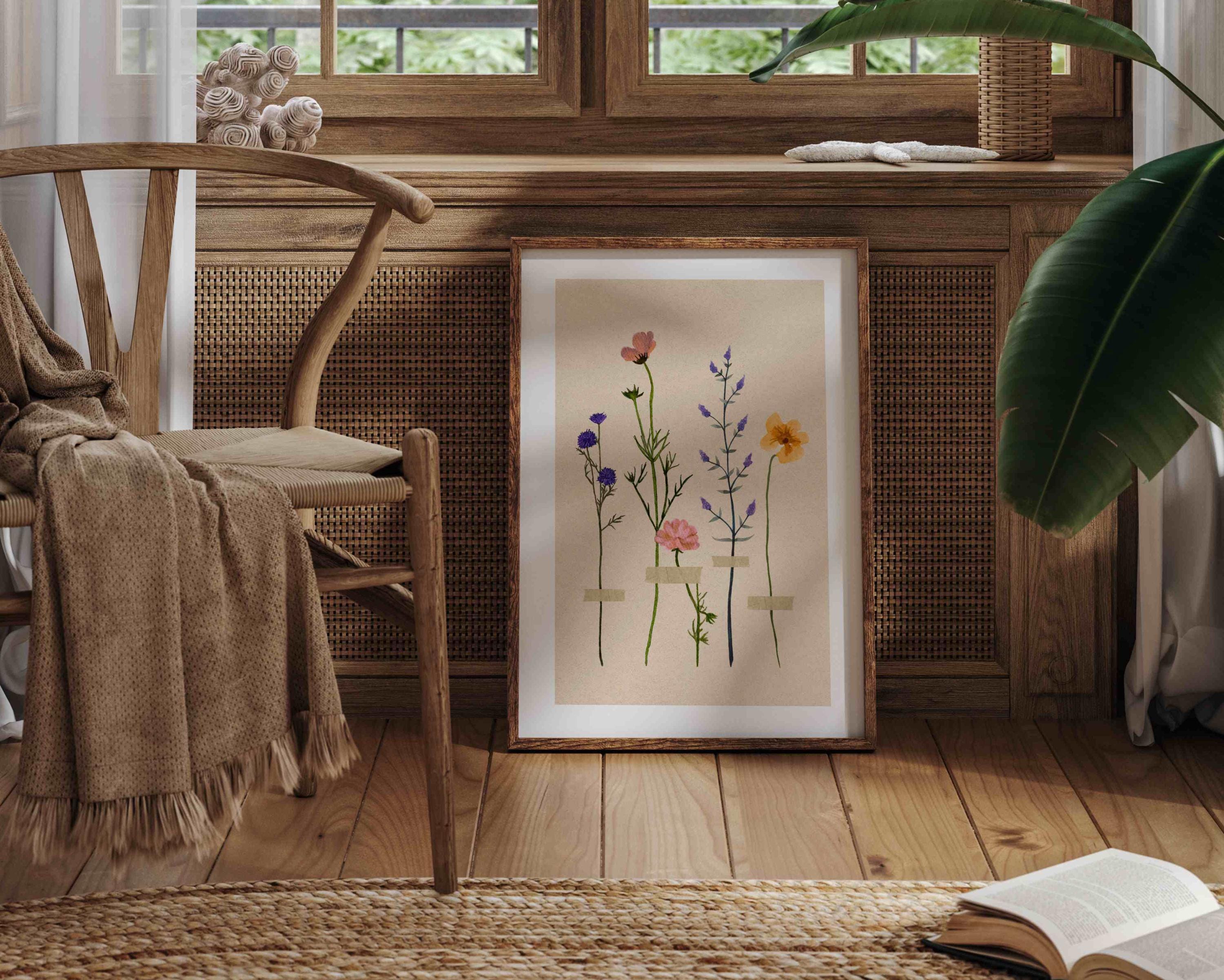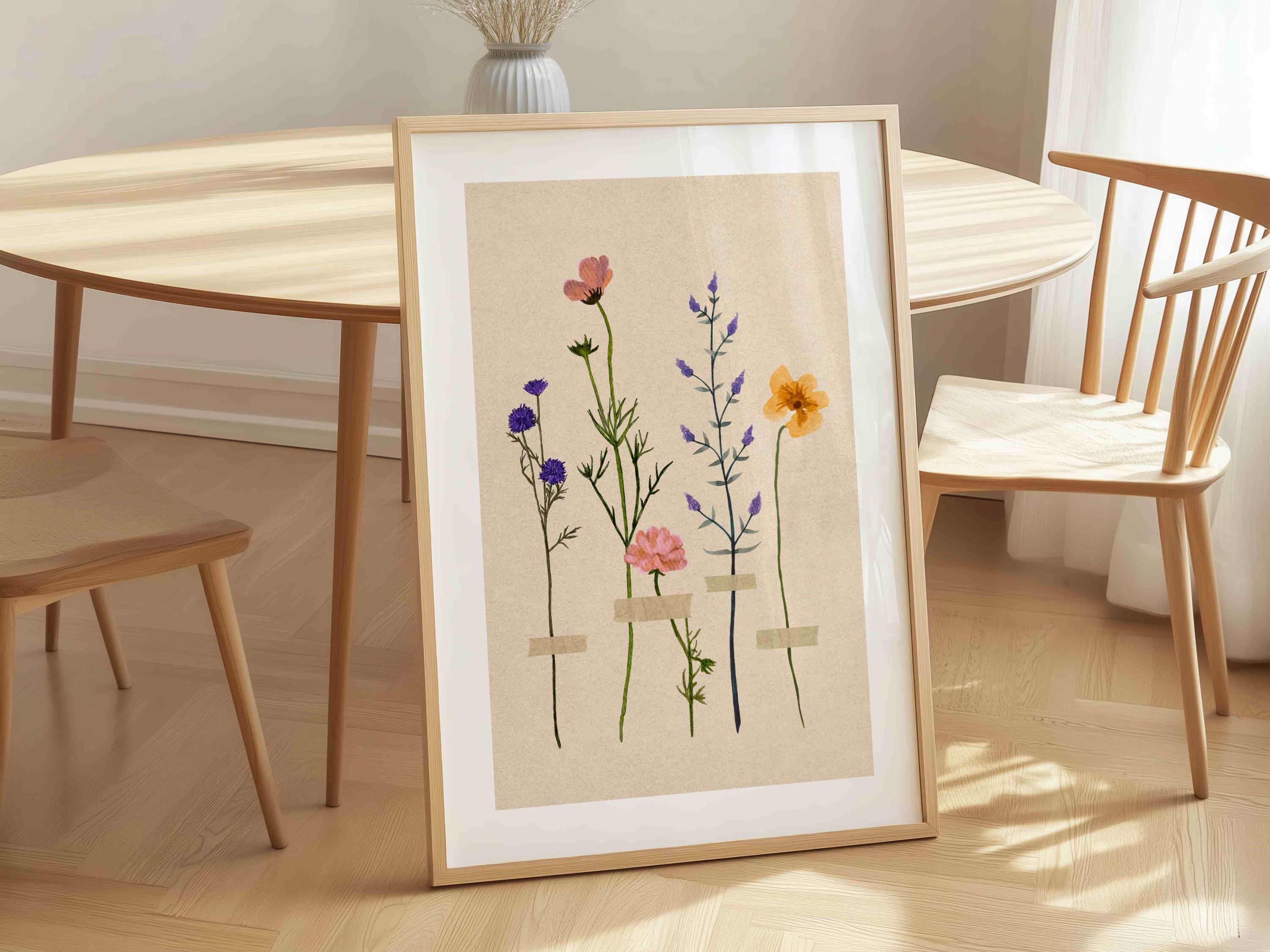Vintage style wildflower print featuring pressed botanical illustrations on a soft, neutral background. The gentle colors and simple layout create a calm, timeless look that suits cottagecore, minimalist, or rustic interiors. An easy piece to style on its own or alongside other botanical prints.